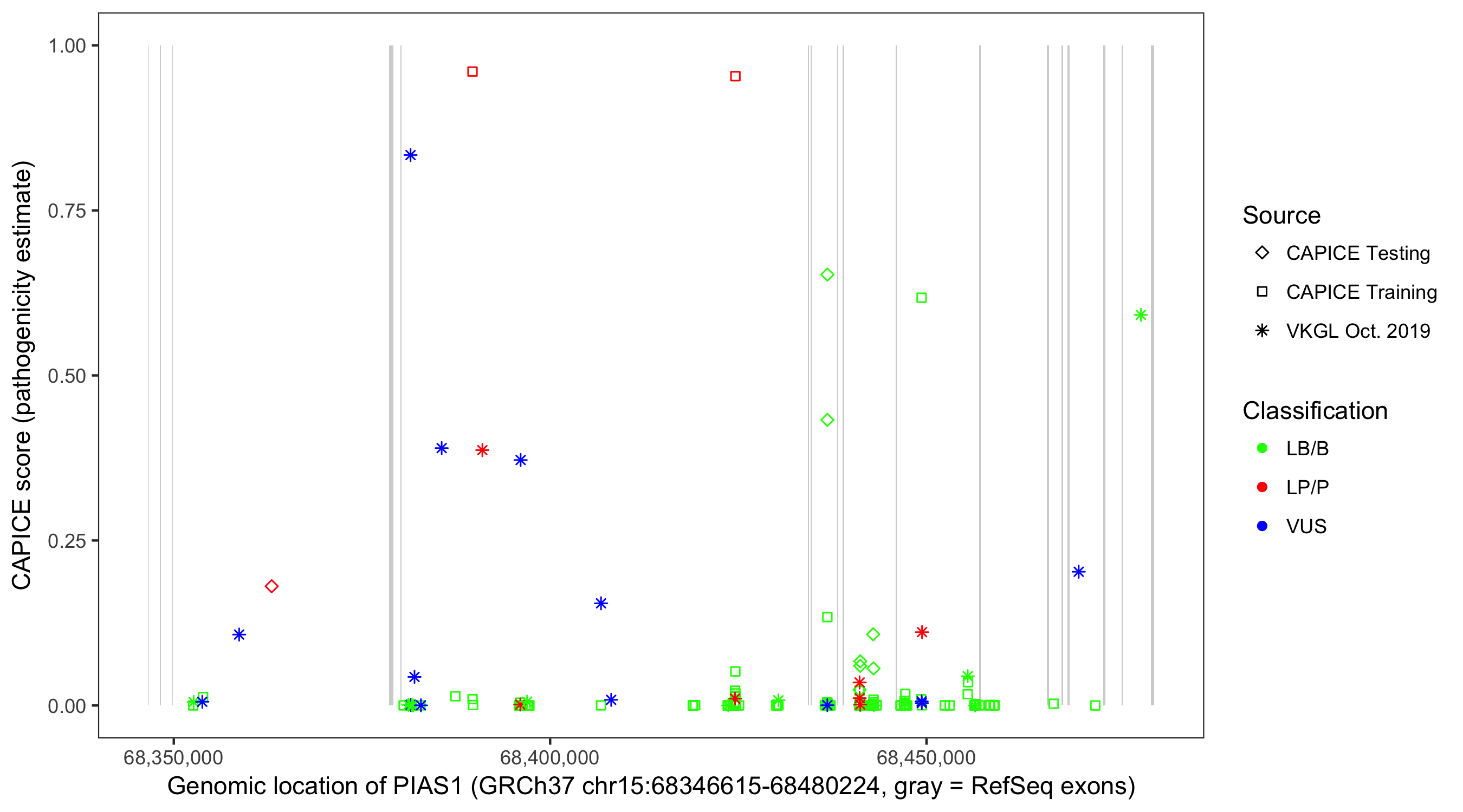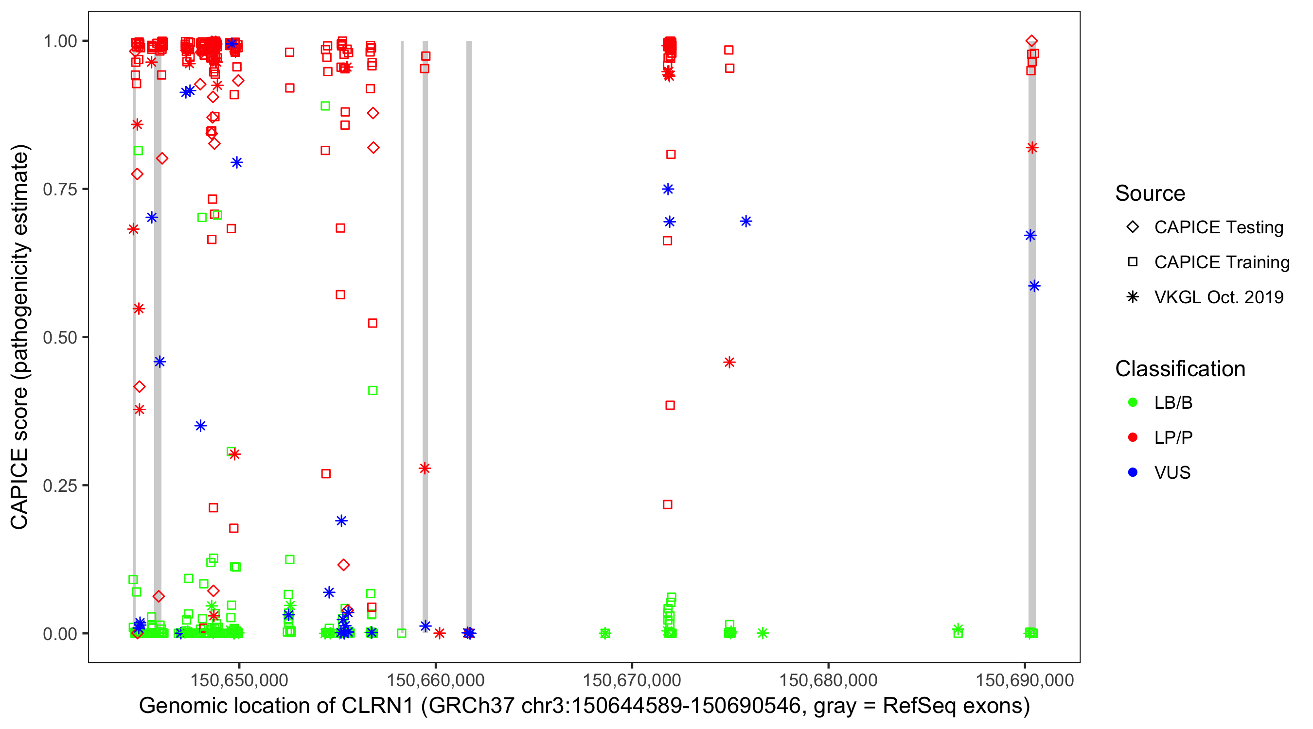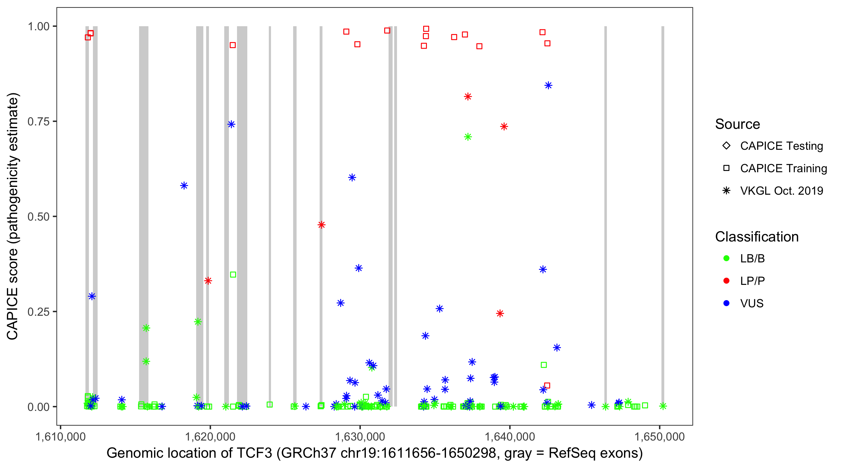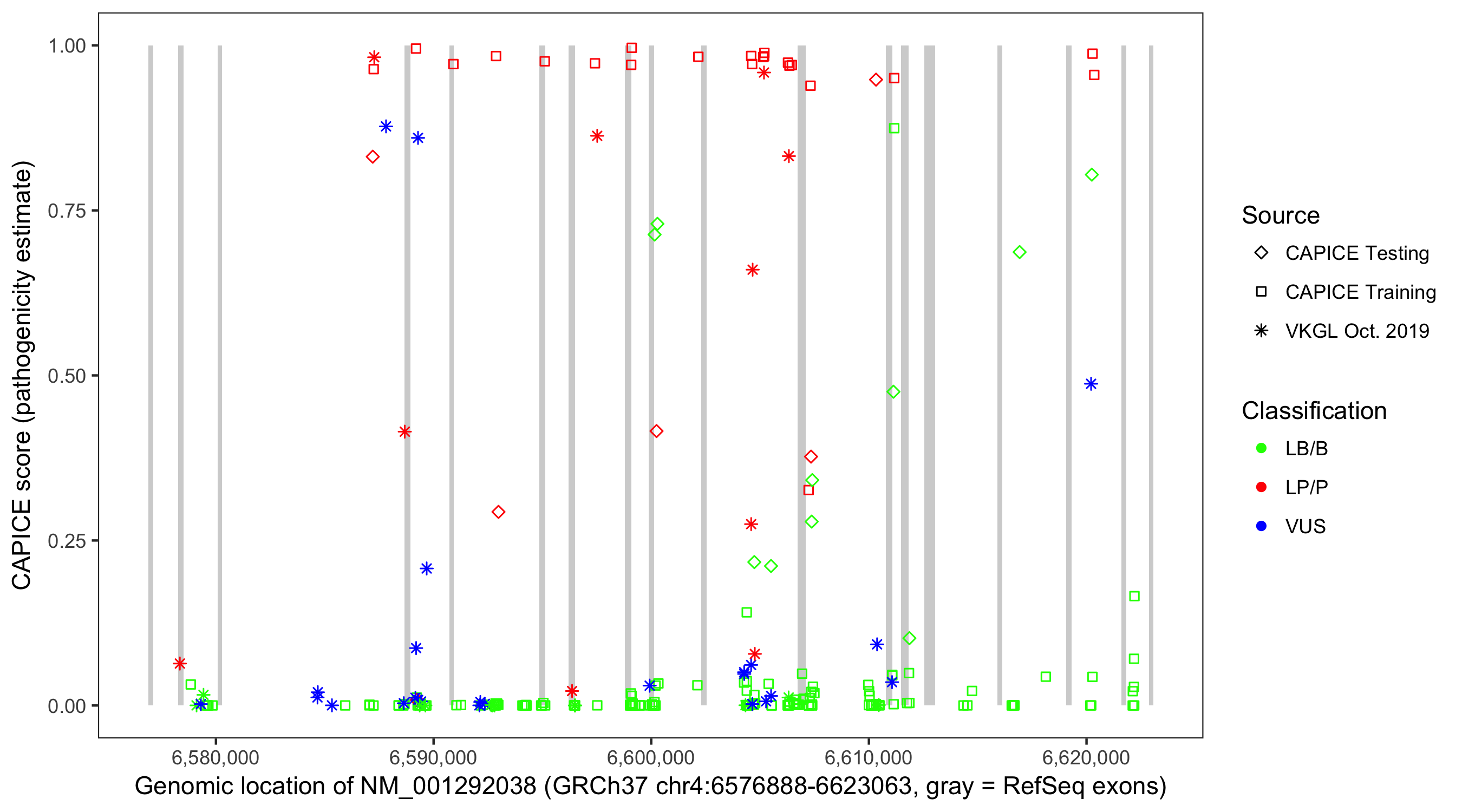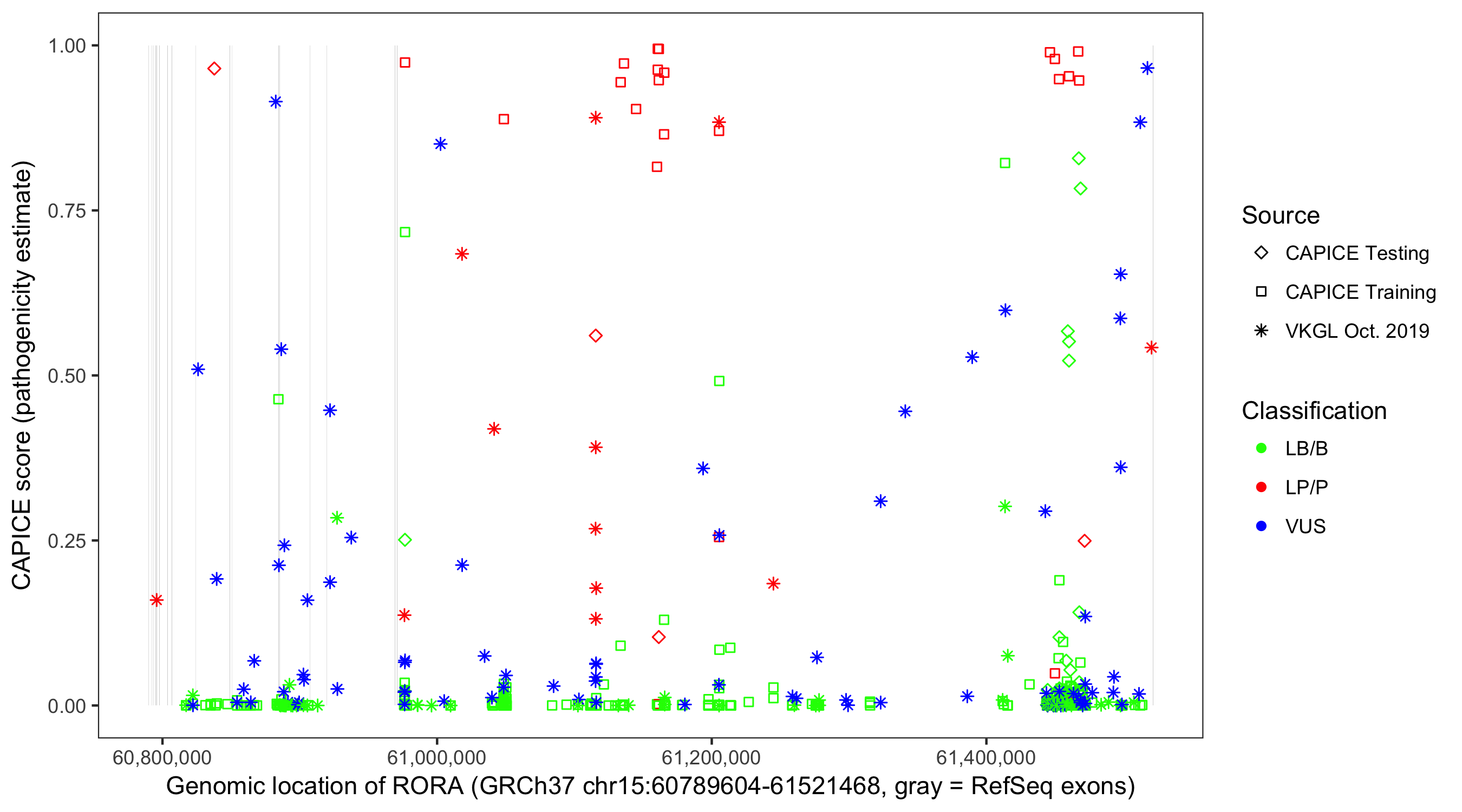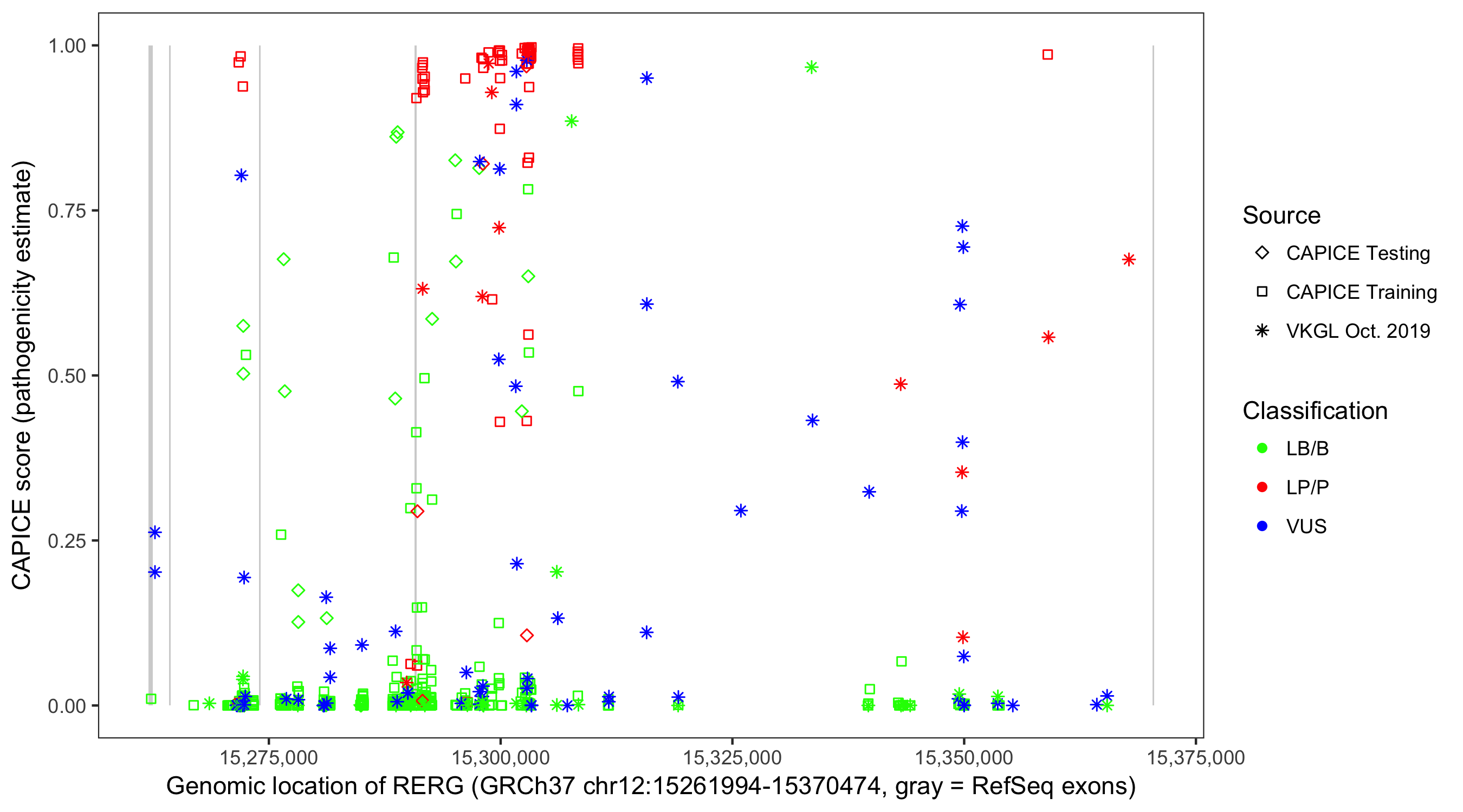 Shown are CAPICE train/test variants plus VKGL Oct 2019.
