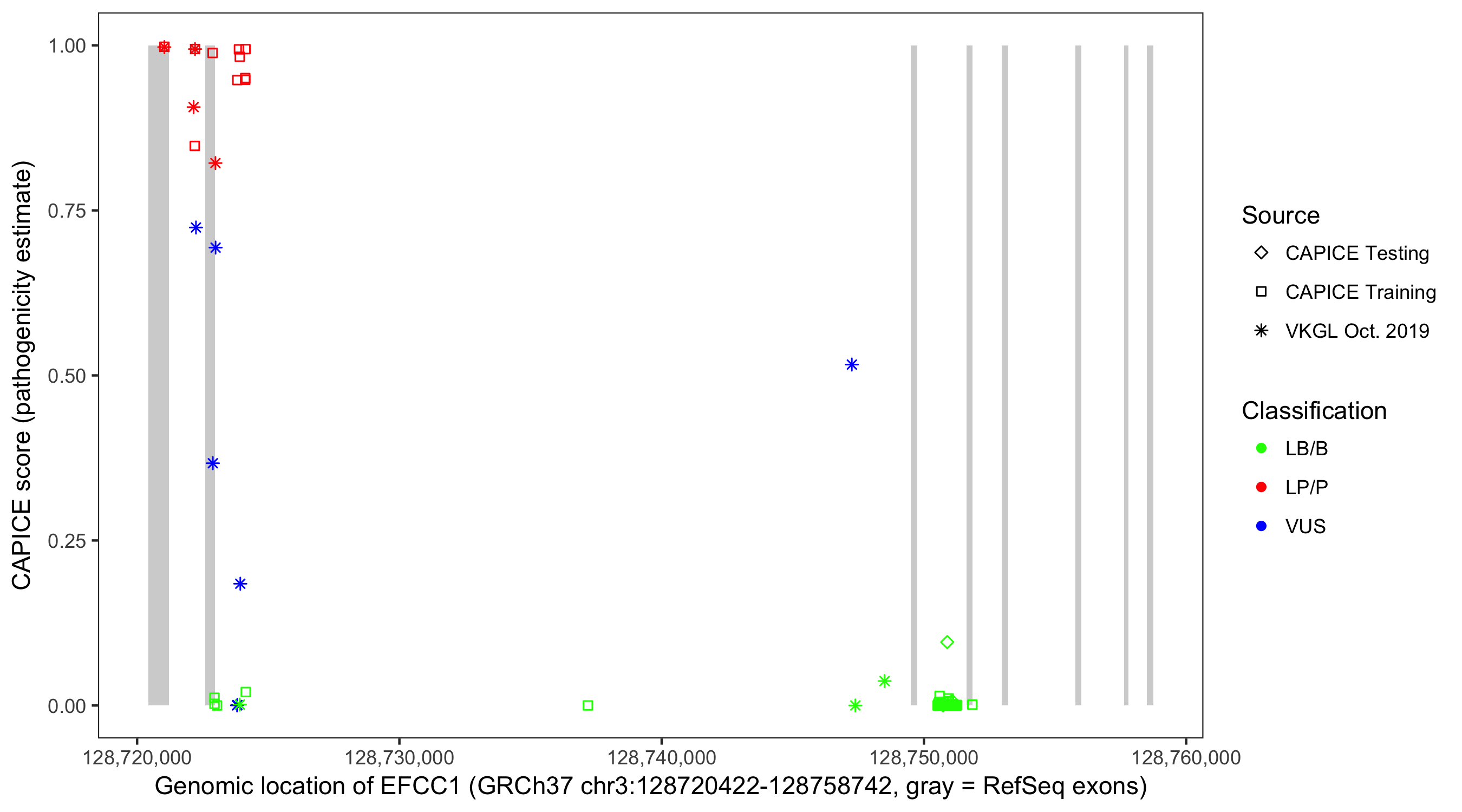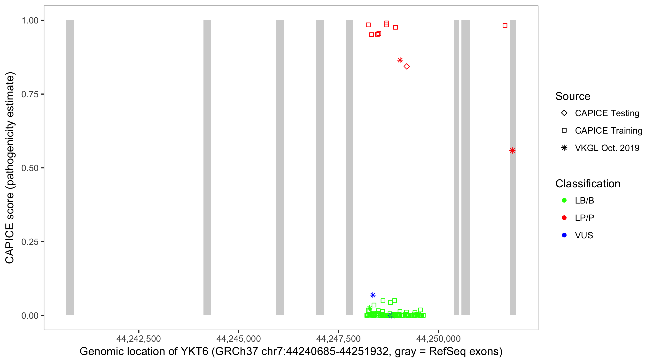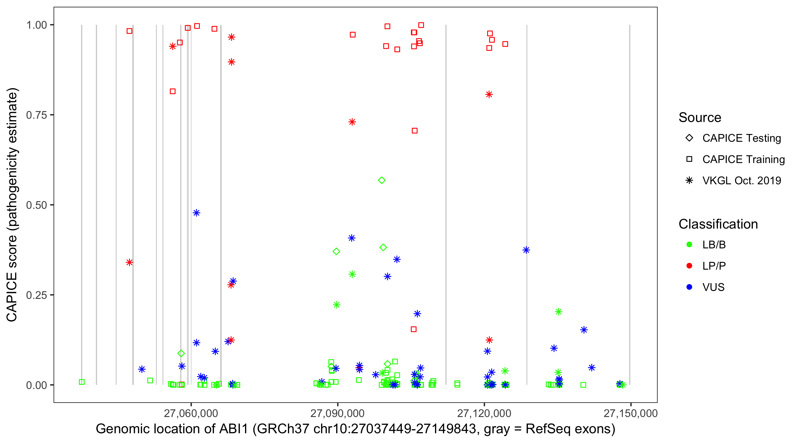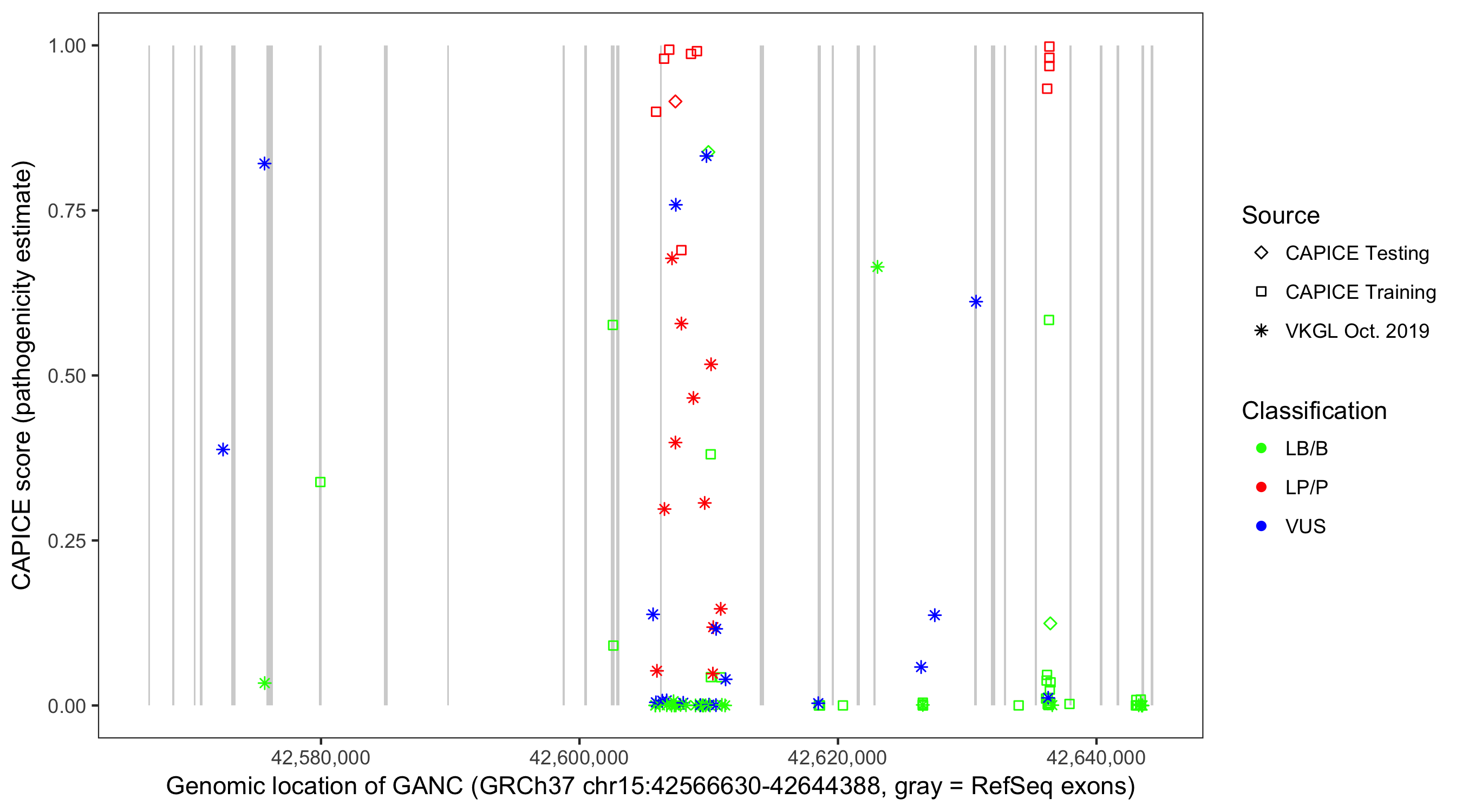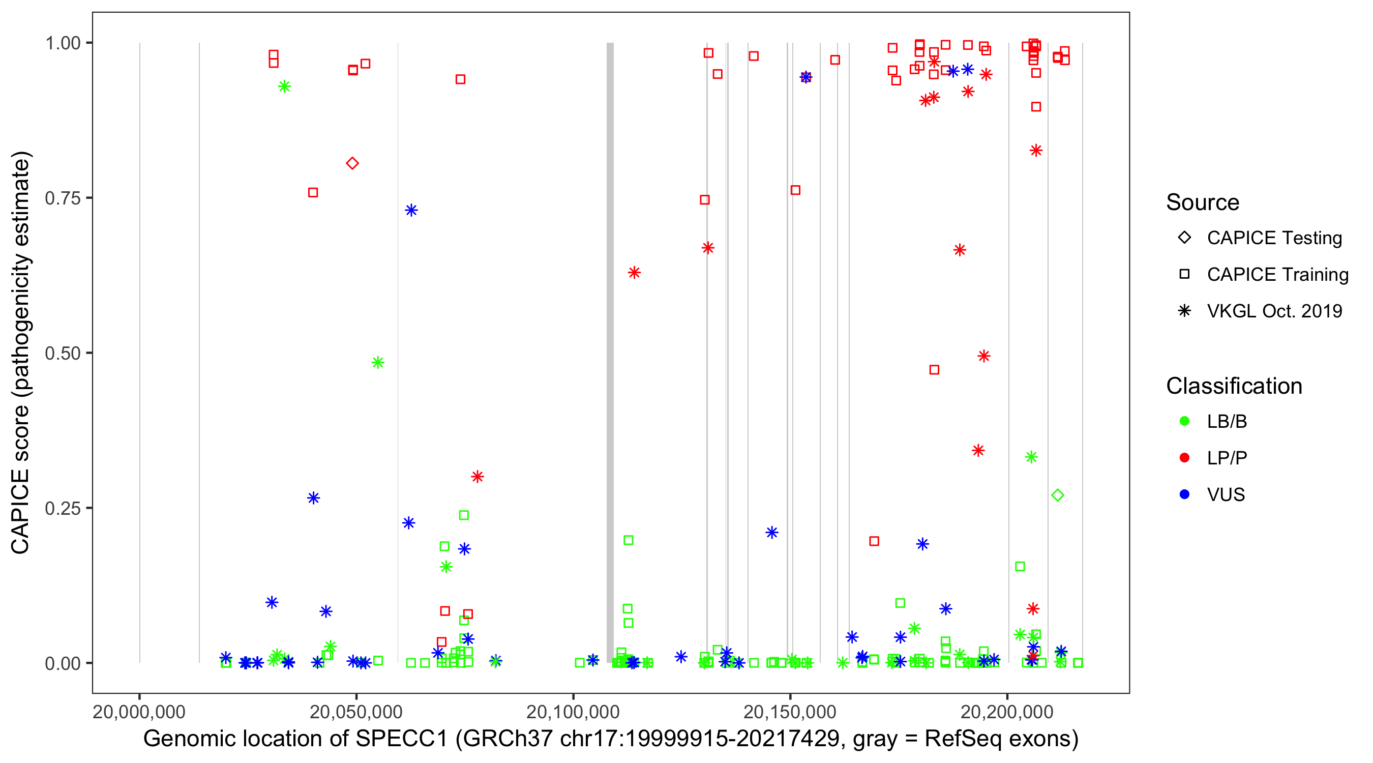 Shown are CAPICE train/test variants plus VKGL Oct 2019.