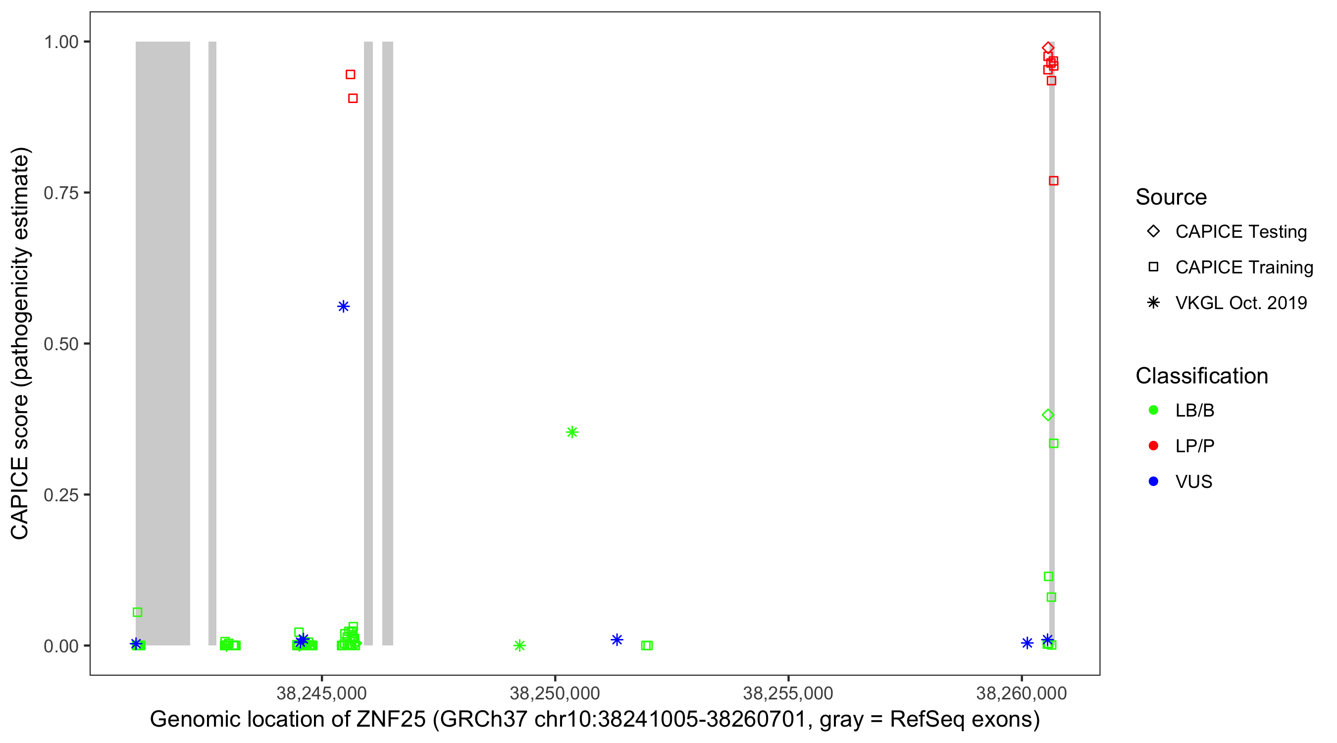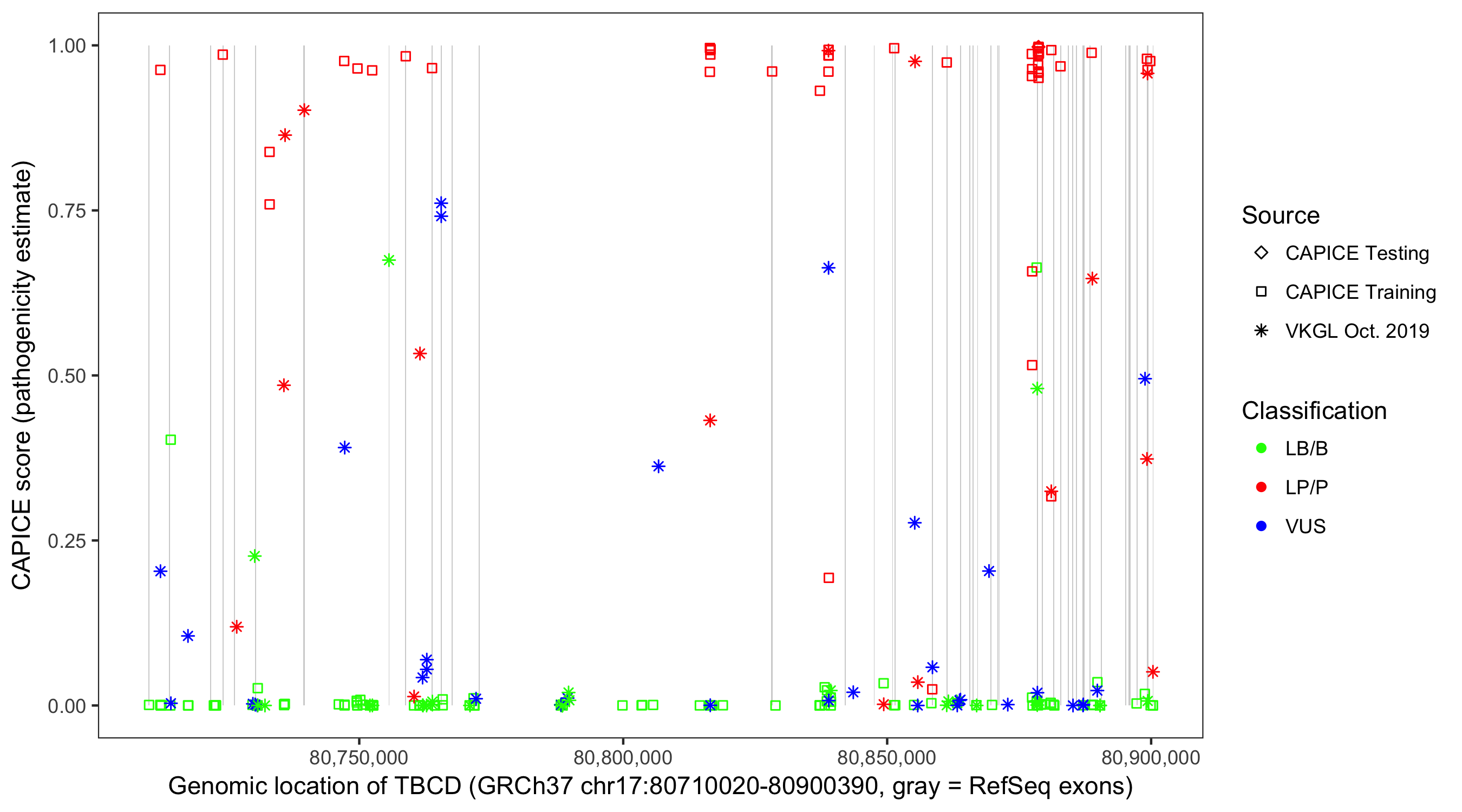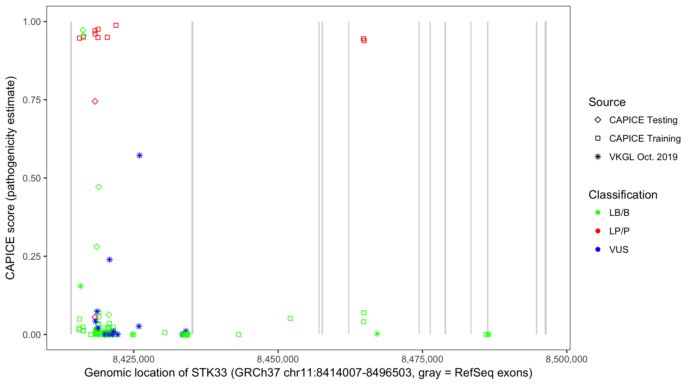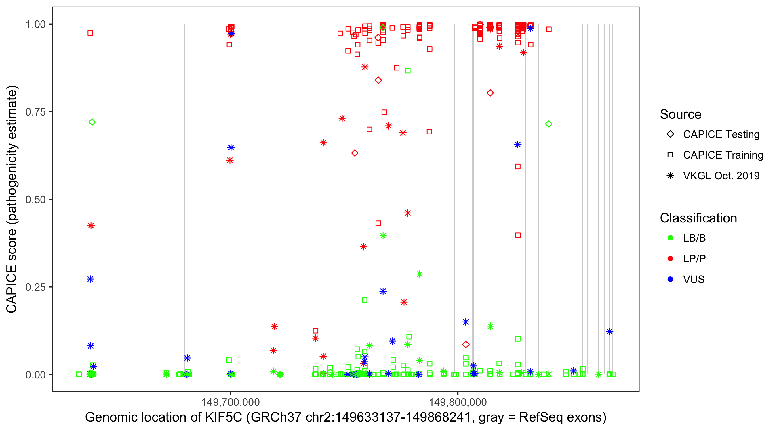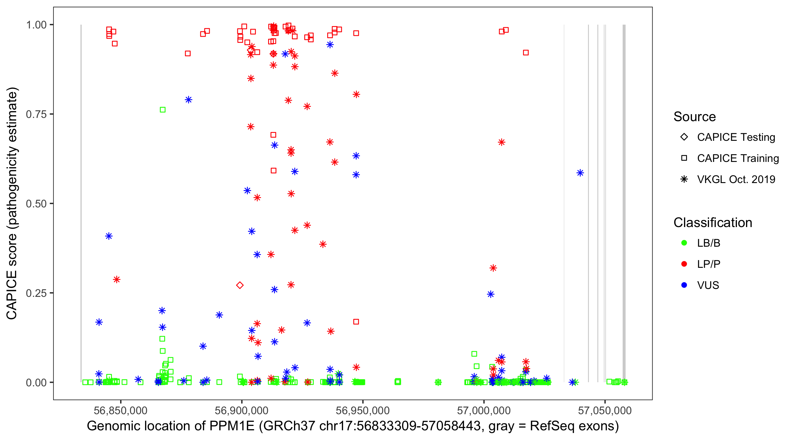Shown are CAPICE train/test variants plus VKGL Oct 2019.