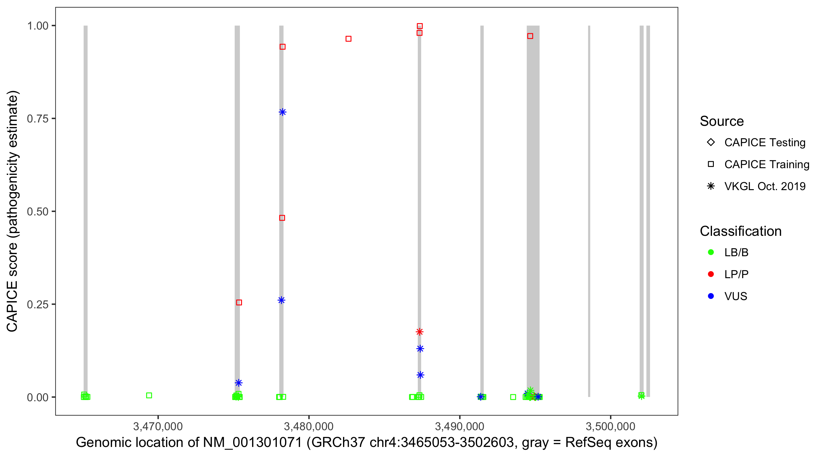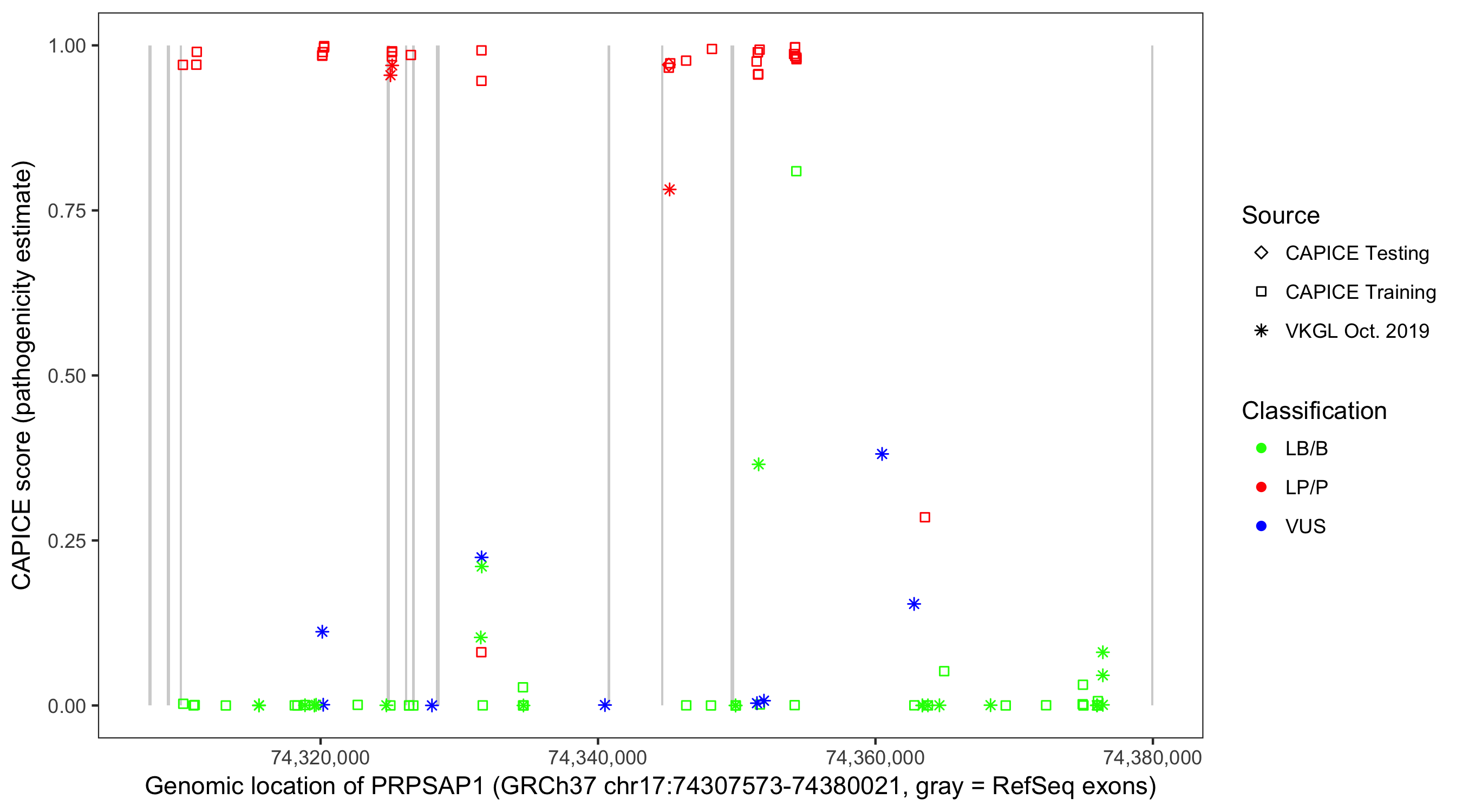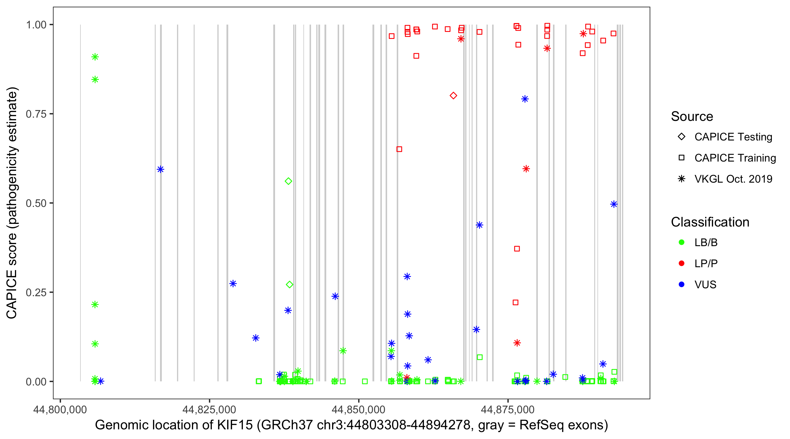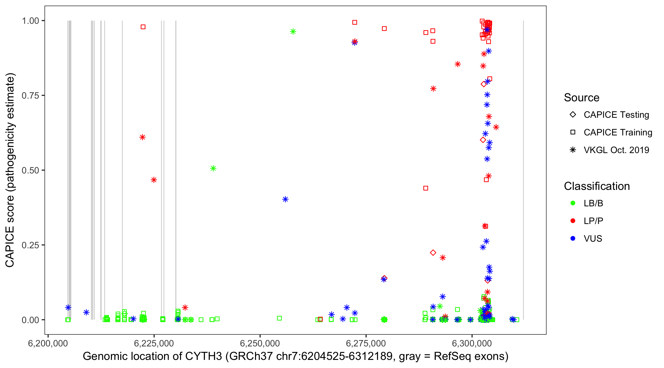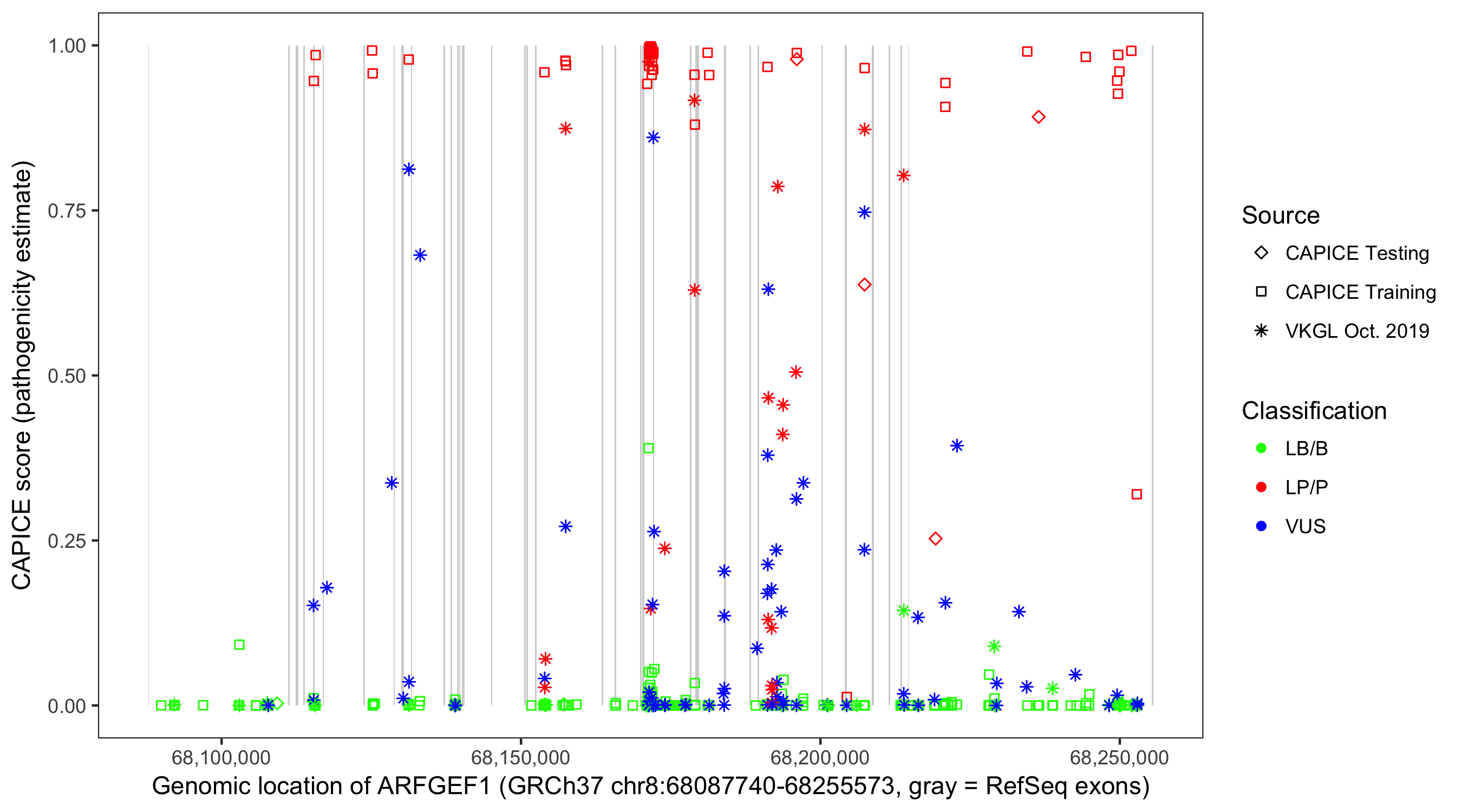 Shown are CAPICE train/test variants plus VKGL Oct 2019.