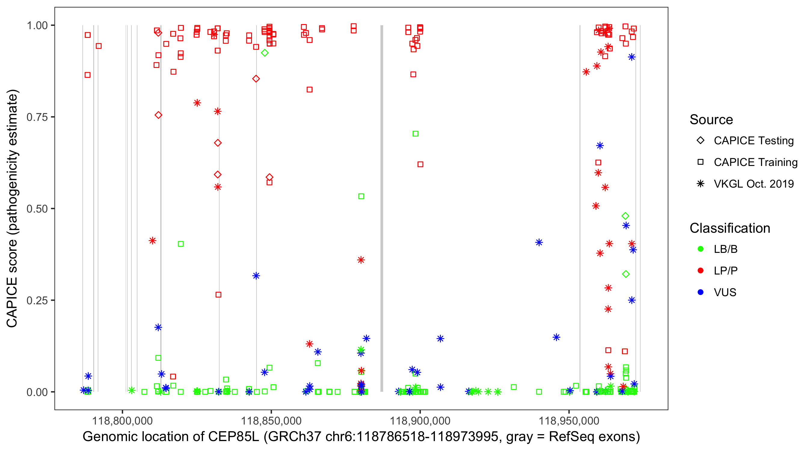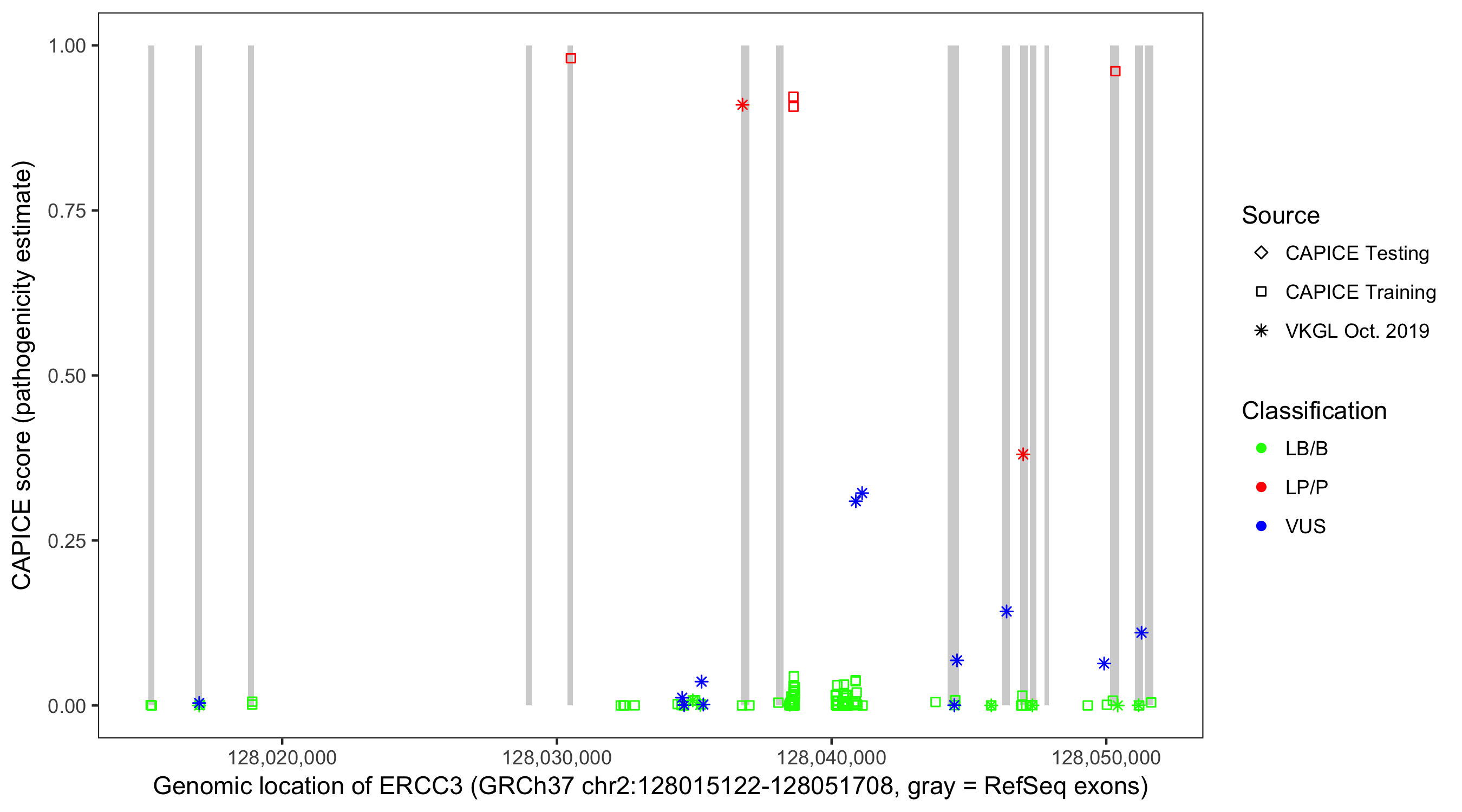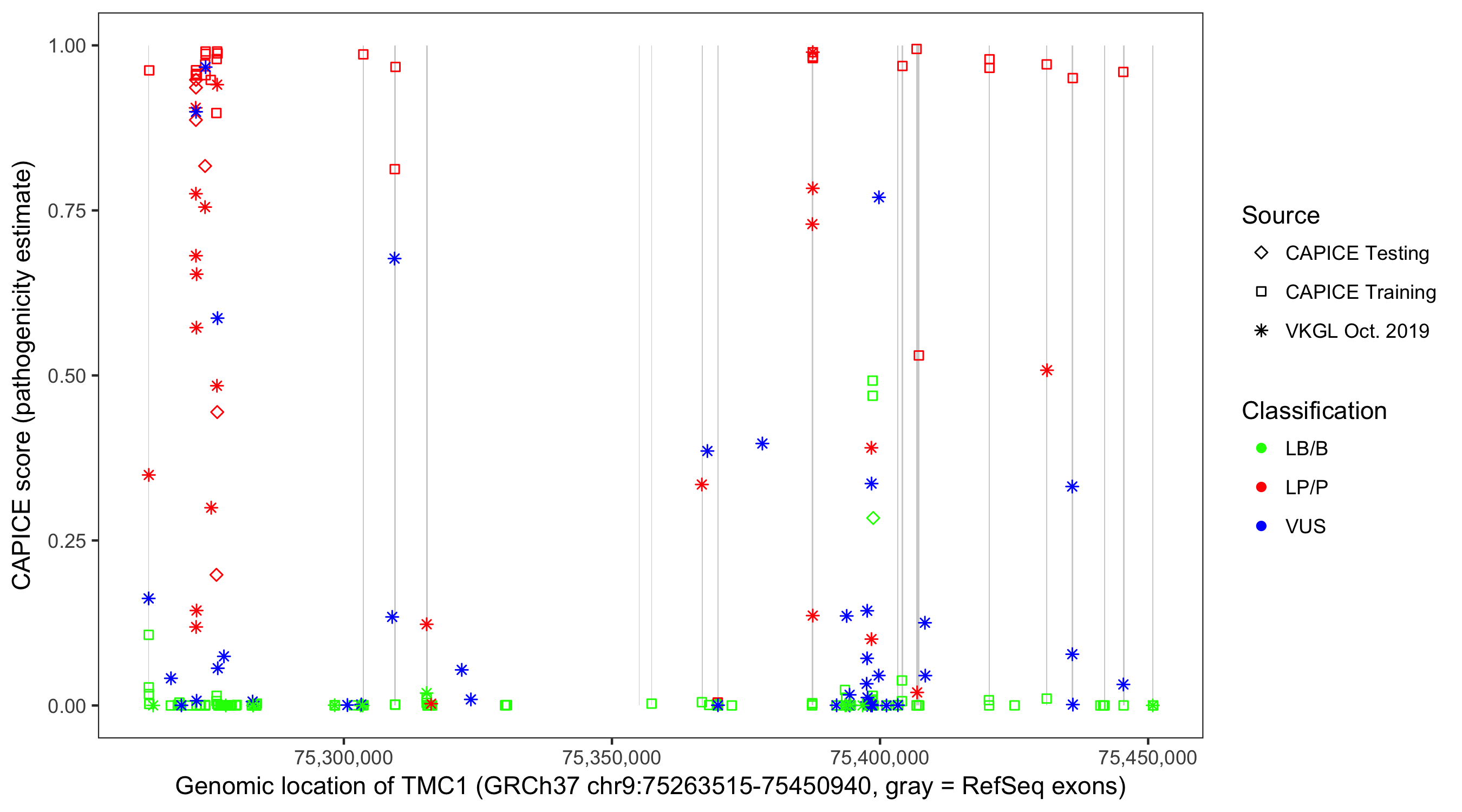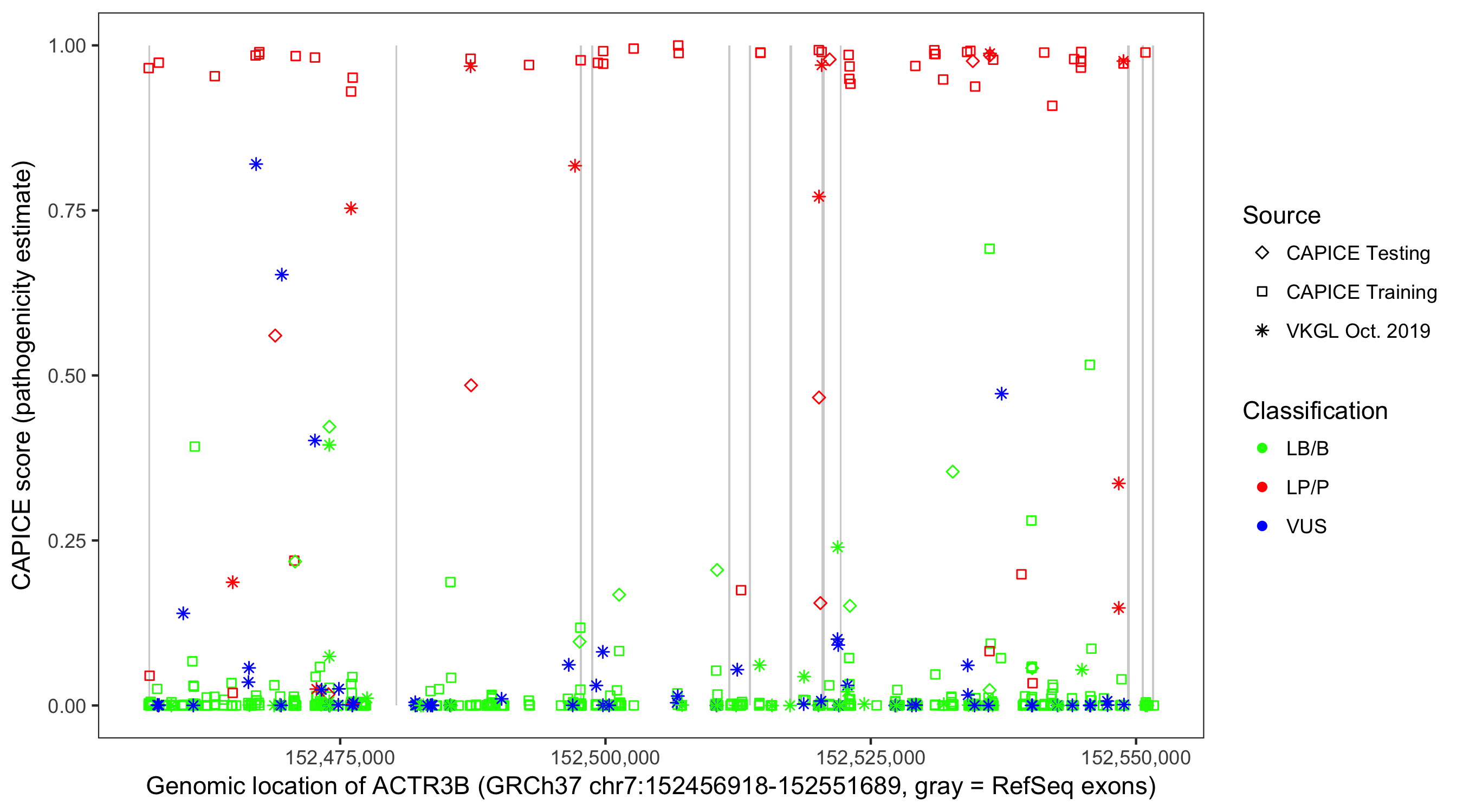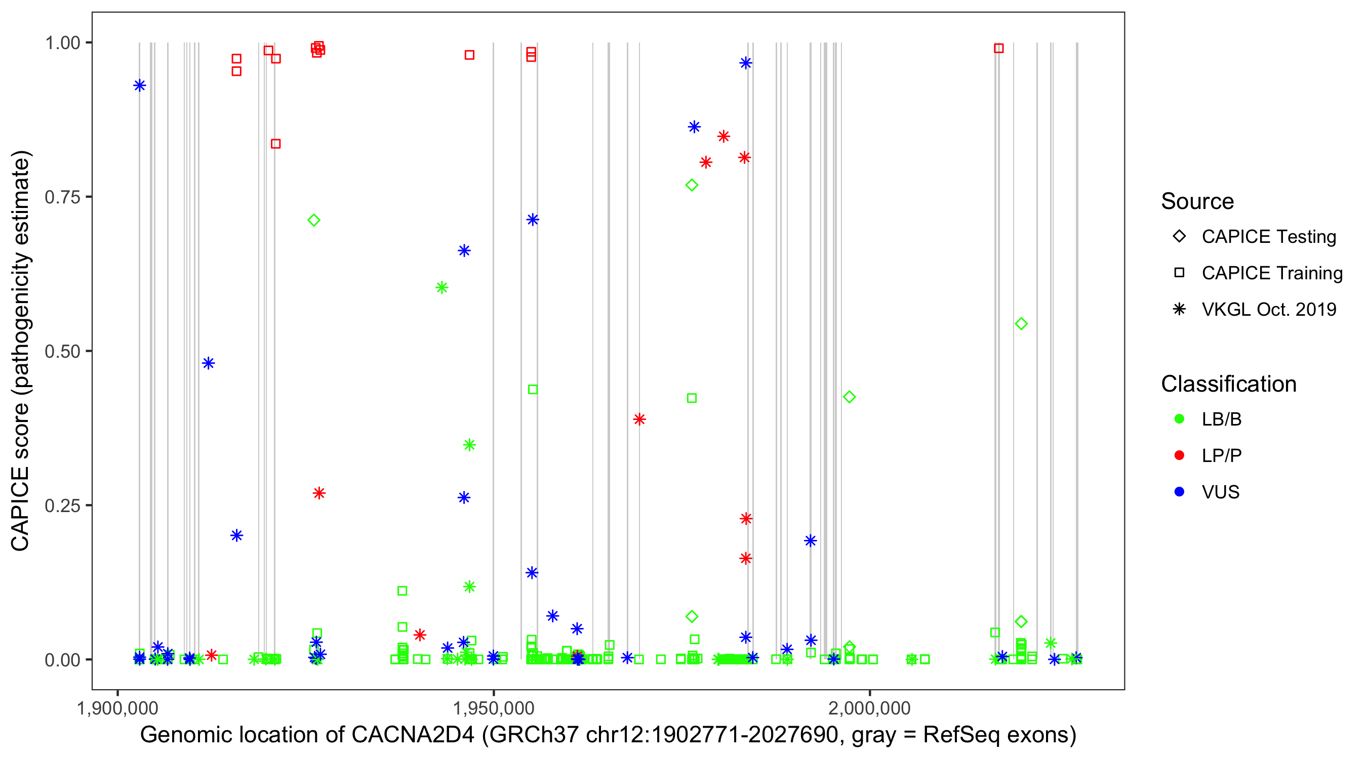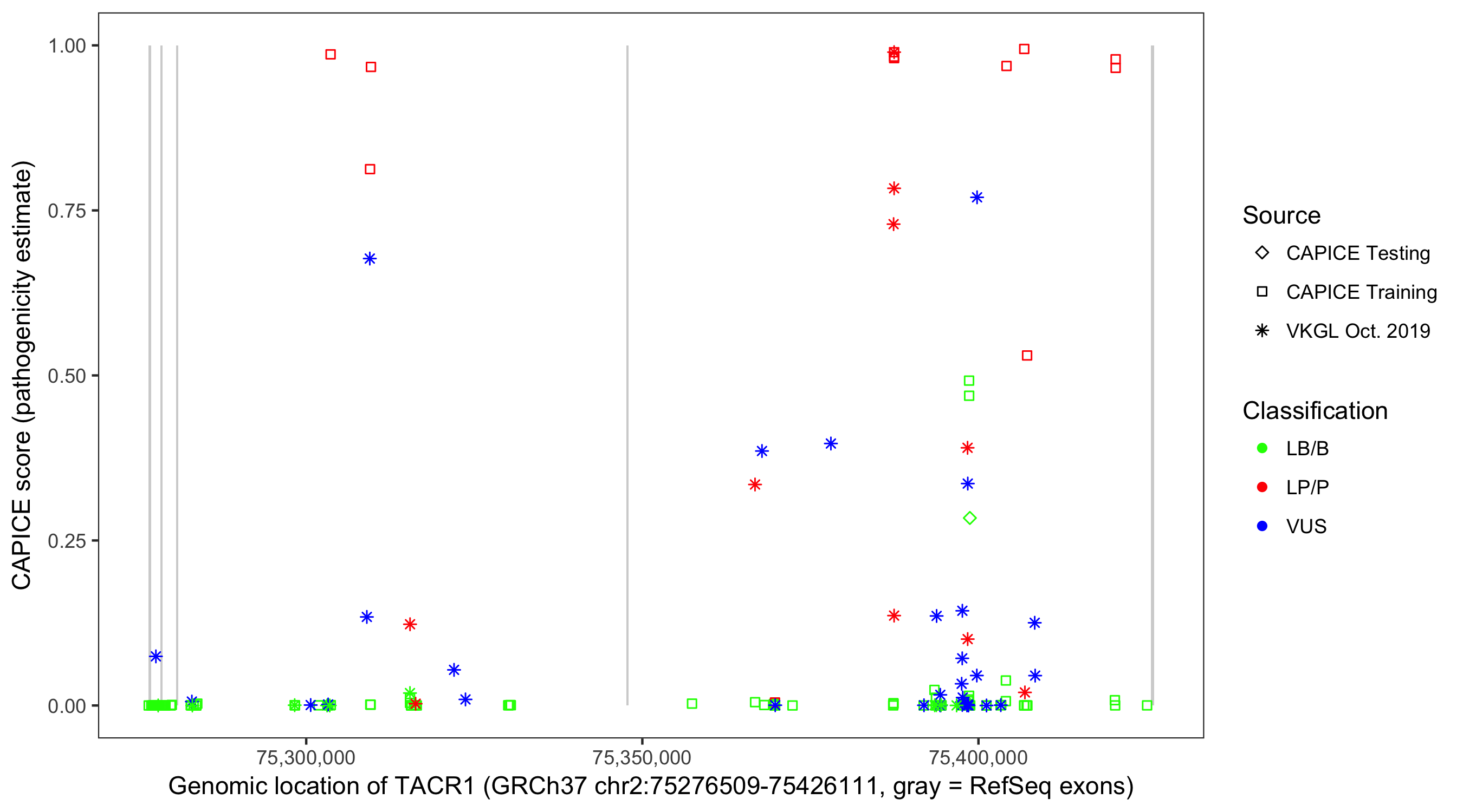 Shown are CAPICE train/test variants plus VKGL Oct 2019.
