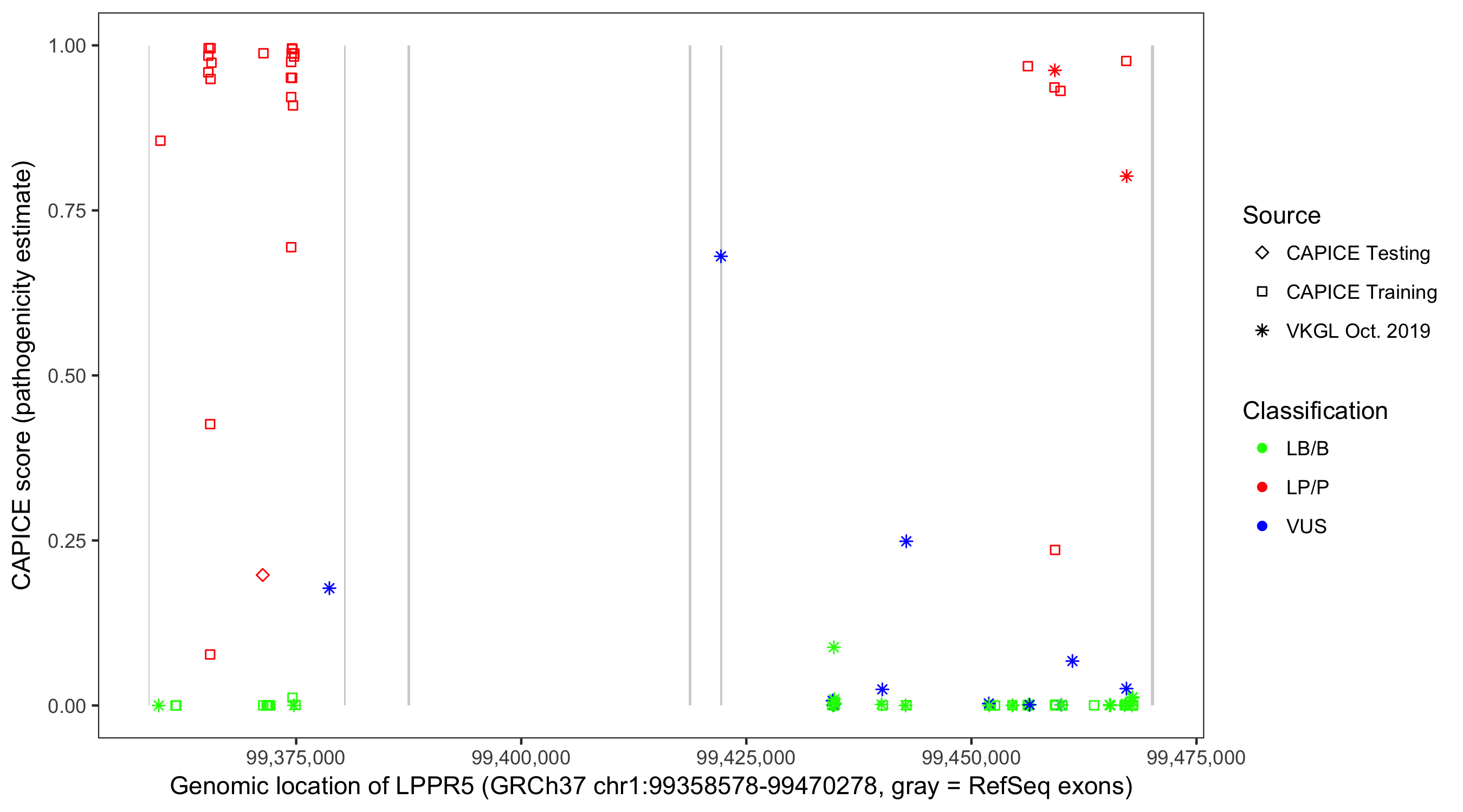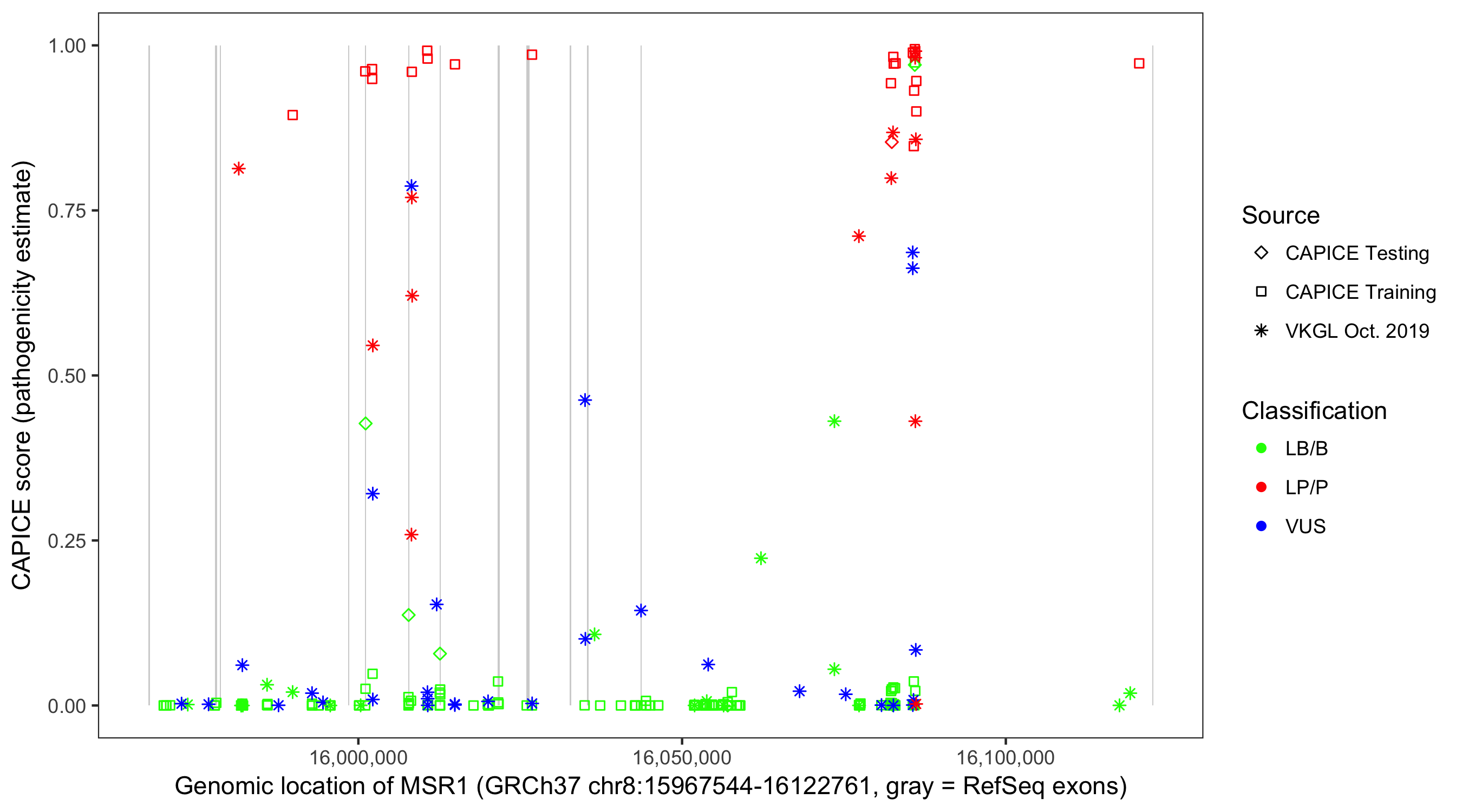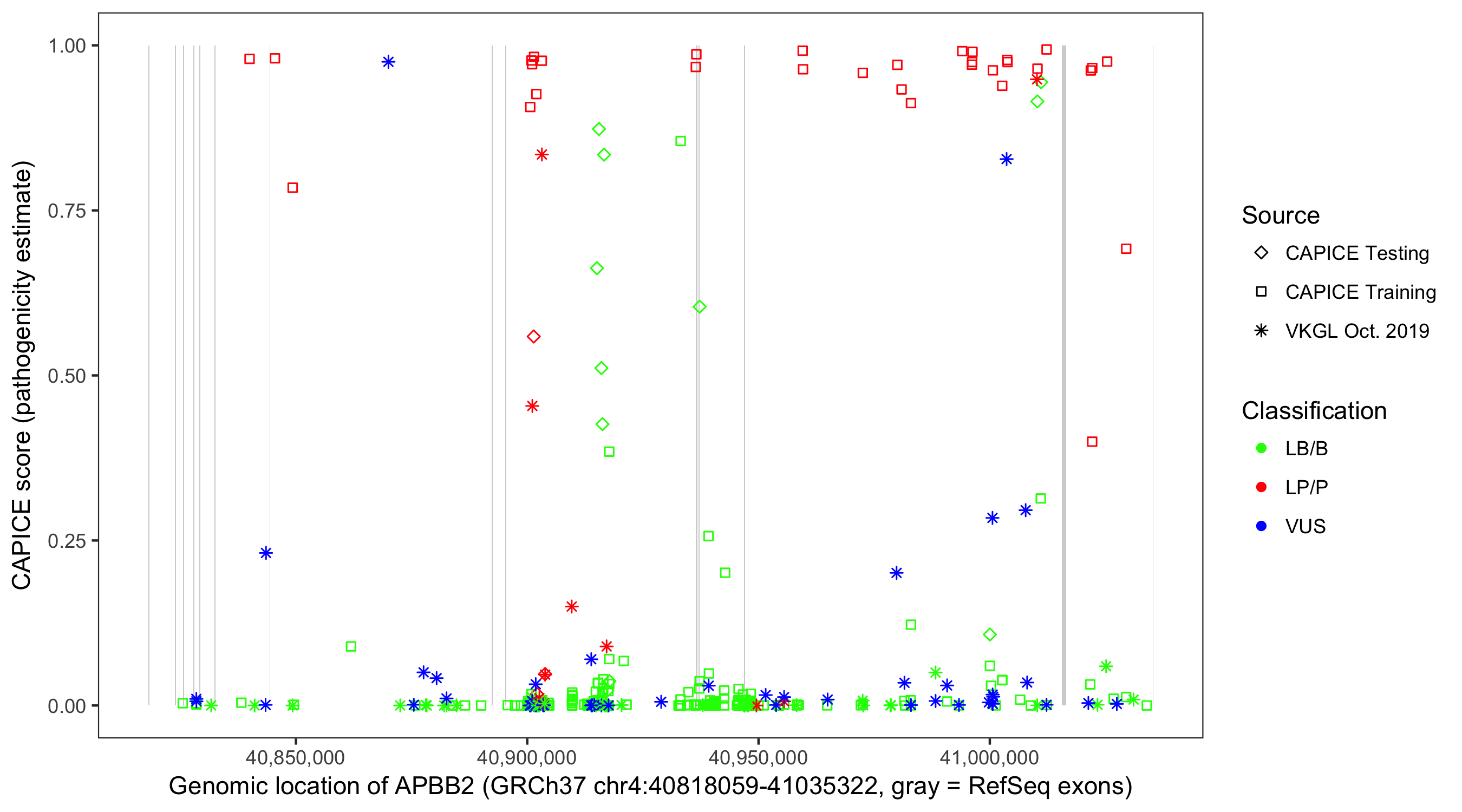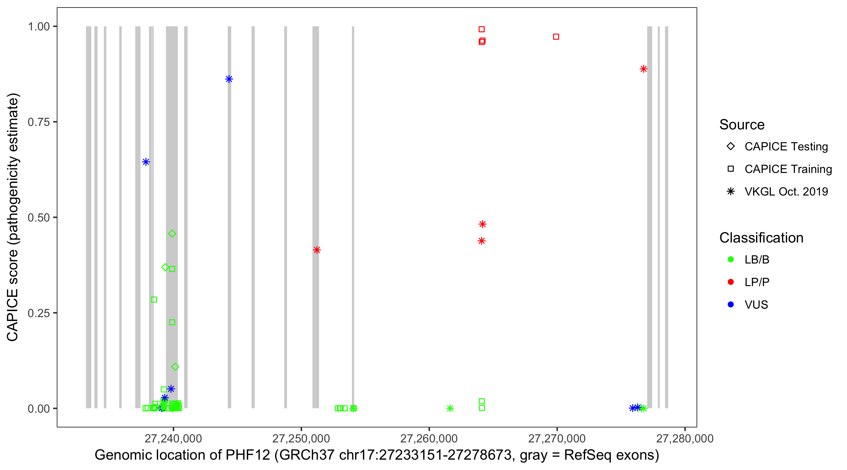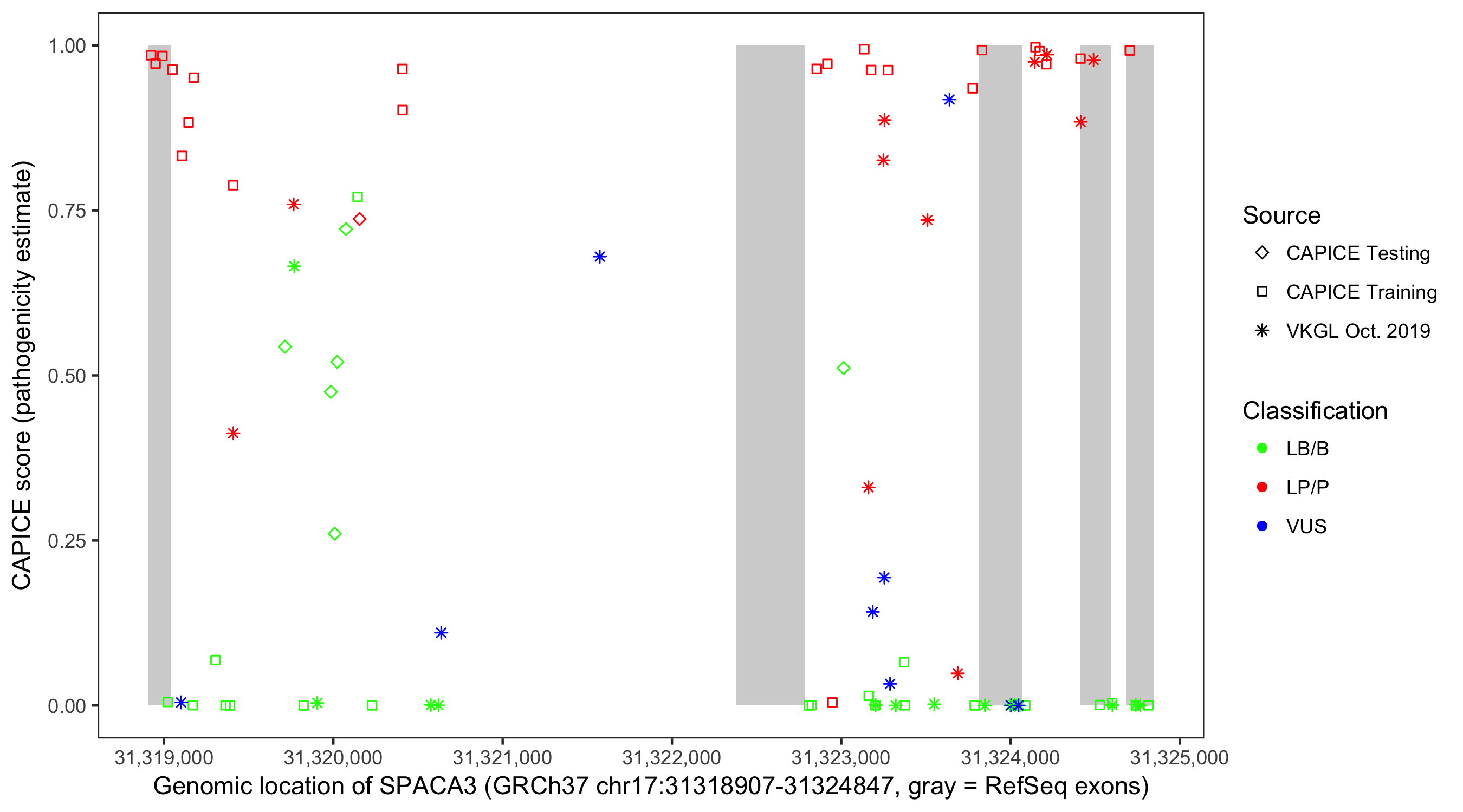 Shown are CAPICE train/test variants plus VKGL Oct 2019.