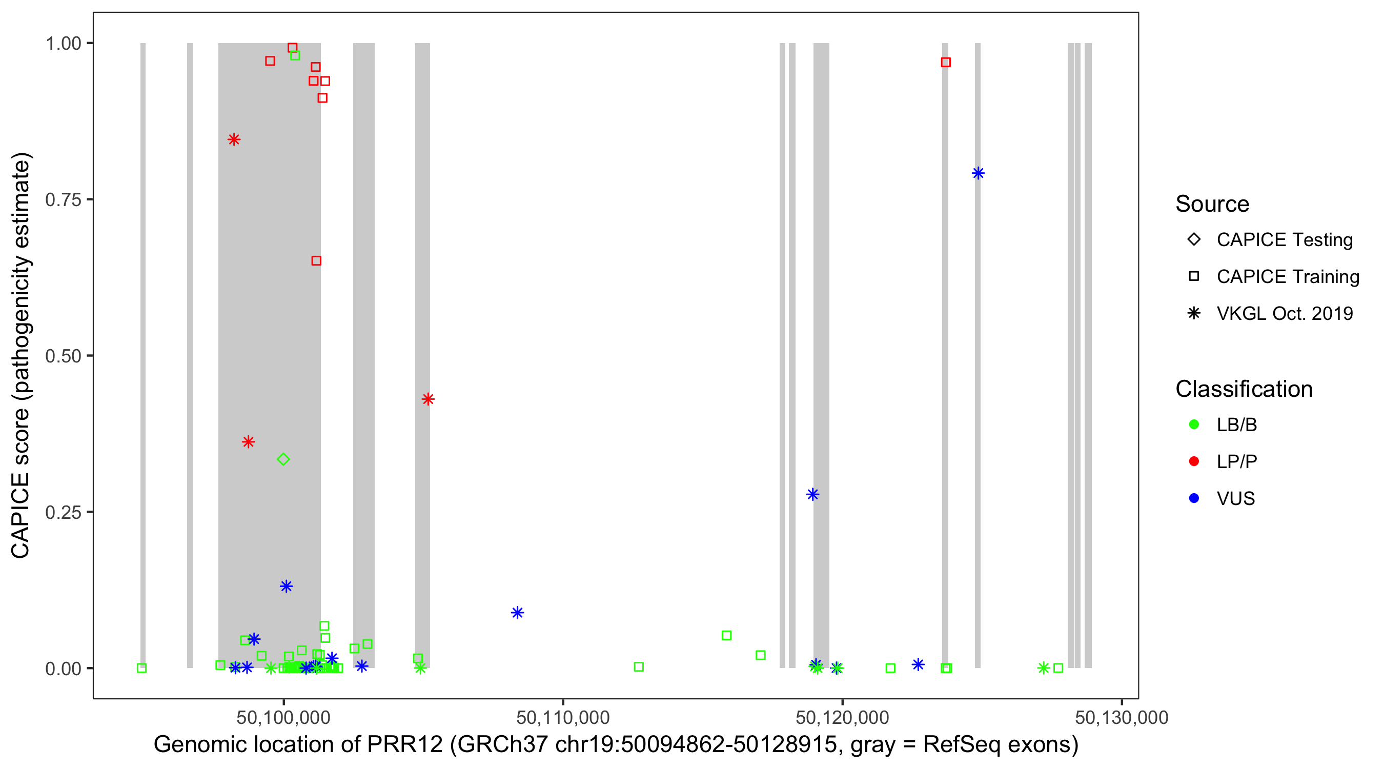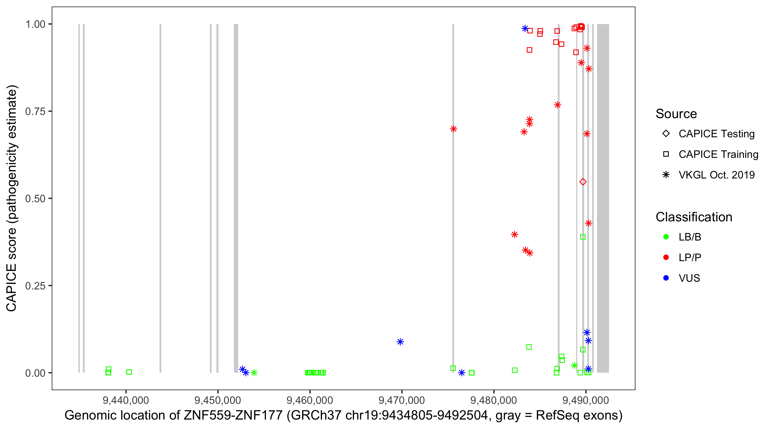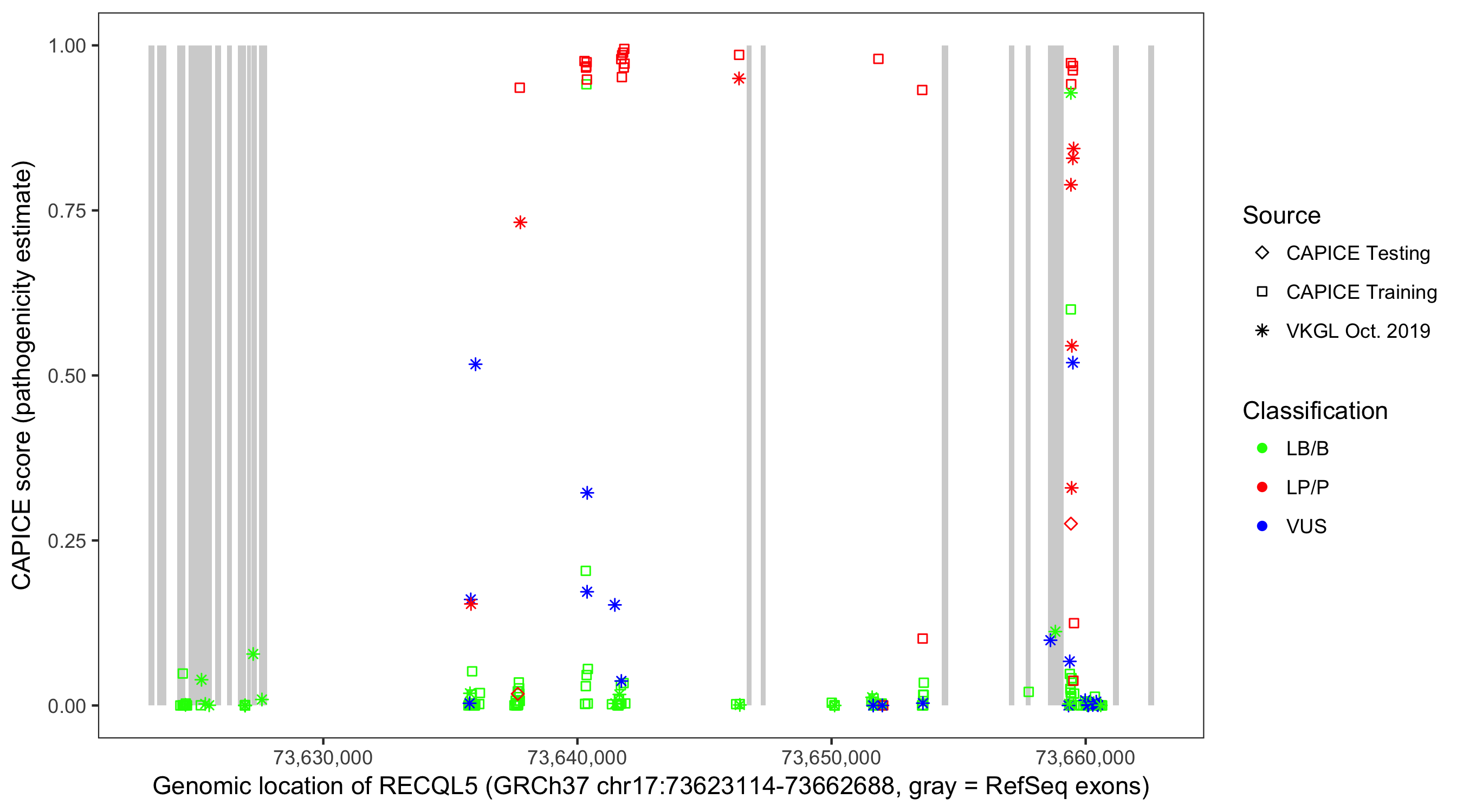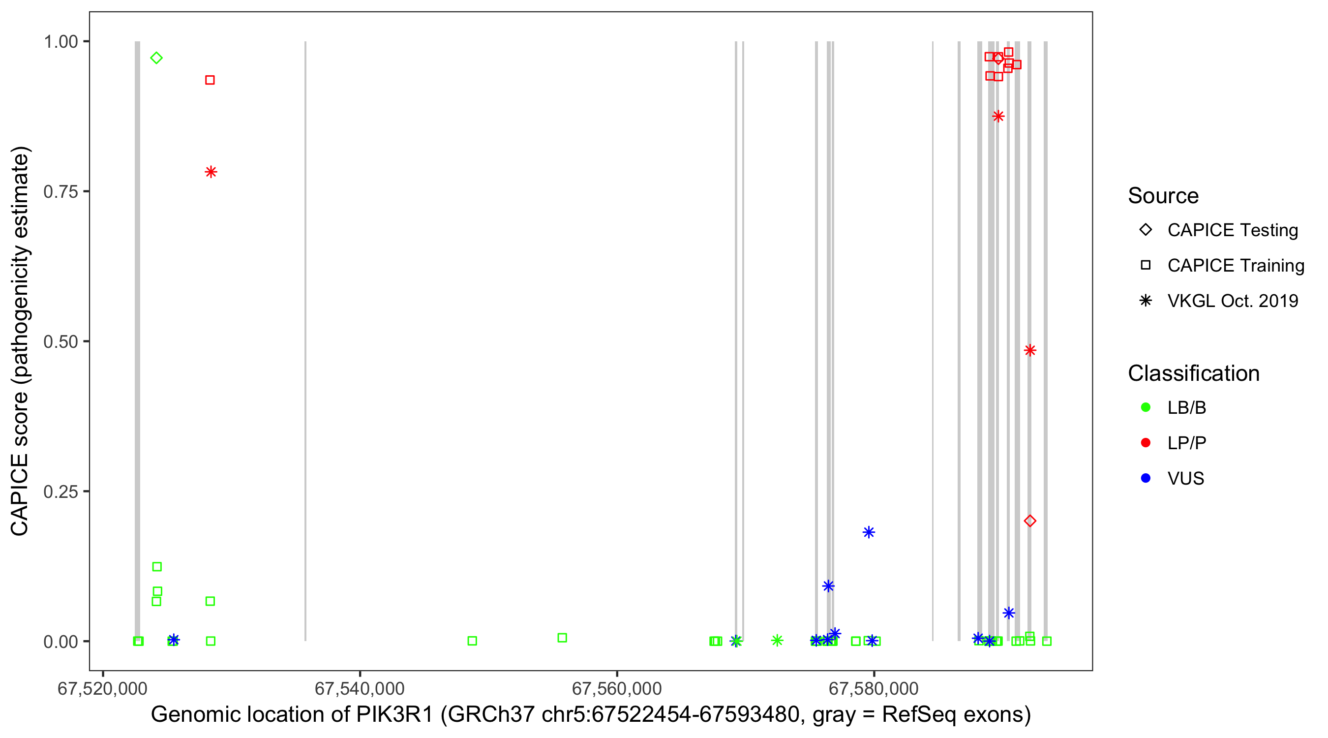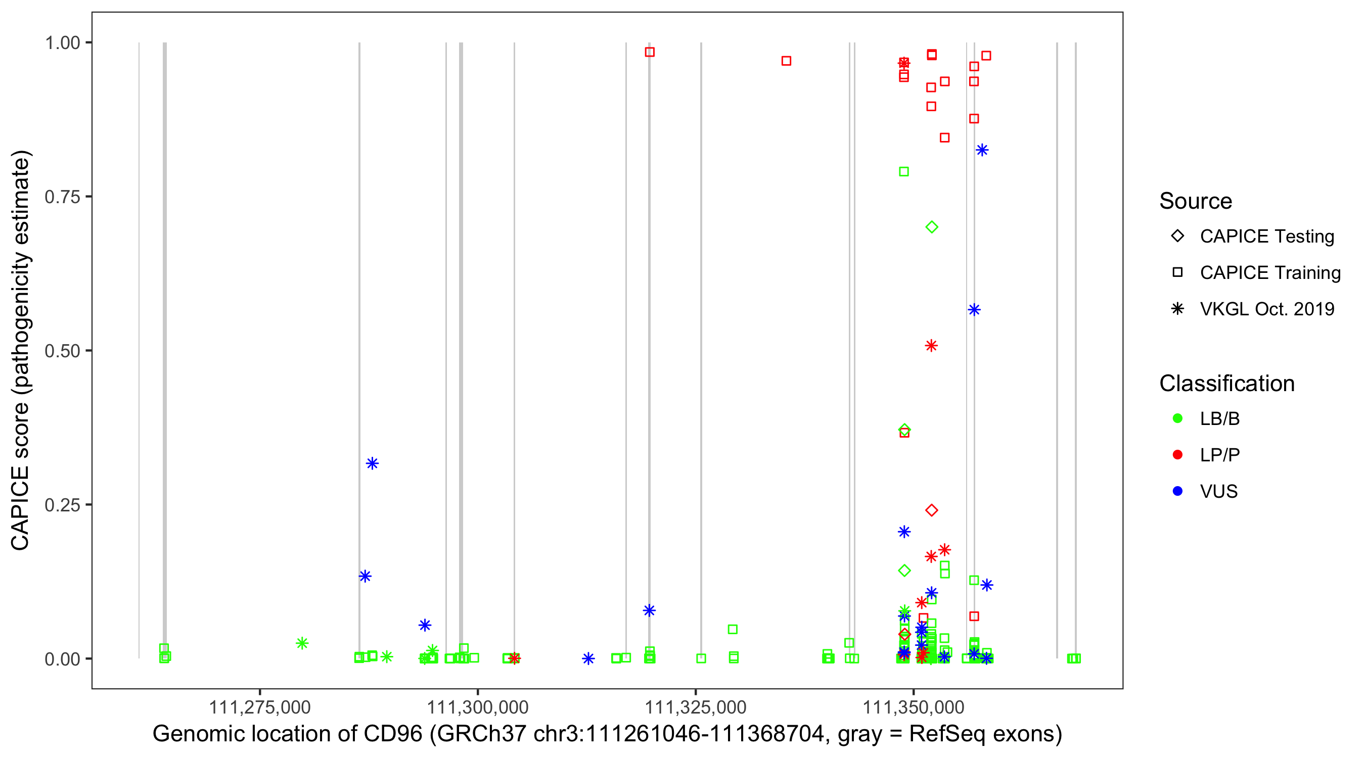 Shown are CAPICE train/test variants plus VKGL Oct 2019.