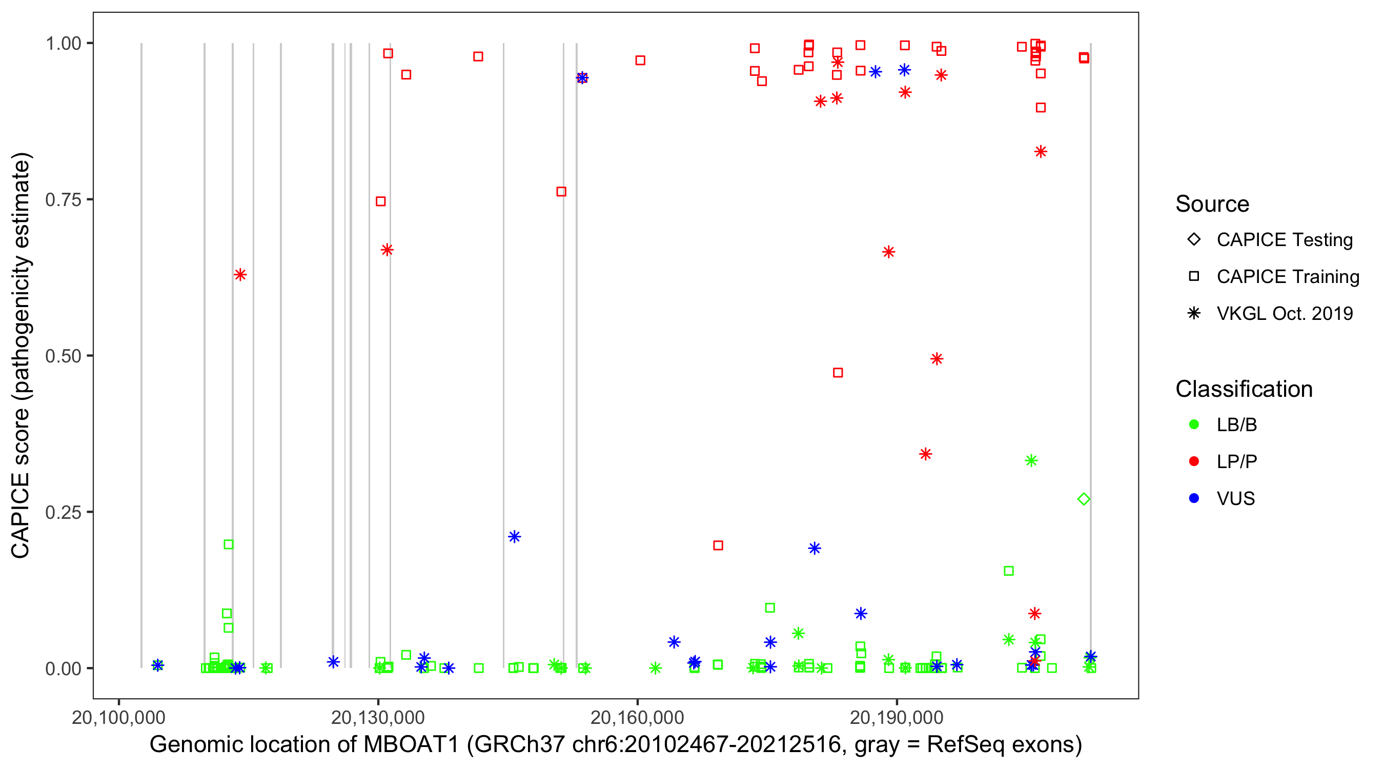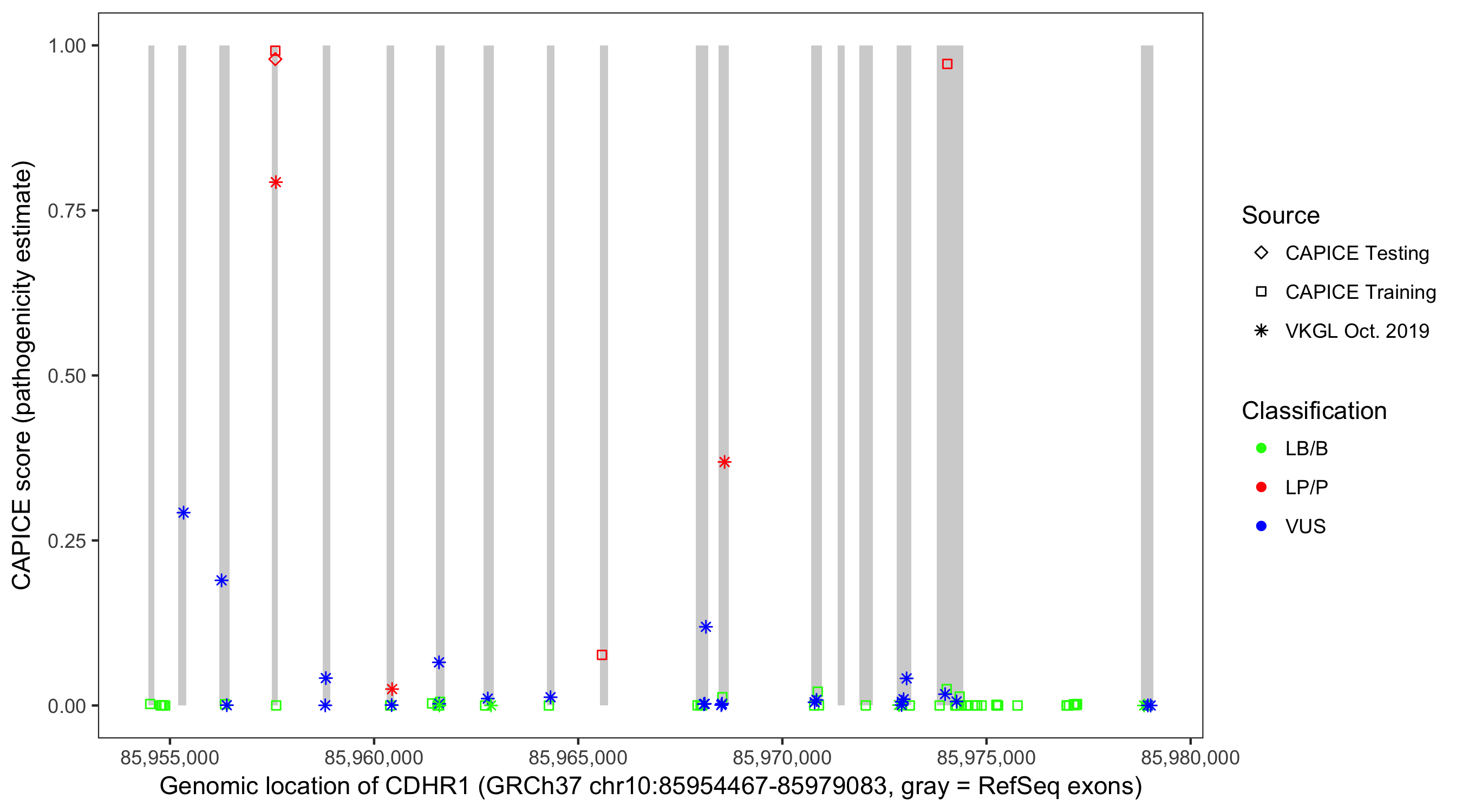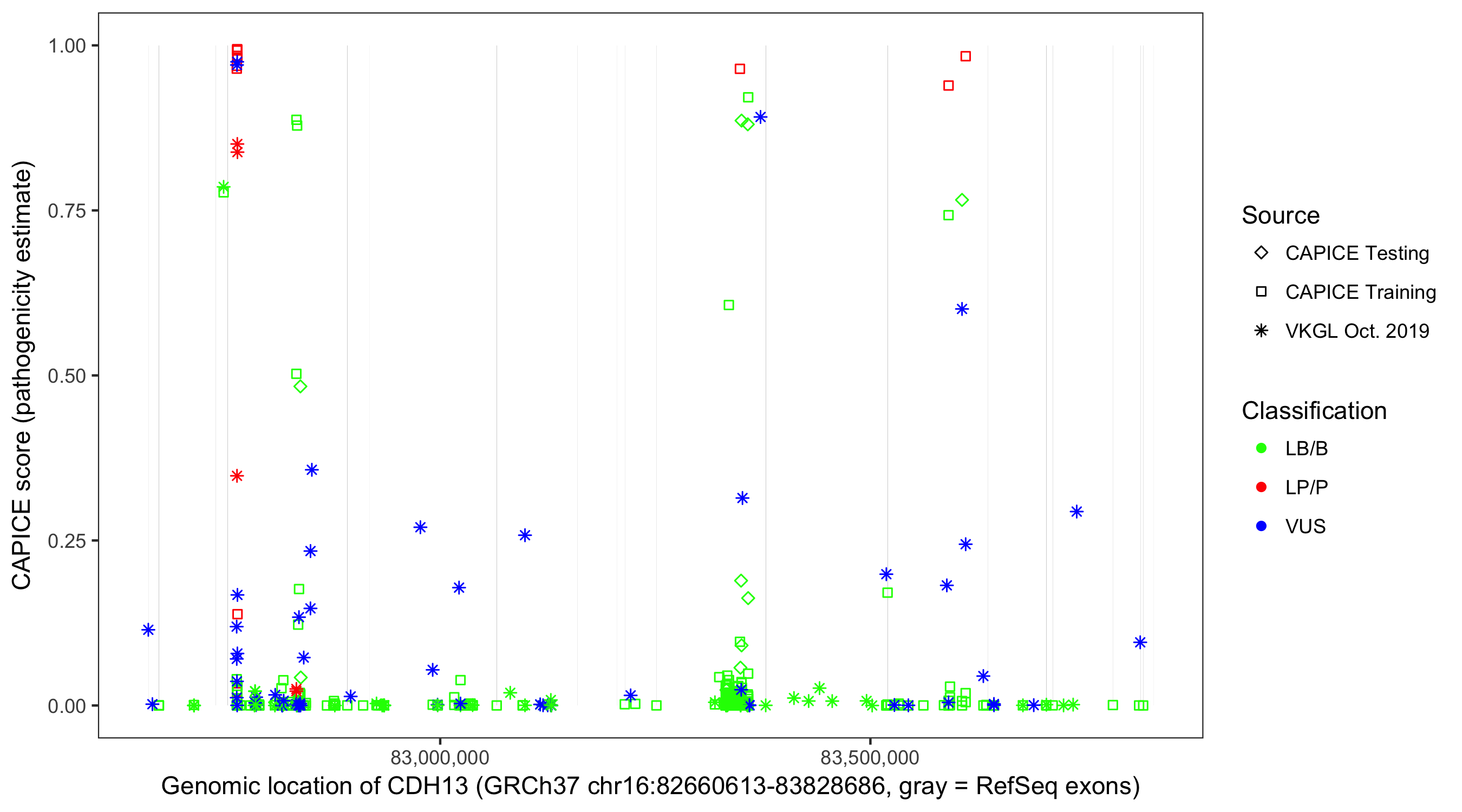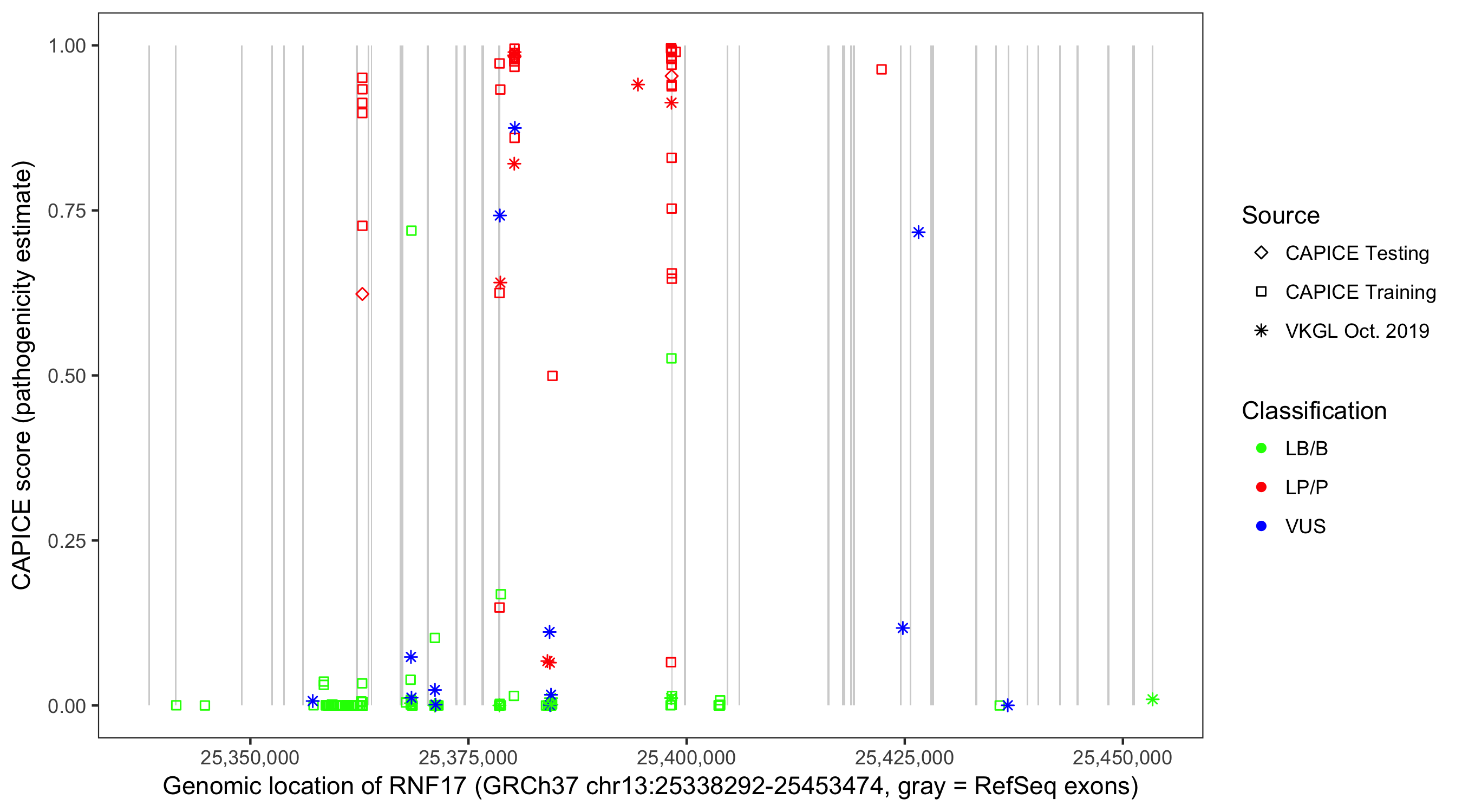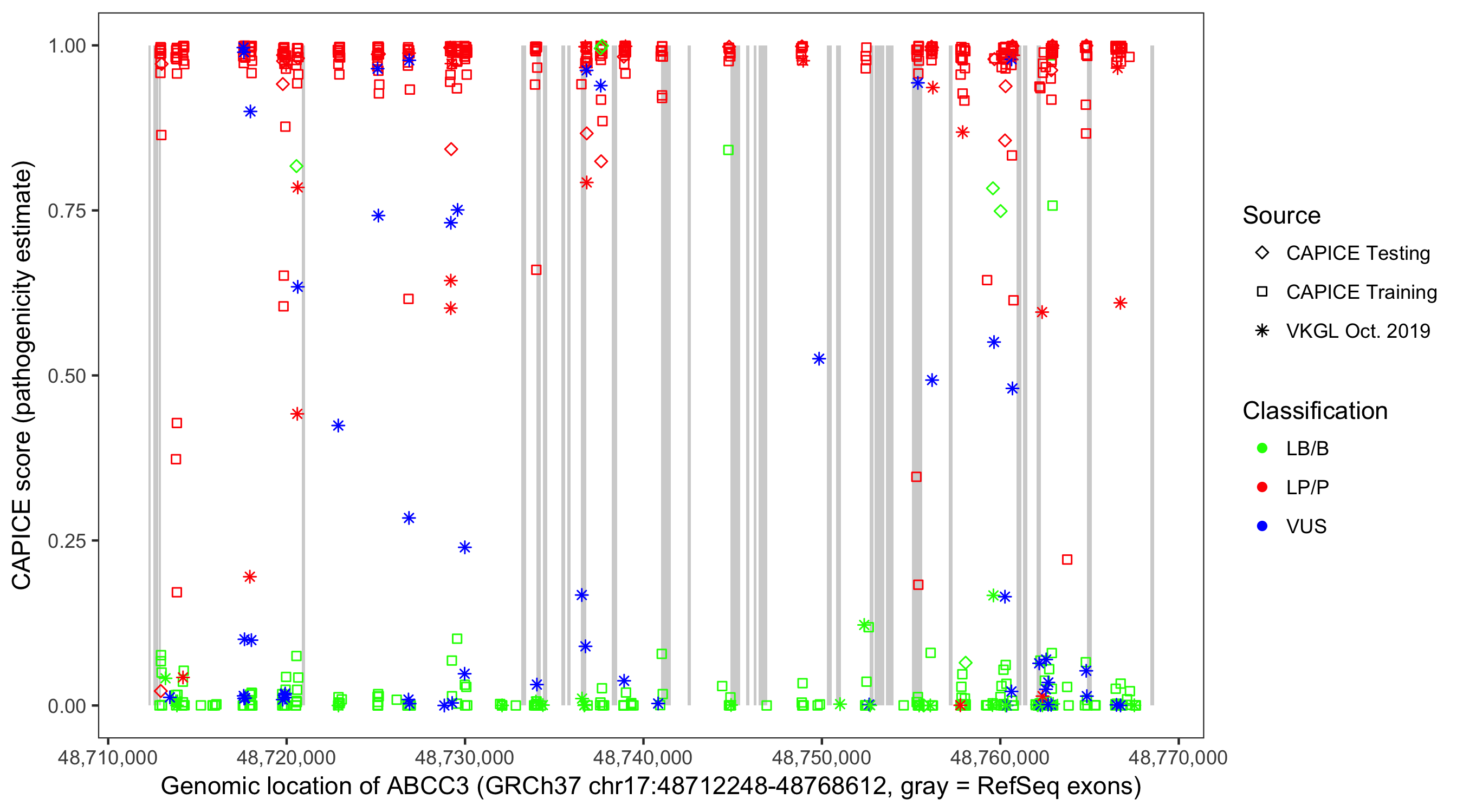 Shown are CAPICE train/test variants plus VKGL Oct 2019.