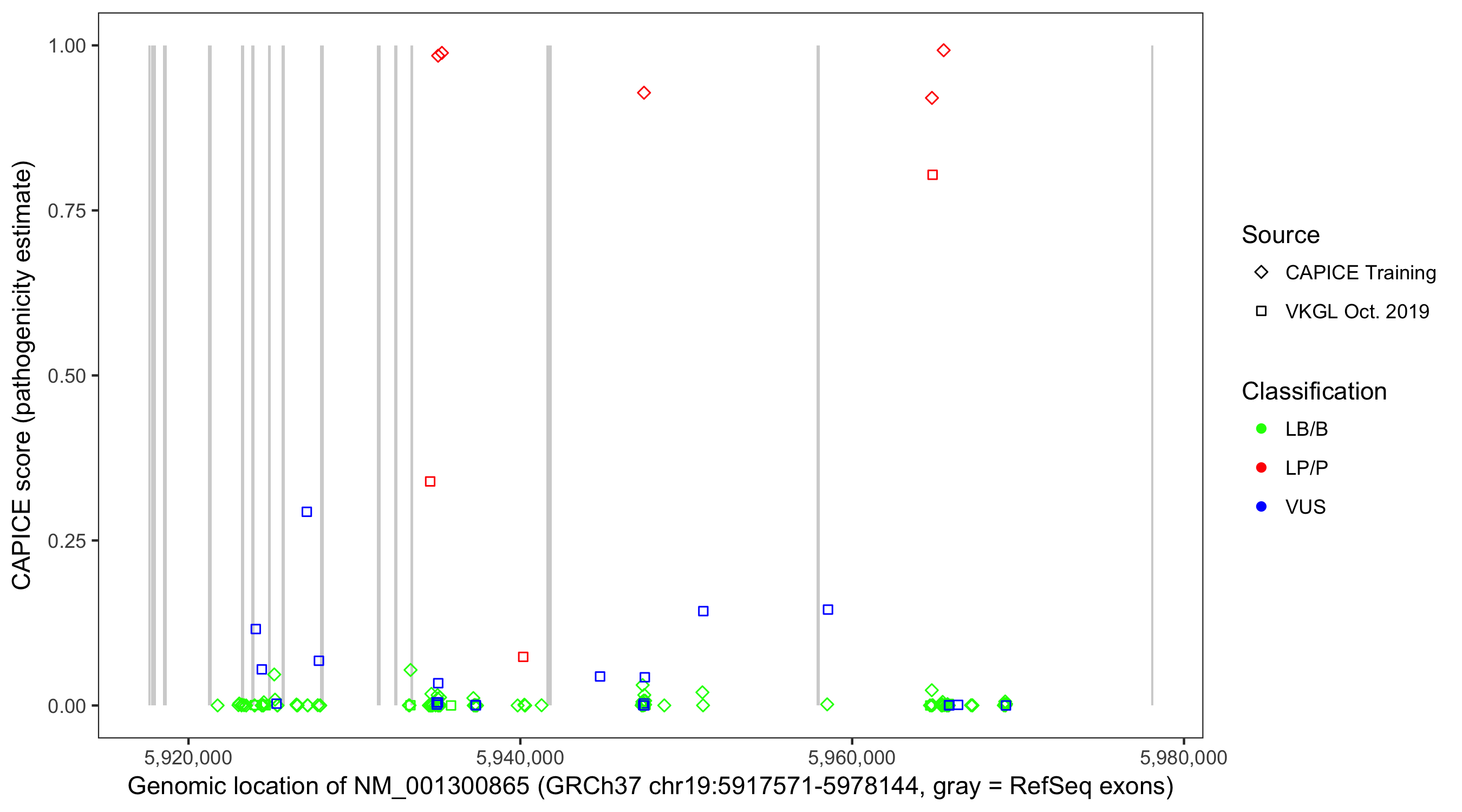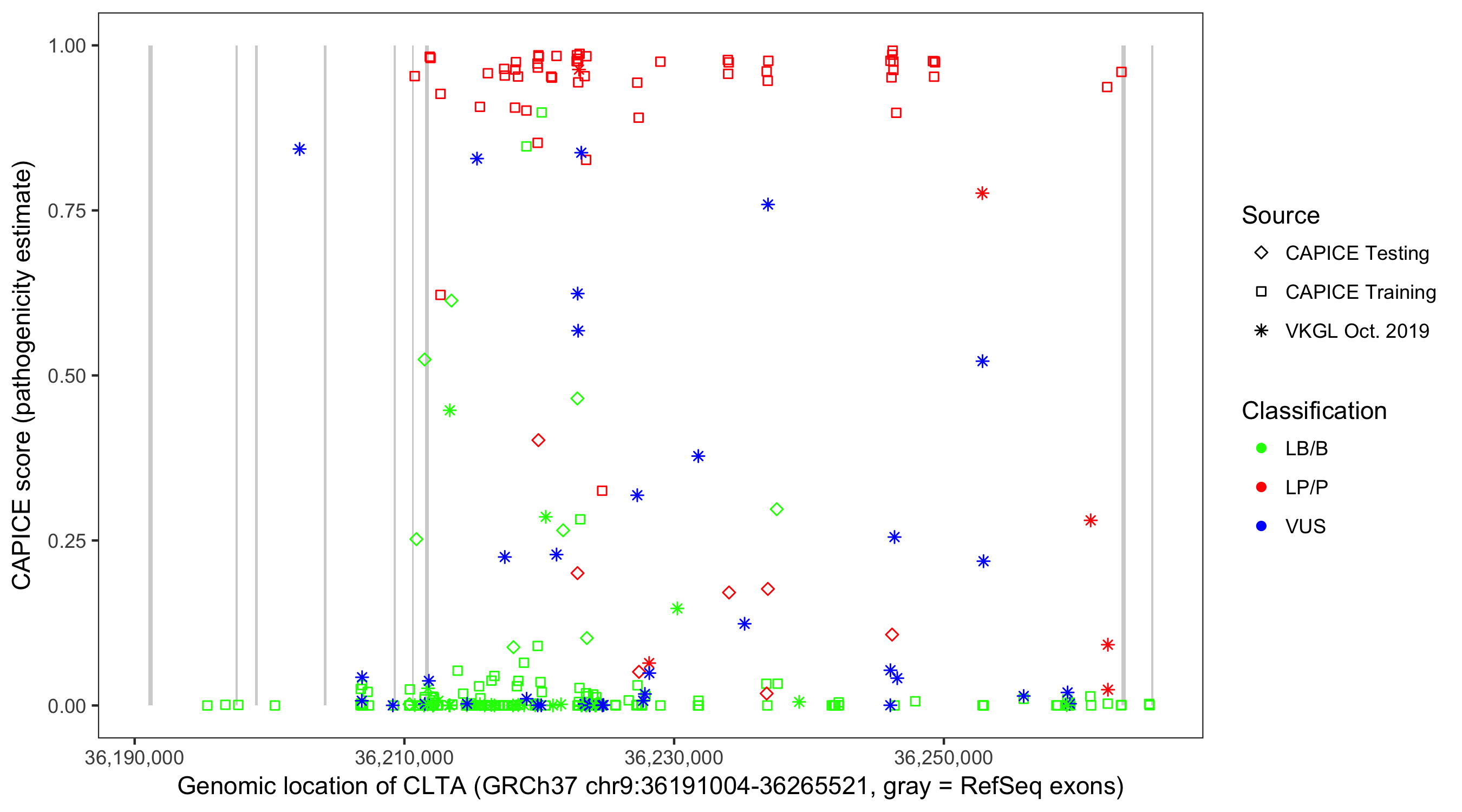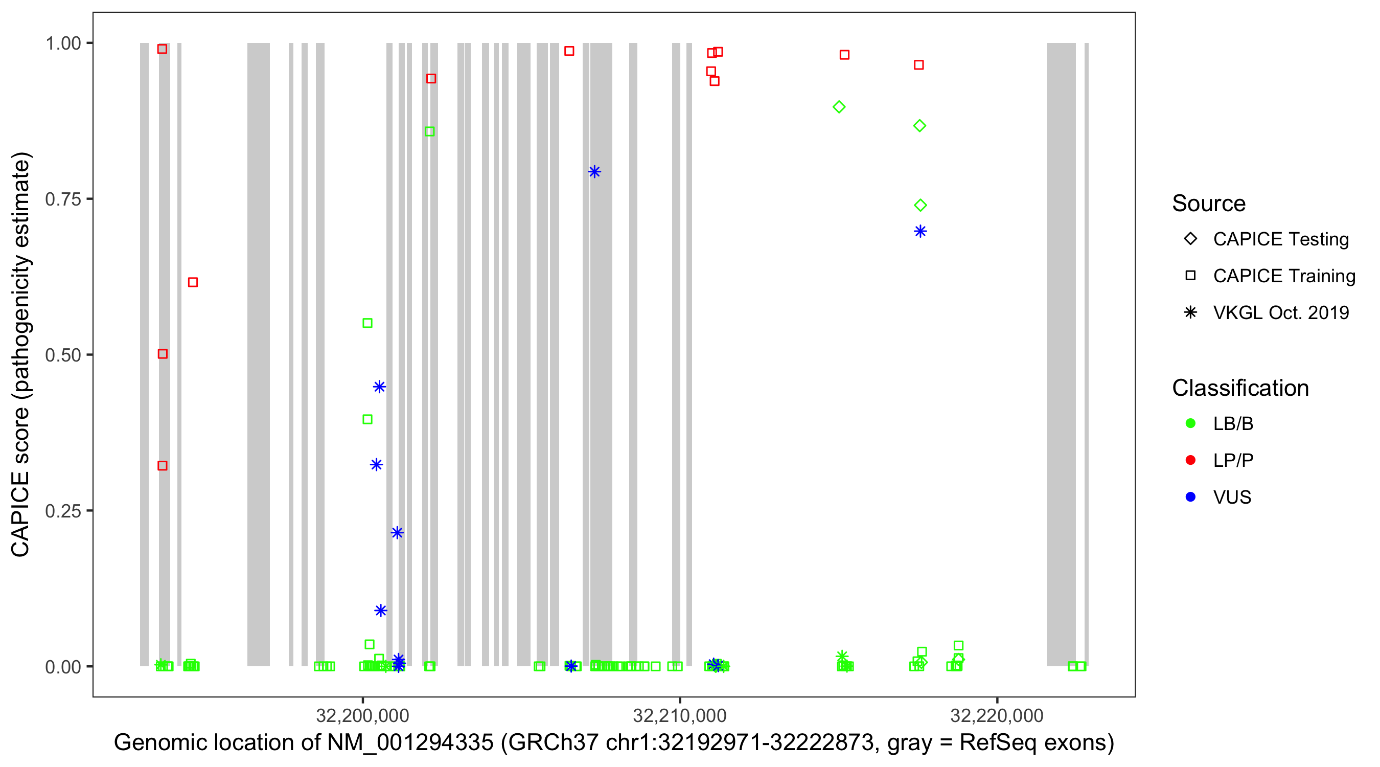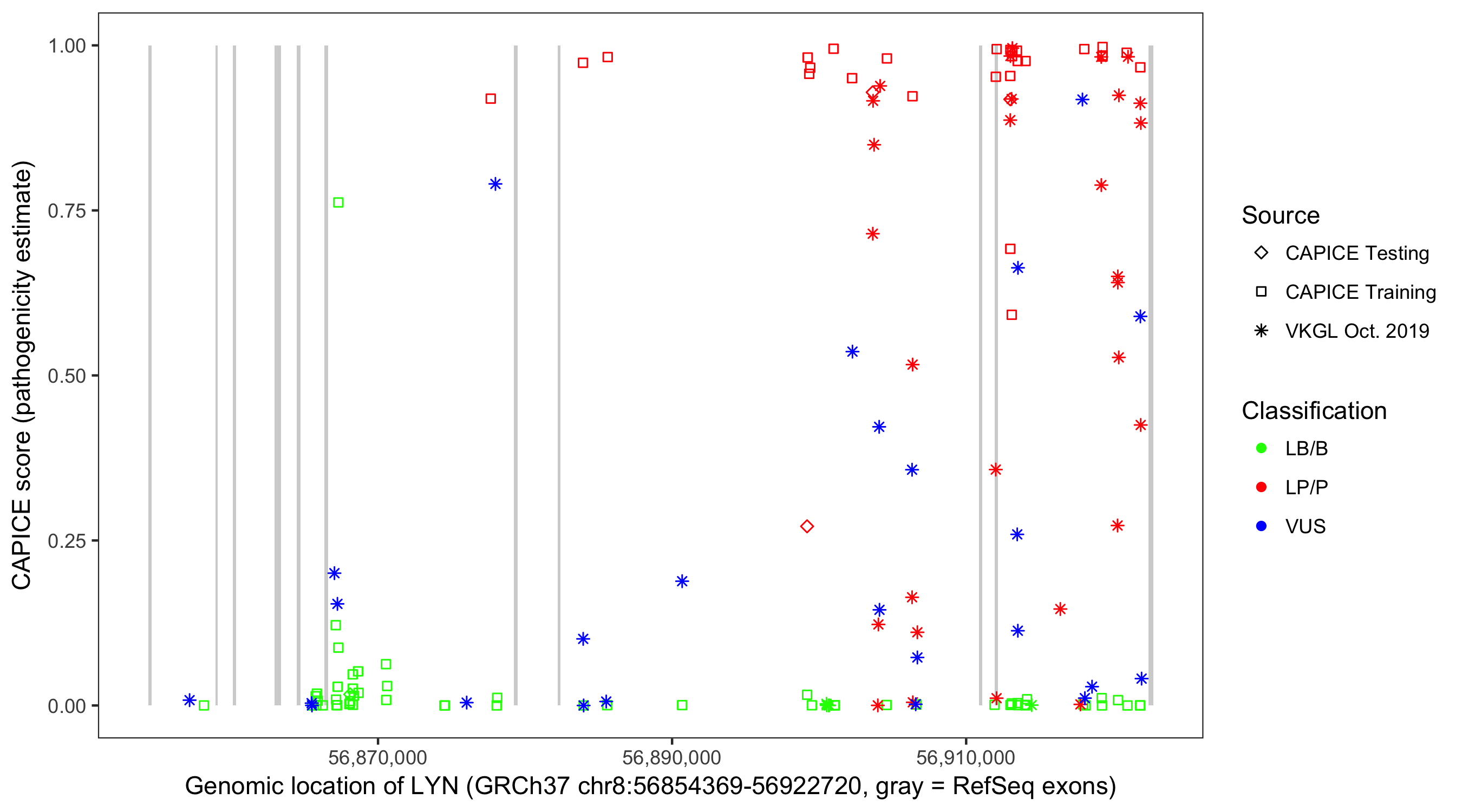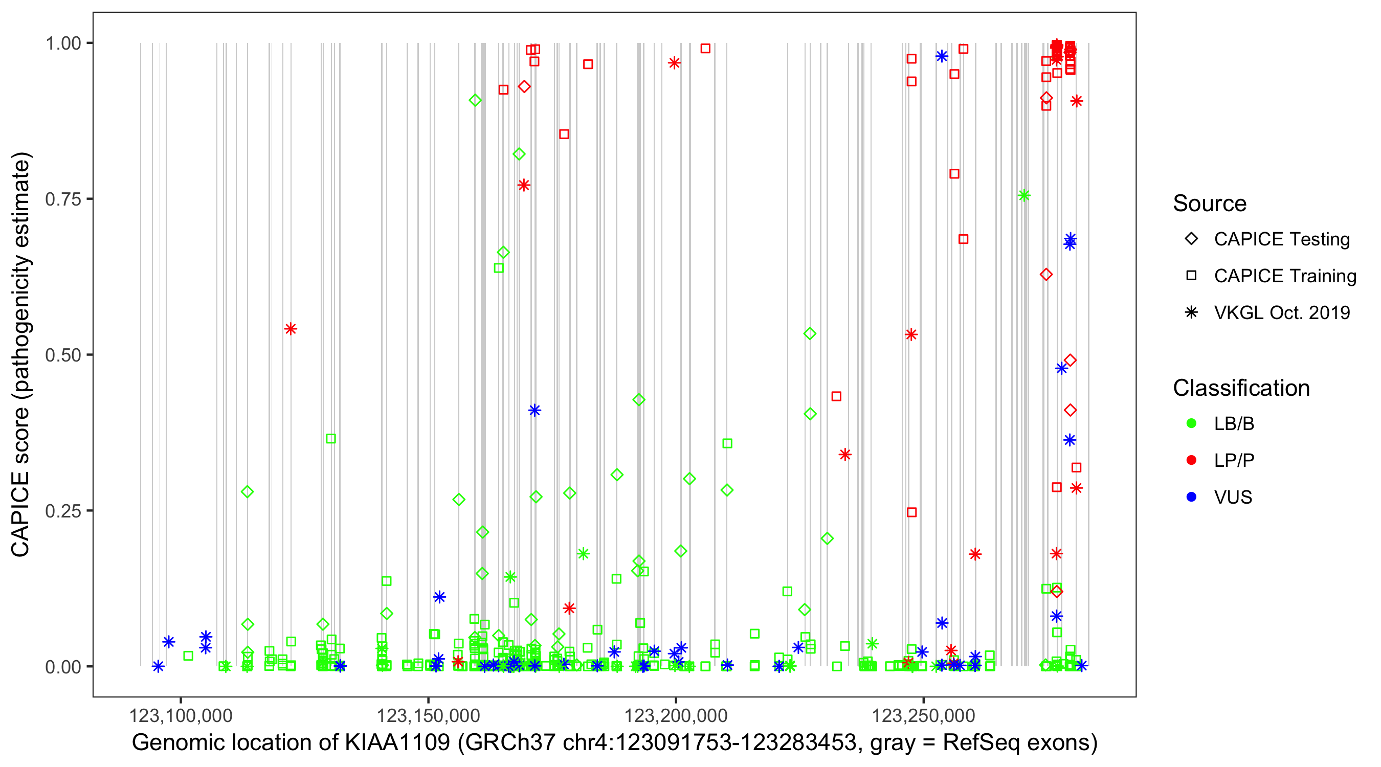 Shown are CAPICE train/test variants plus VKGL Oct 2019.