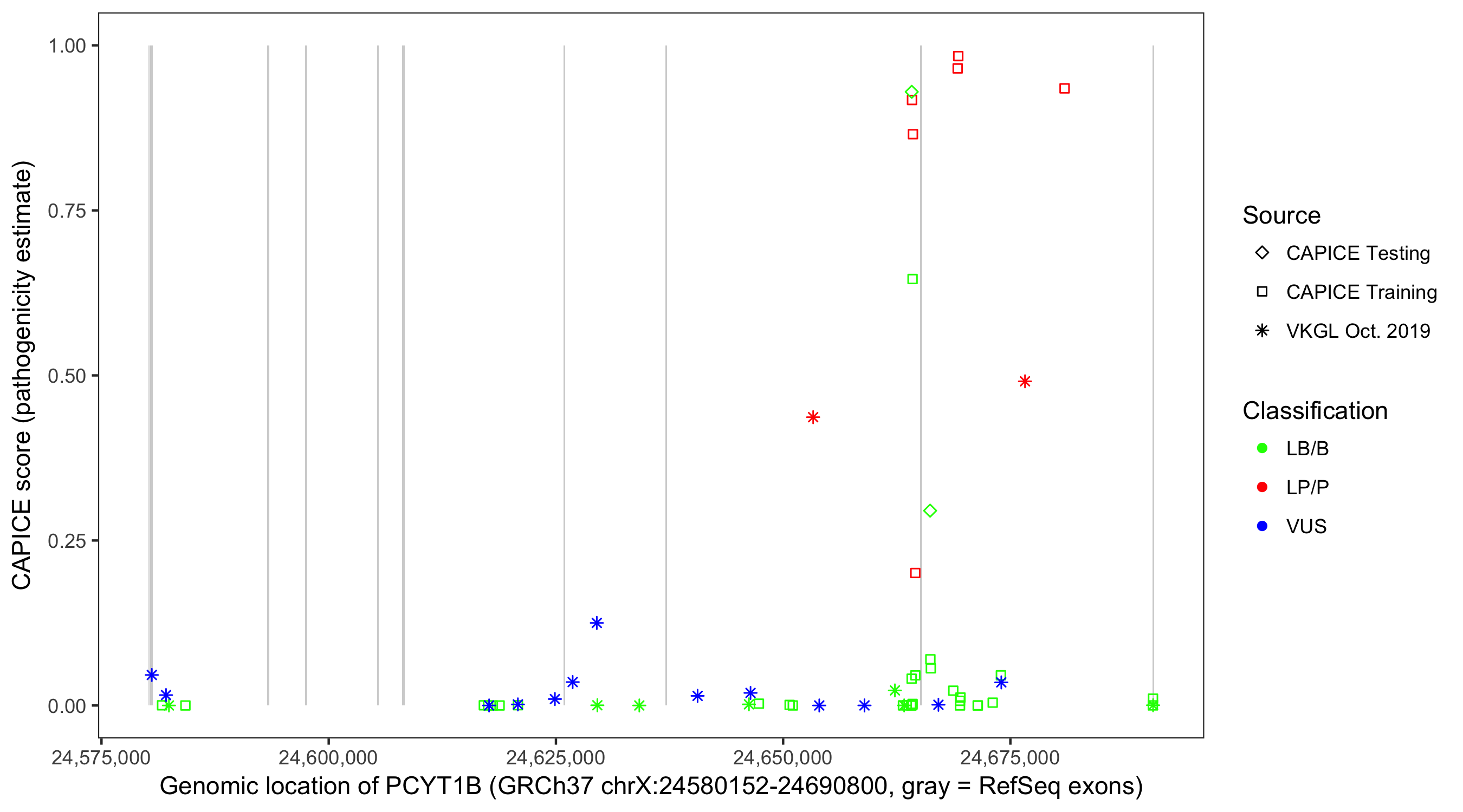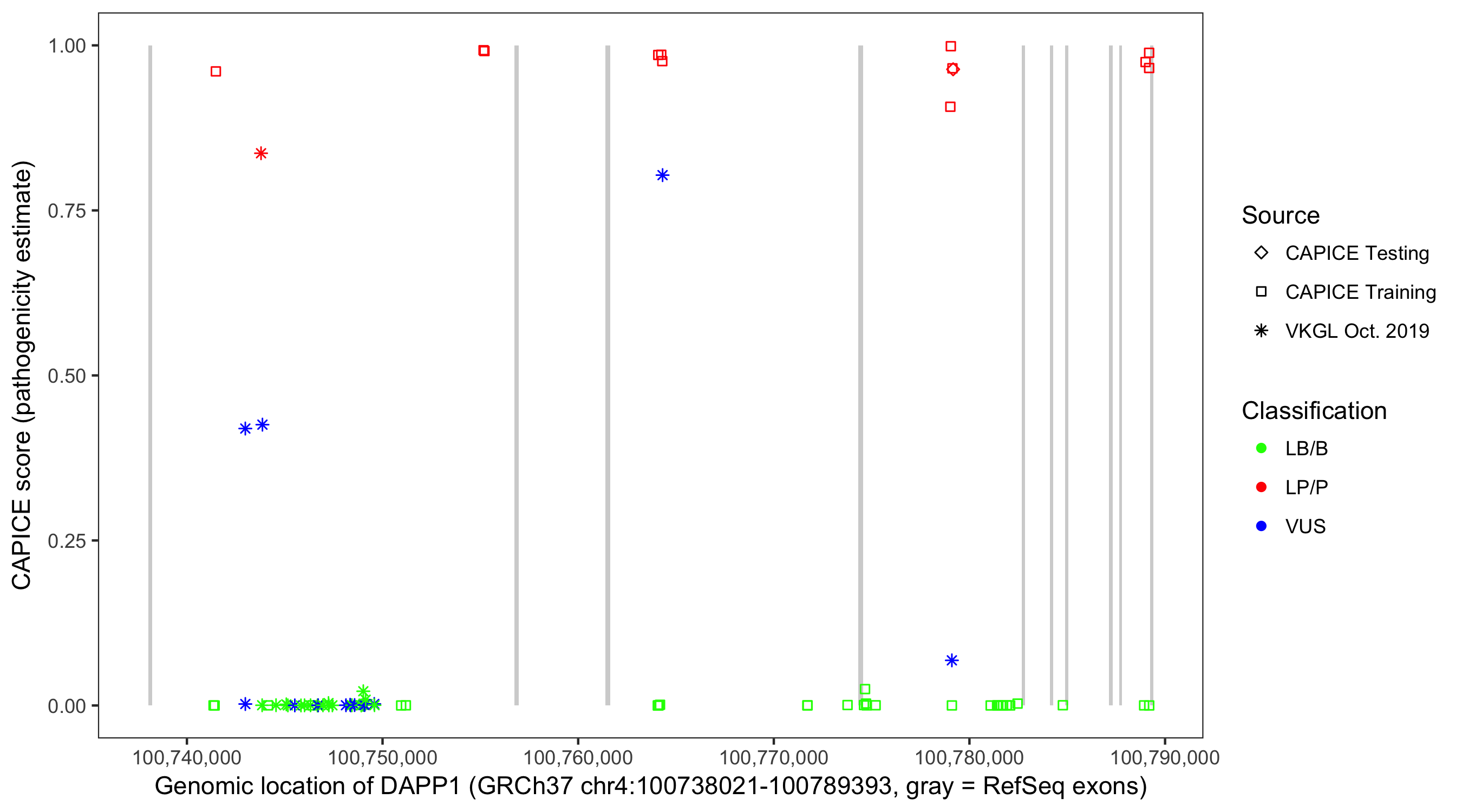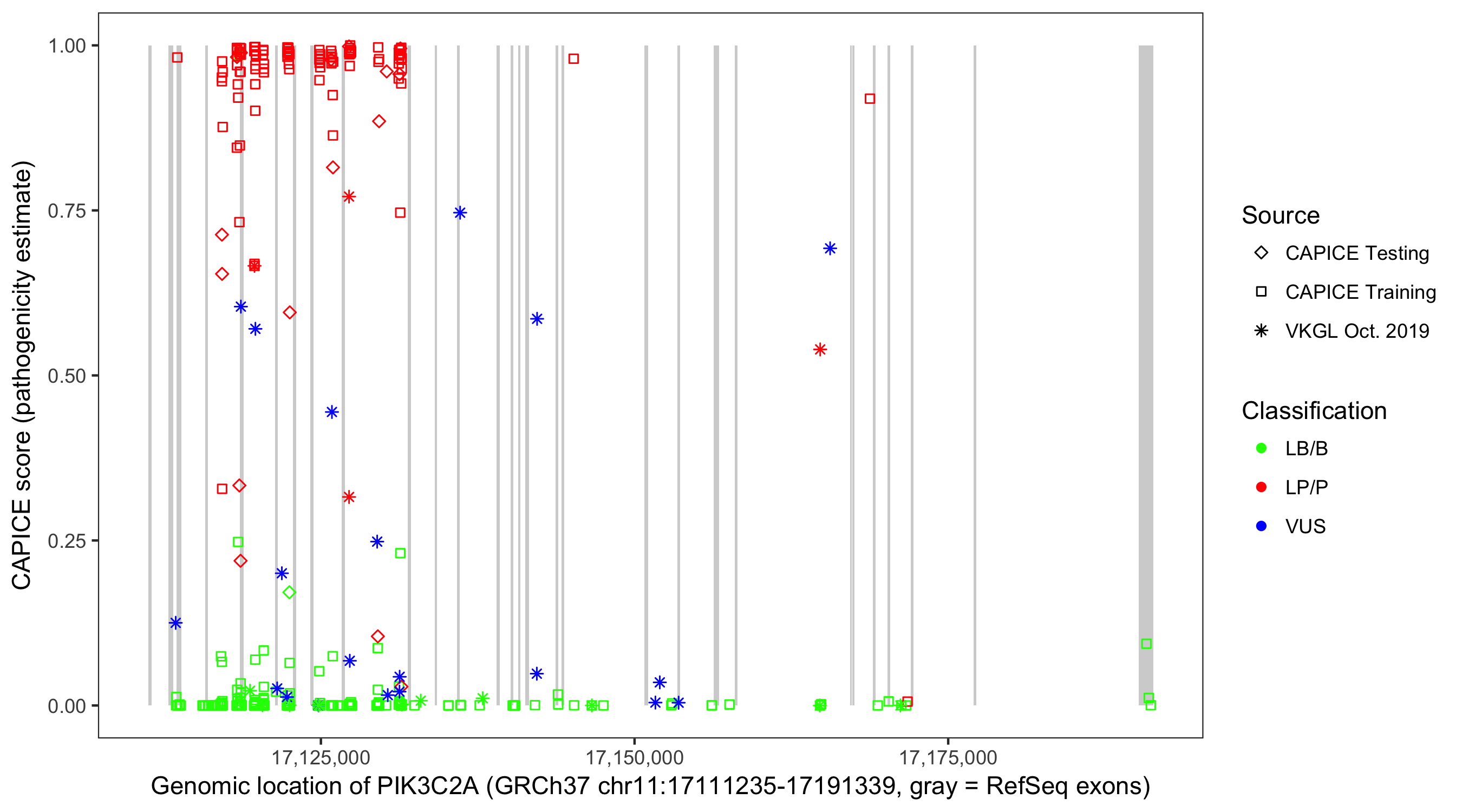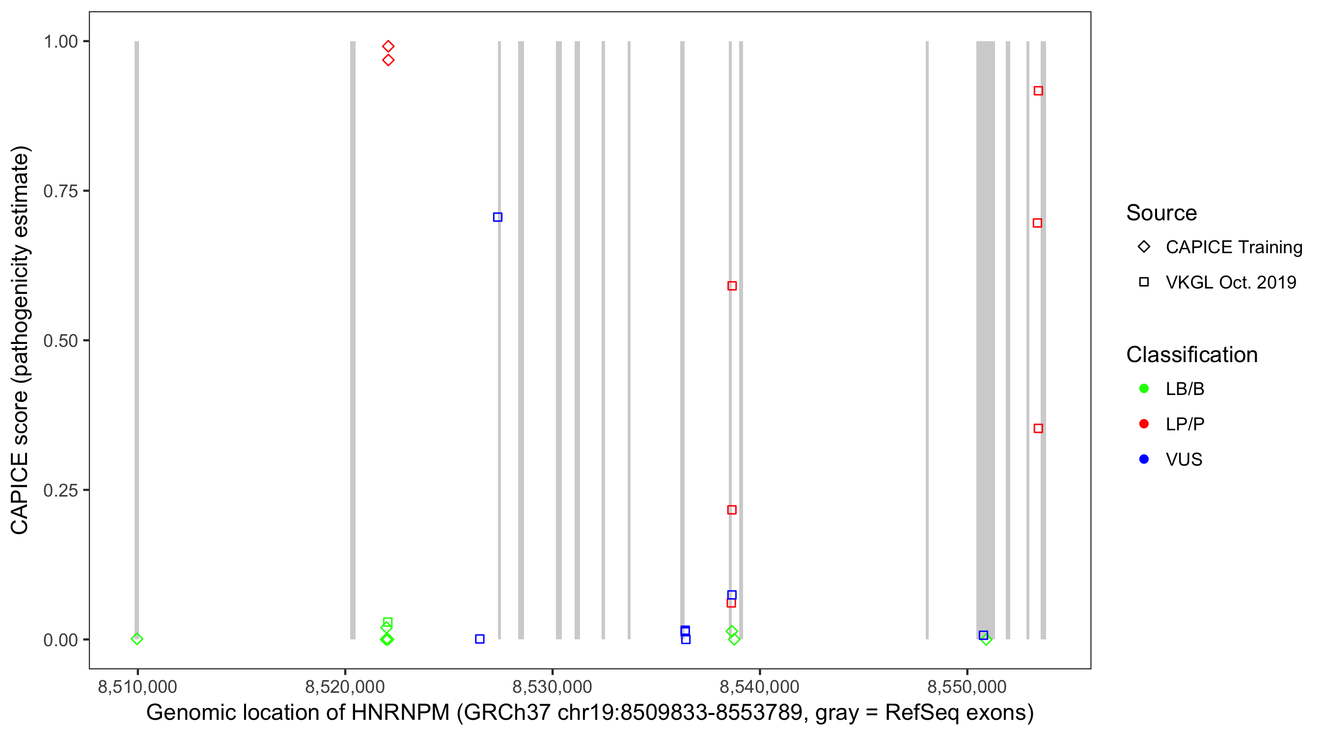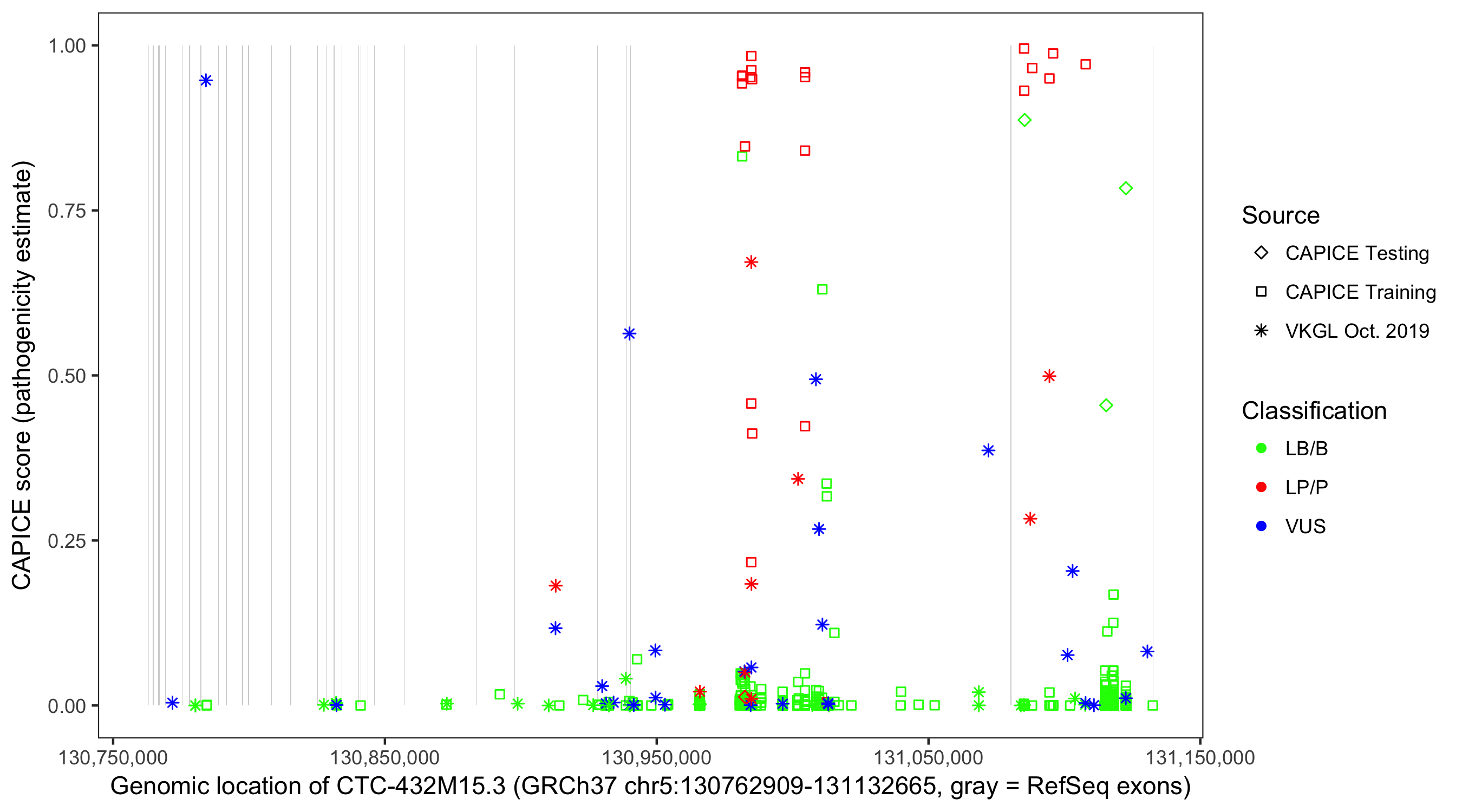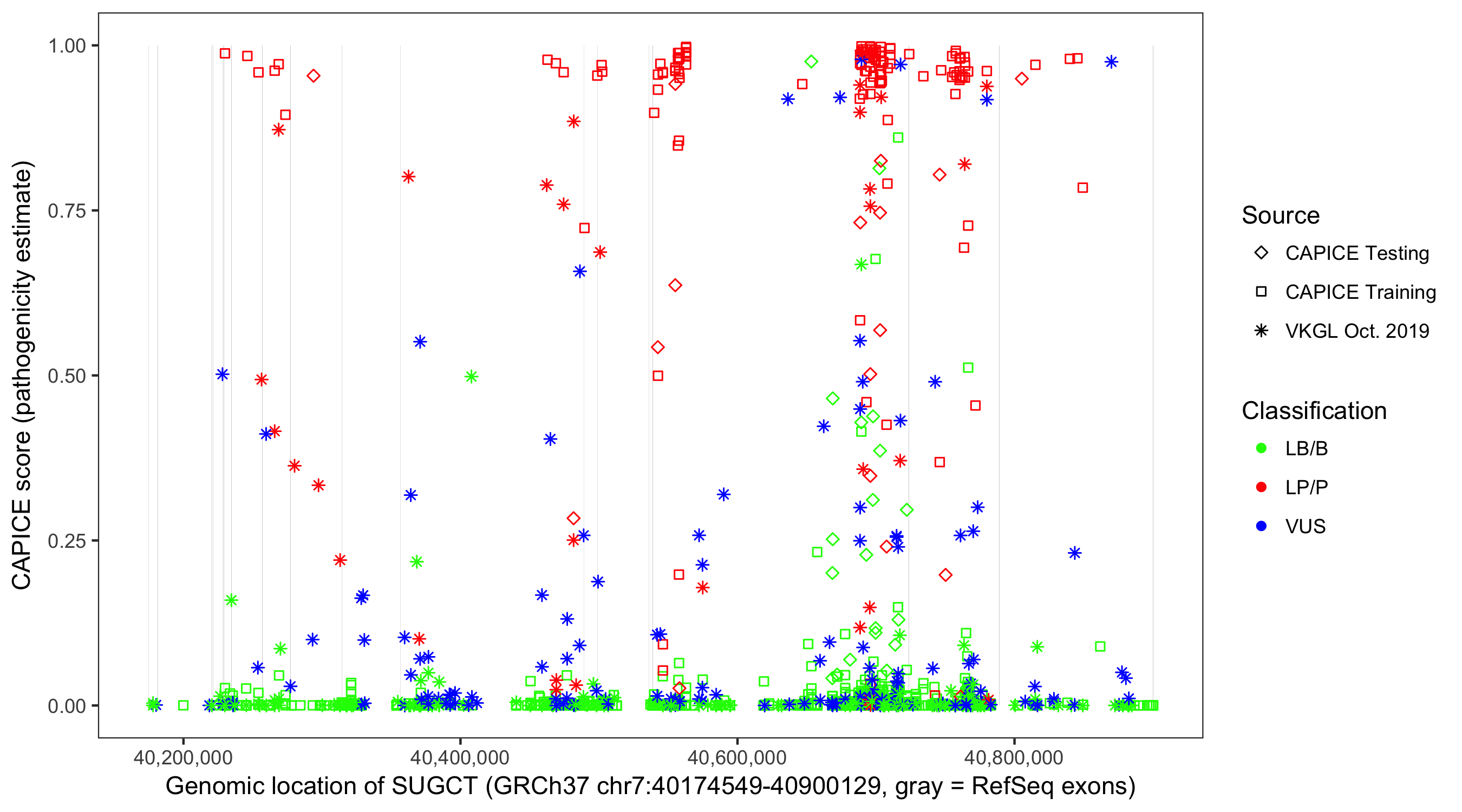 Shown are CAPICE train/test variants plus VKGL Oct 2019.