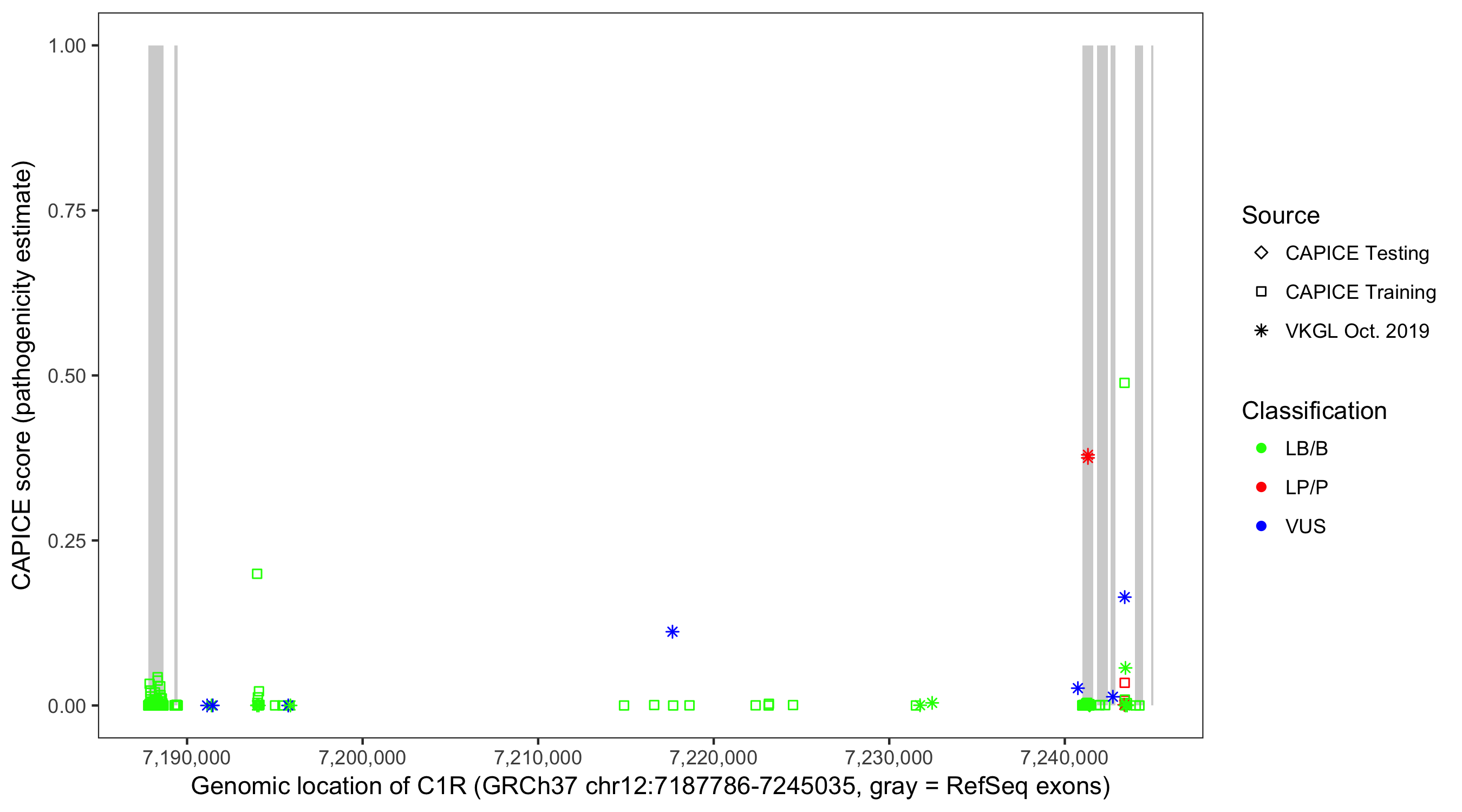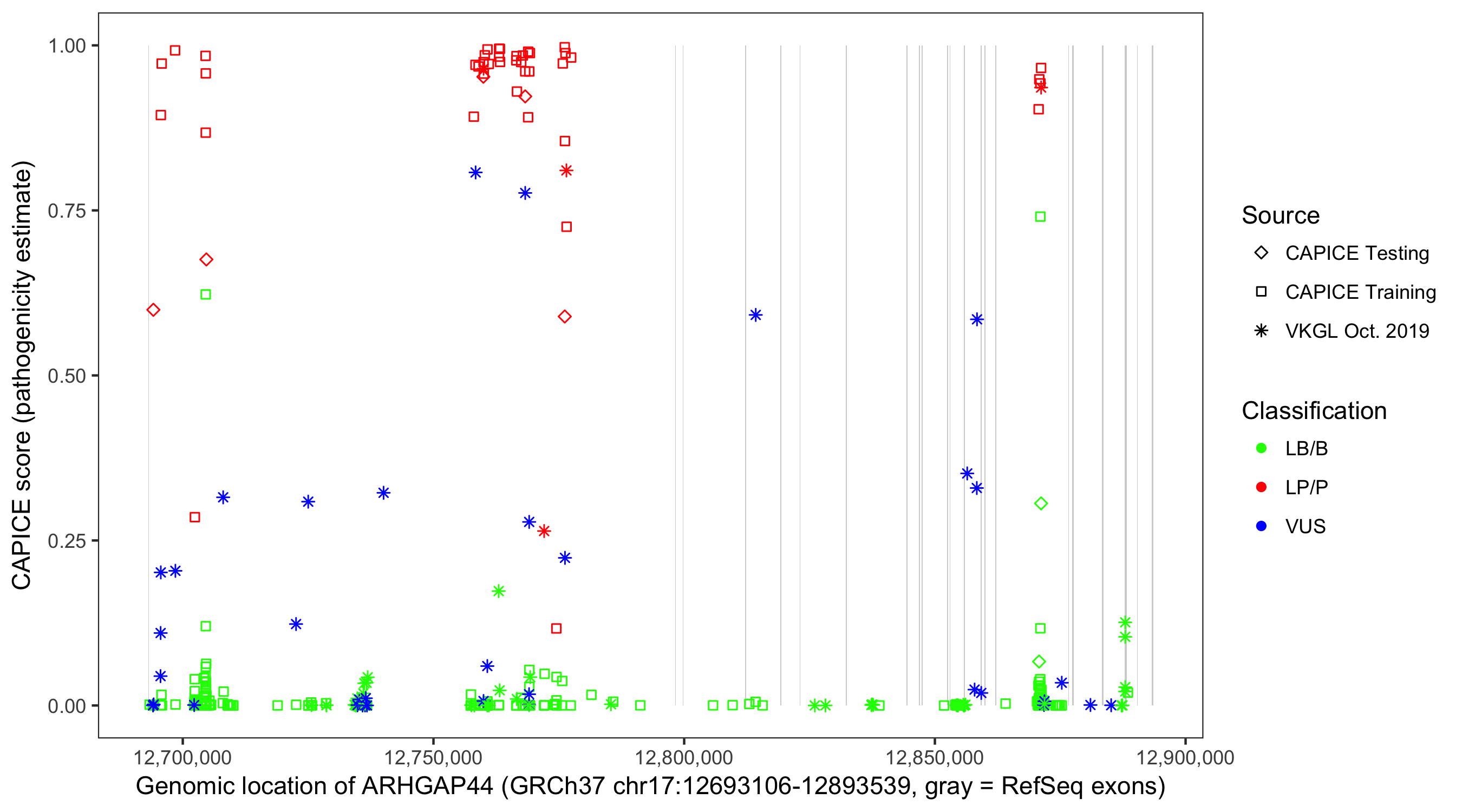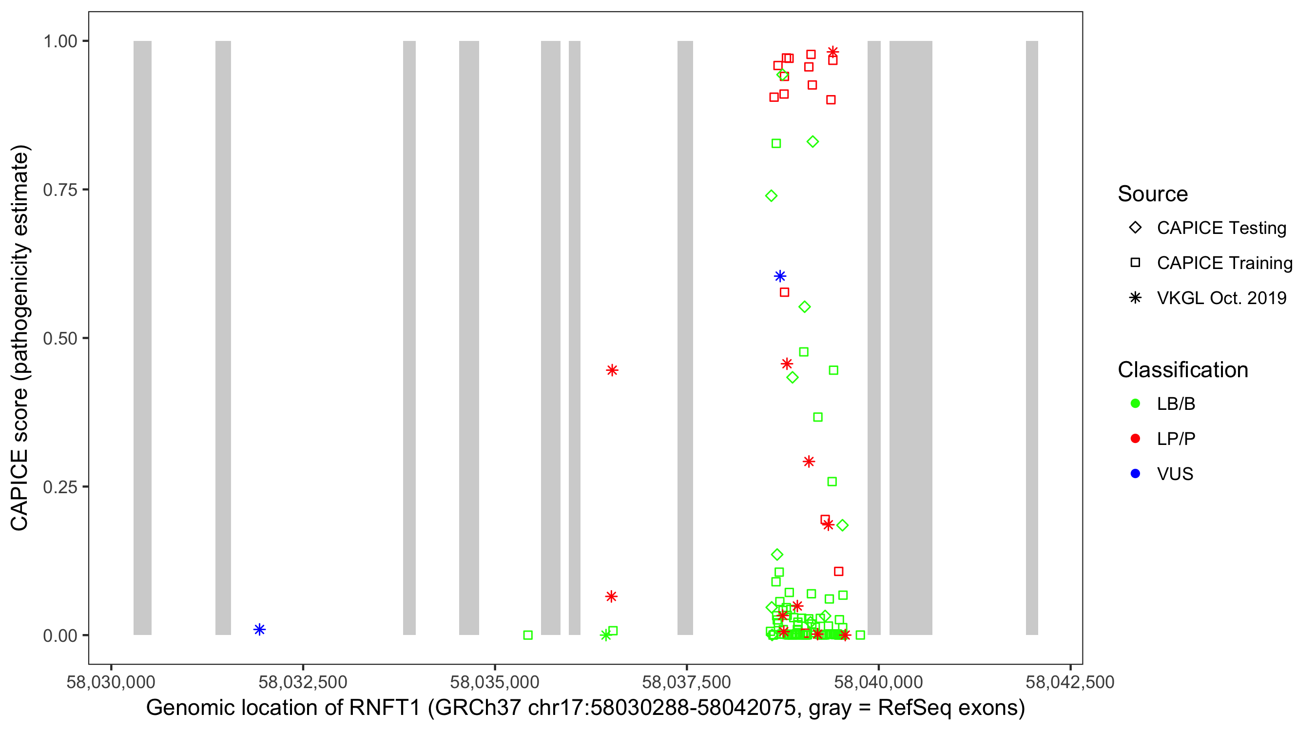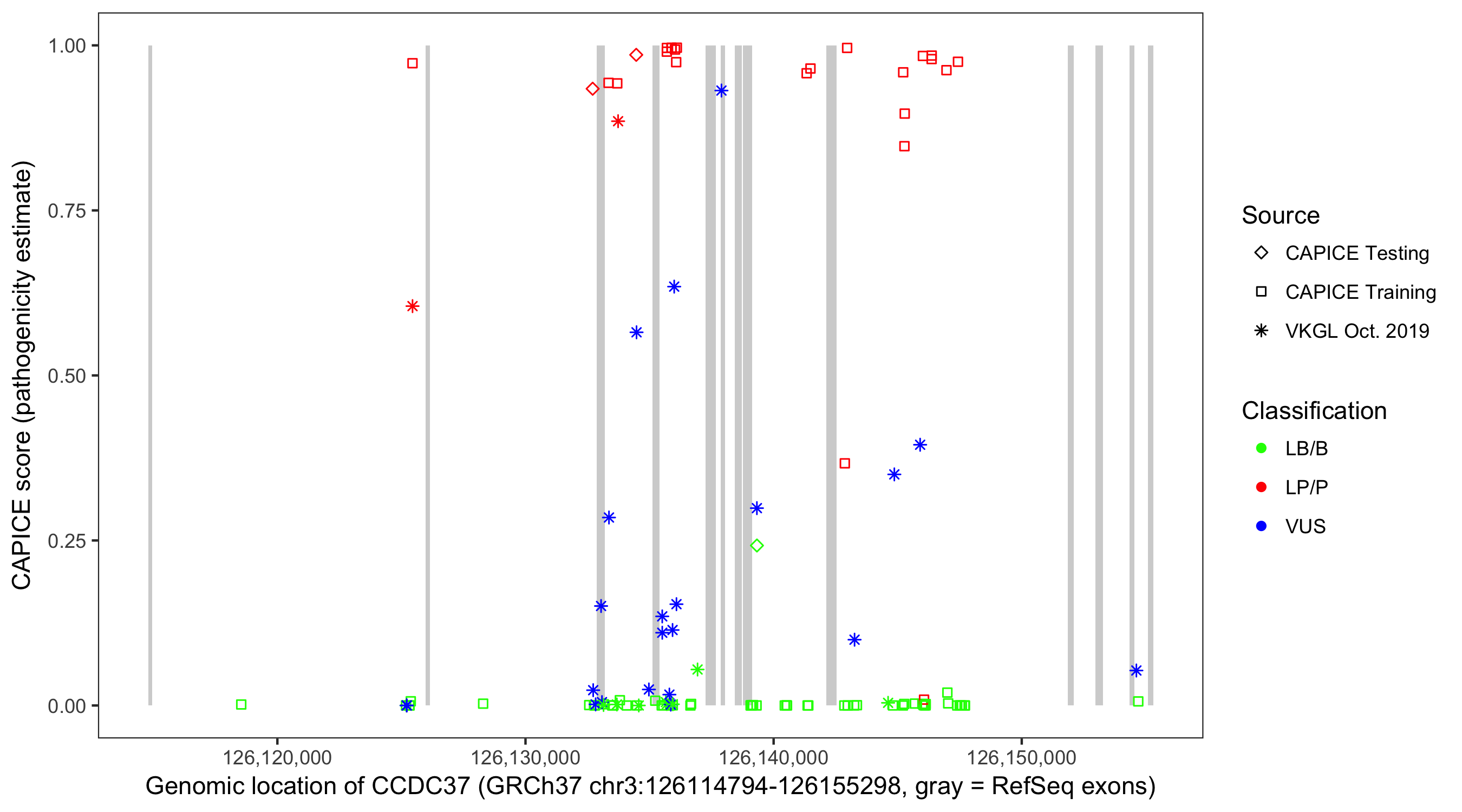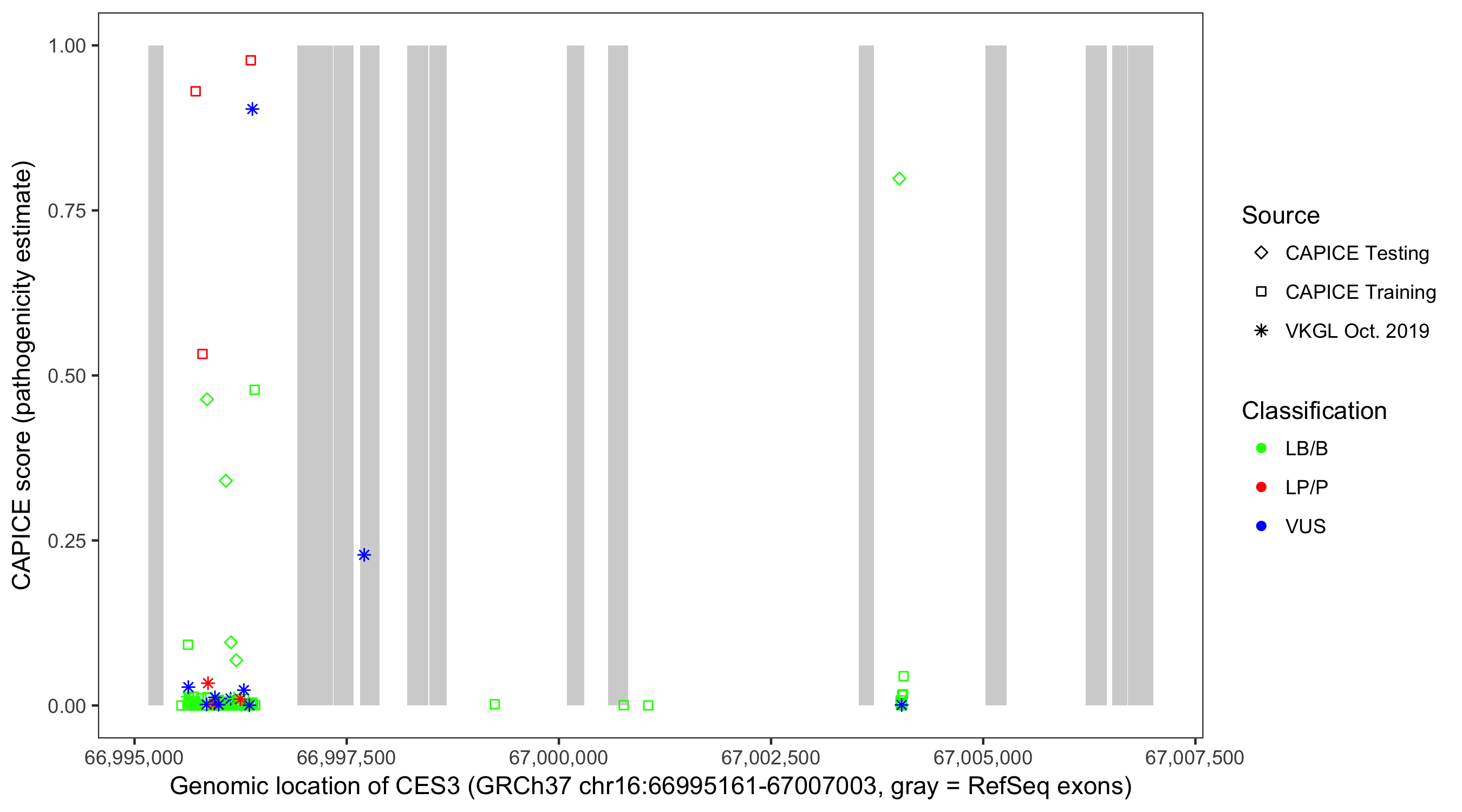 Shown are CAPICE train/test variants plus VKGL Oct 2019.