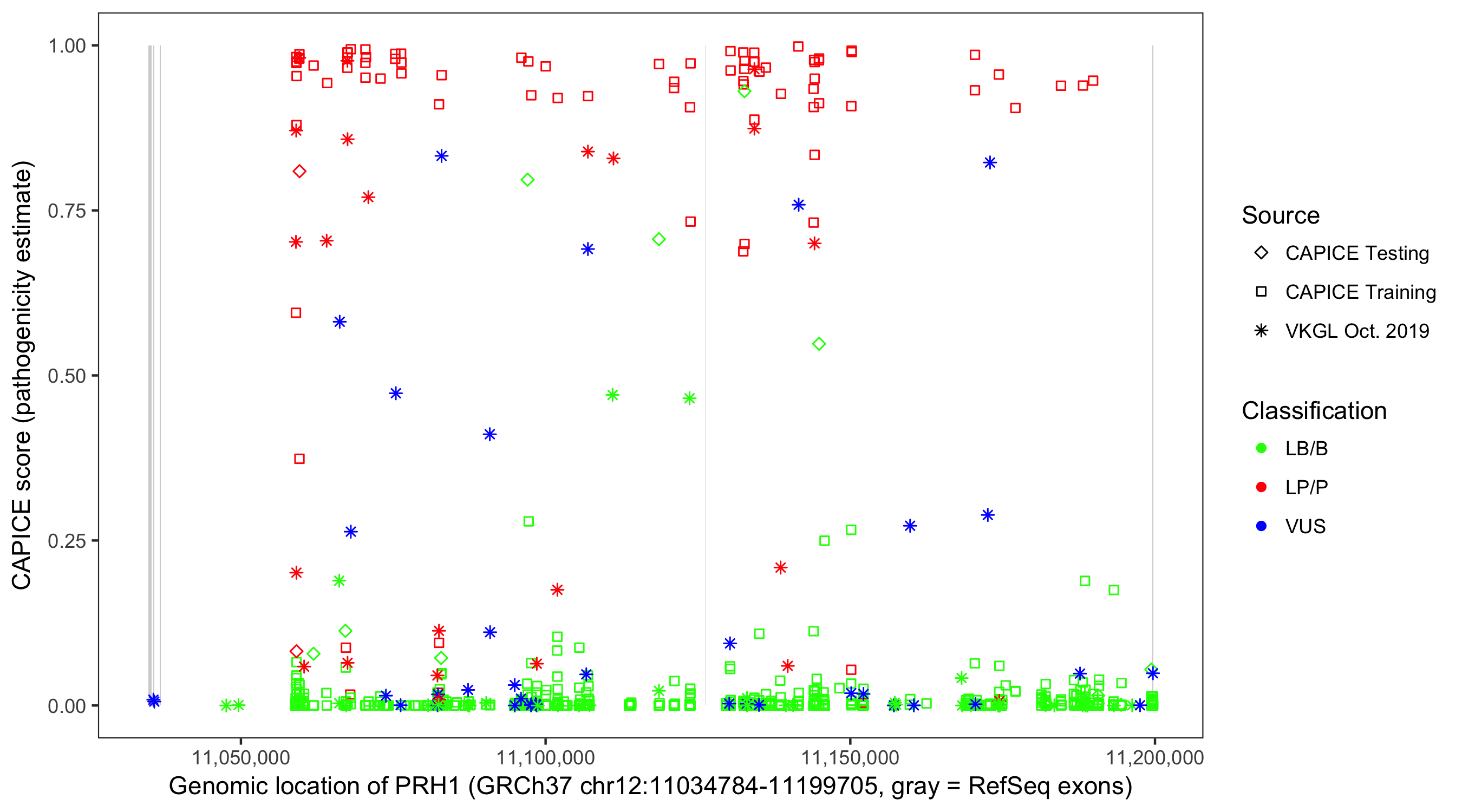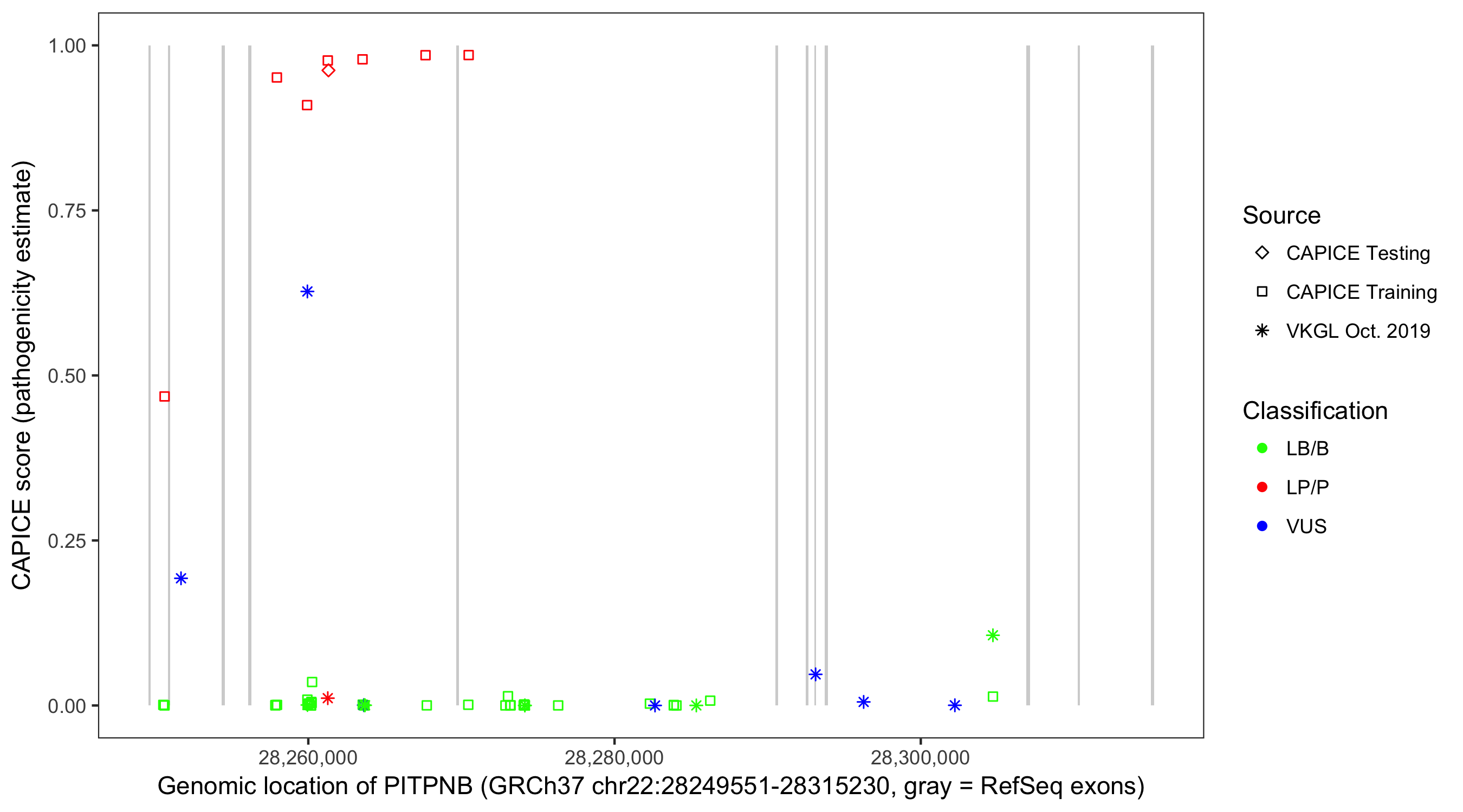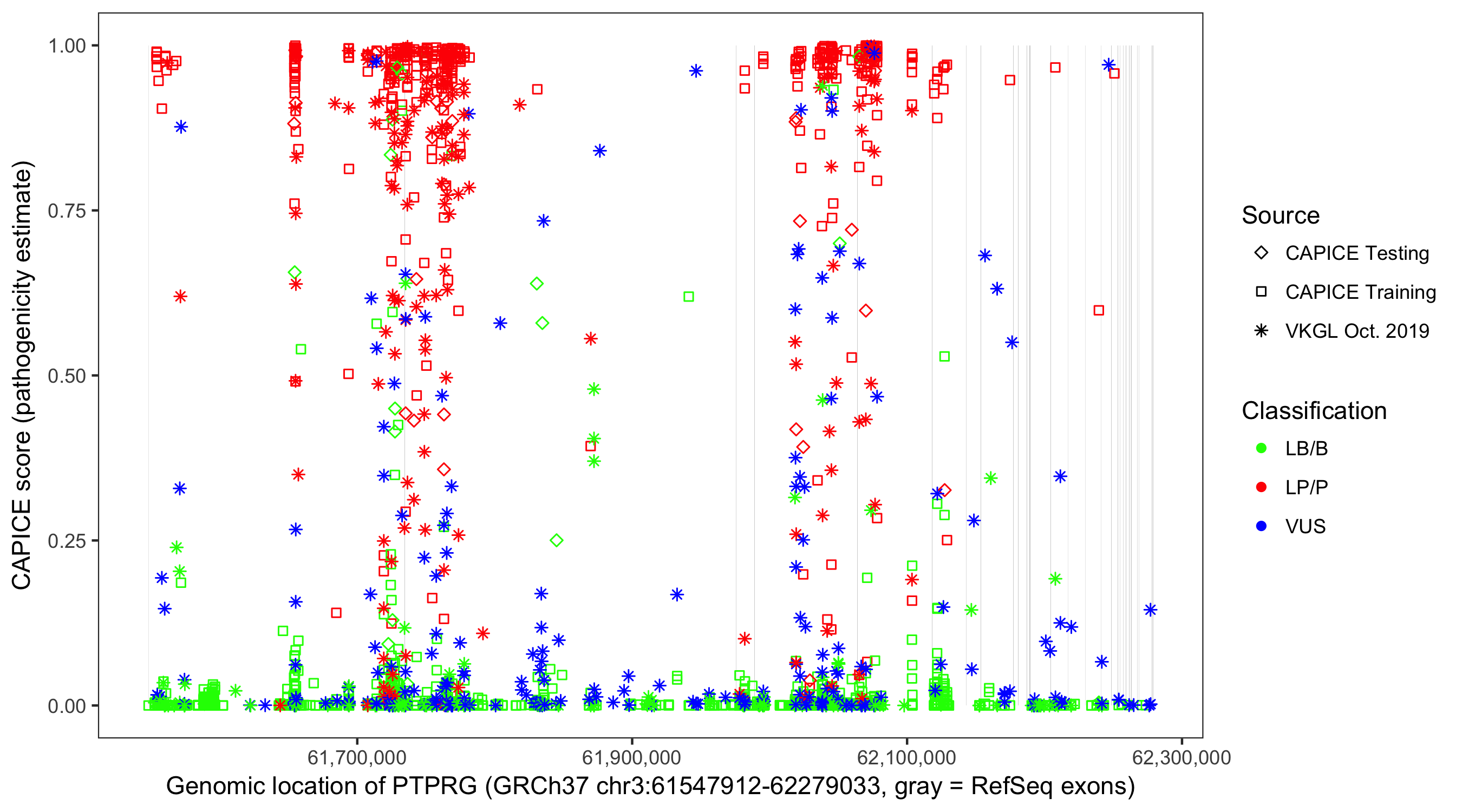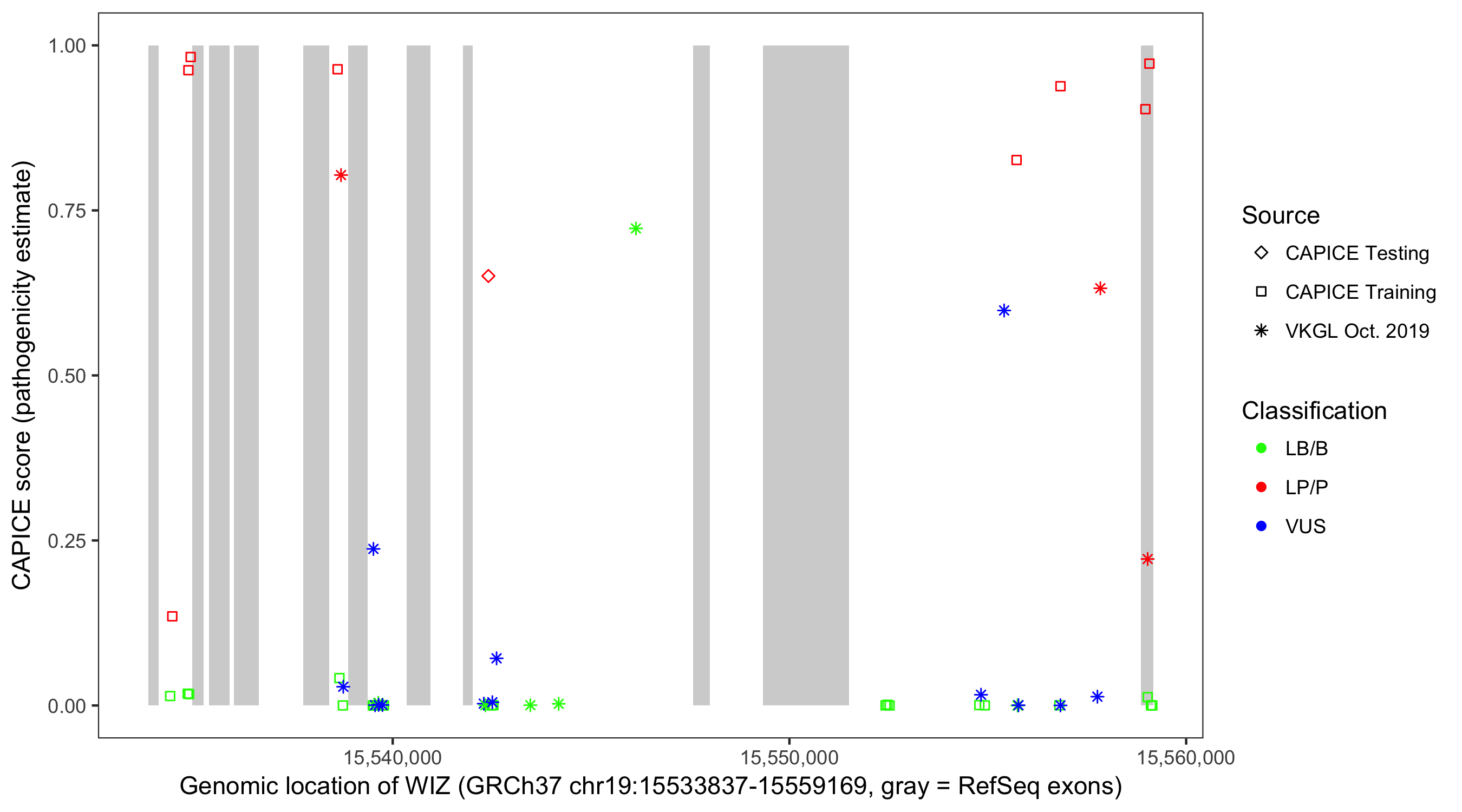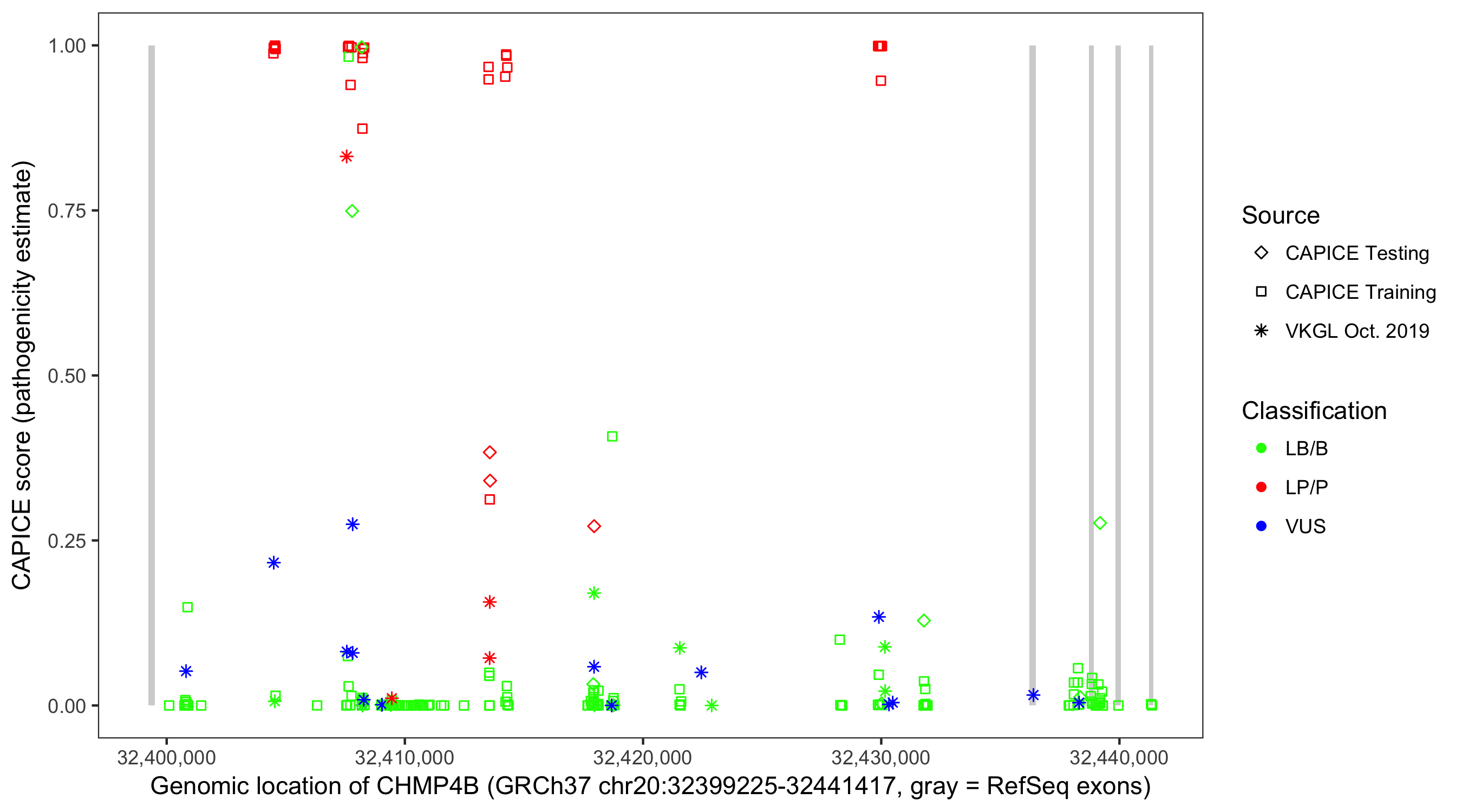 Shown are CAPICE train/test variants plus VKGL Oct 2019.