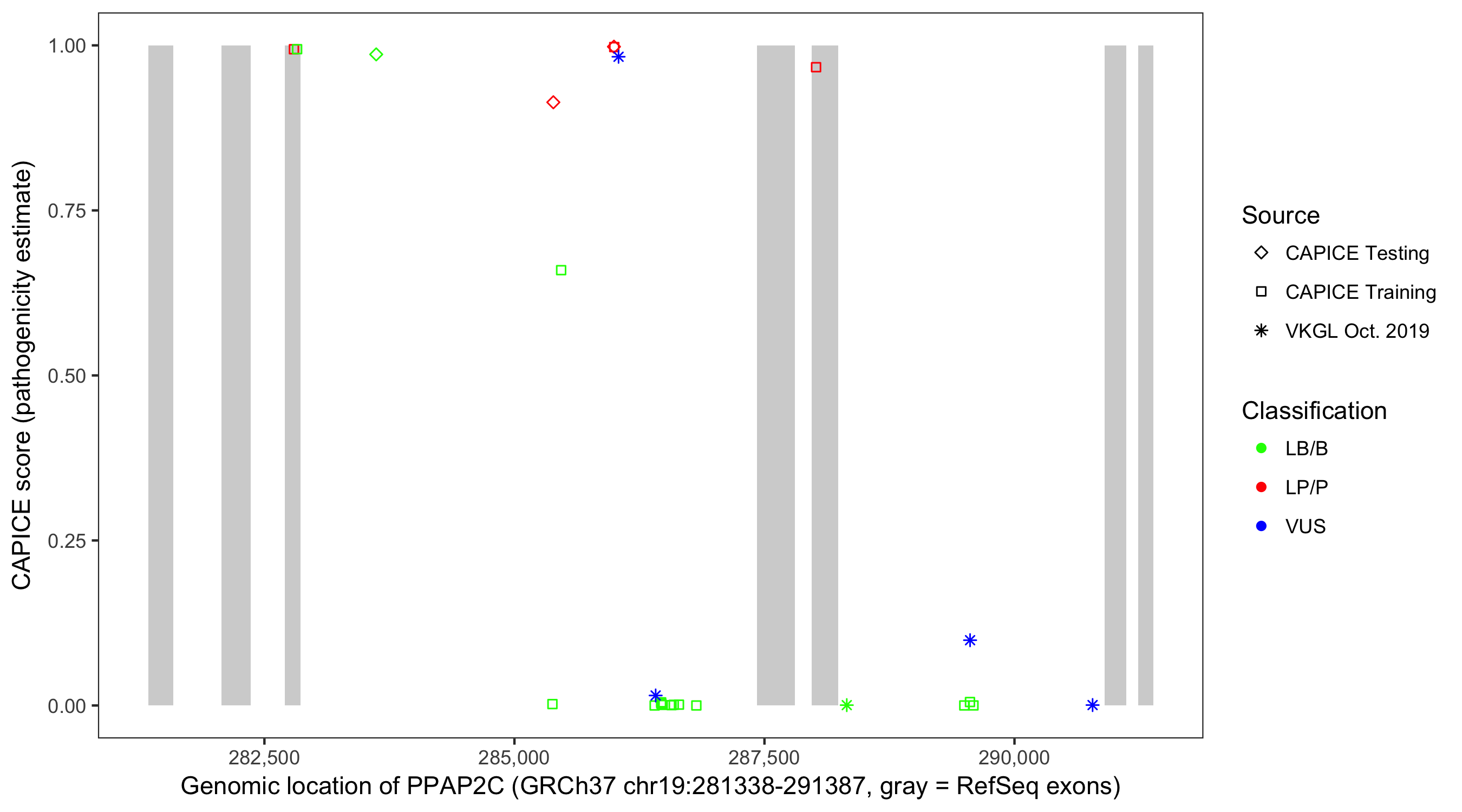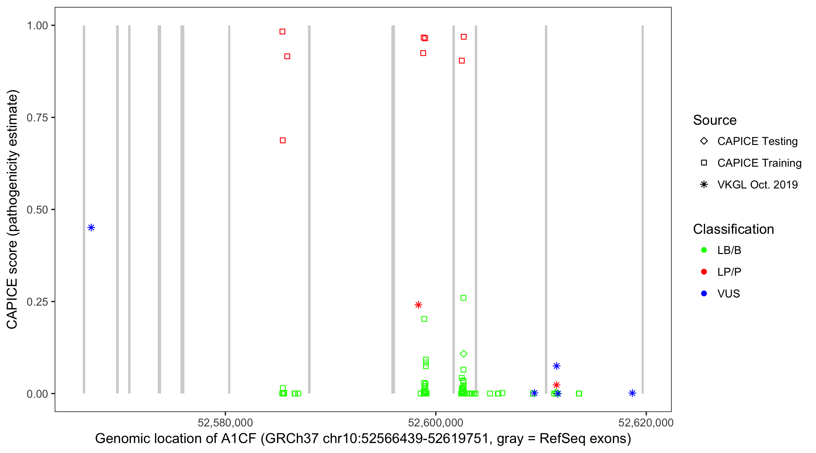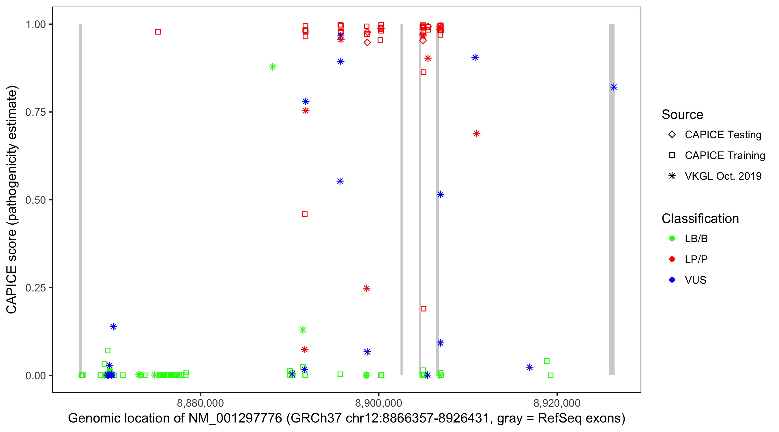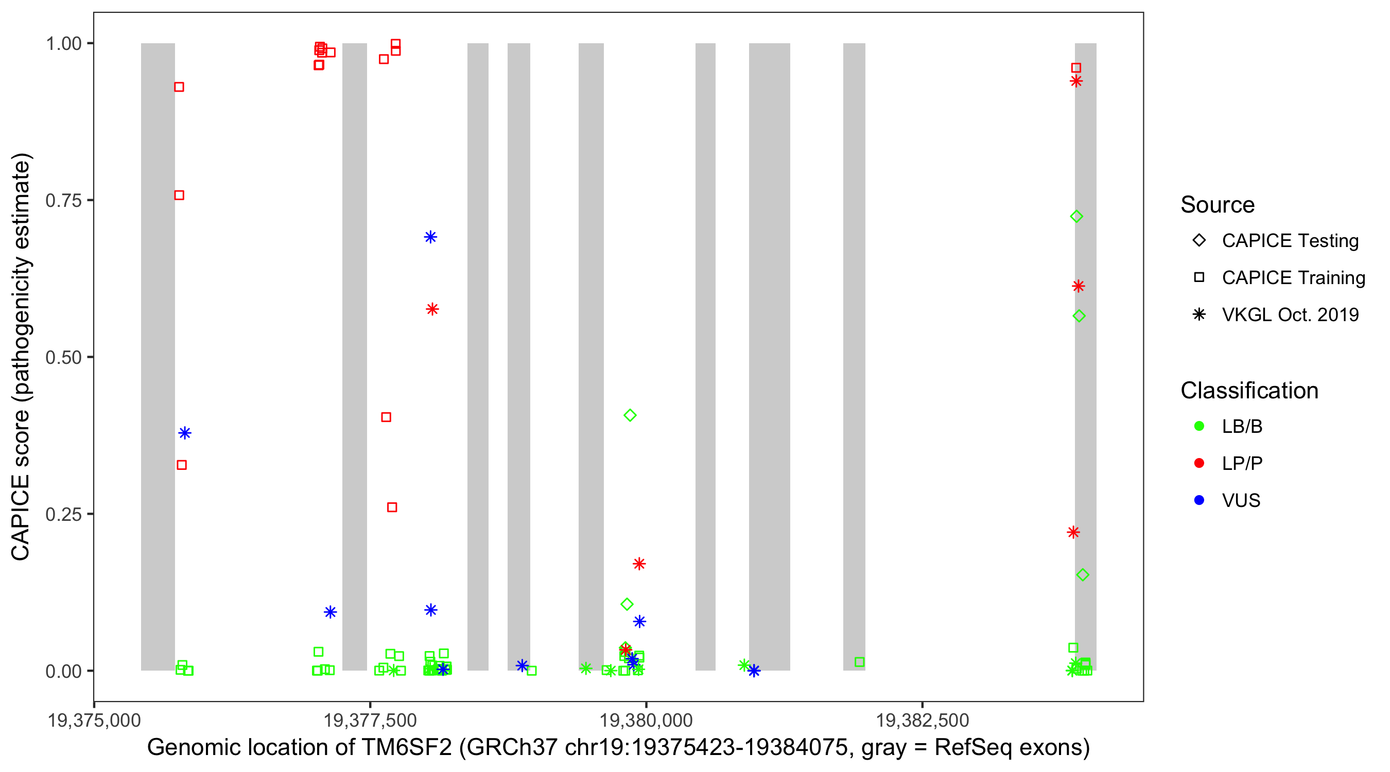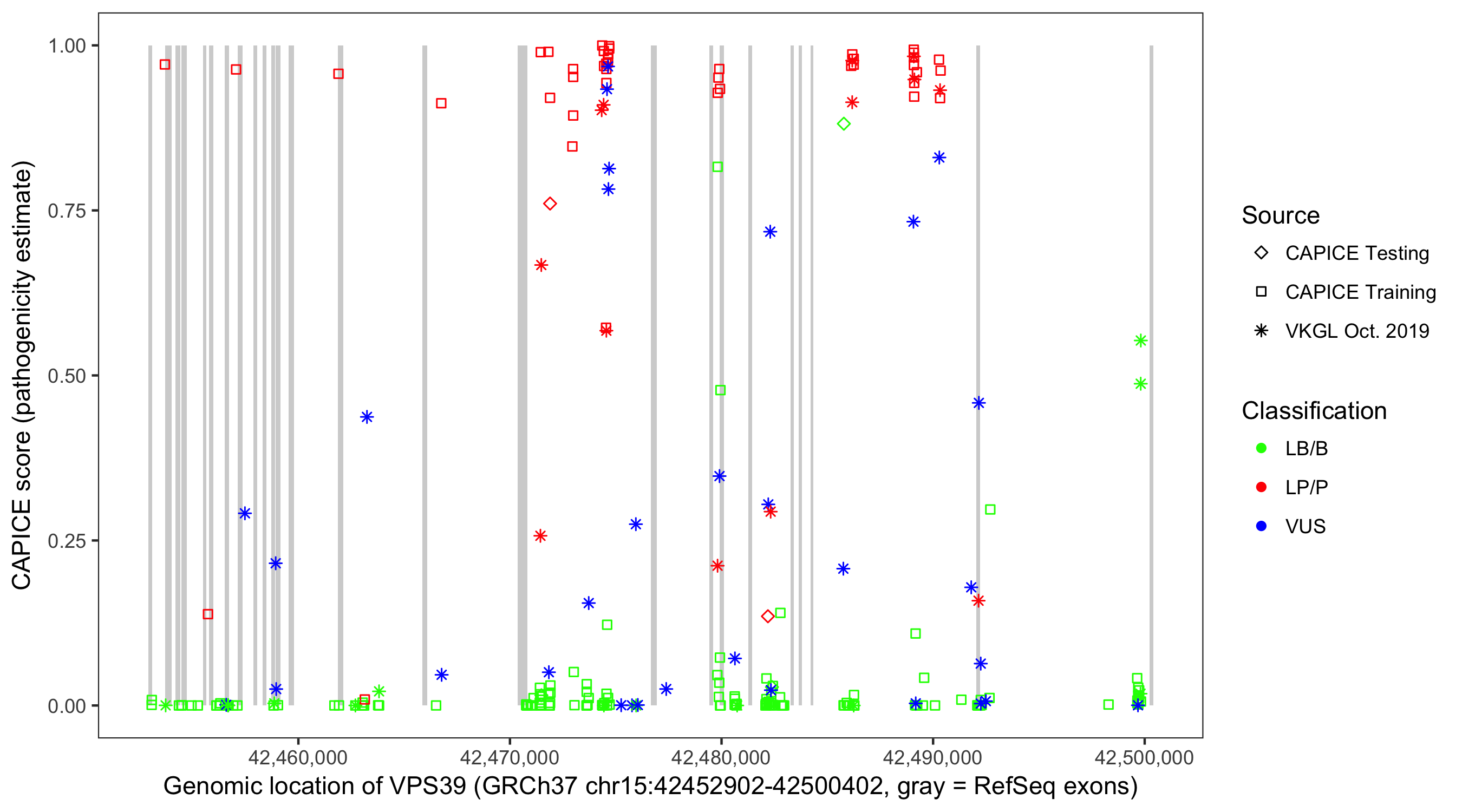 Shown are CAPICE train/test variants plus VKGL Oct 2019.