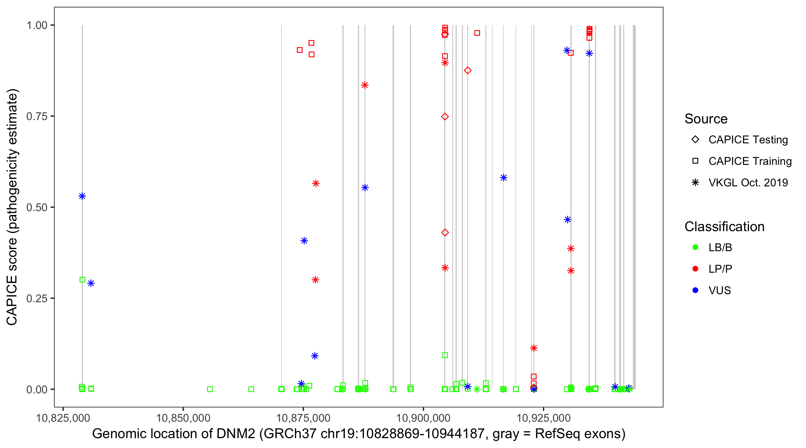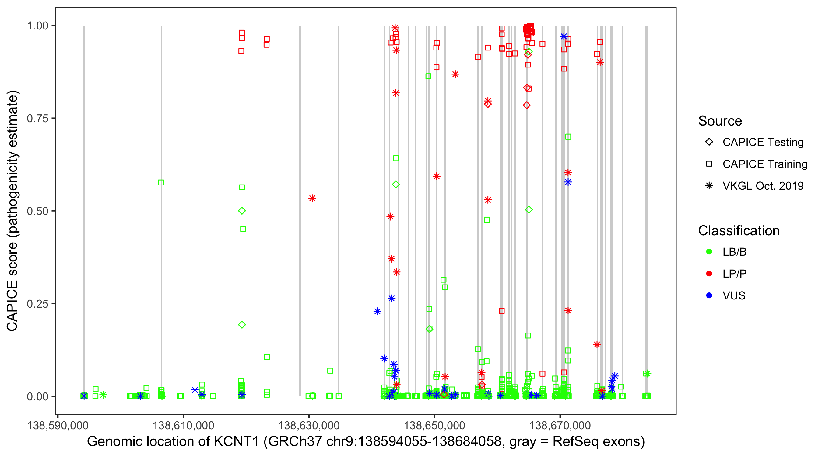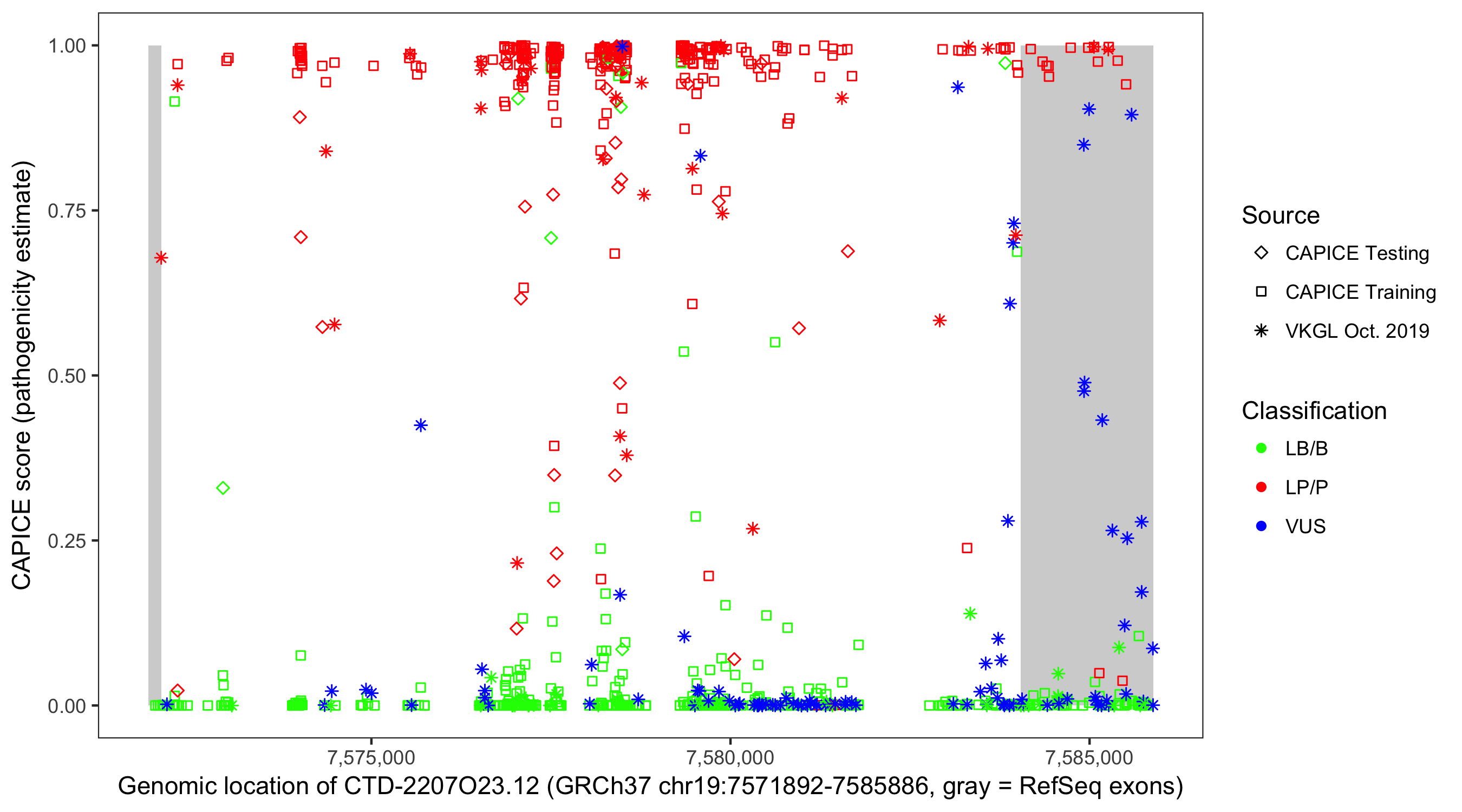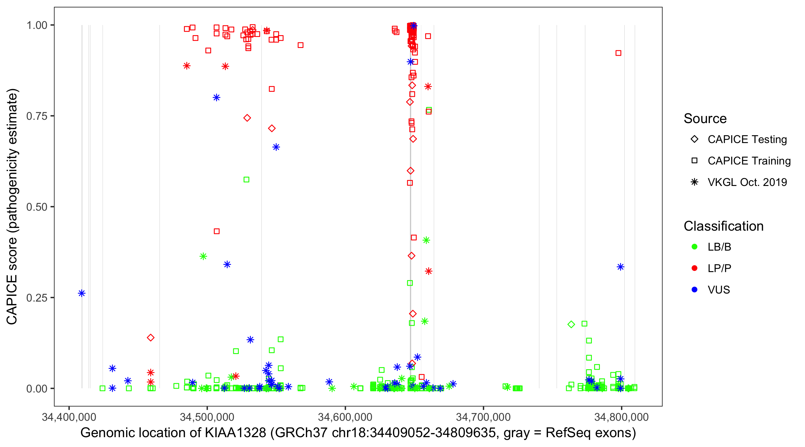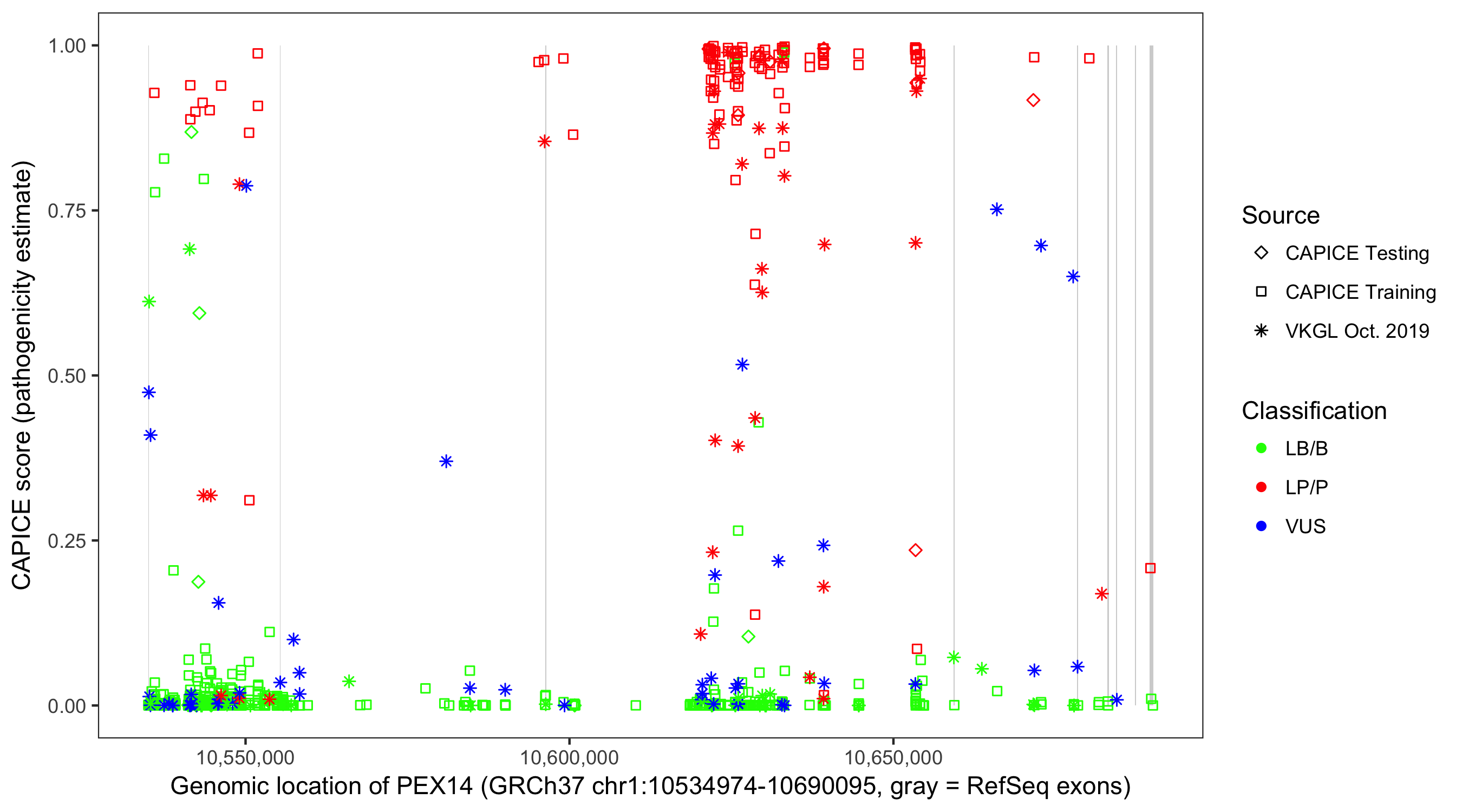 Shown are CAPICE train/test variants plus VKGL Oct 2019.