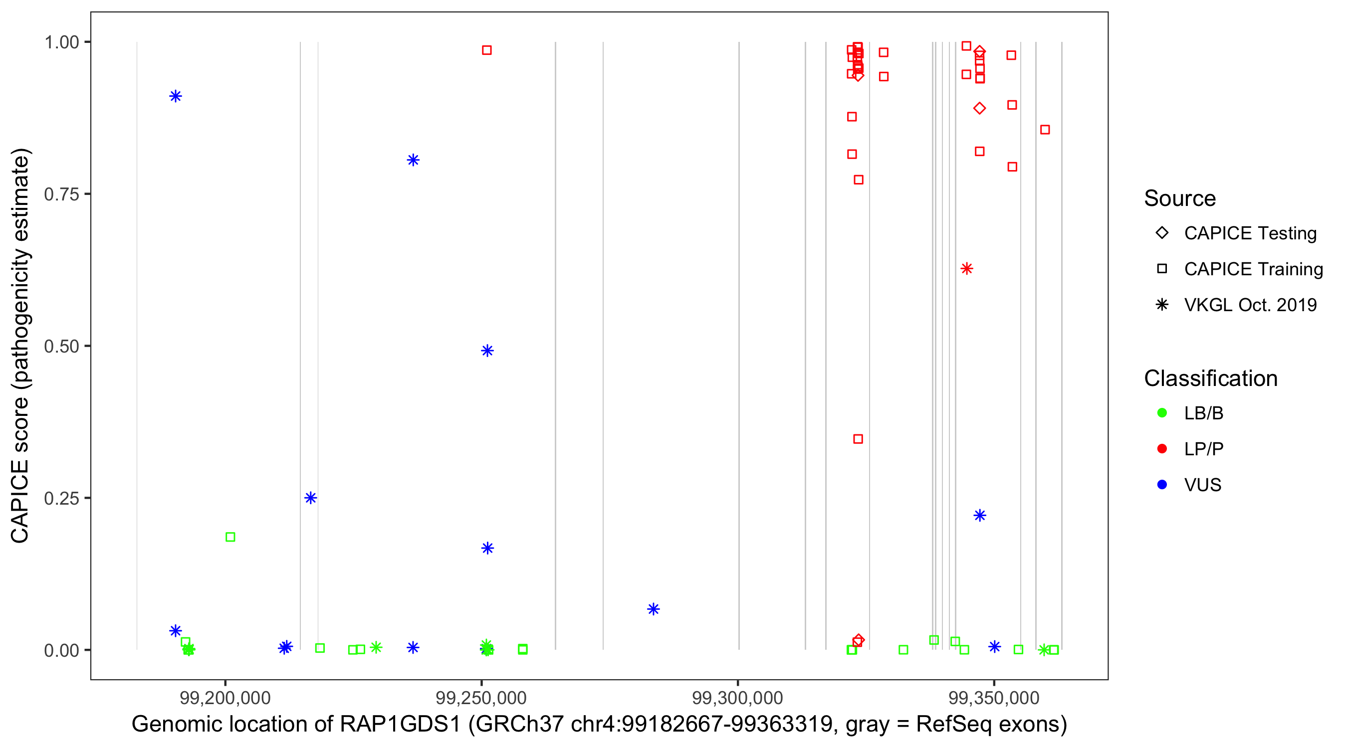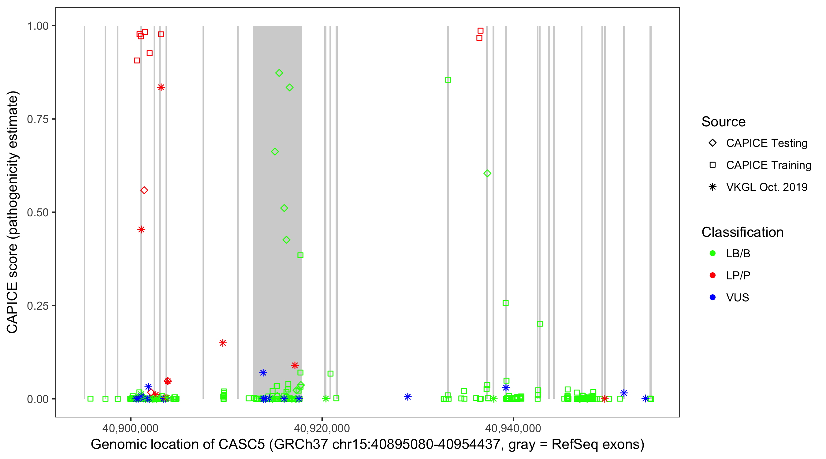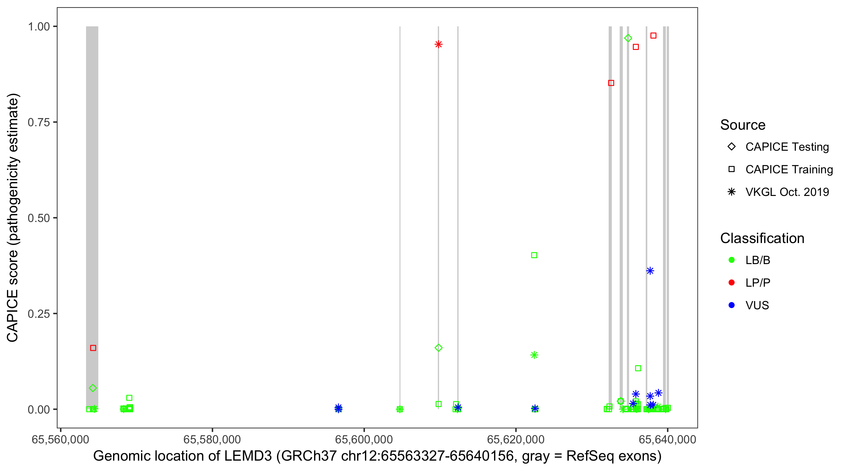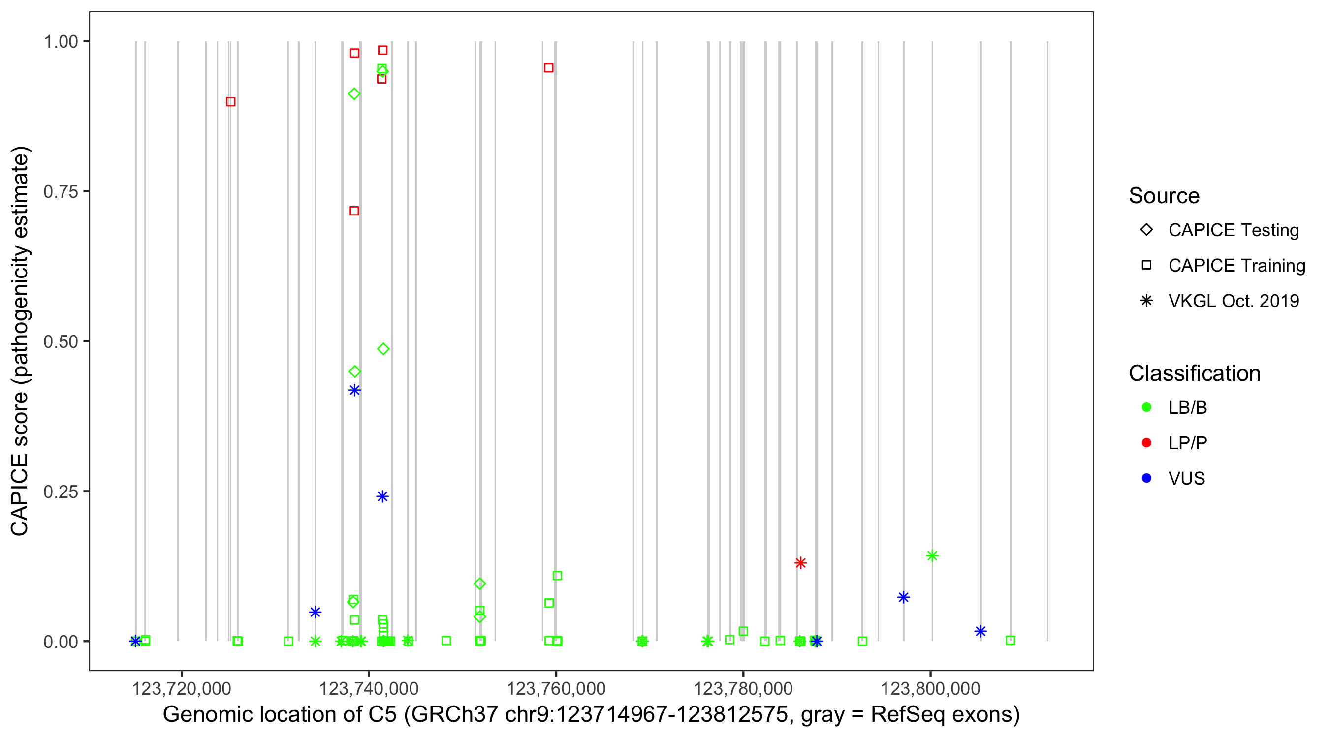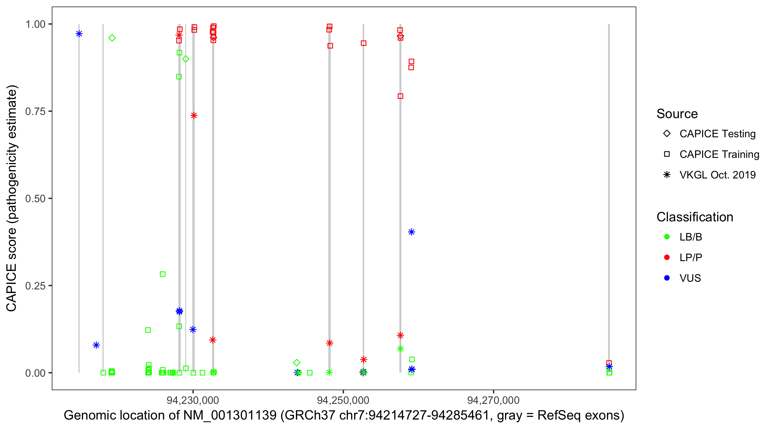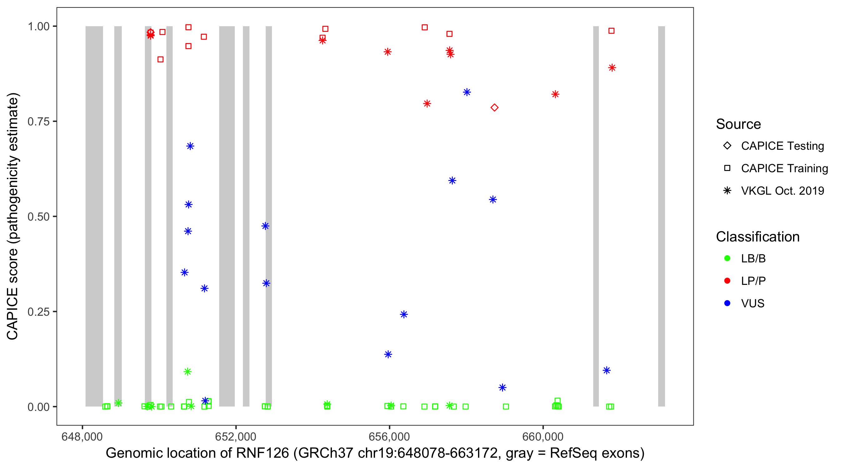 Shown are CAPICE train/test variants plus VKGL Oct 2019.