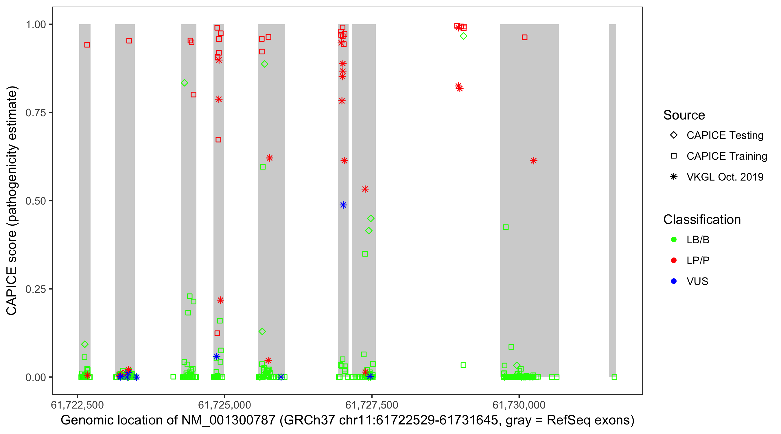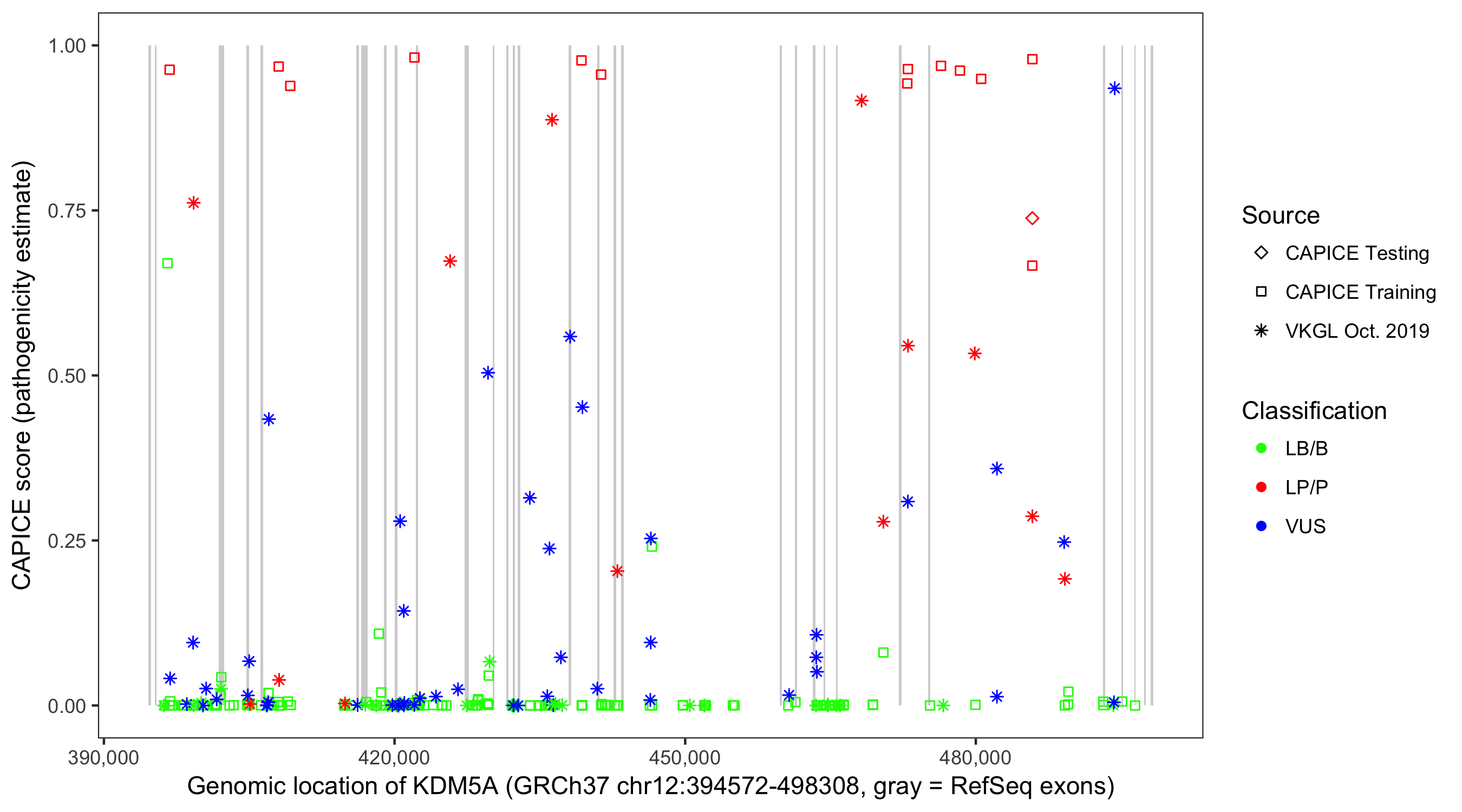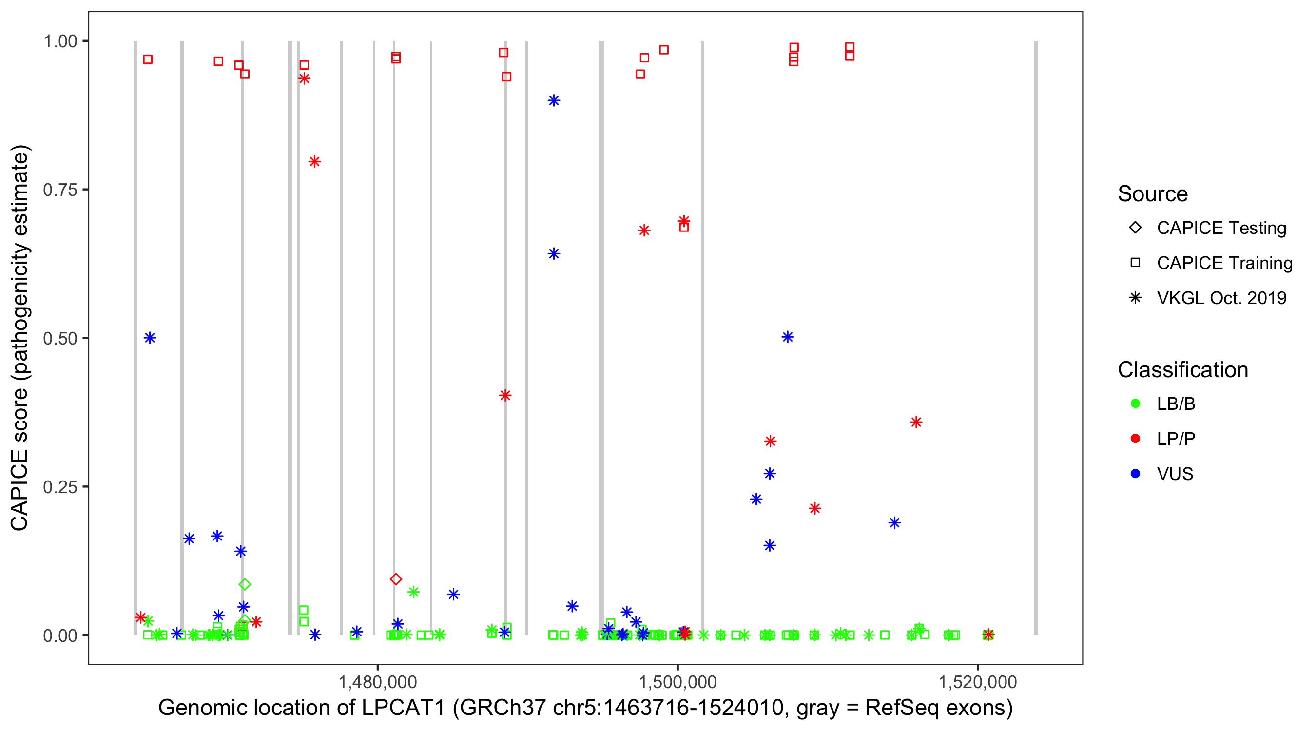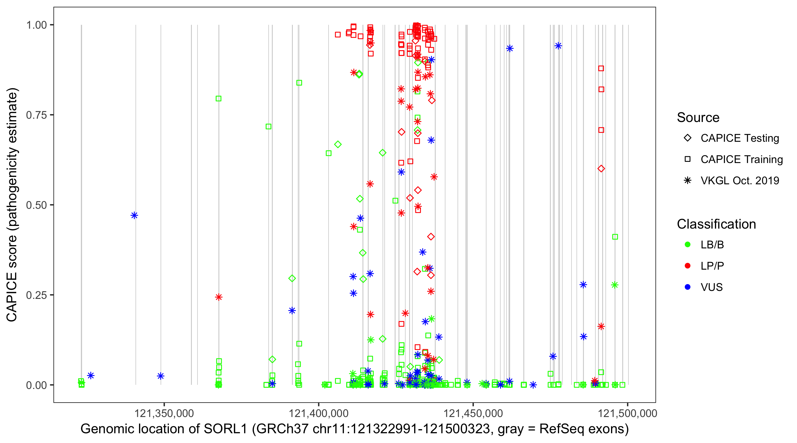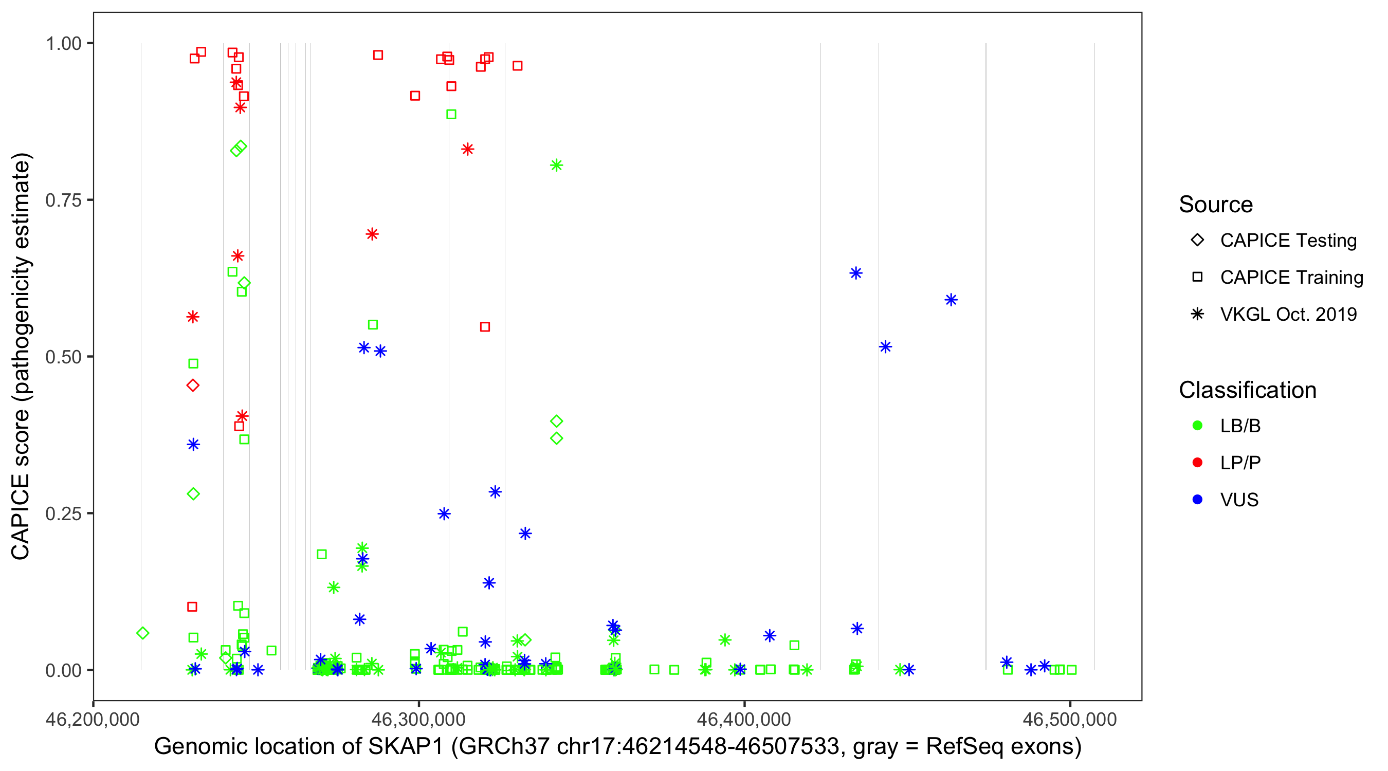 Shown are CAPICE train/test variants plus VKGL Oct 2019.