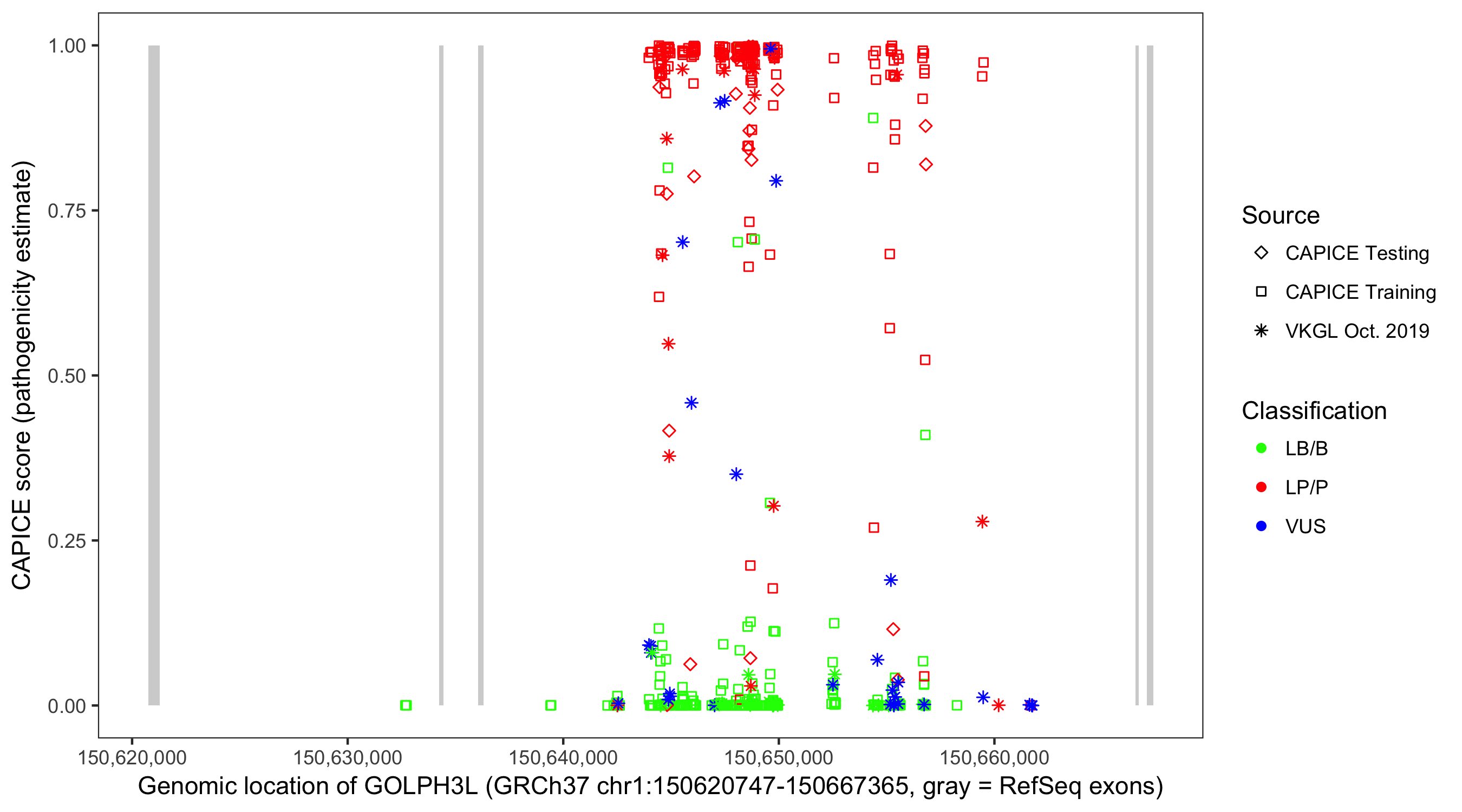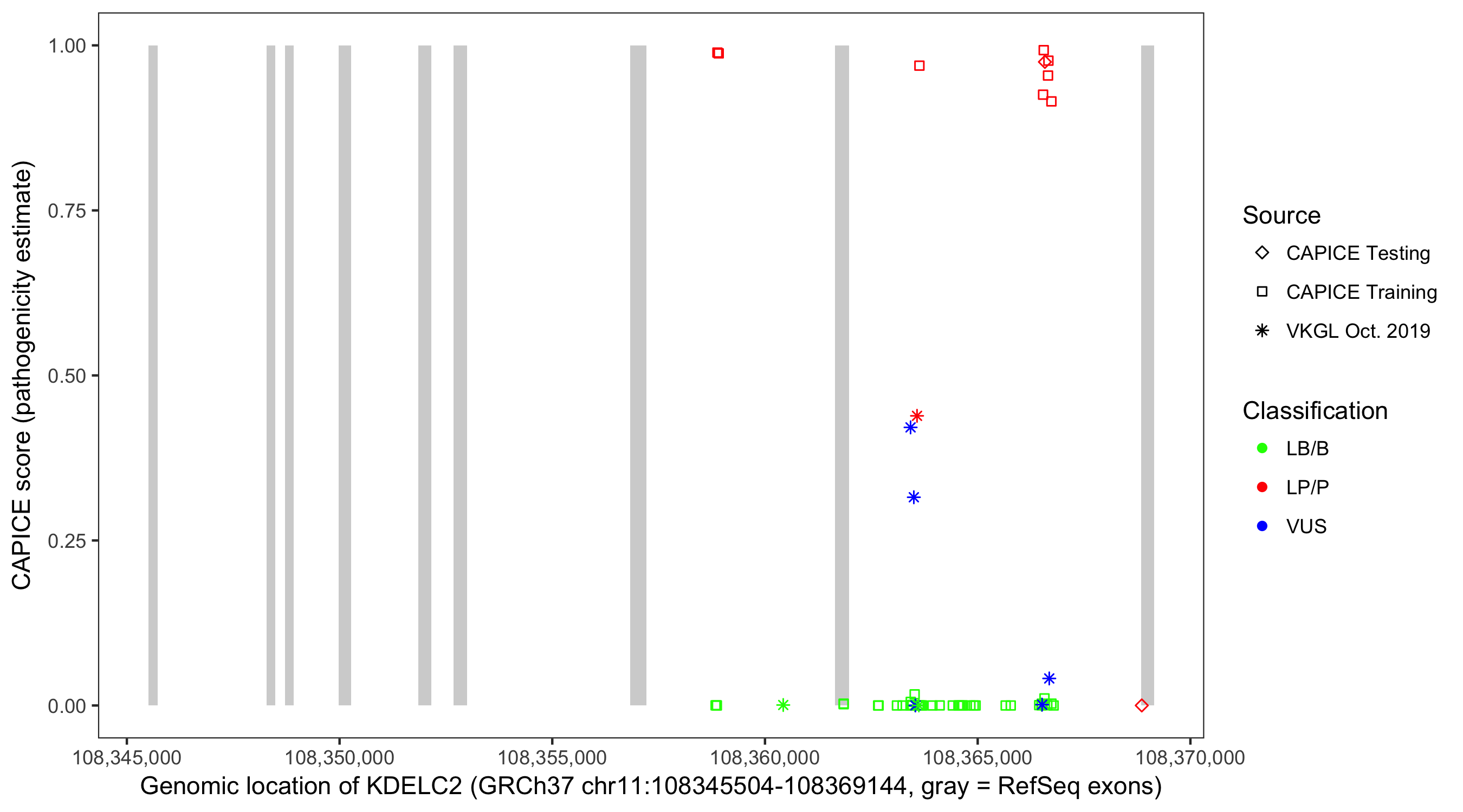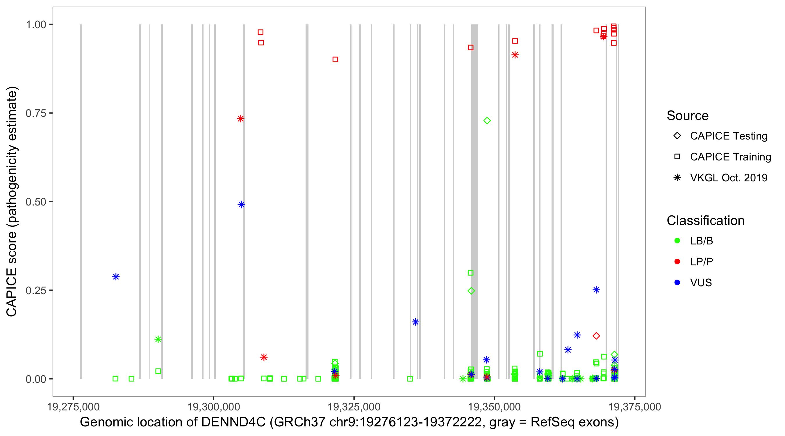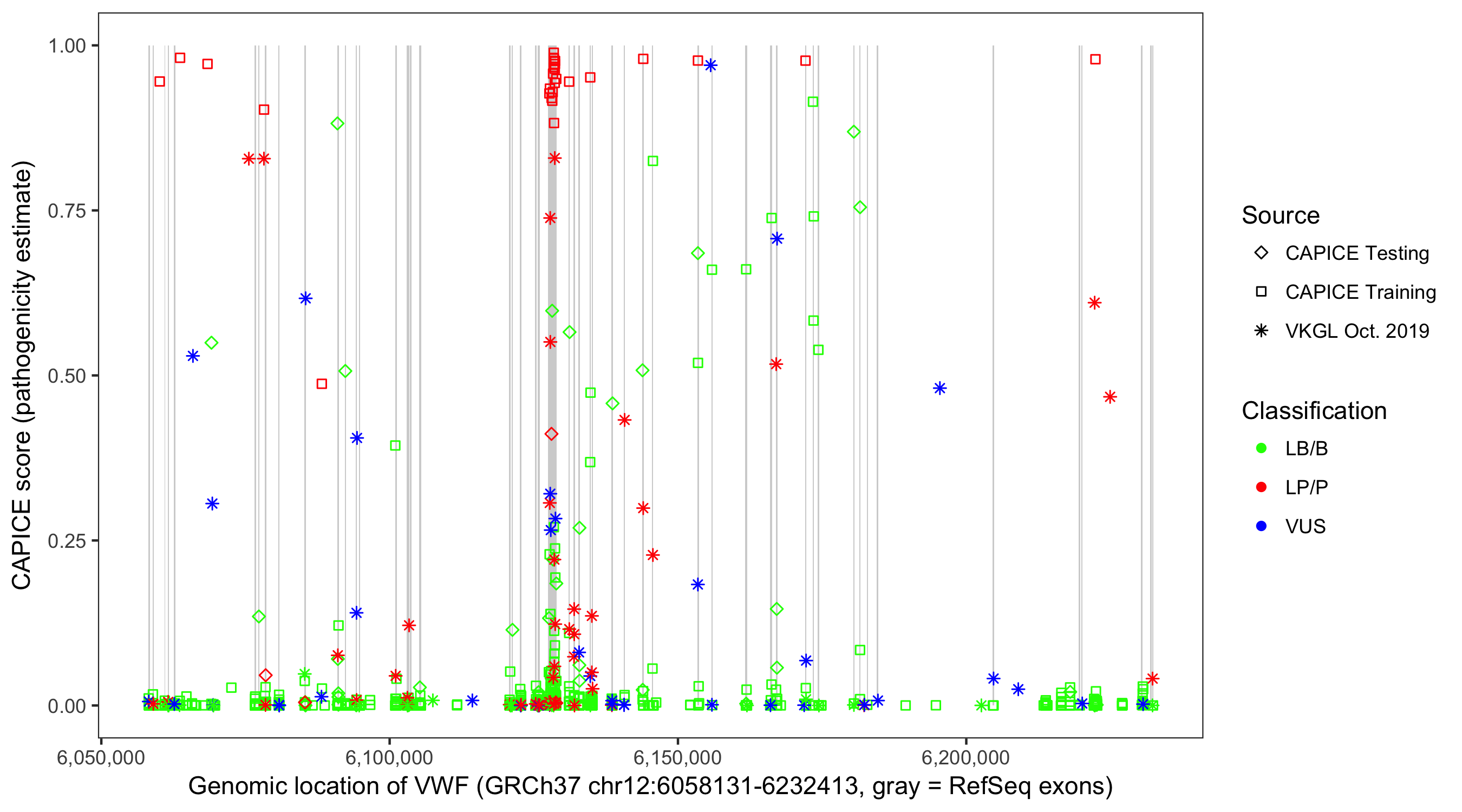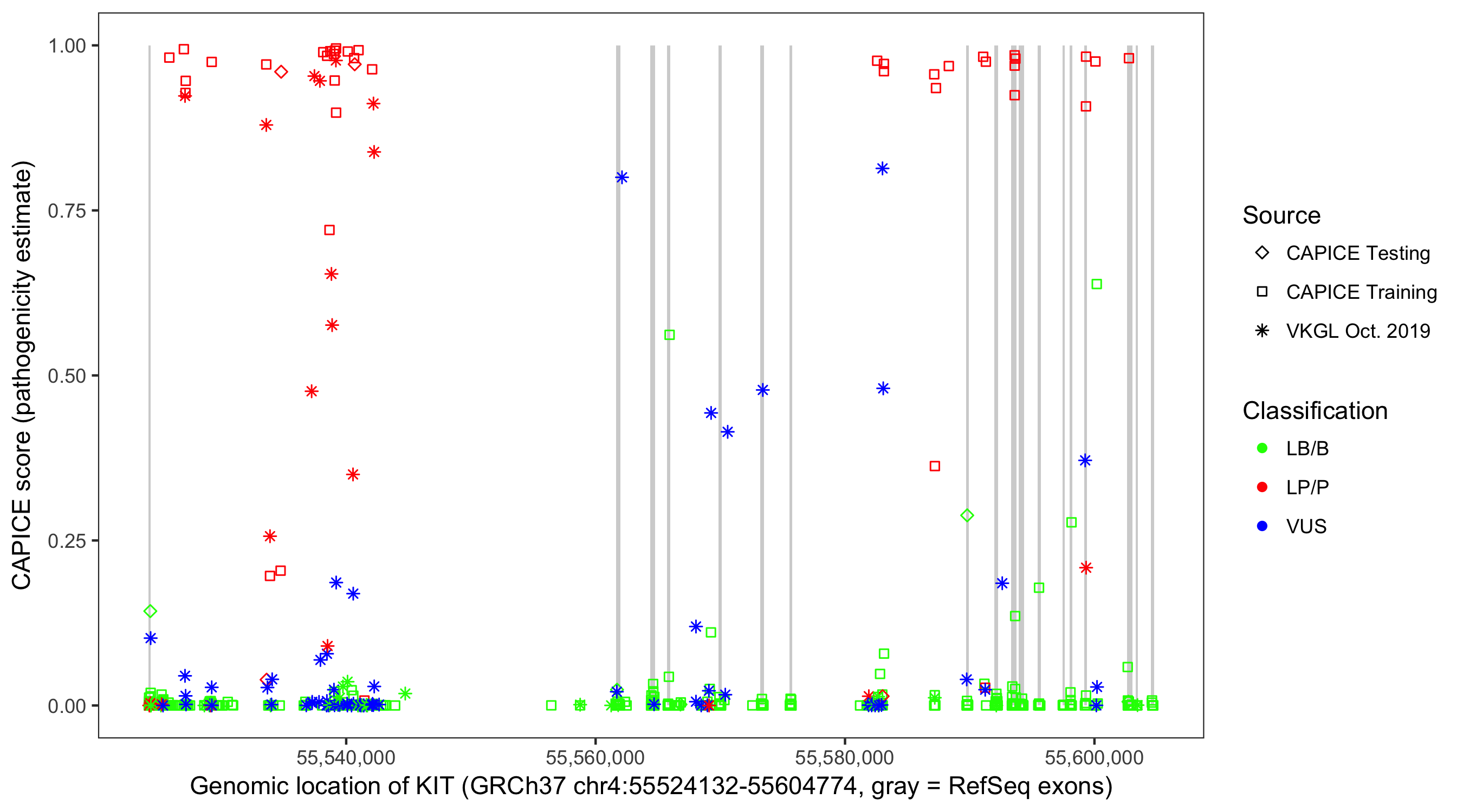 Shown are CAPICE train/test variants plus VKGL Oct 2019.