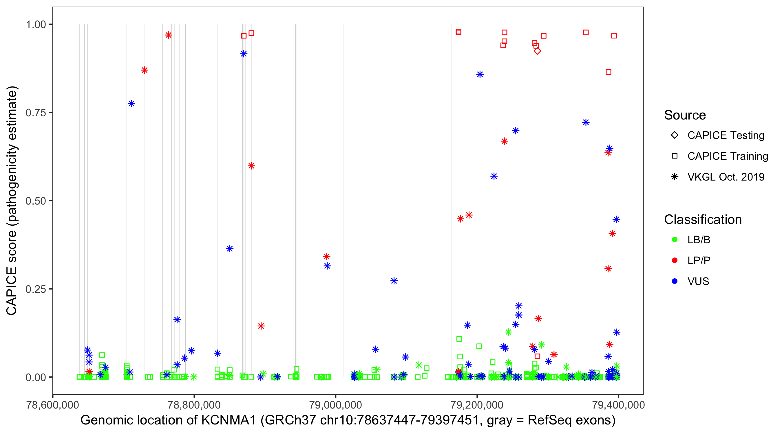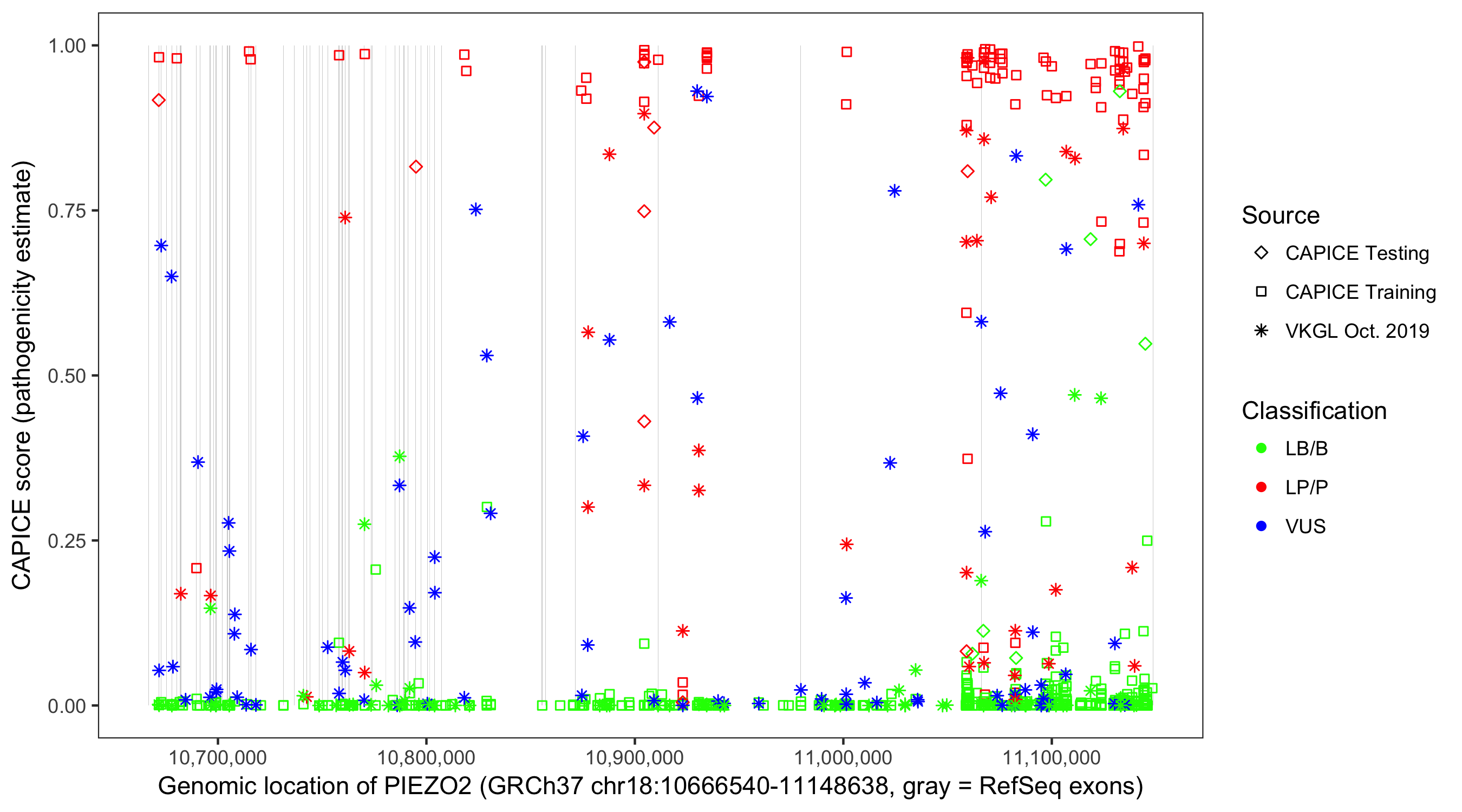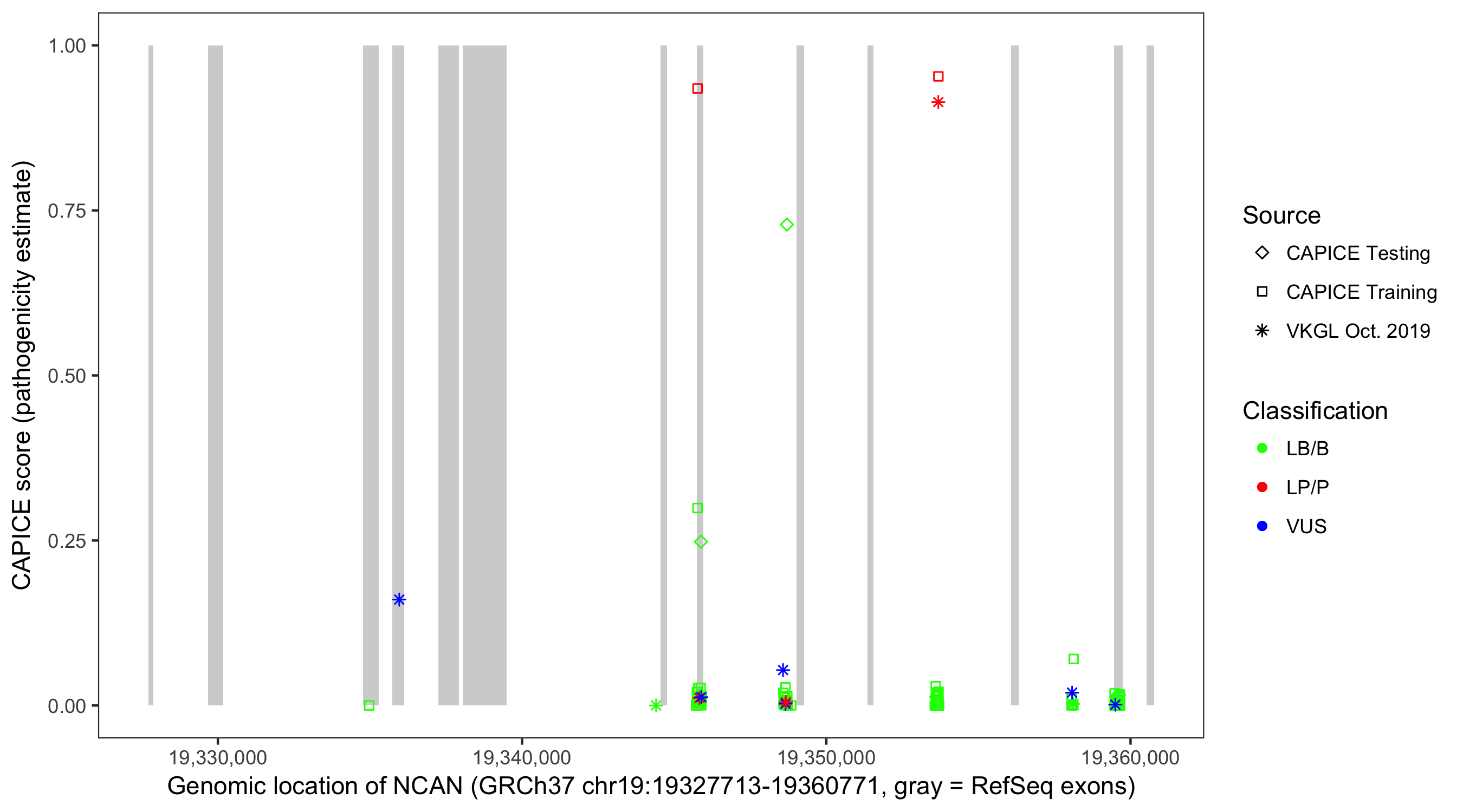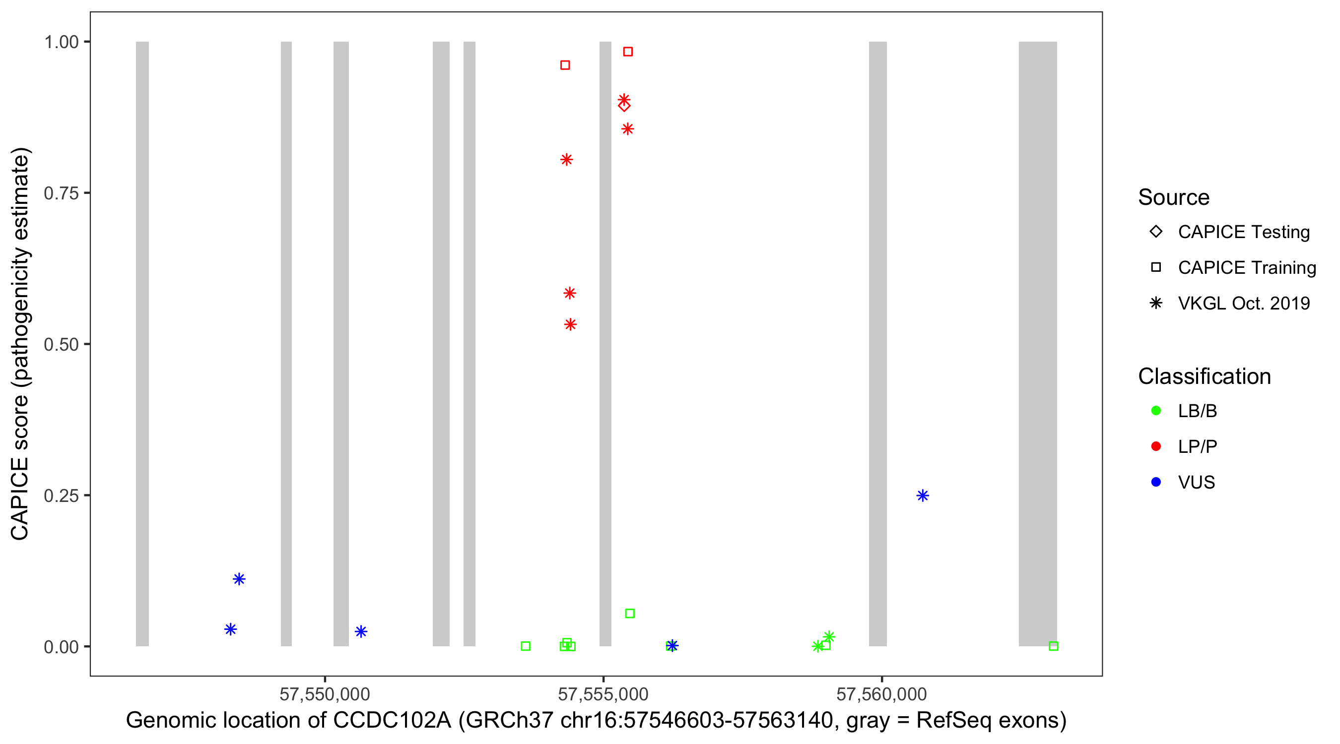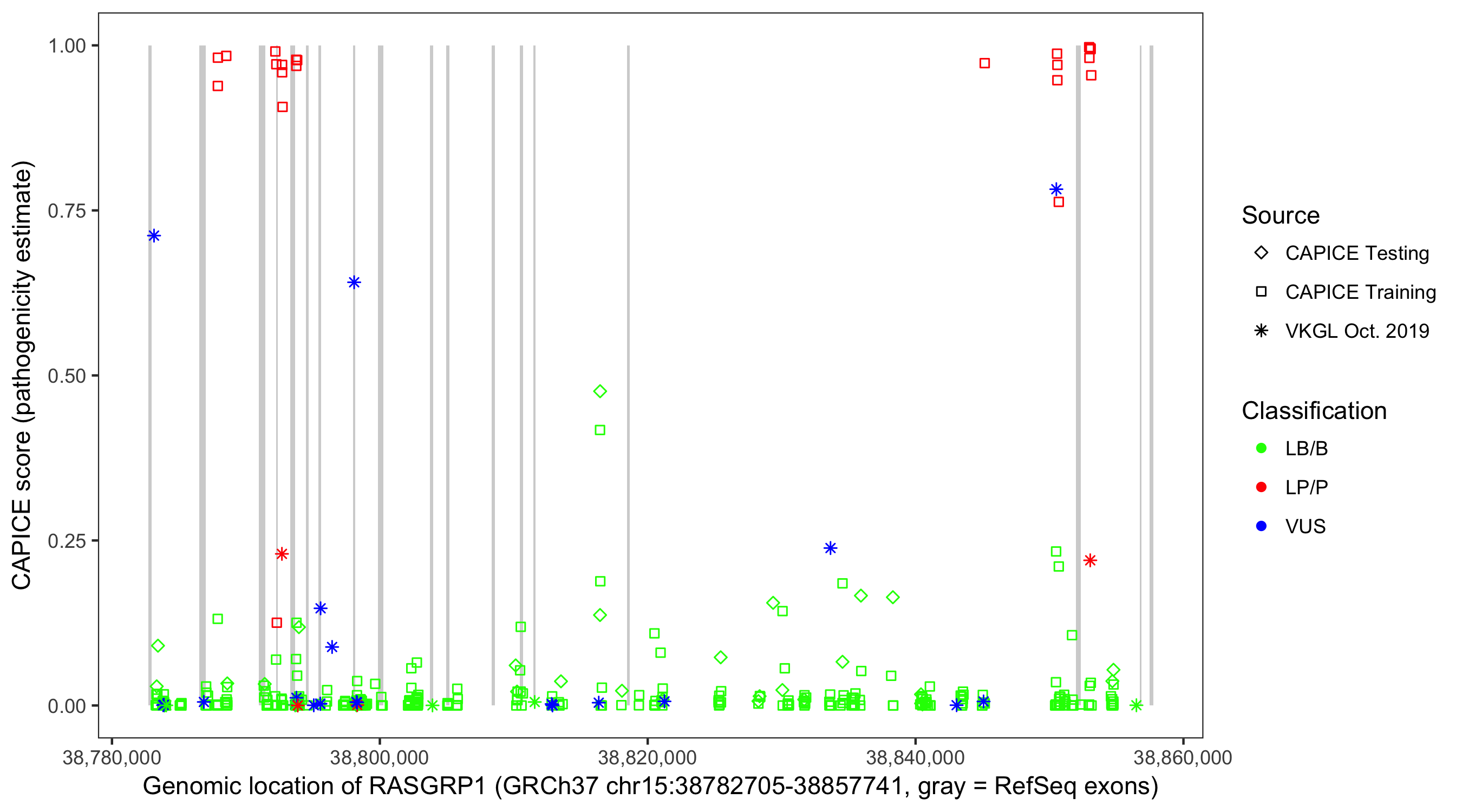 Shown are CAPICE train/test variants plus VKGL Oct 2019.