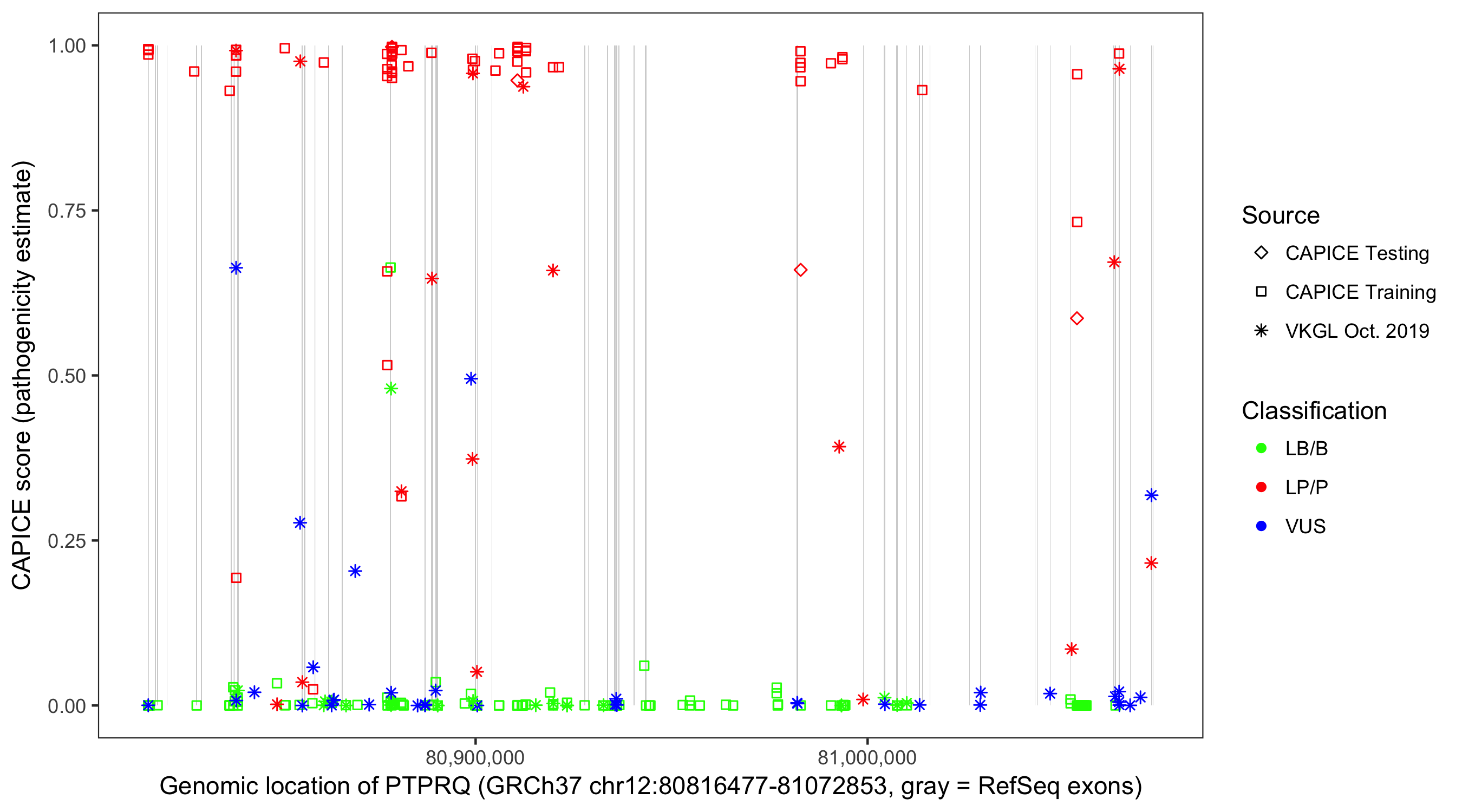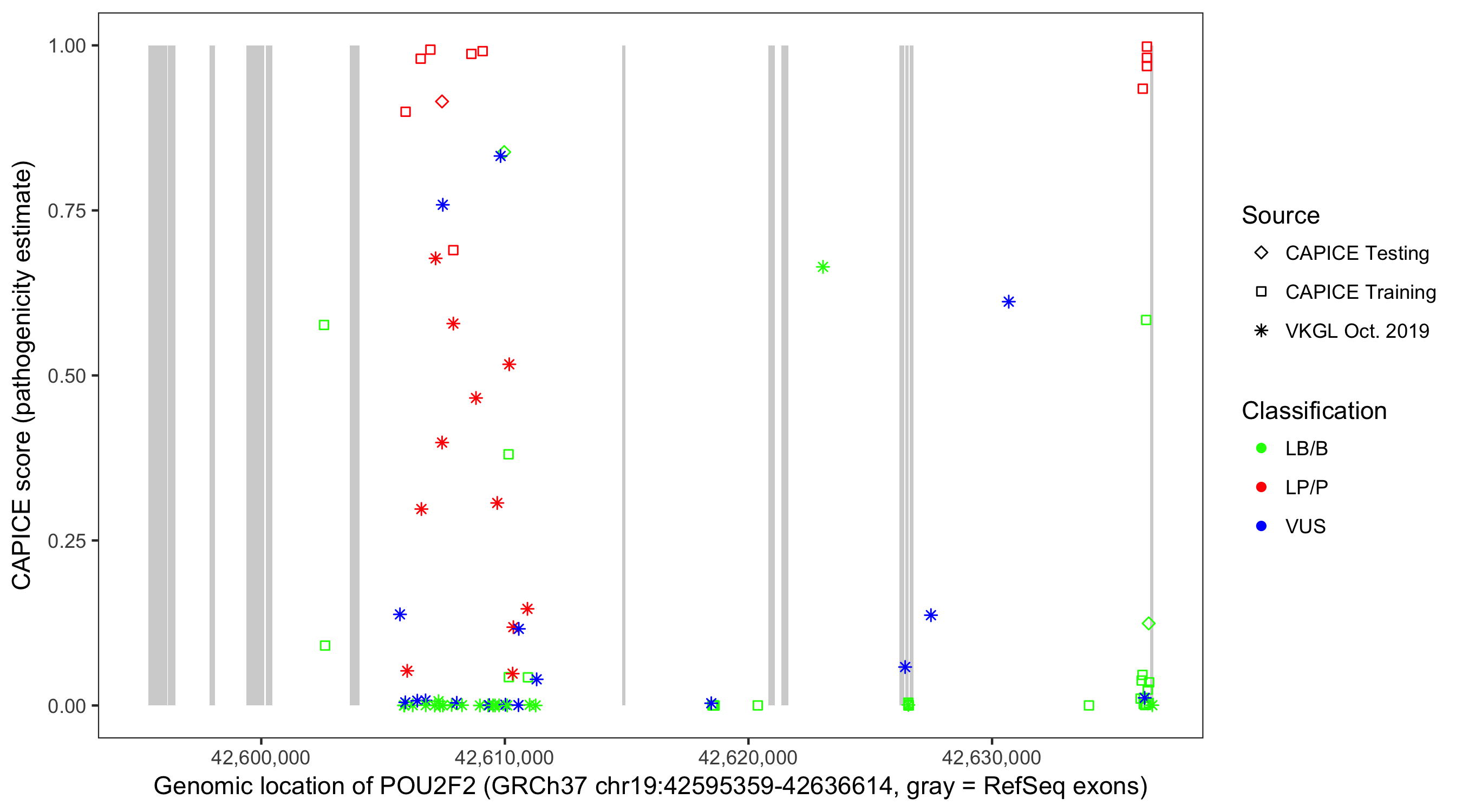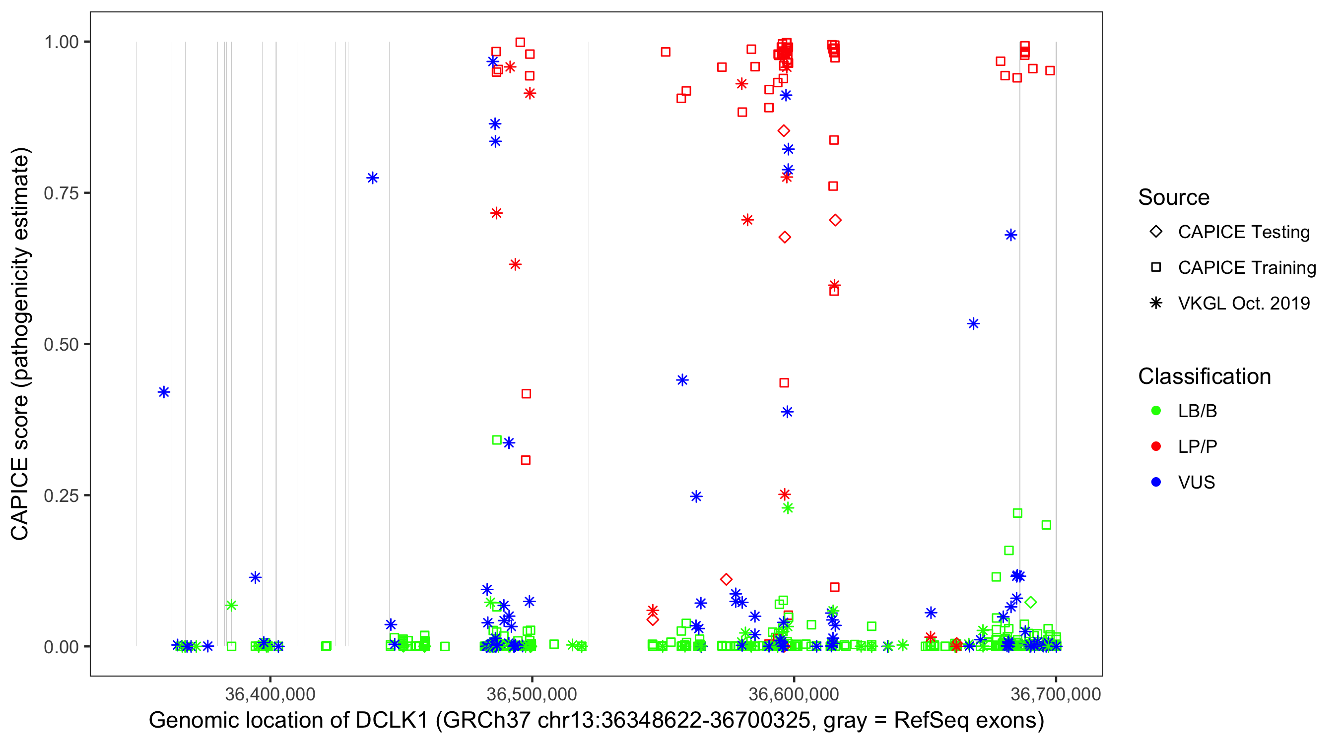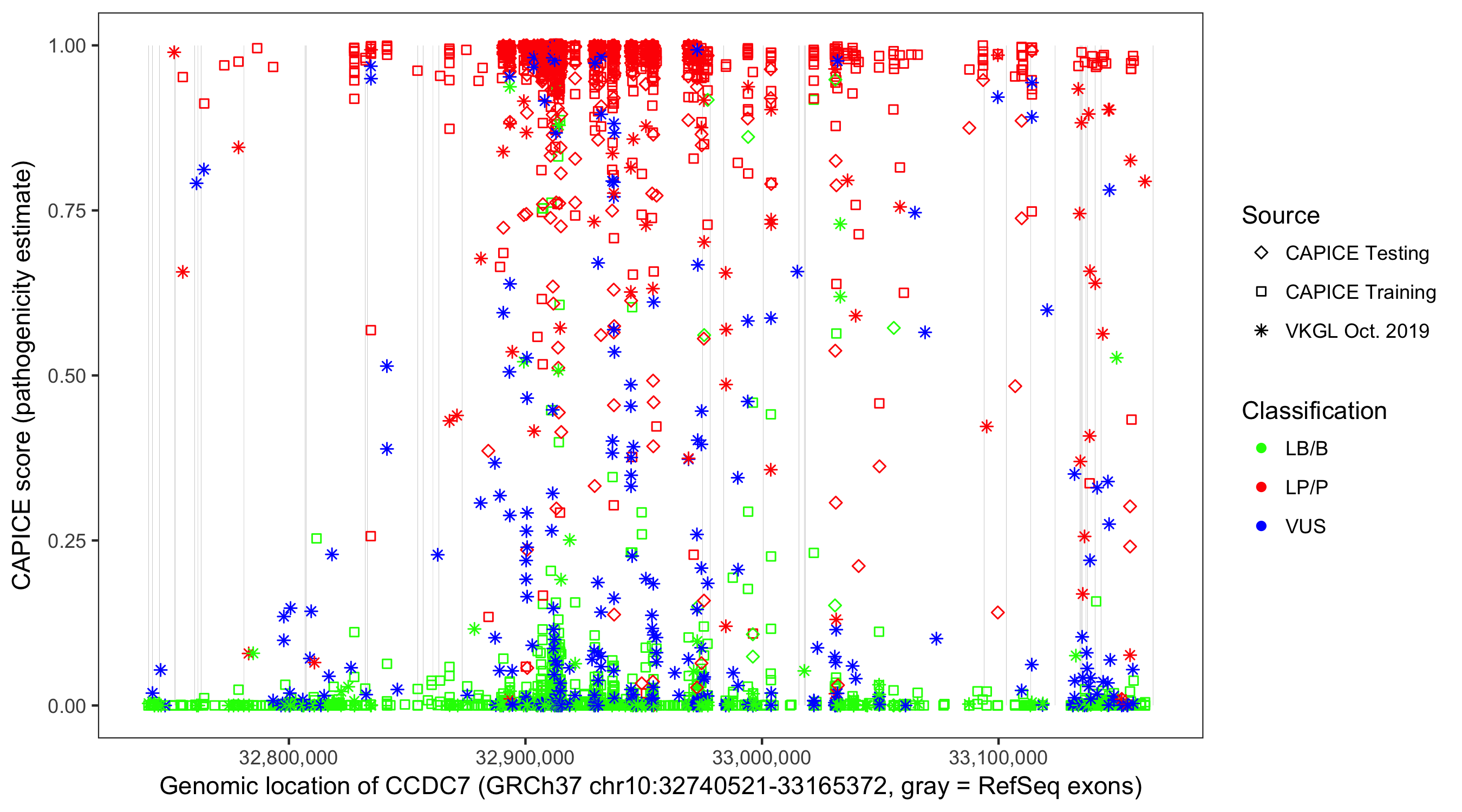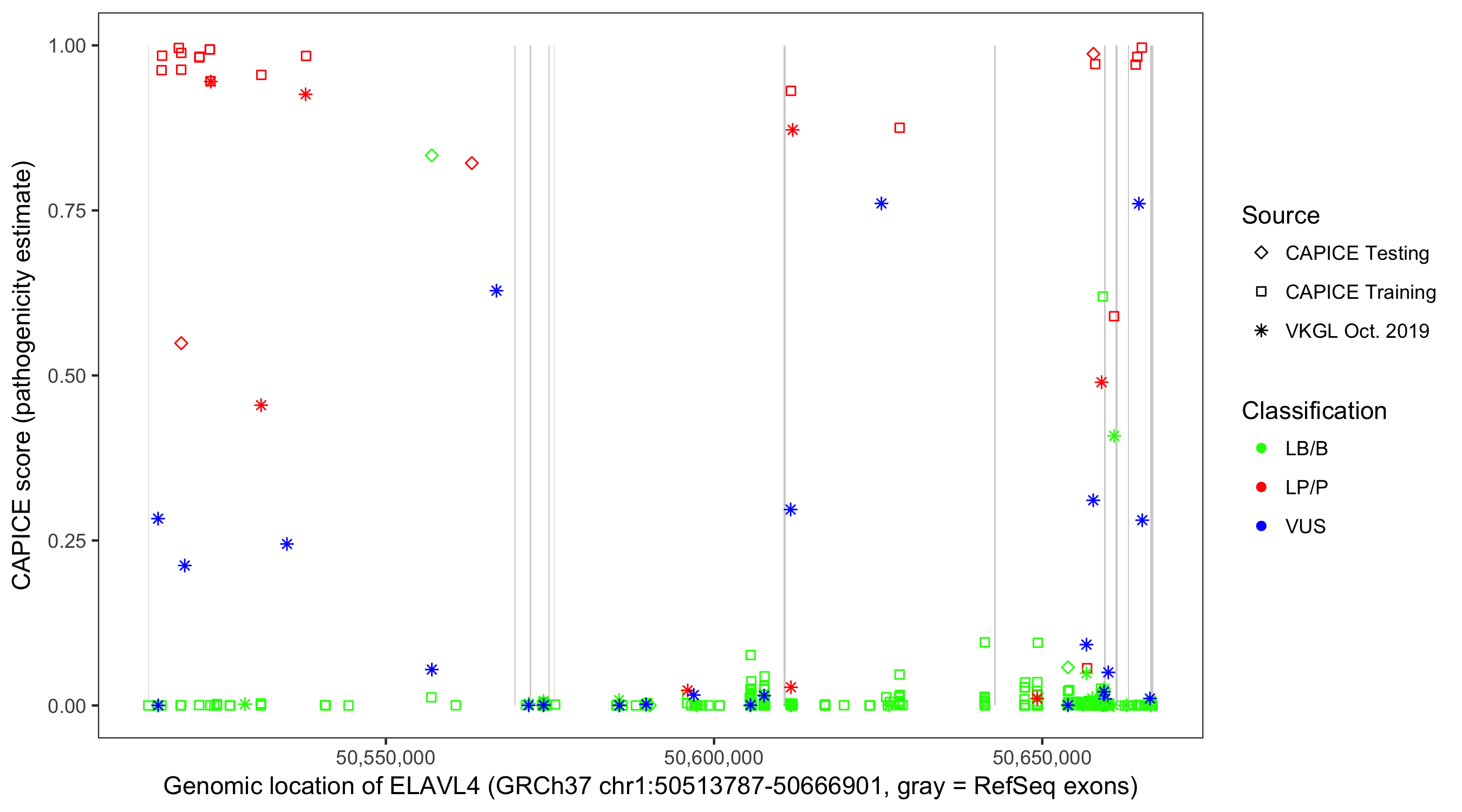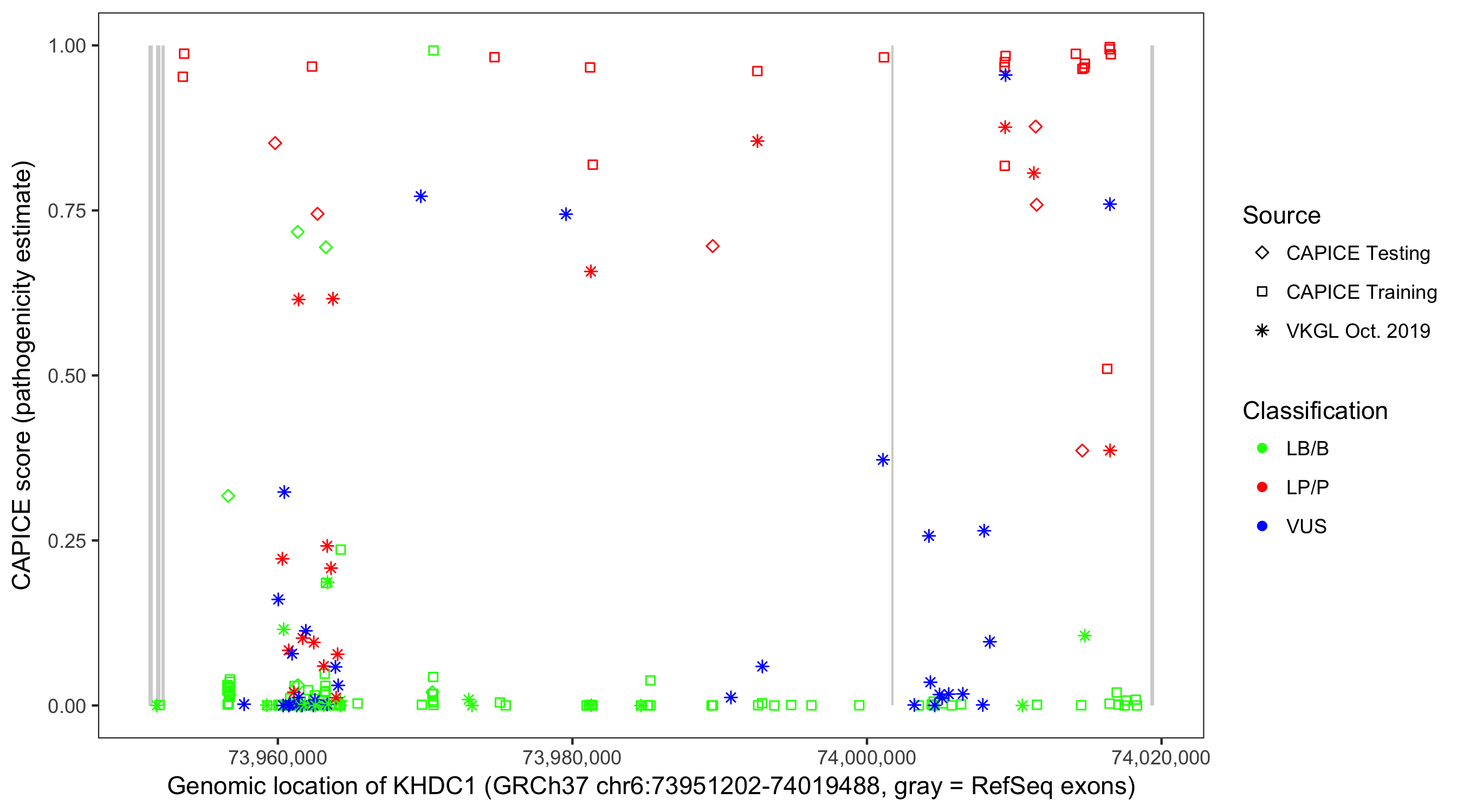 Shown are CAPICE train/test variants plus VKGL Oct 2019.