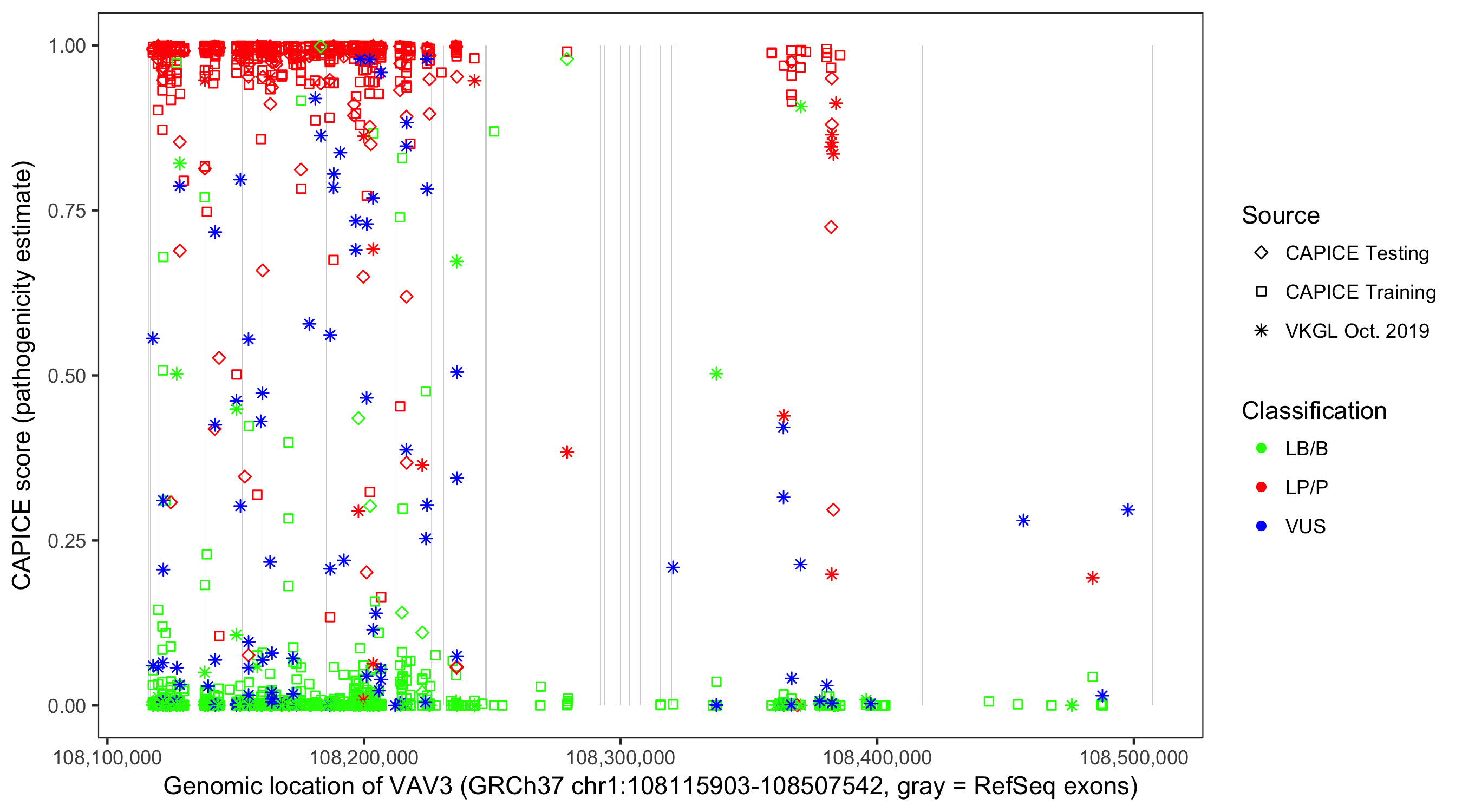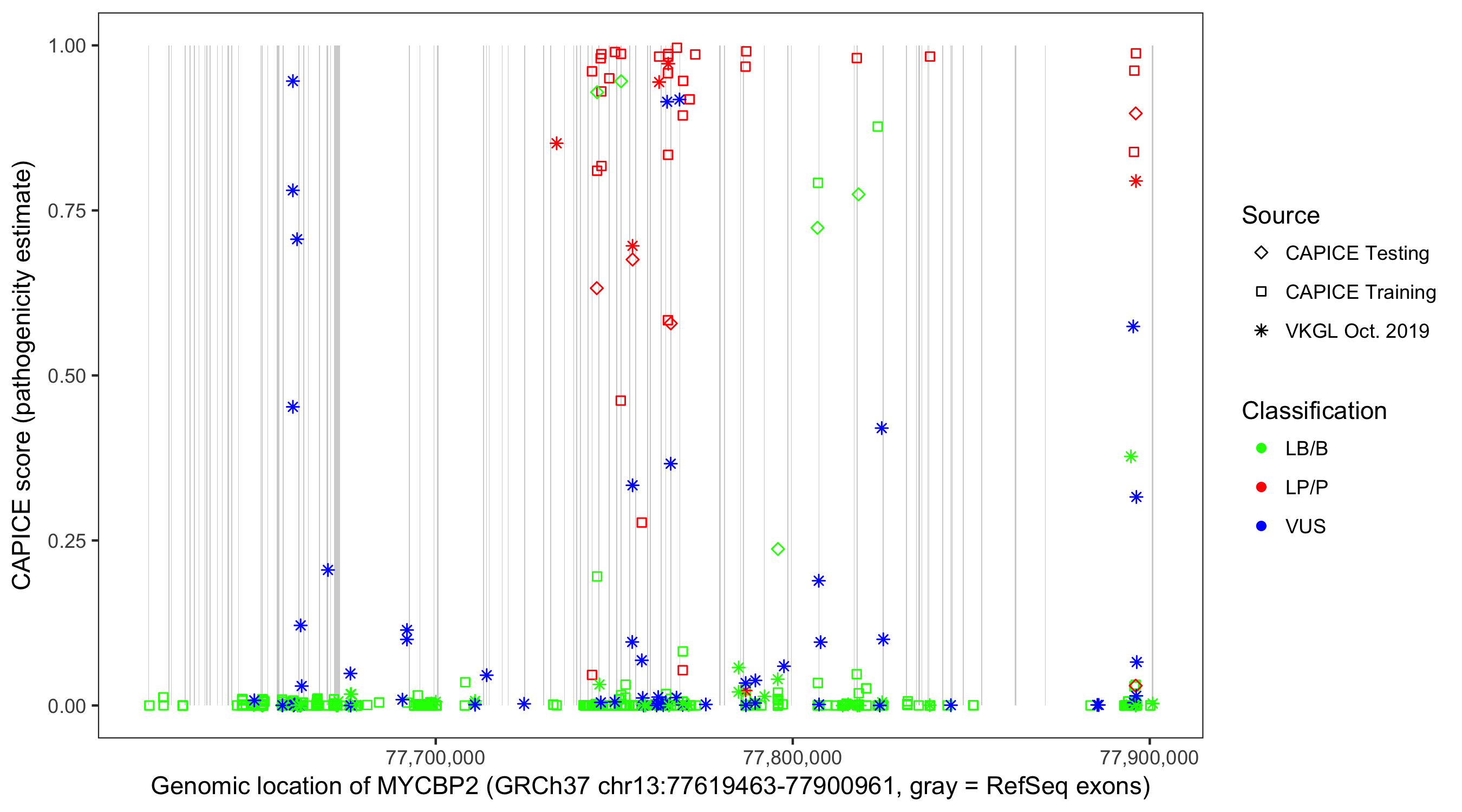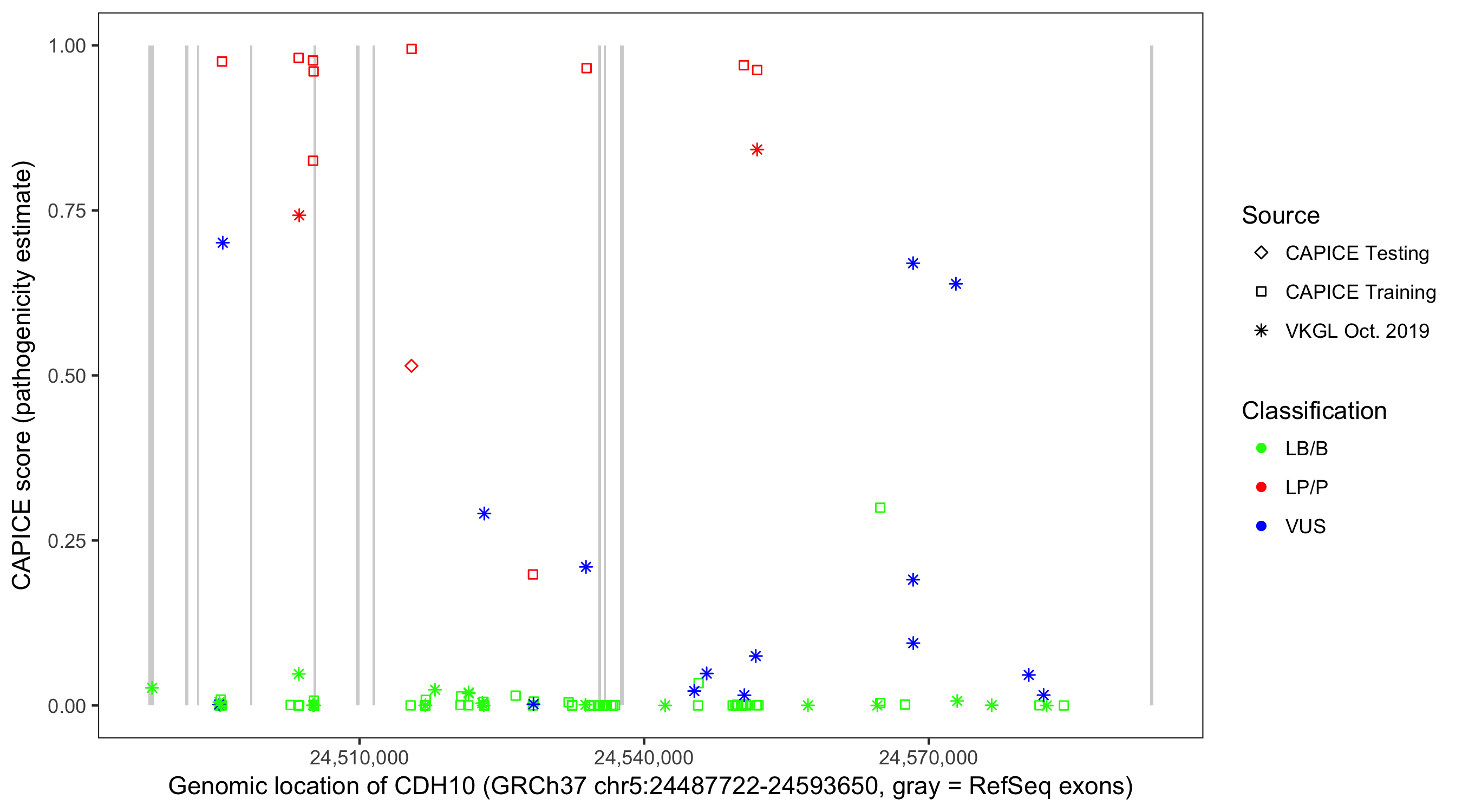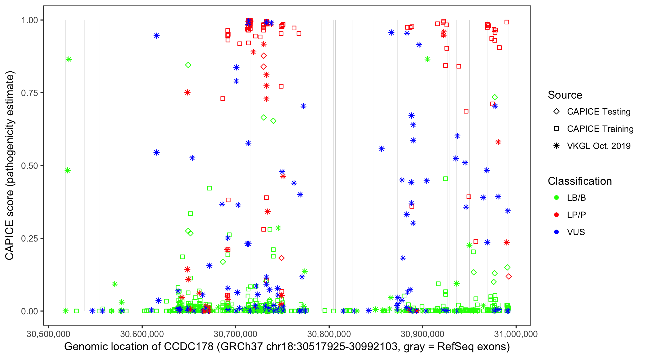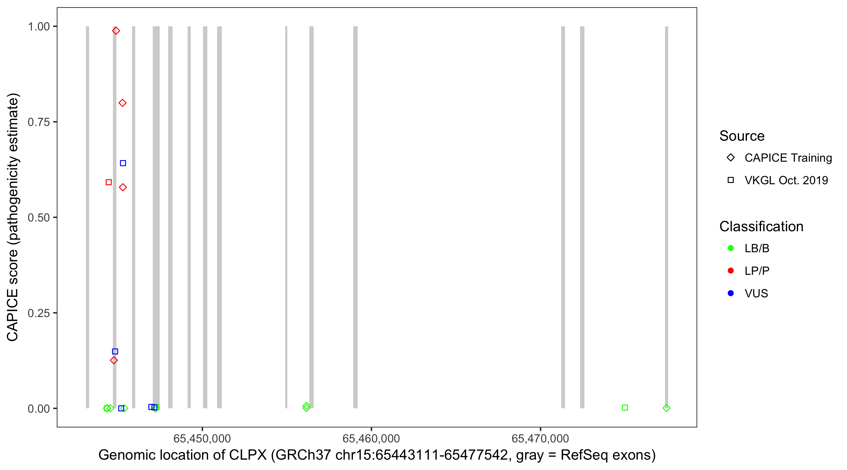 Shown are CAPICE train/test variants plus VKGL Oct 2019.