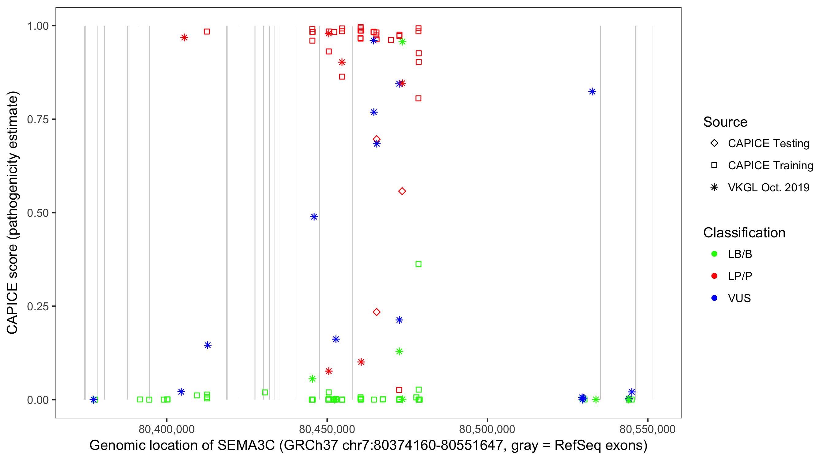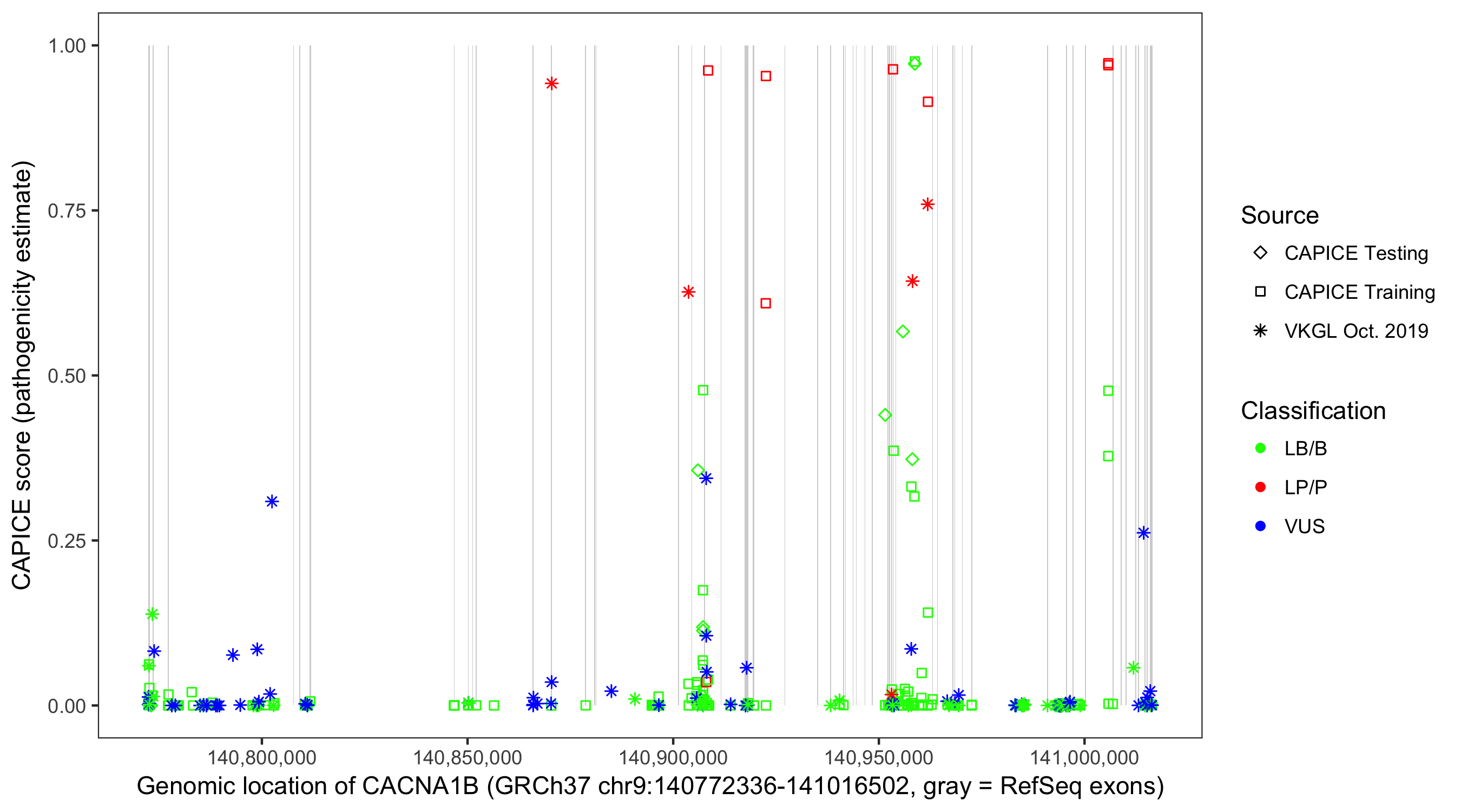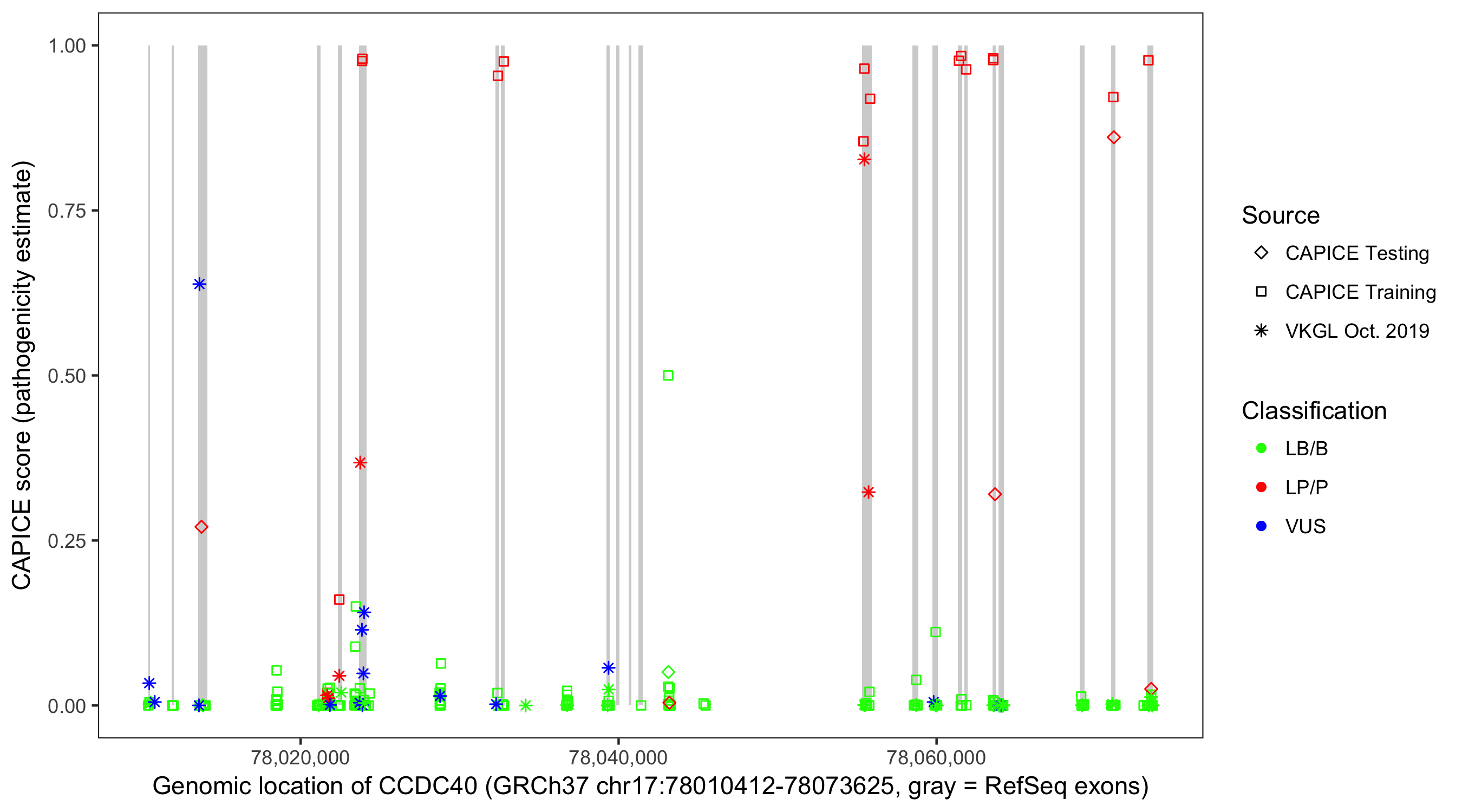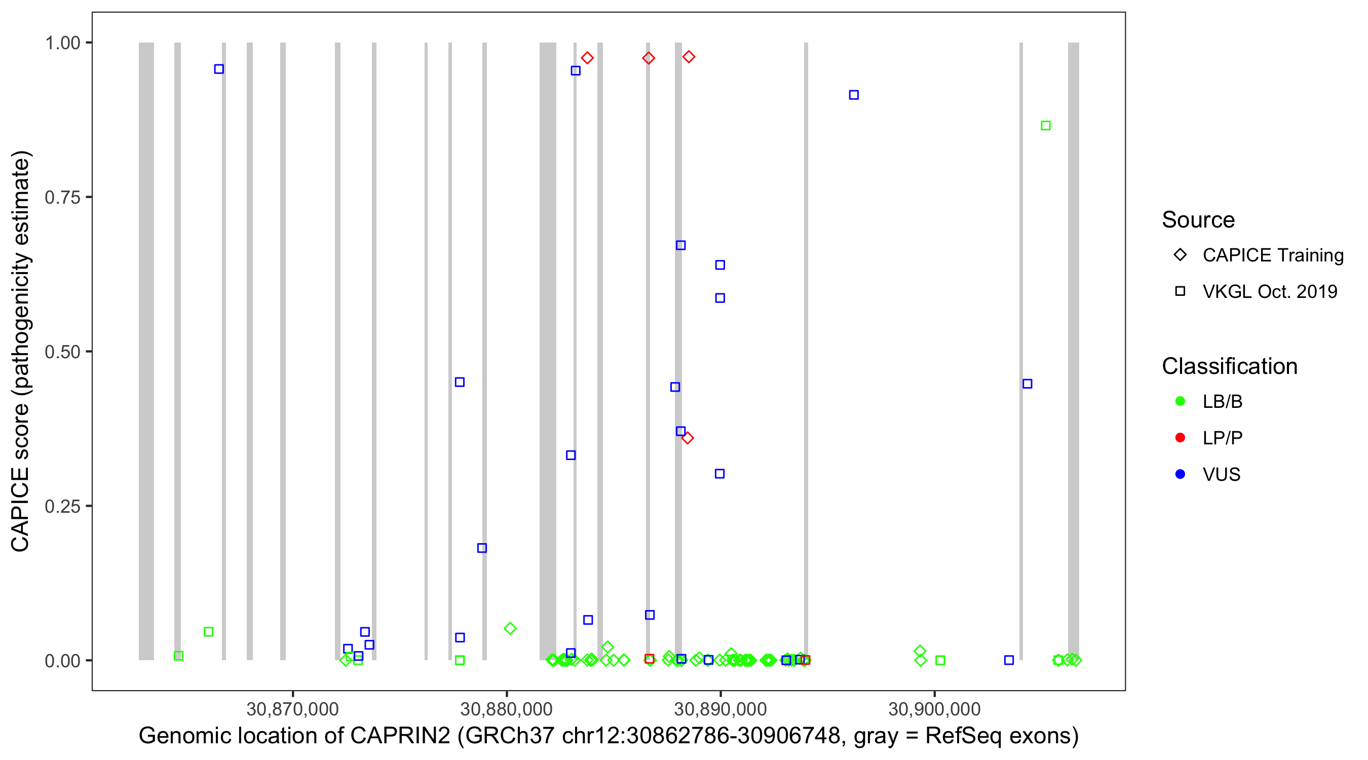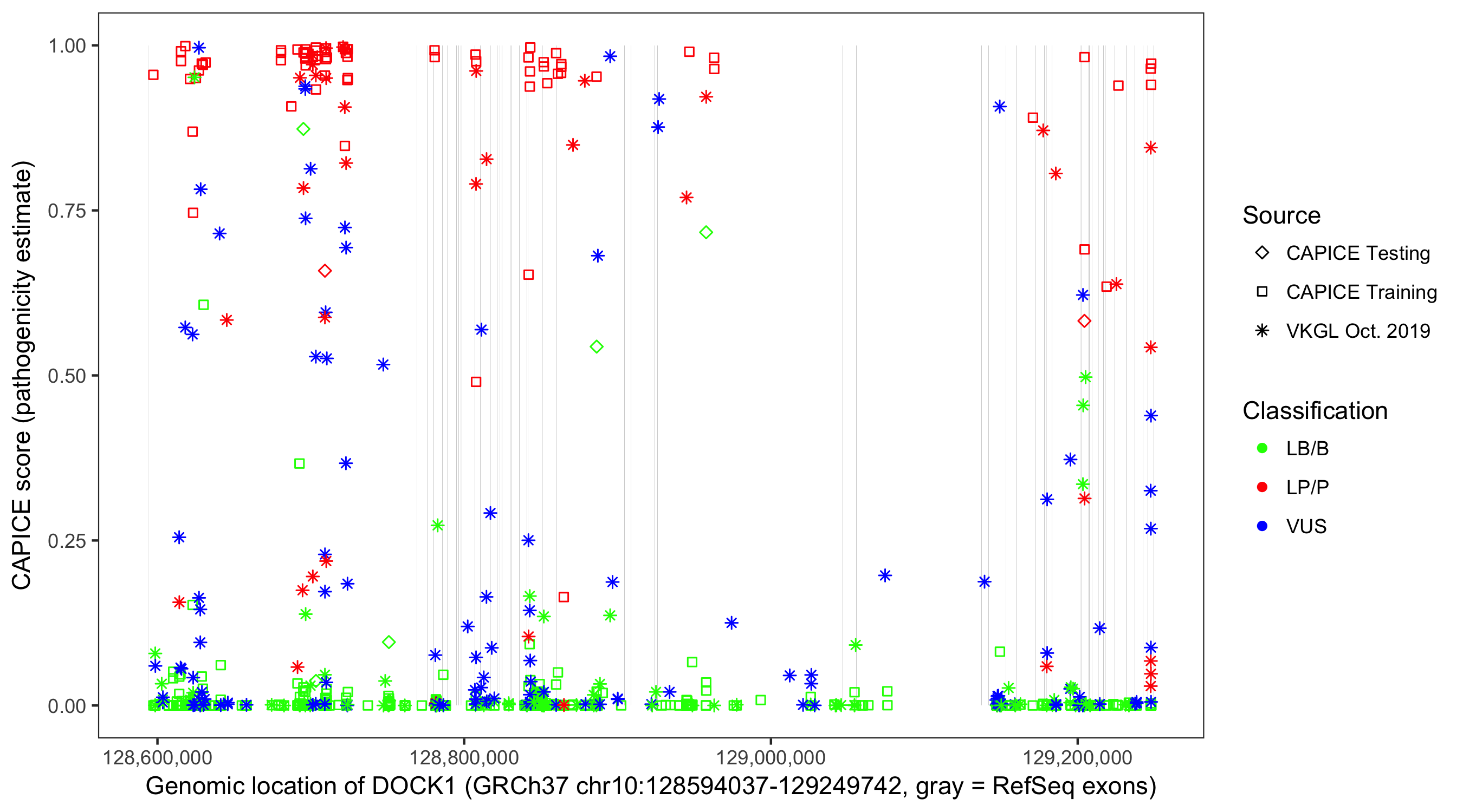 Shown are CAPICE train/test variants plus VKGL Oct 2019.