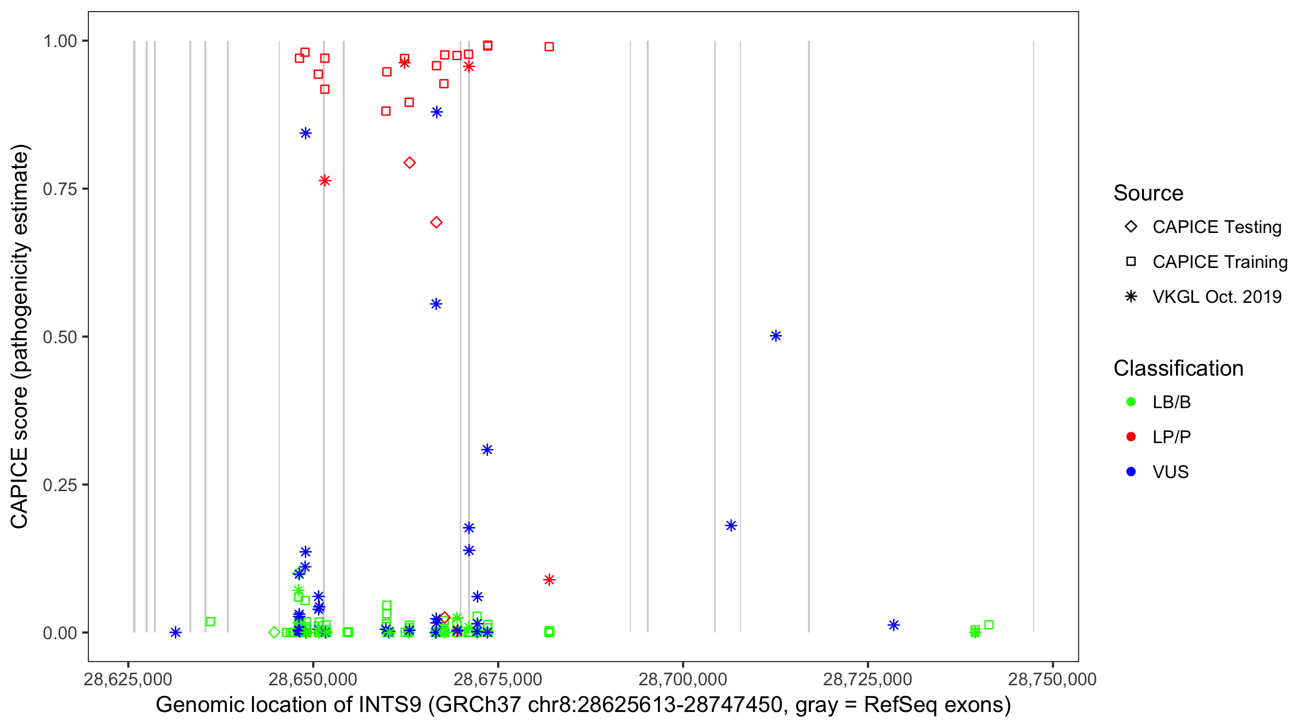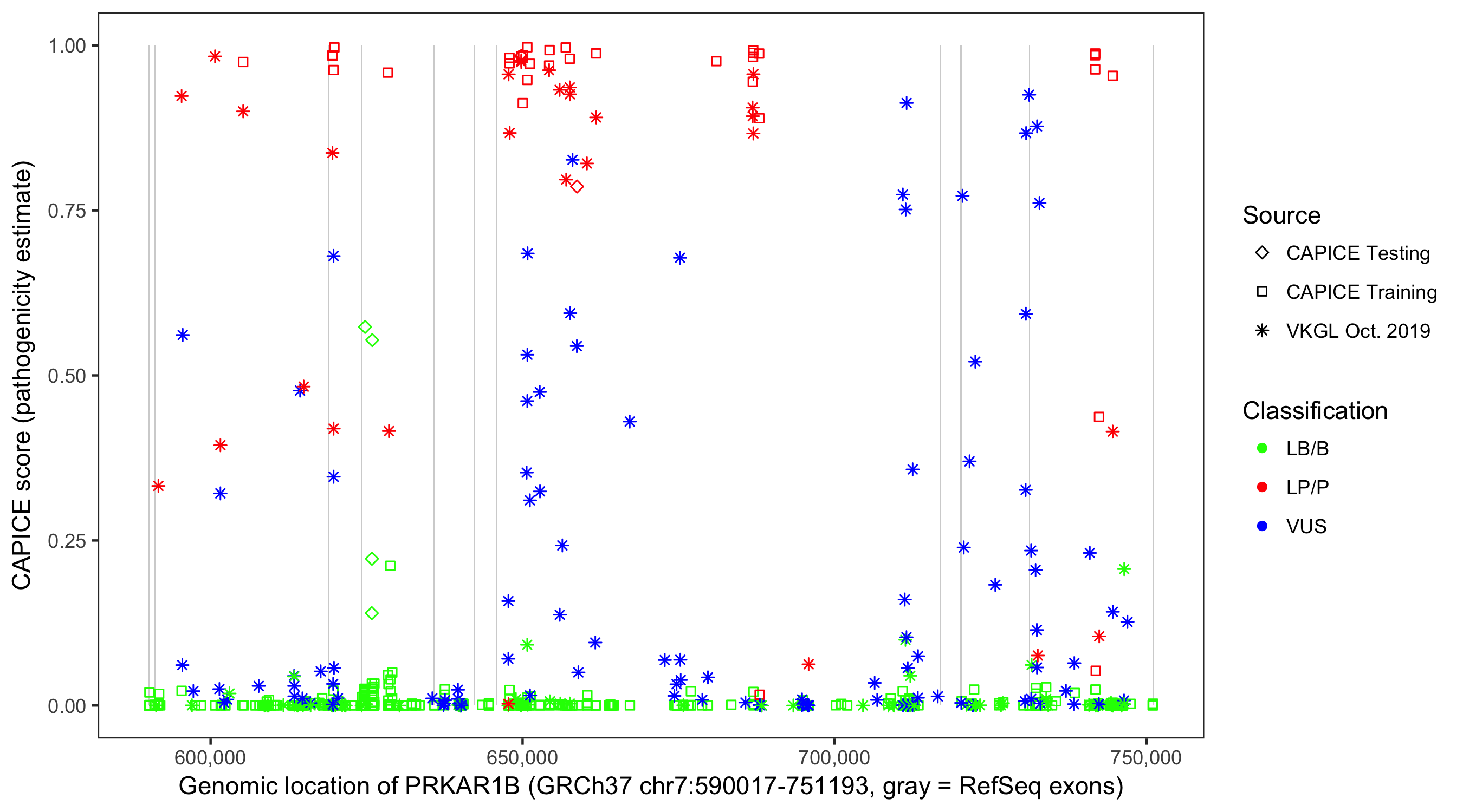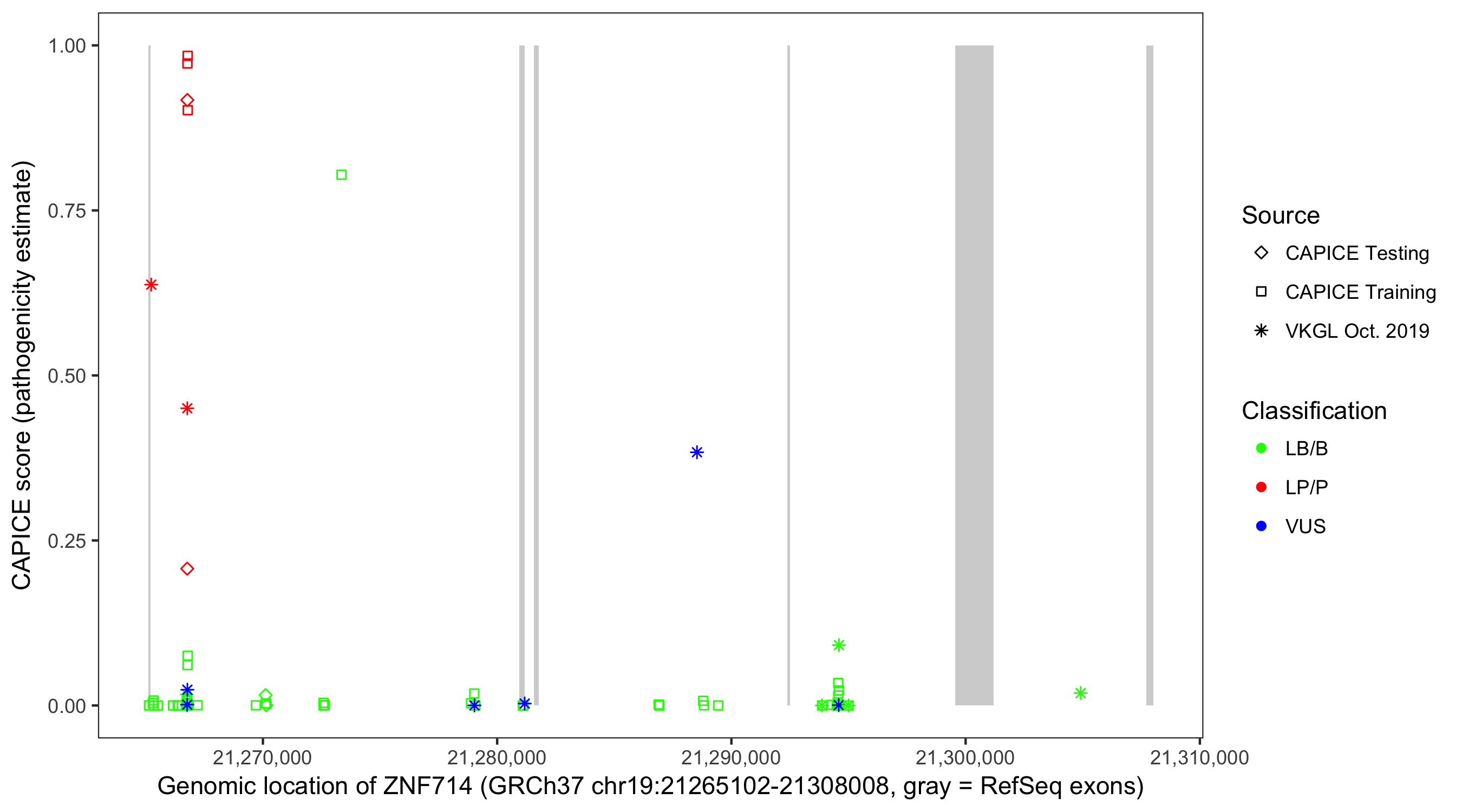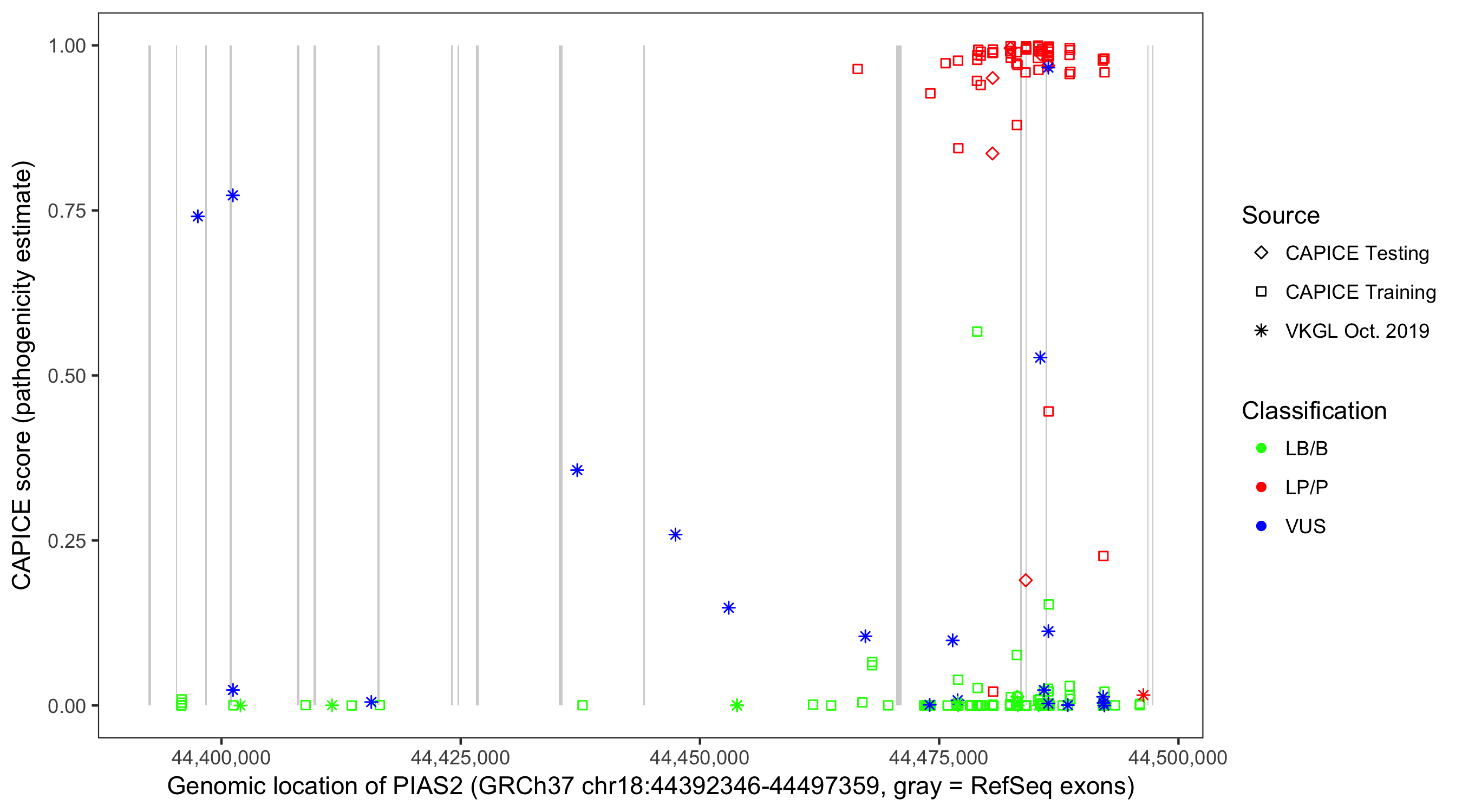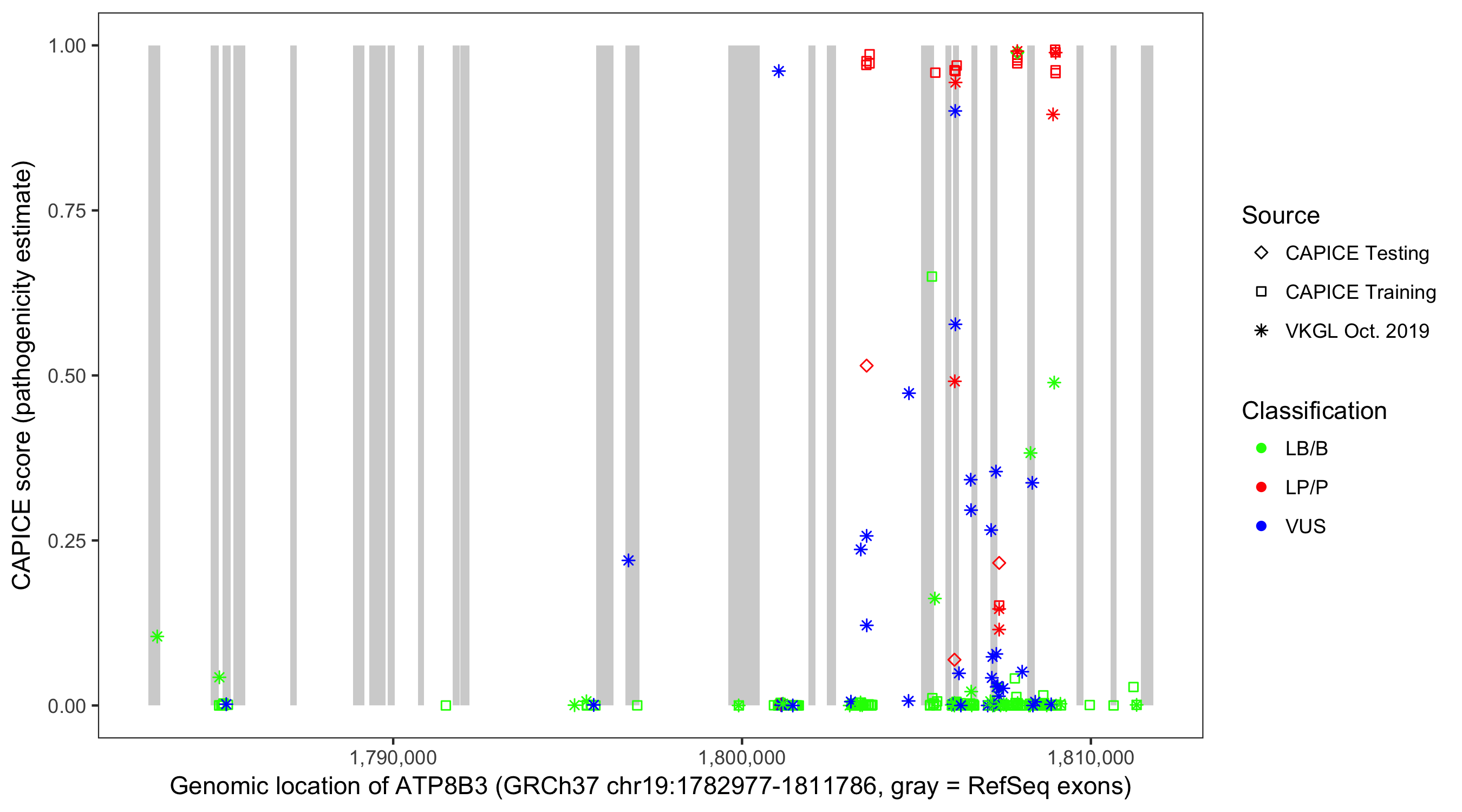 Shown are CAPICE train/test variants plus VKGL Oct 2019.