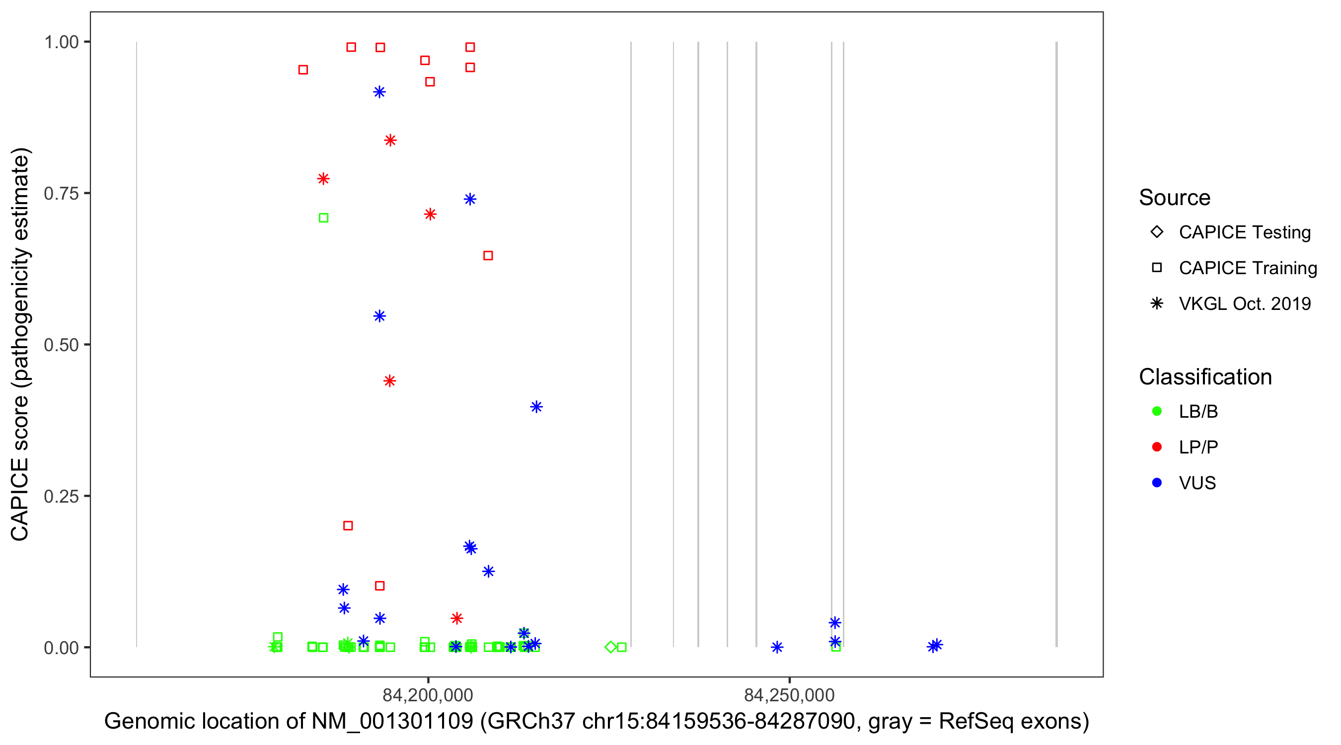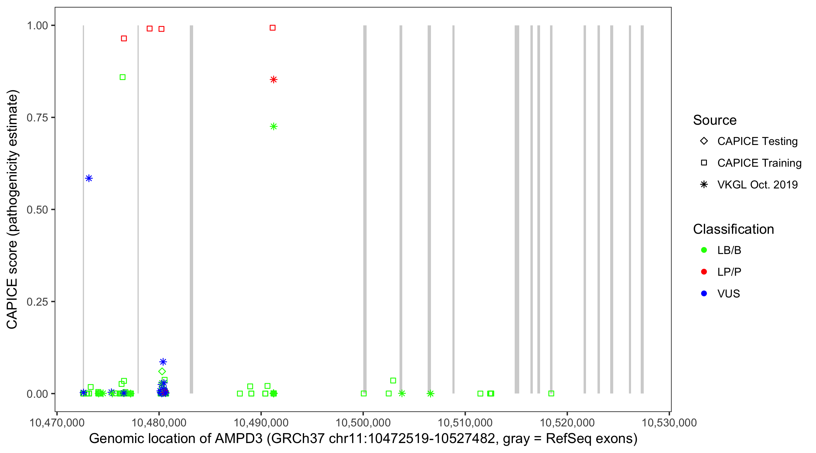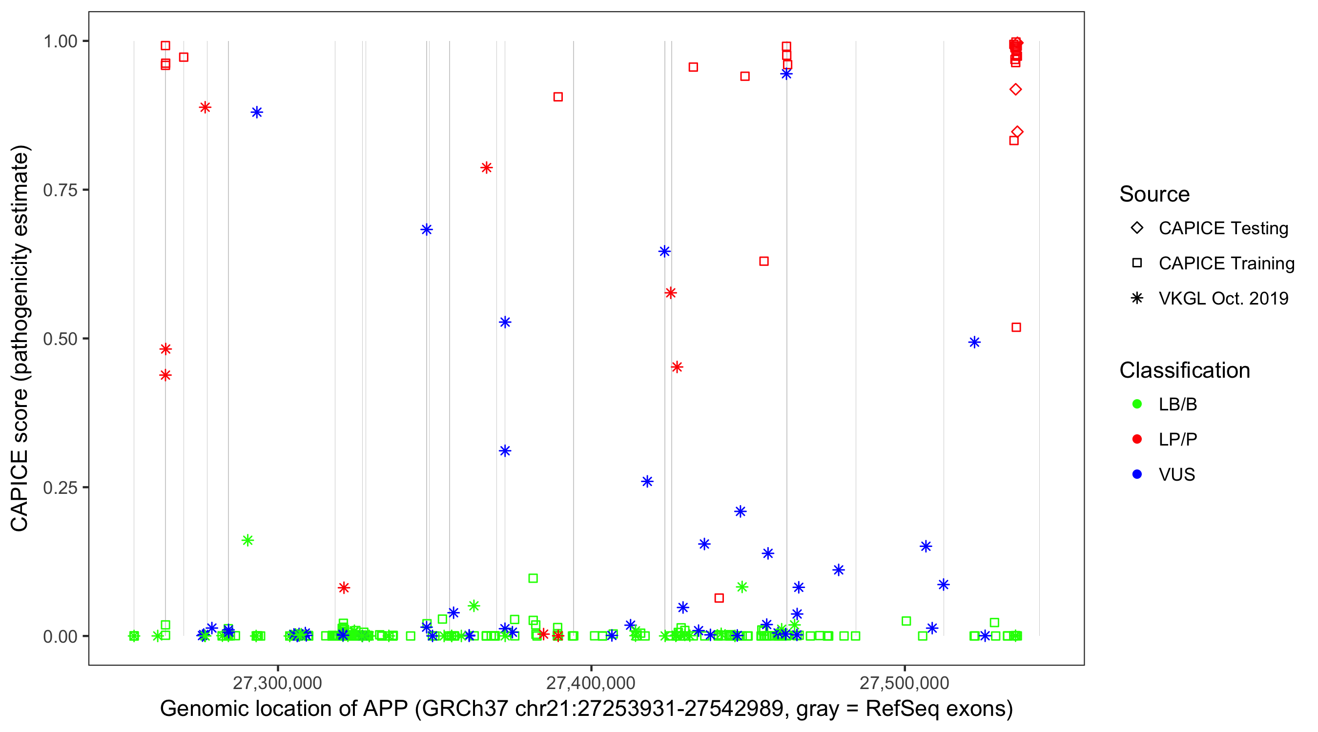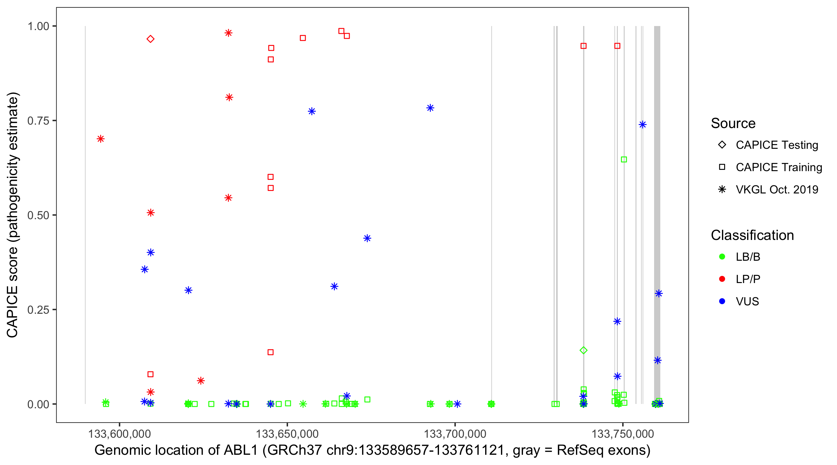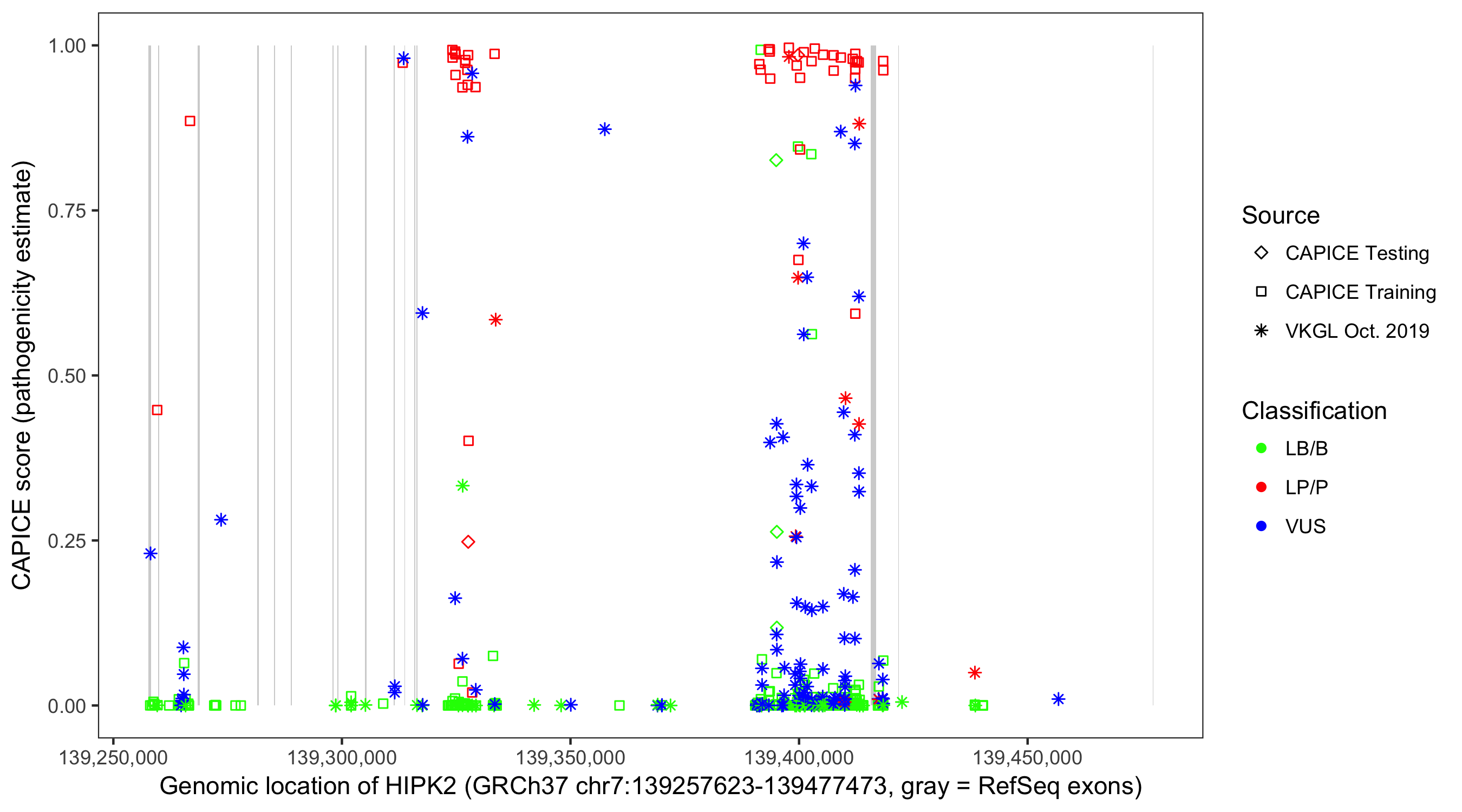 Shown are CAPICE train/test variants plus VKGL Oct 2019.