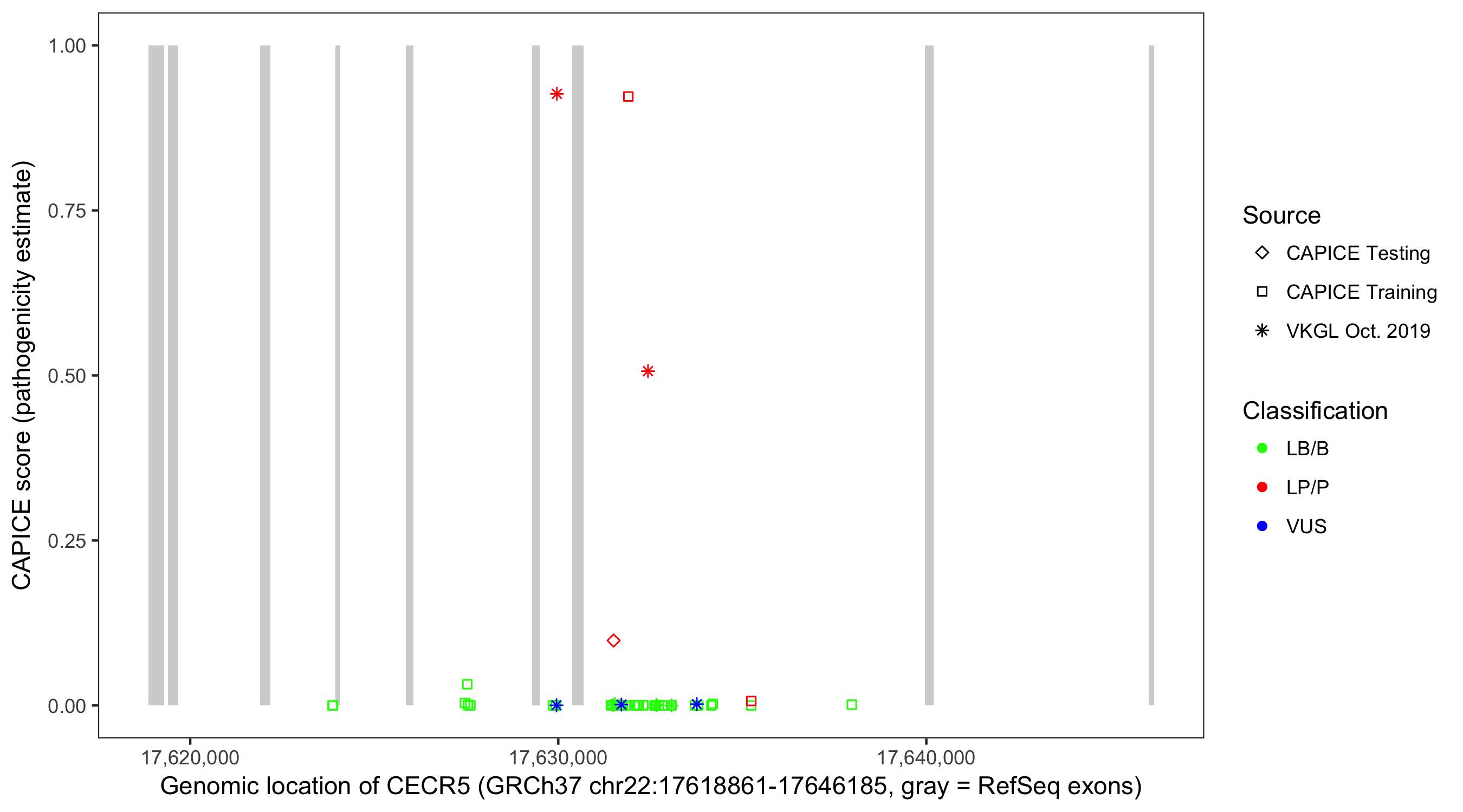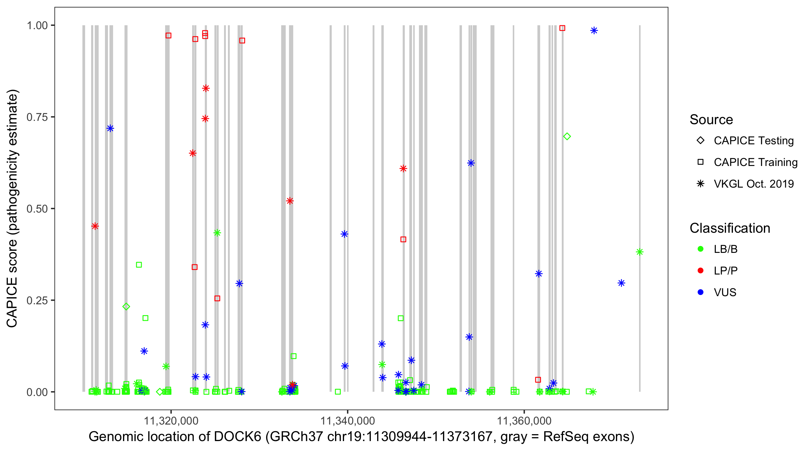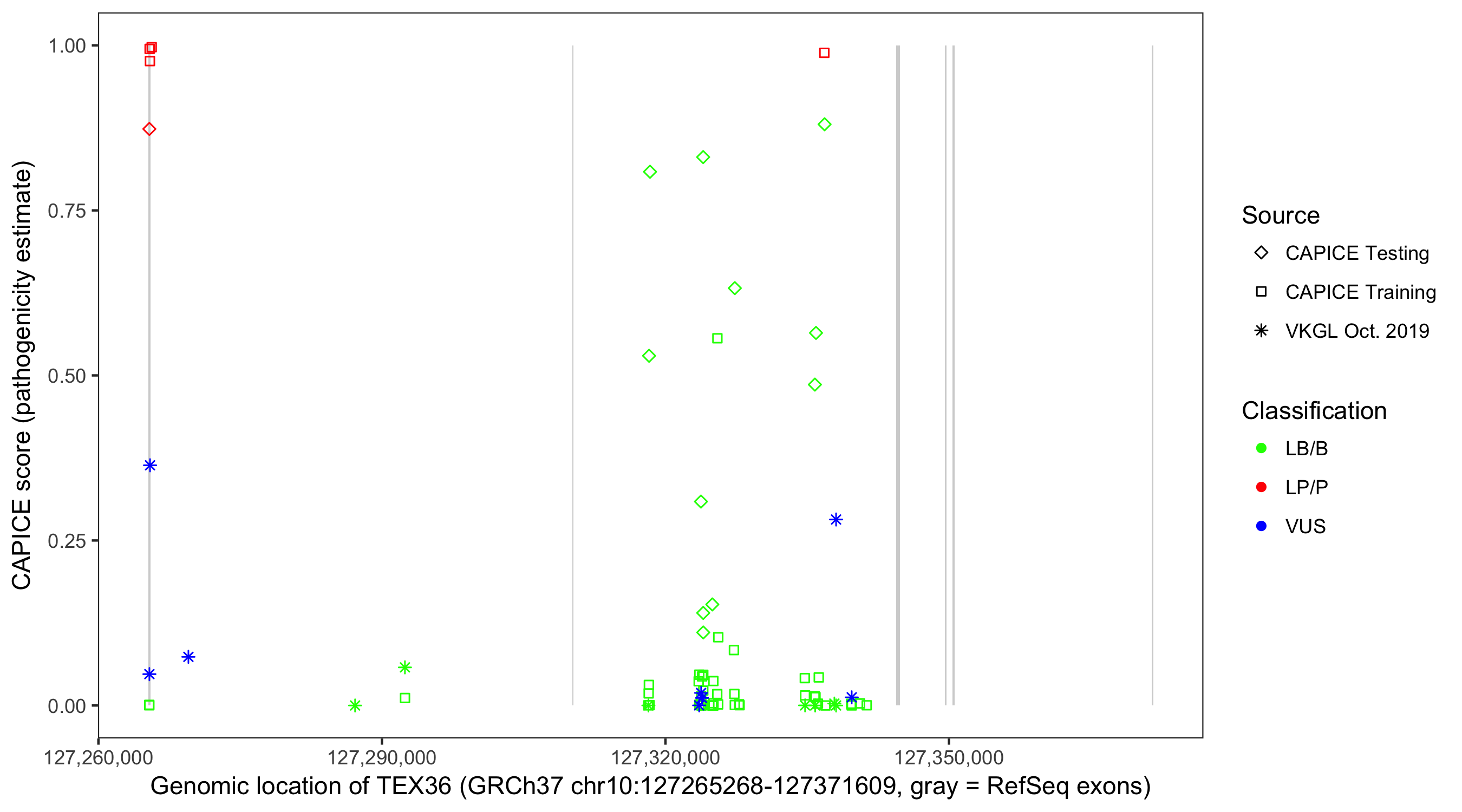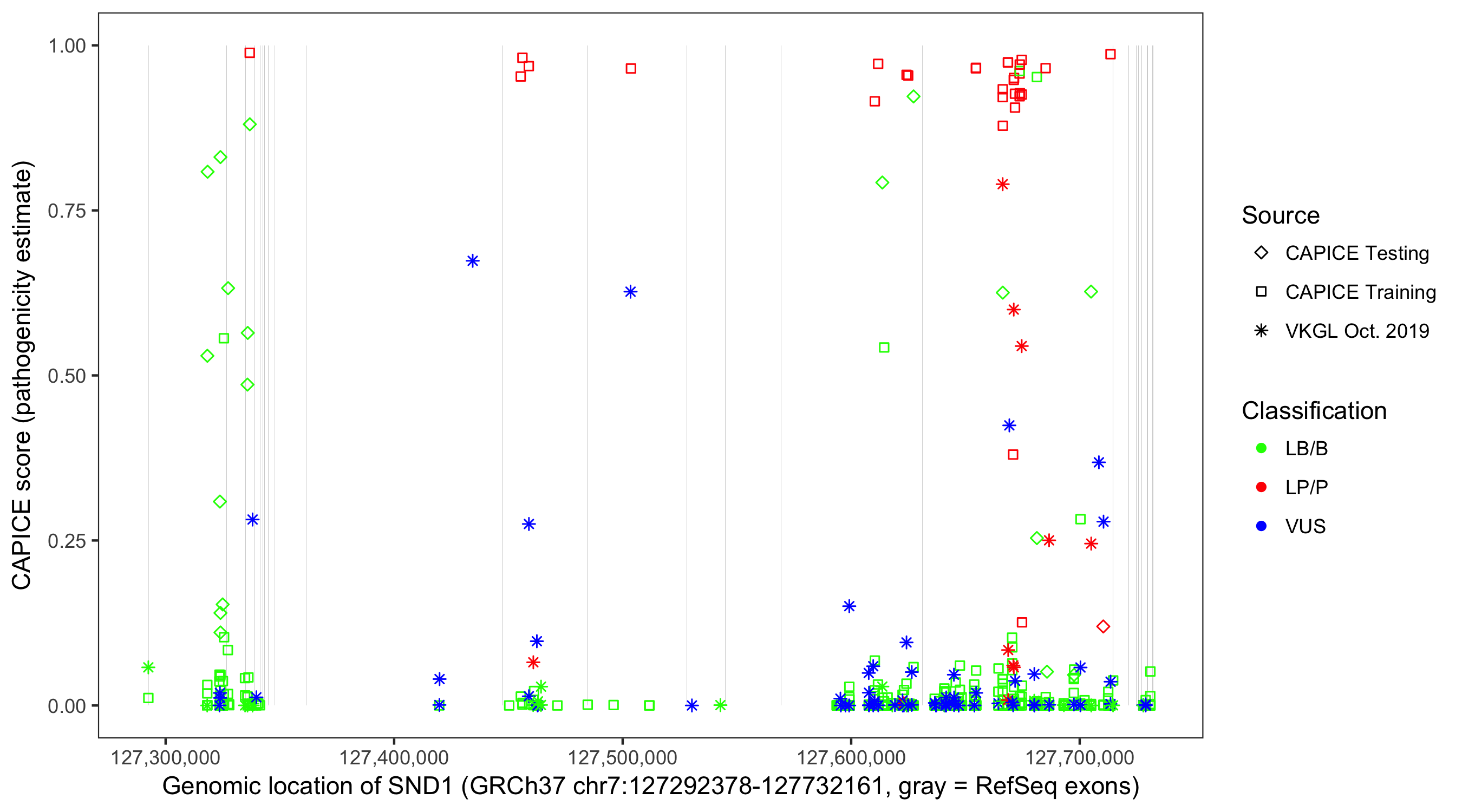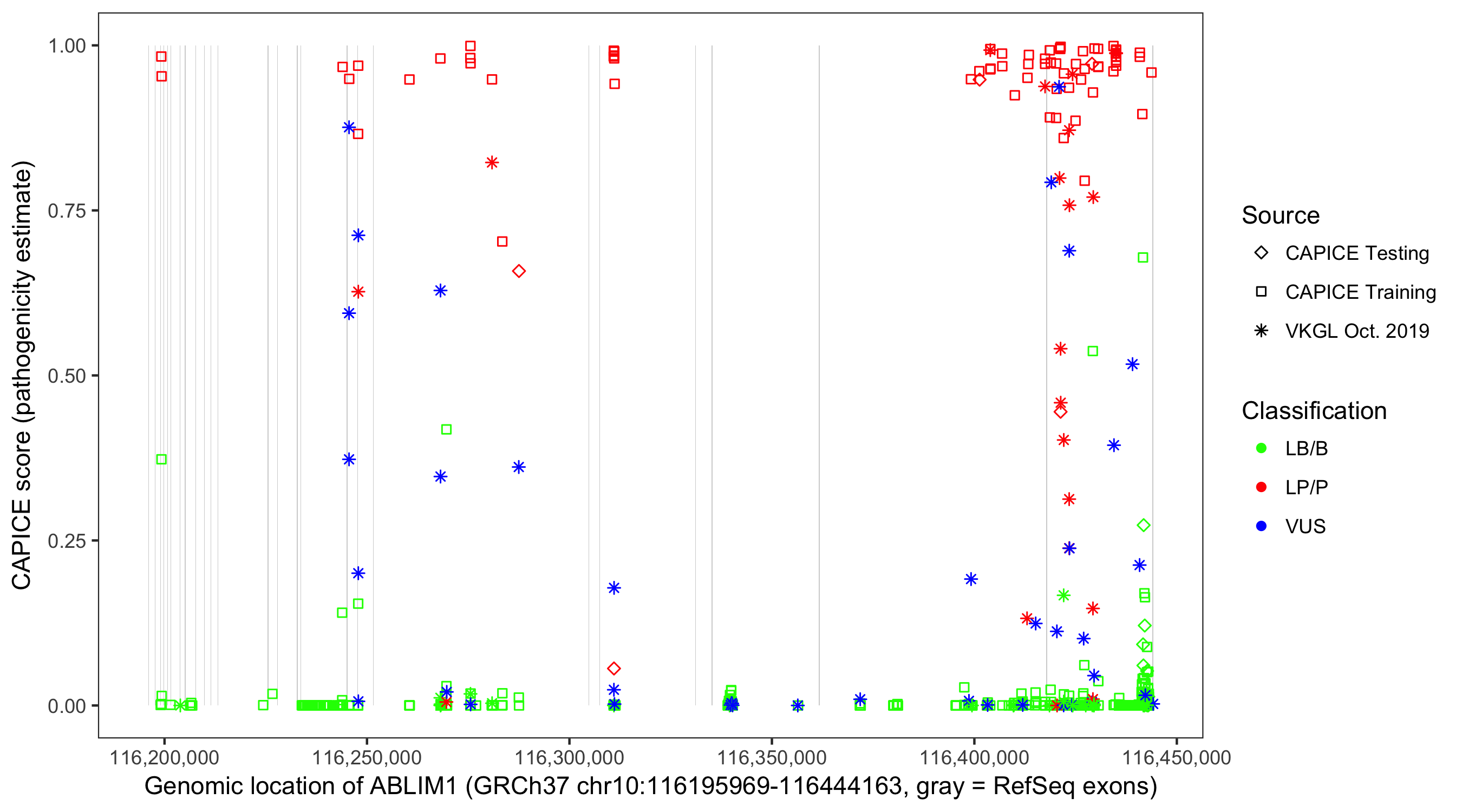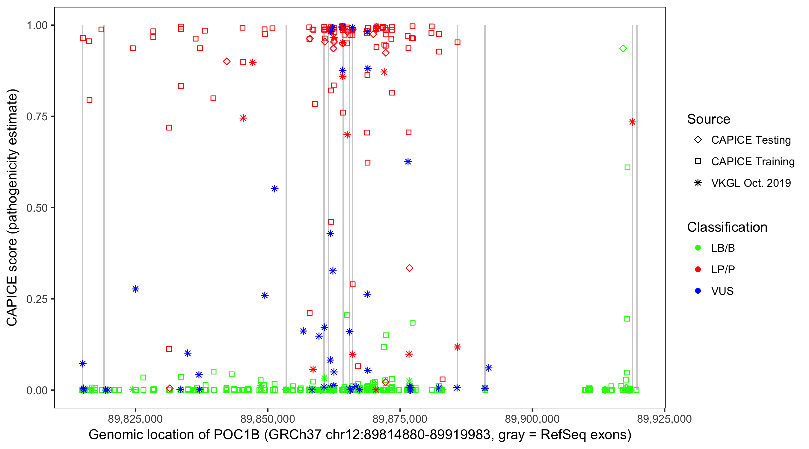 Shown are CAPICE train/test variants plus VKGL Oct 2019.