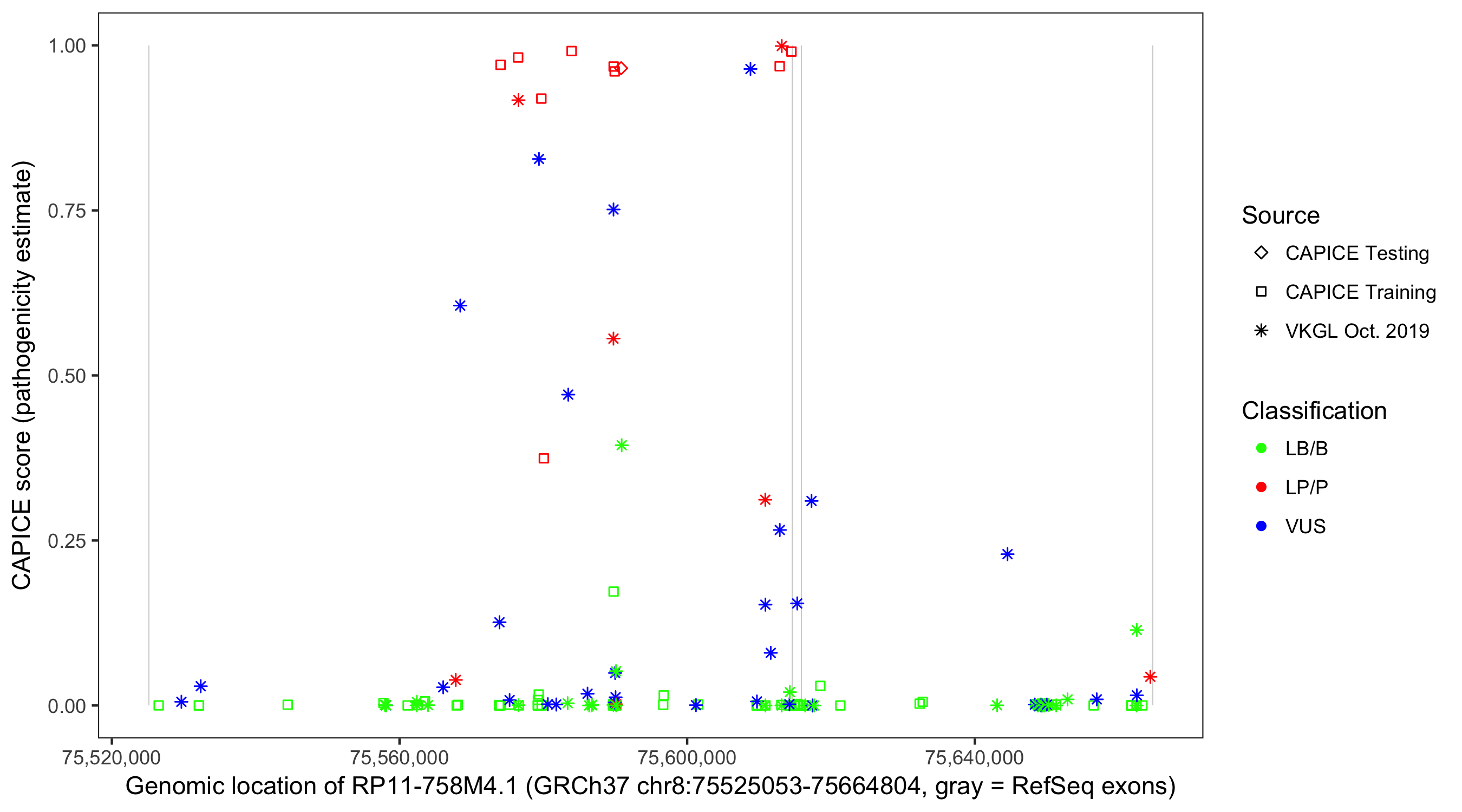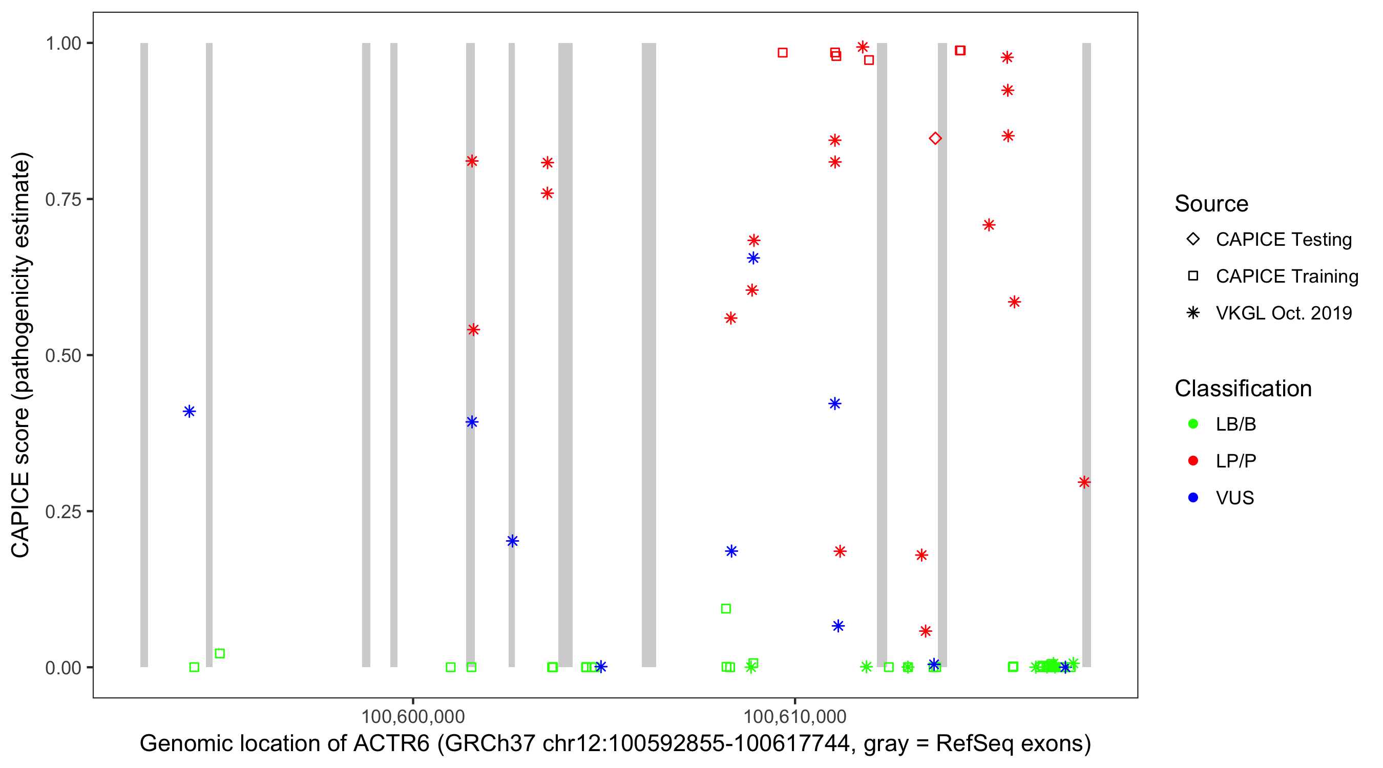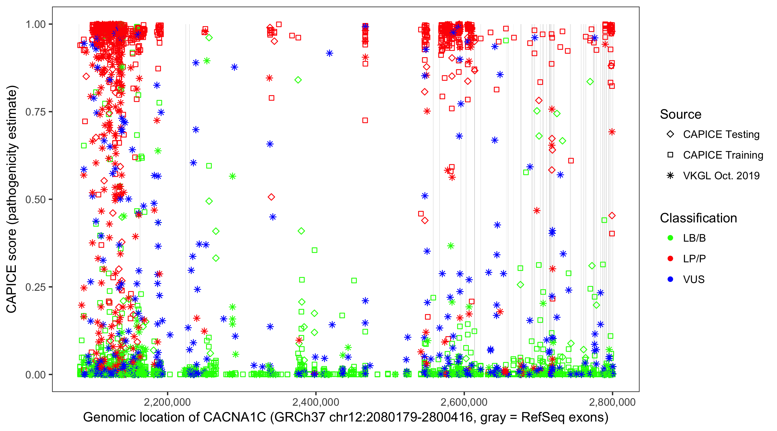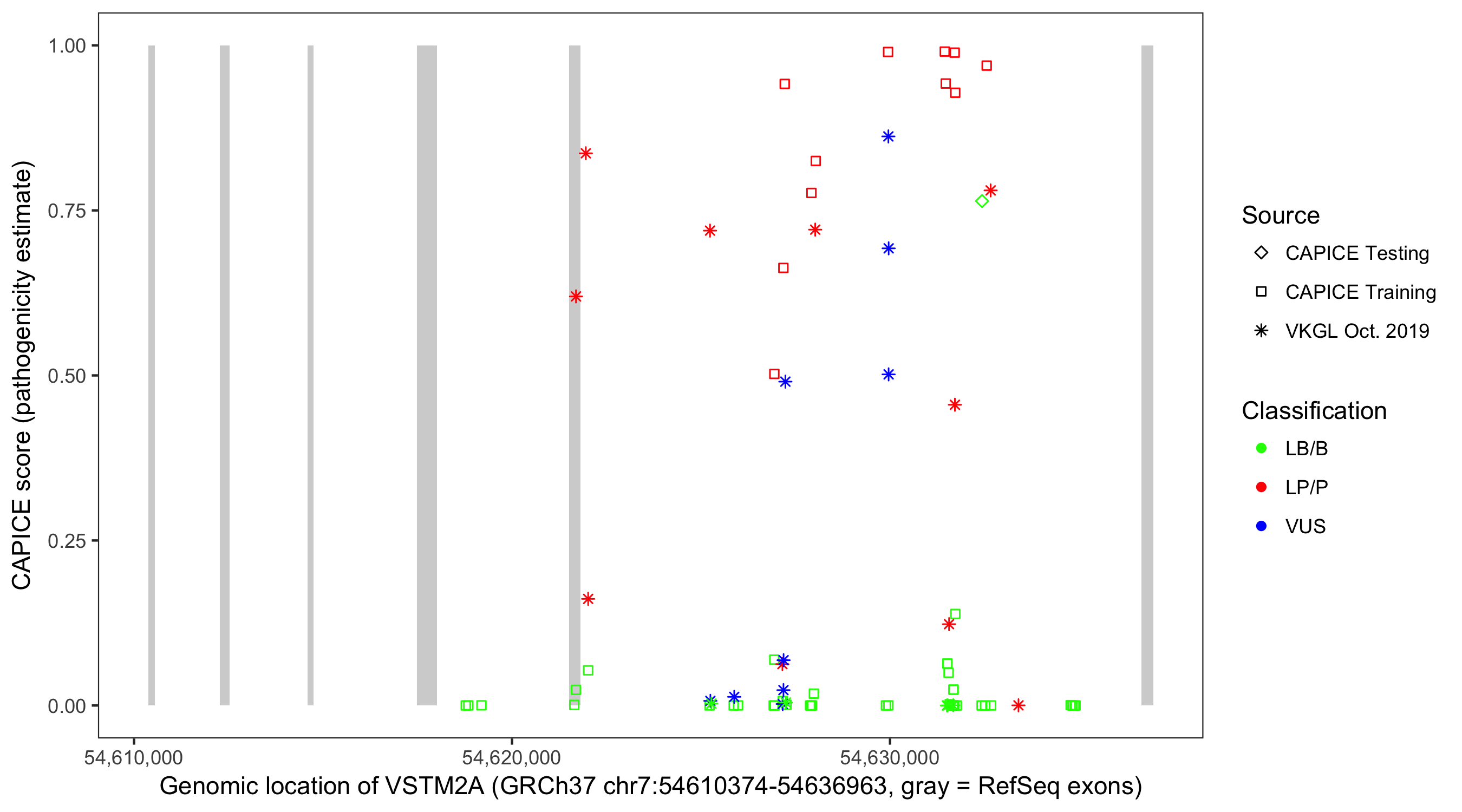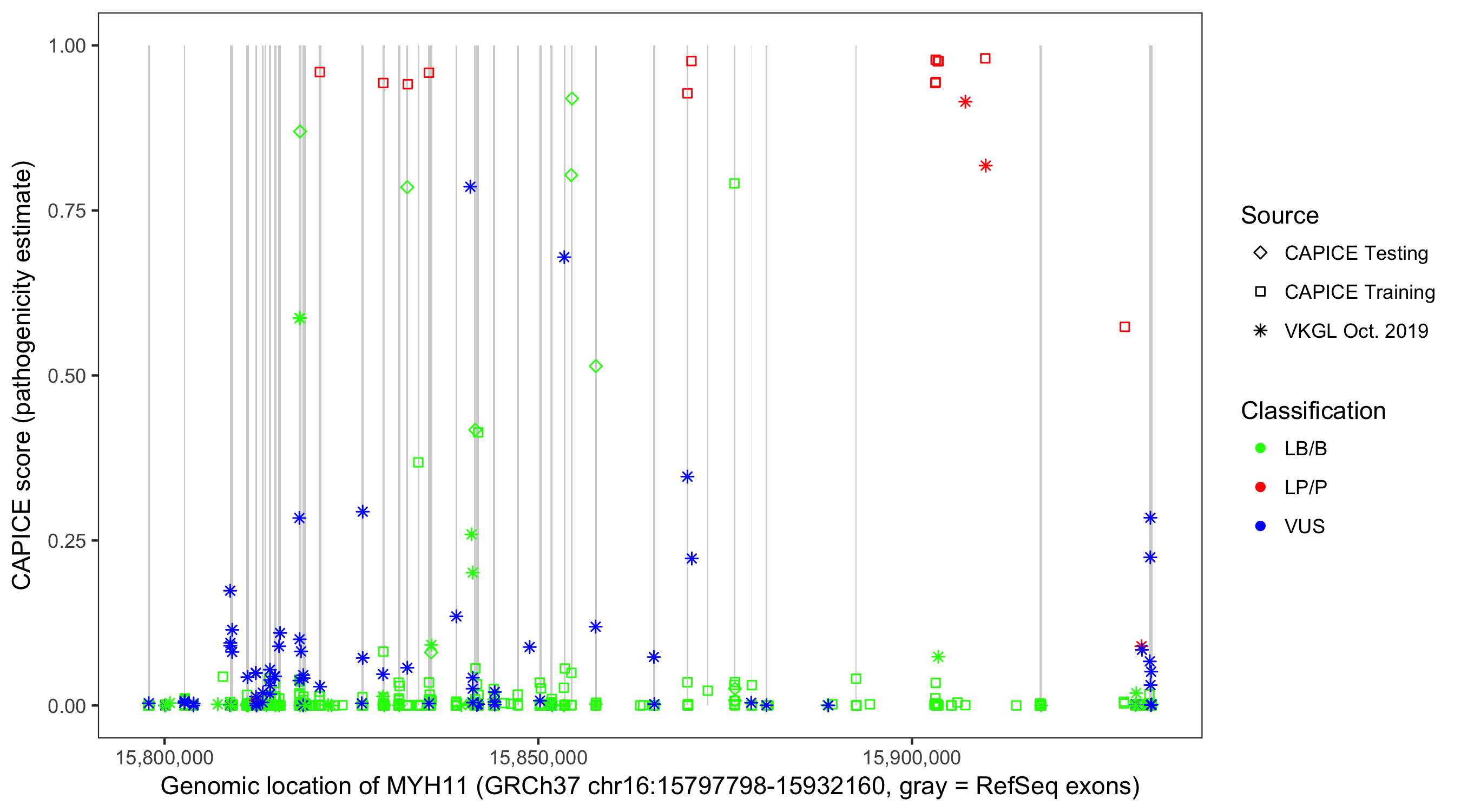 Shown are CAPICE train/test variants plus VKGL Oct 2019.