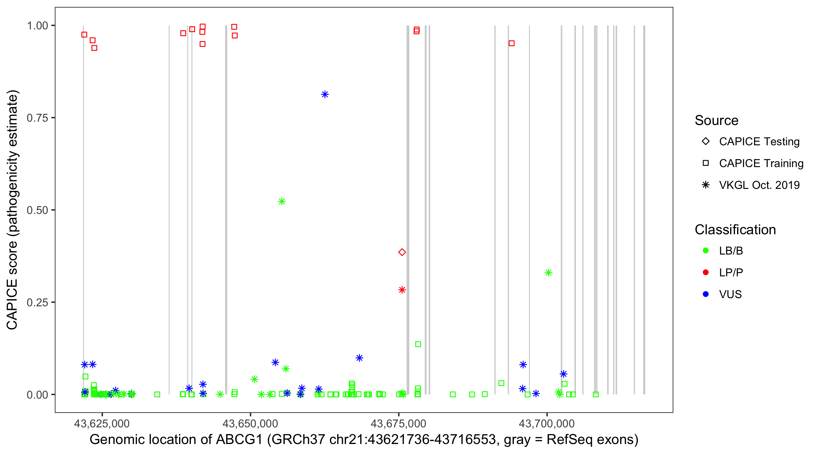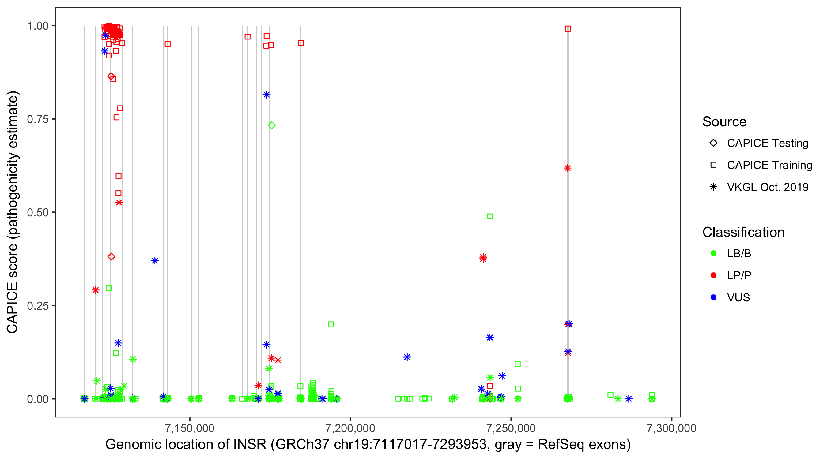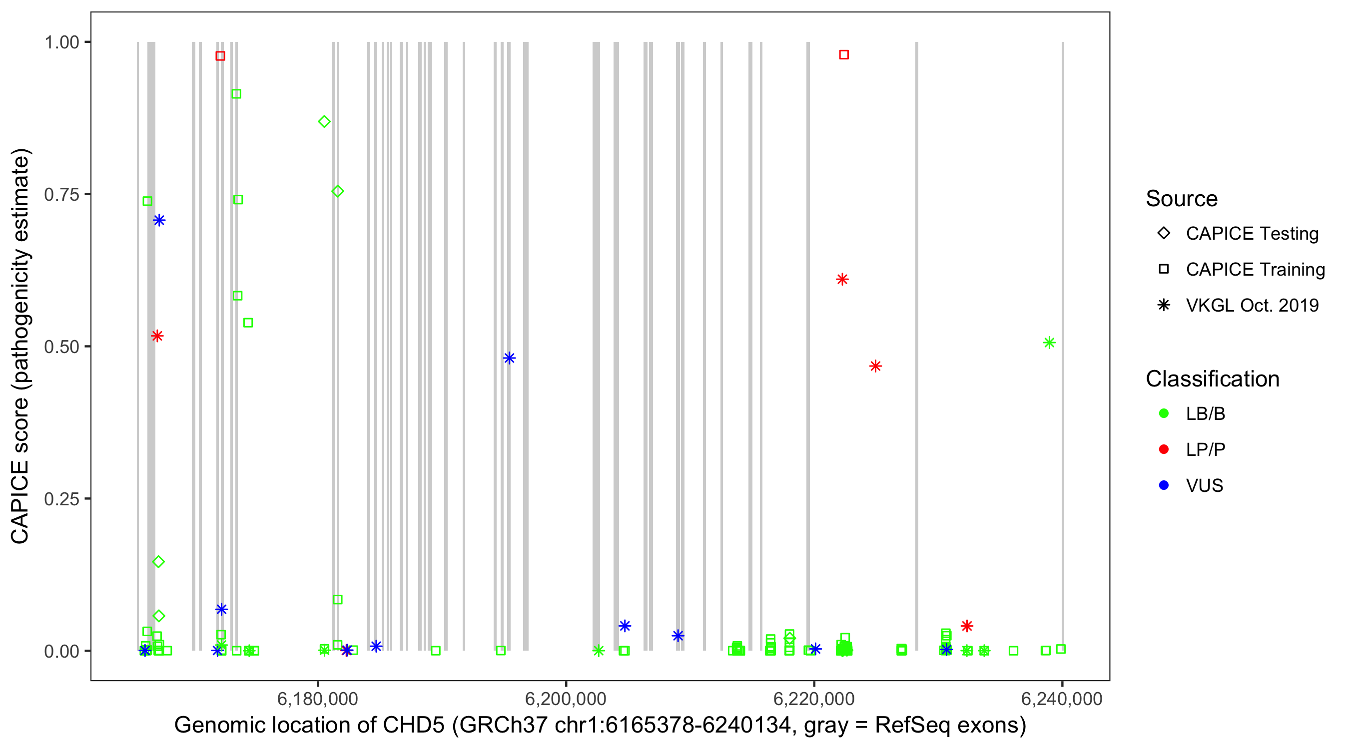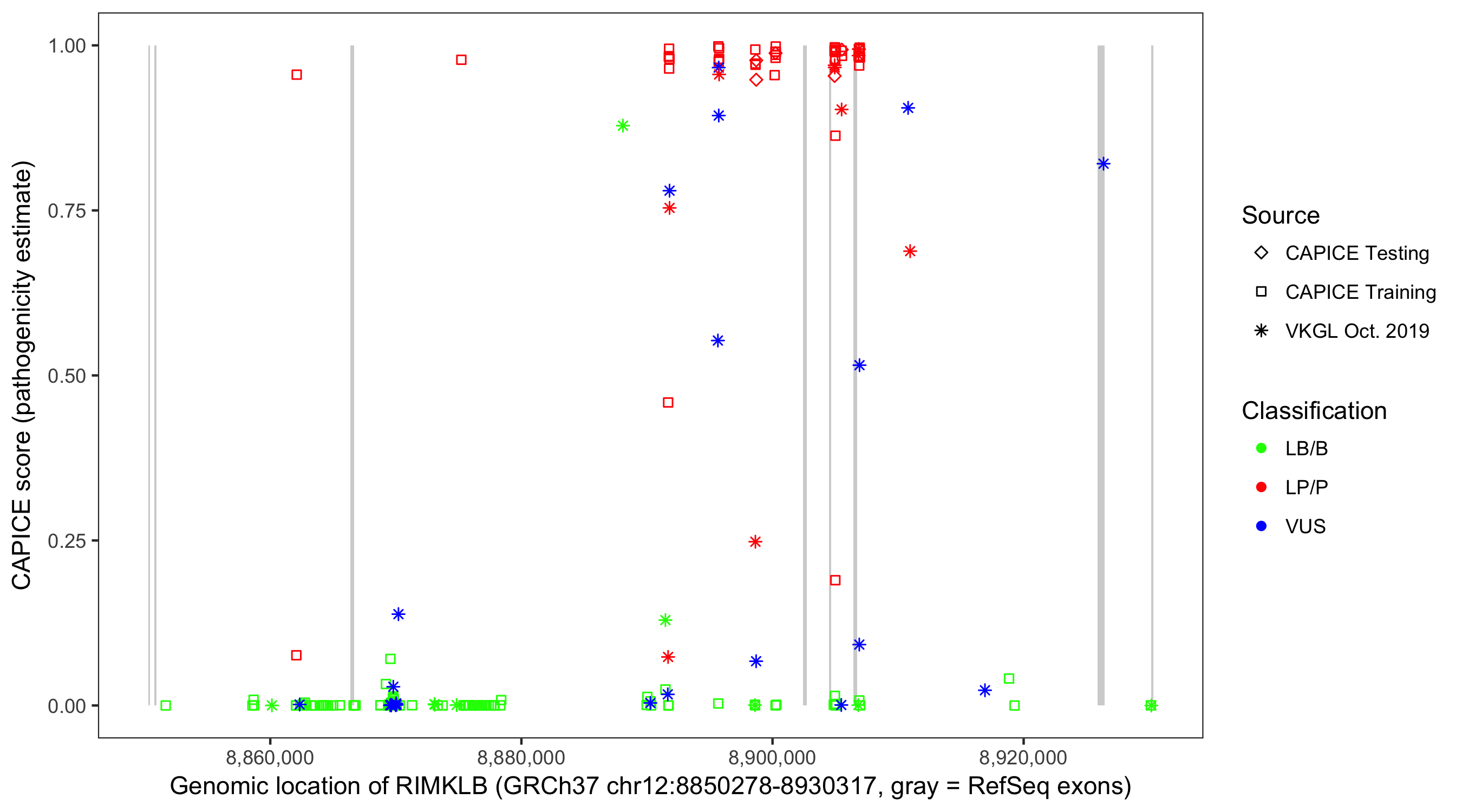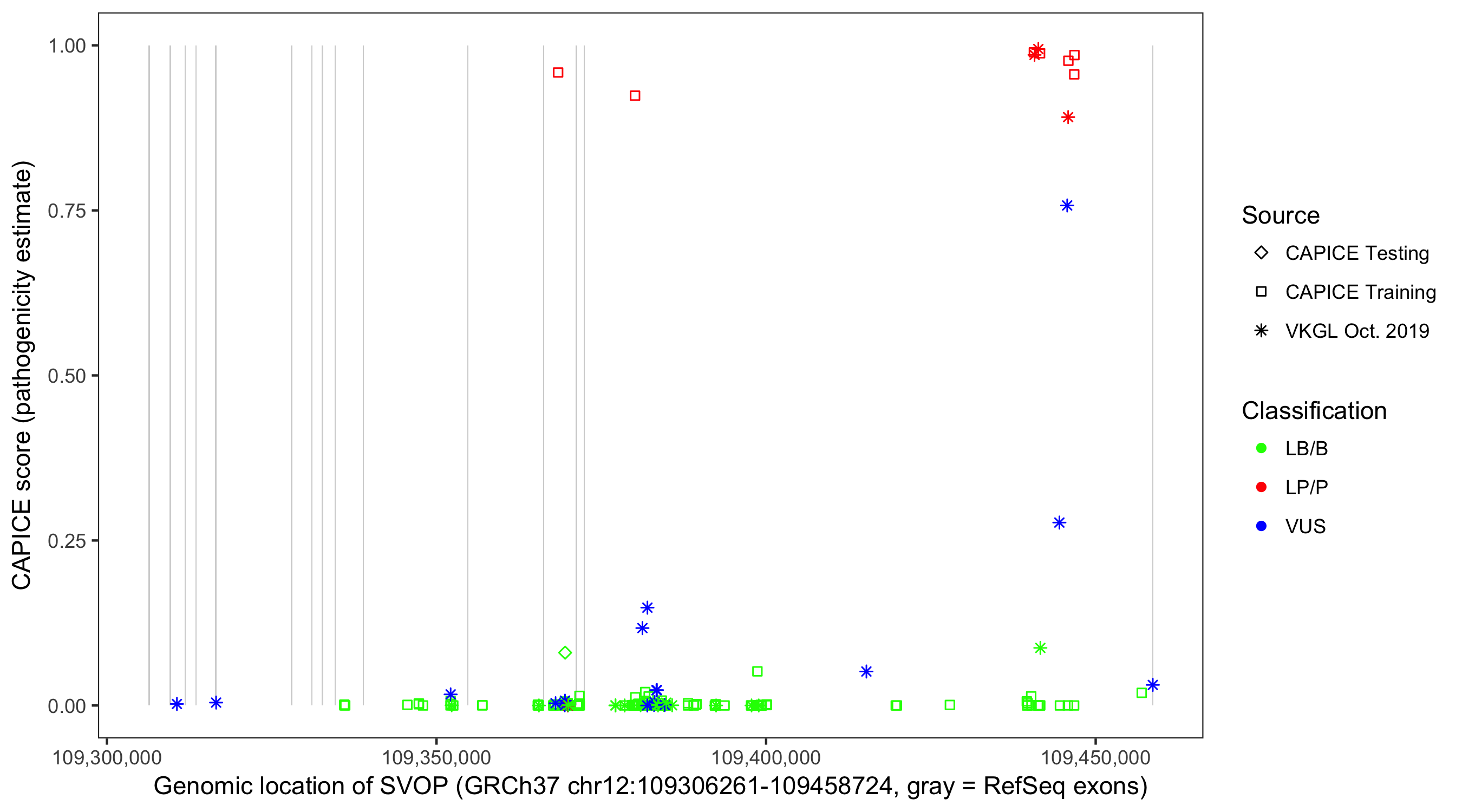 Shown are CAPICE train/test variants plus VKGL Oct 2019.