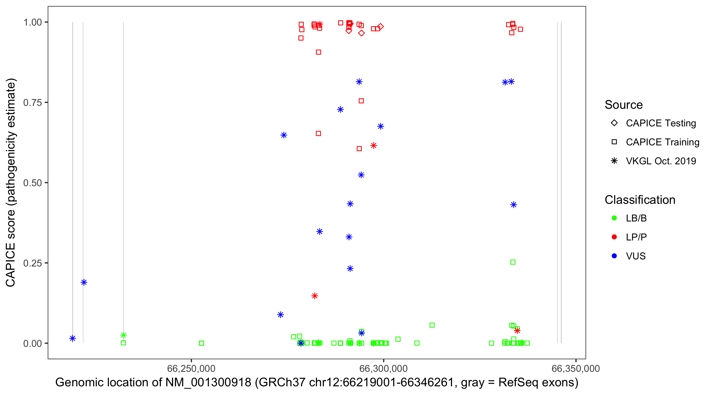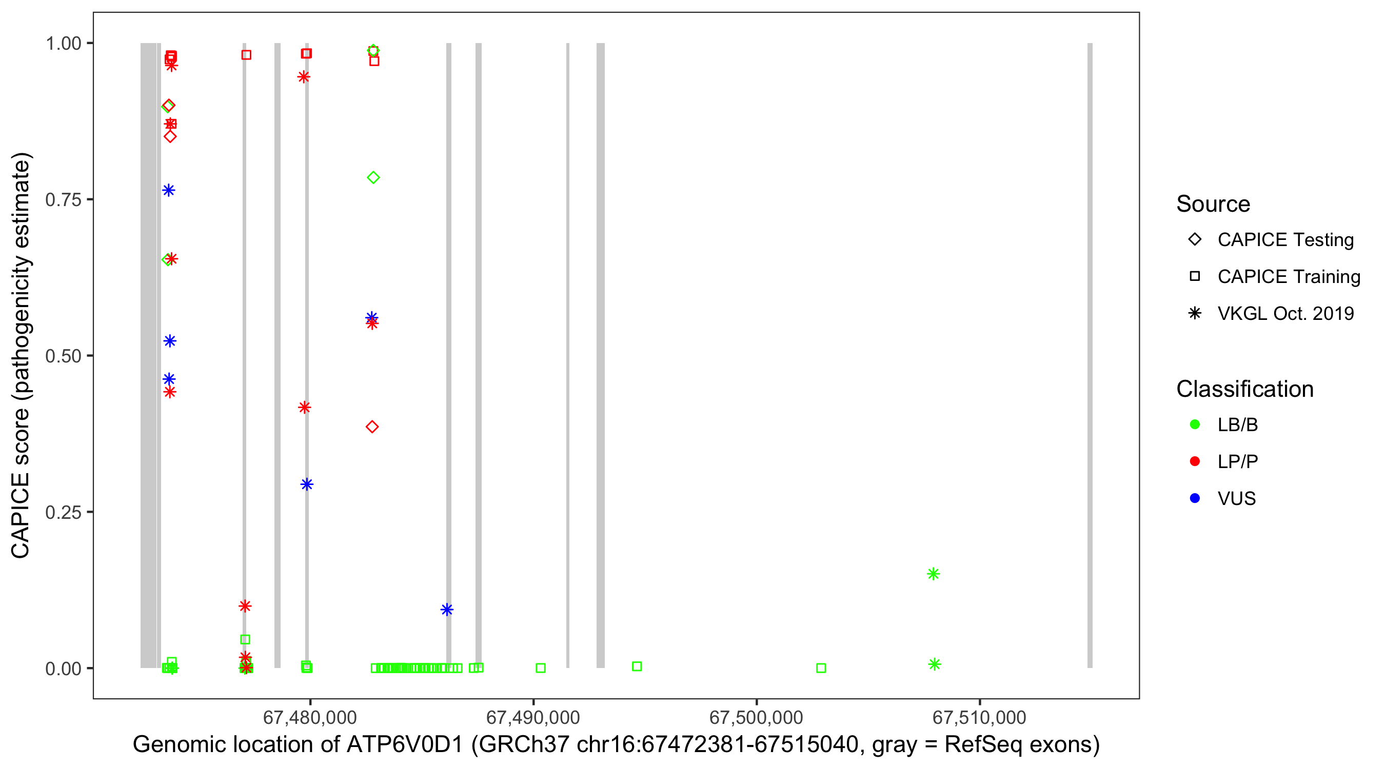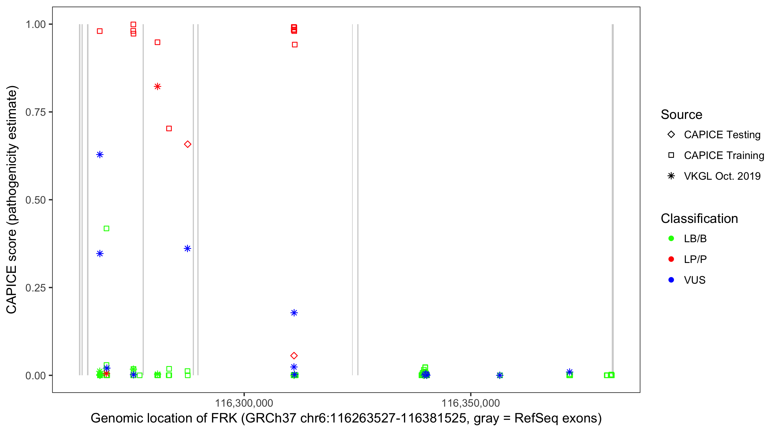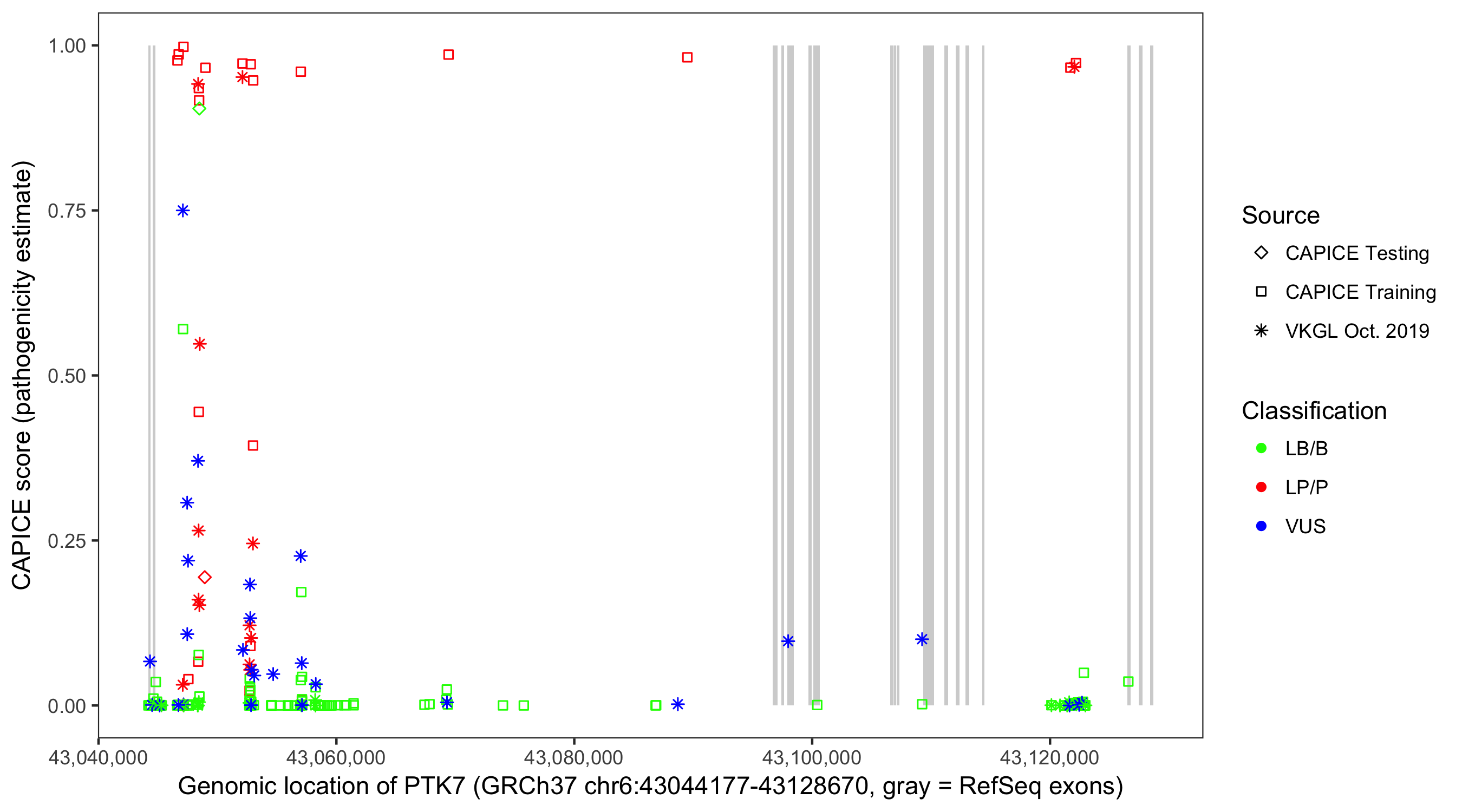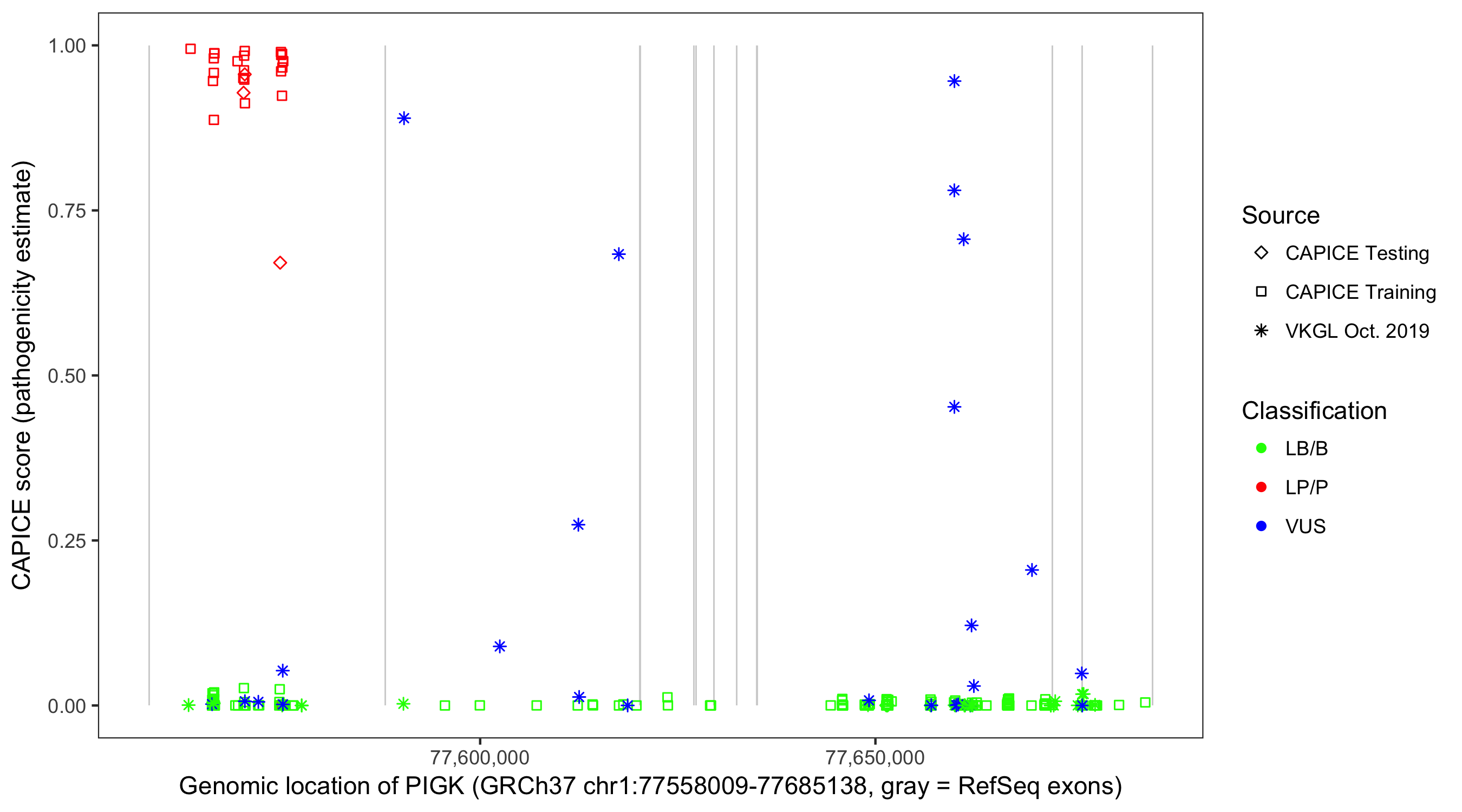 Shown are CAPICE train/test variants plus VKGL Oct 2019.