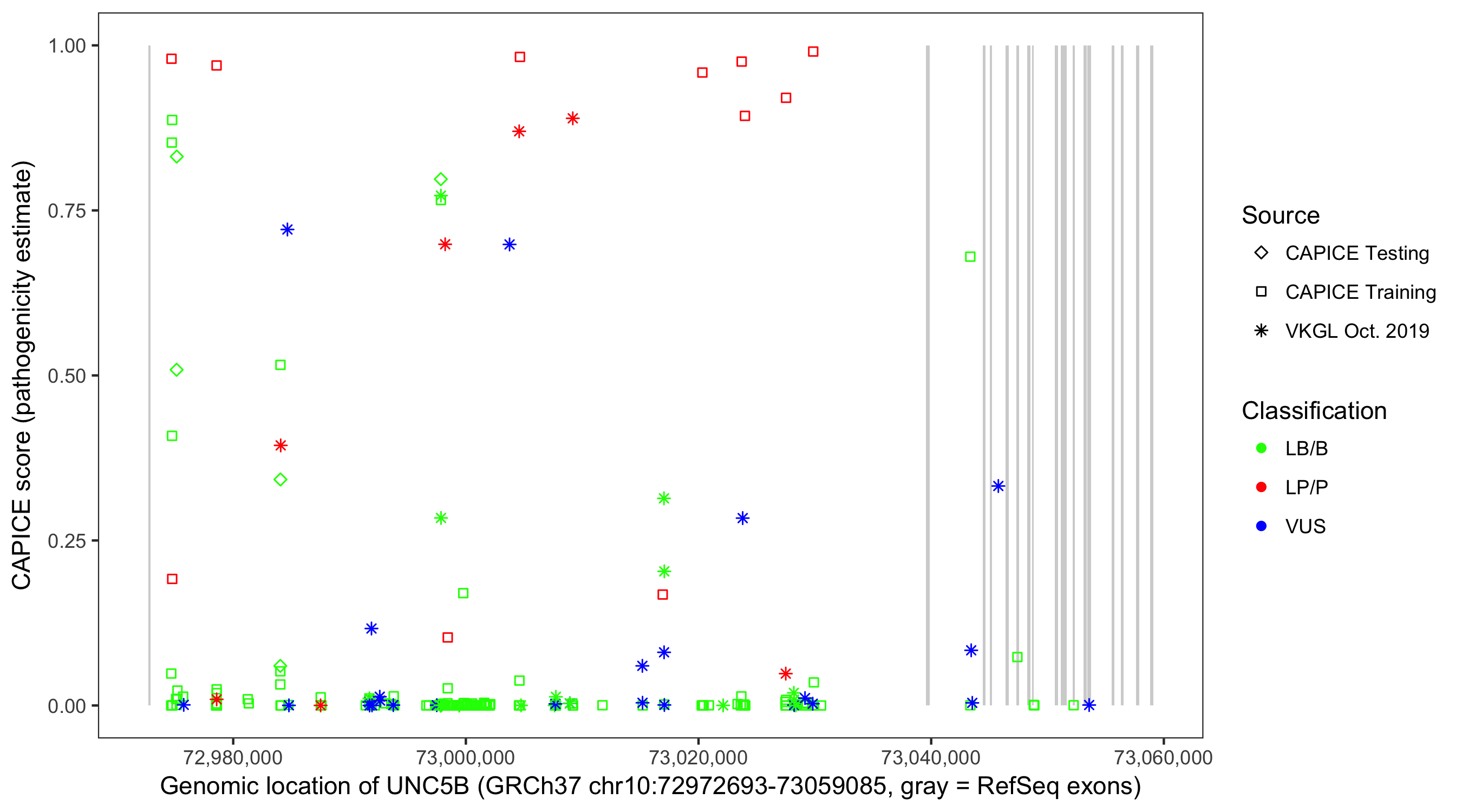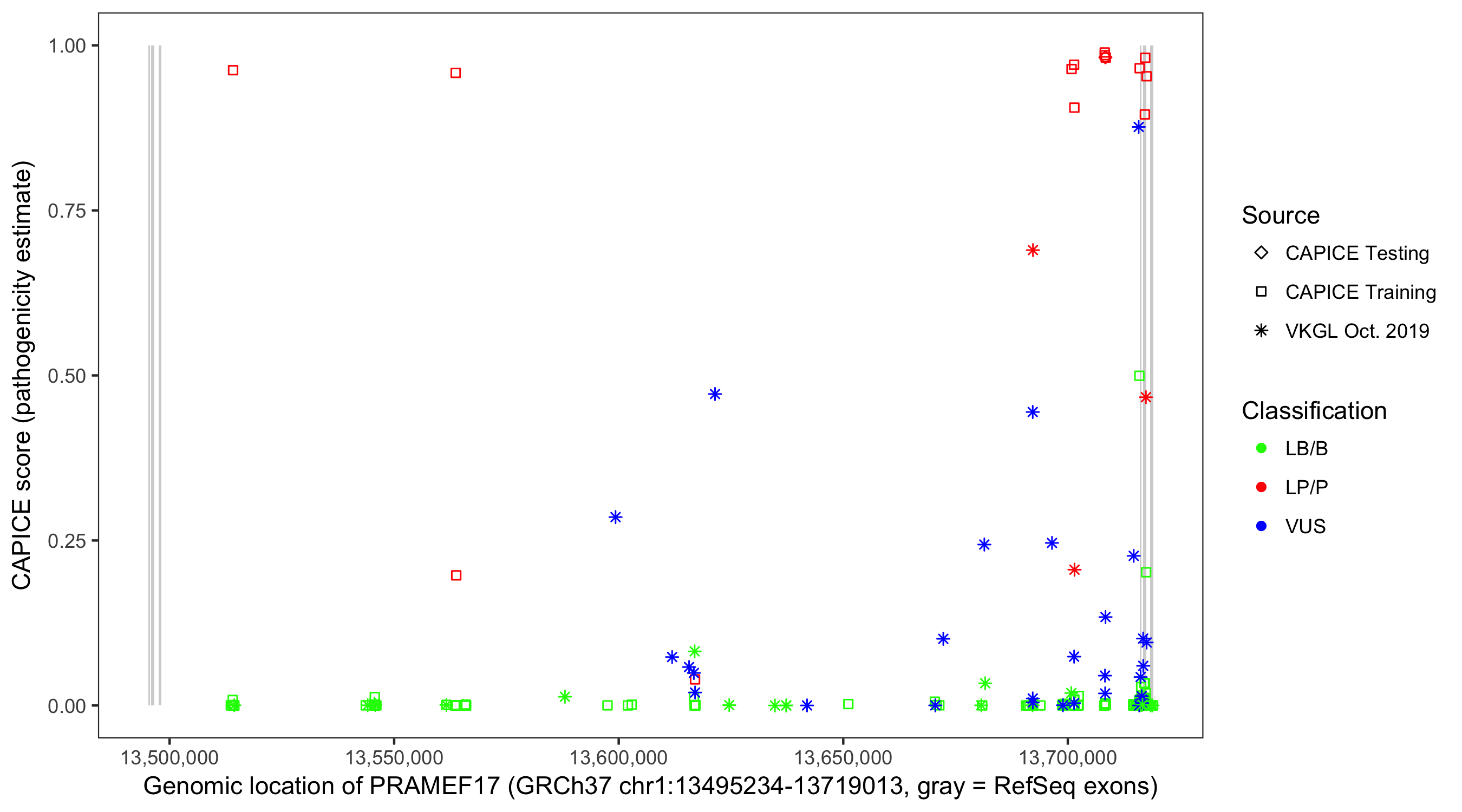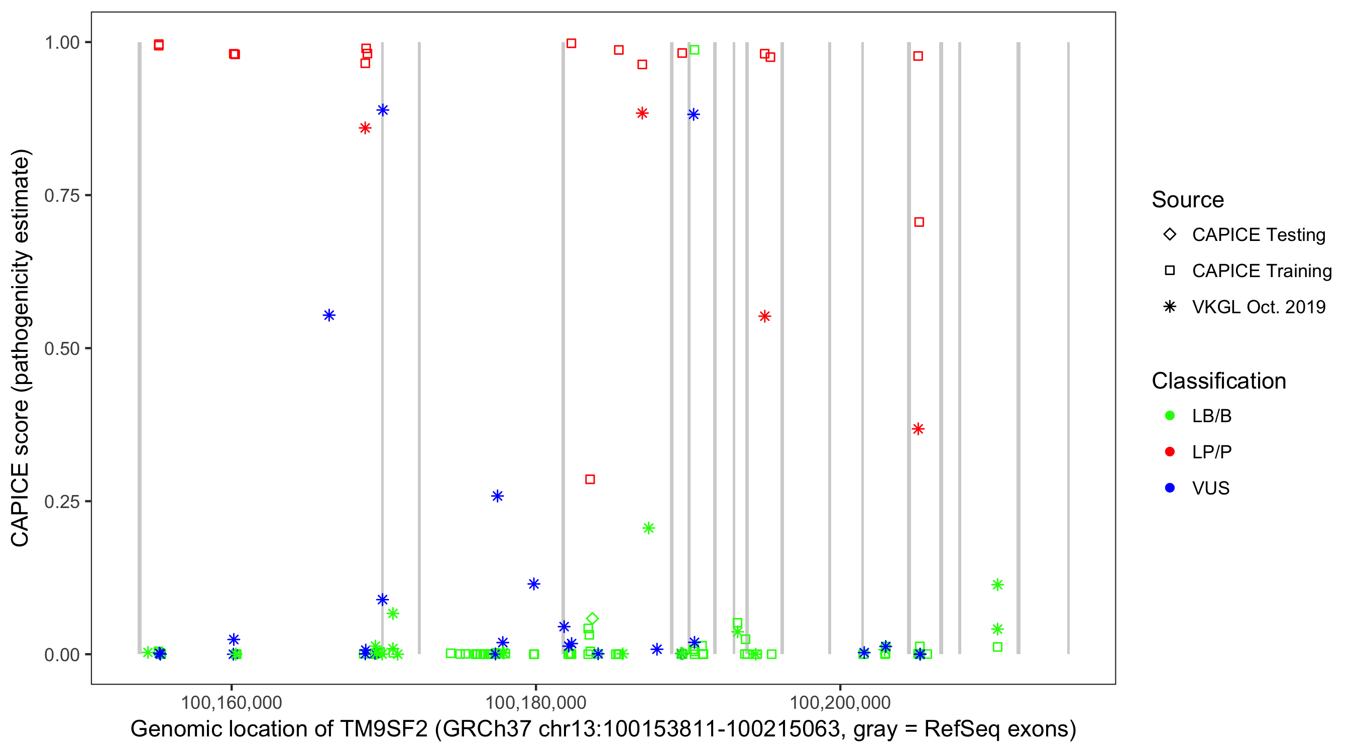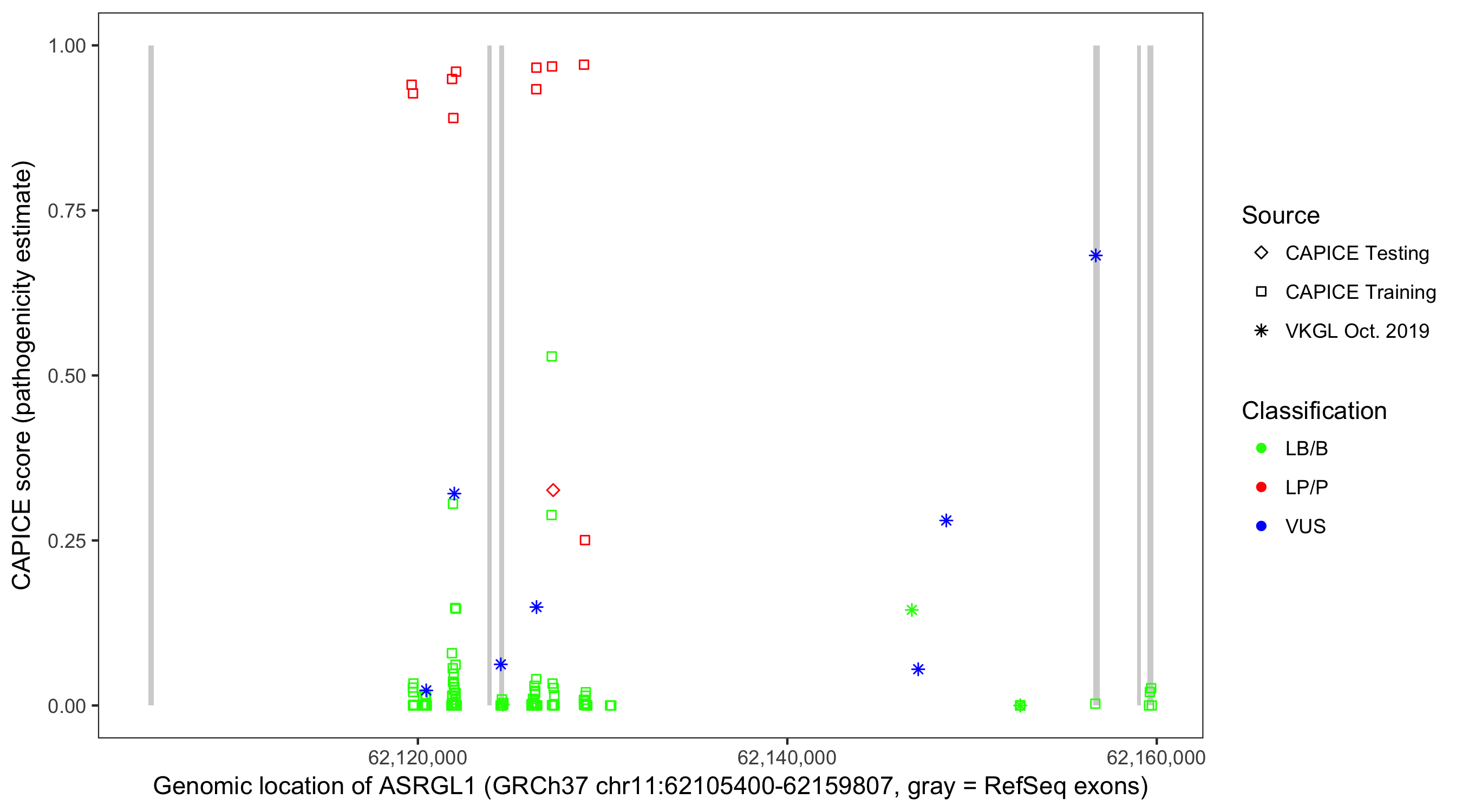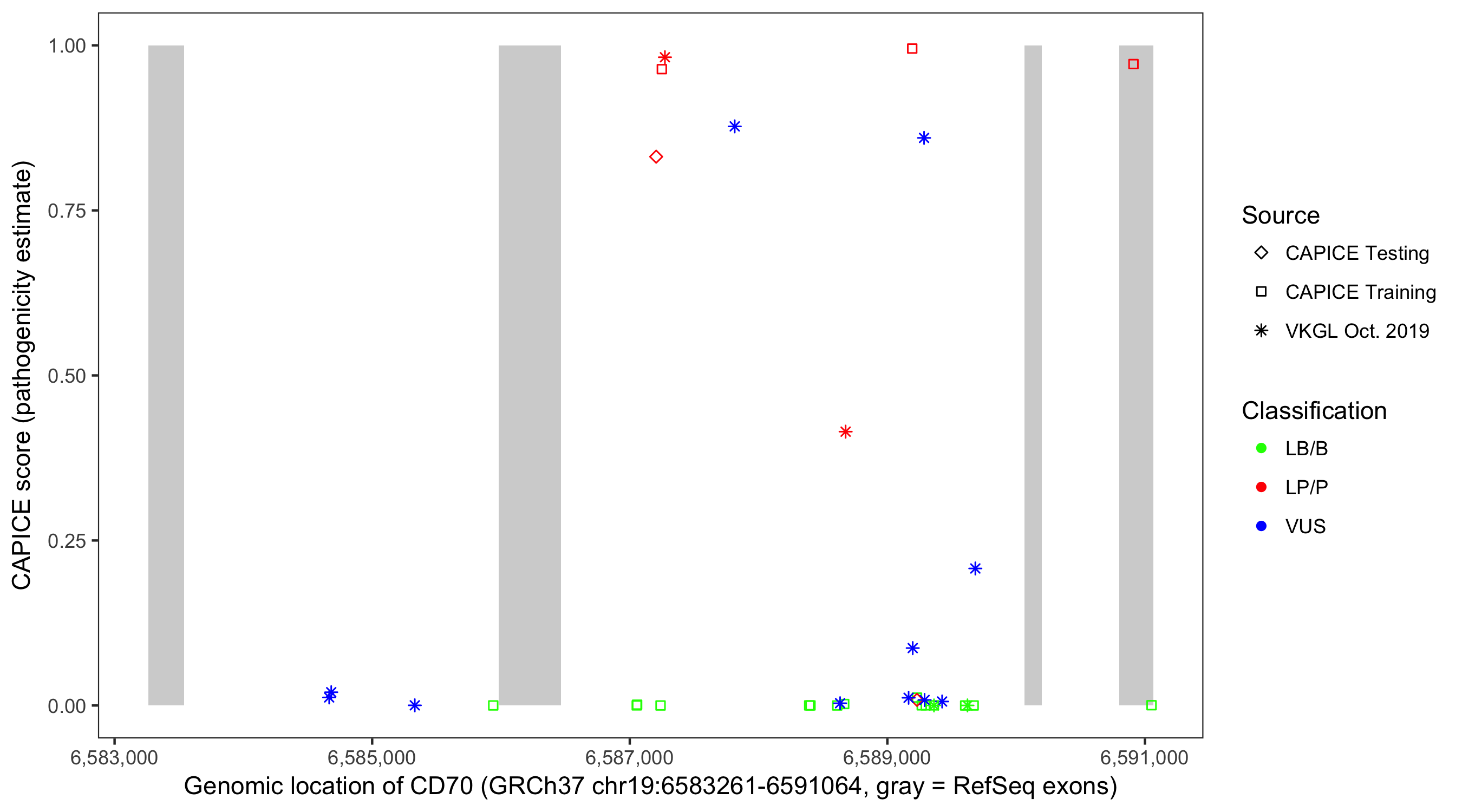Shown are CAPICE train/test variants plus VKGL Oct 2019.