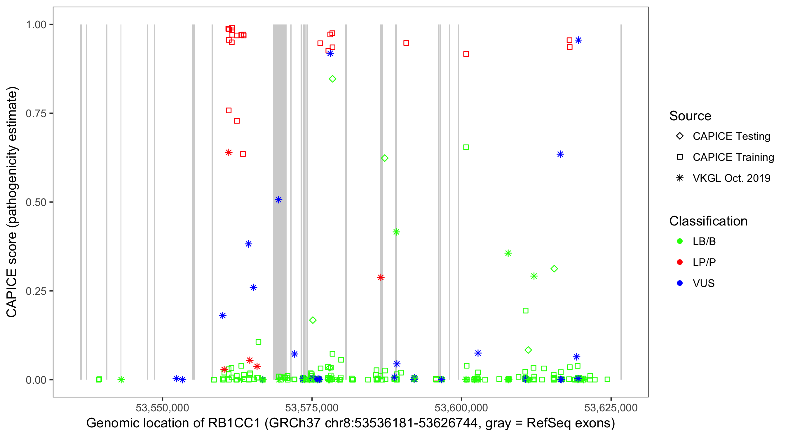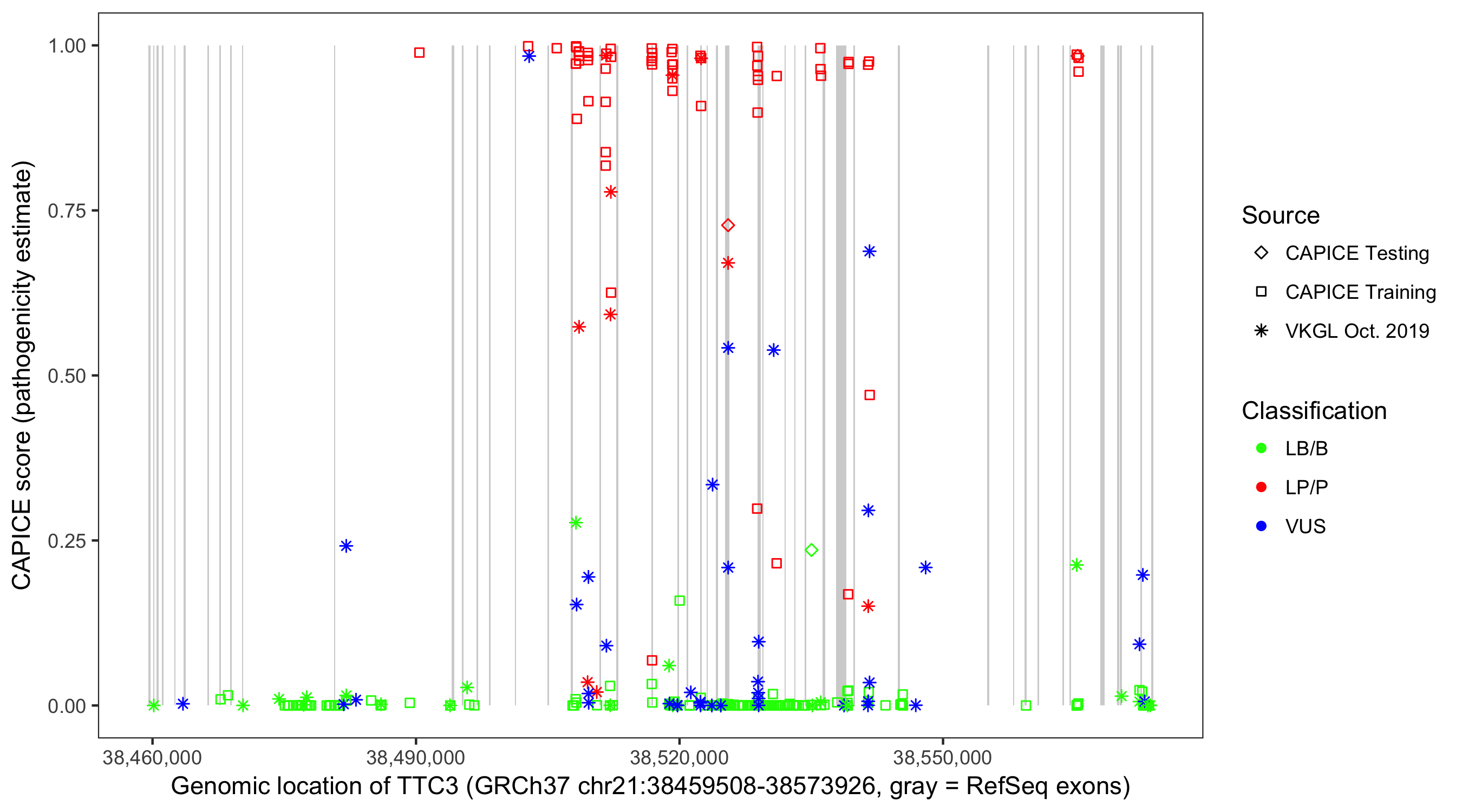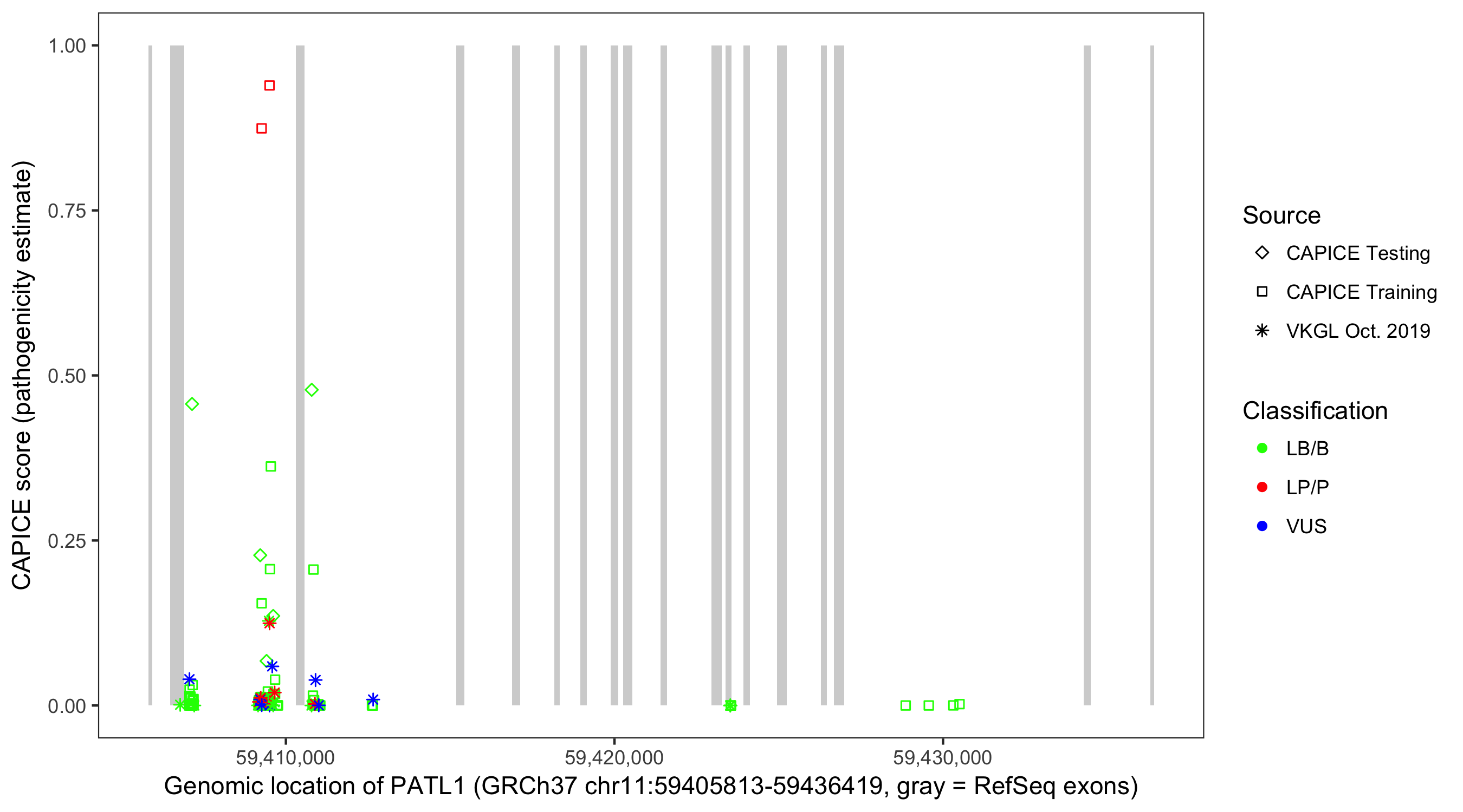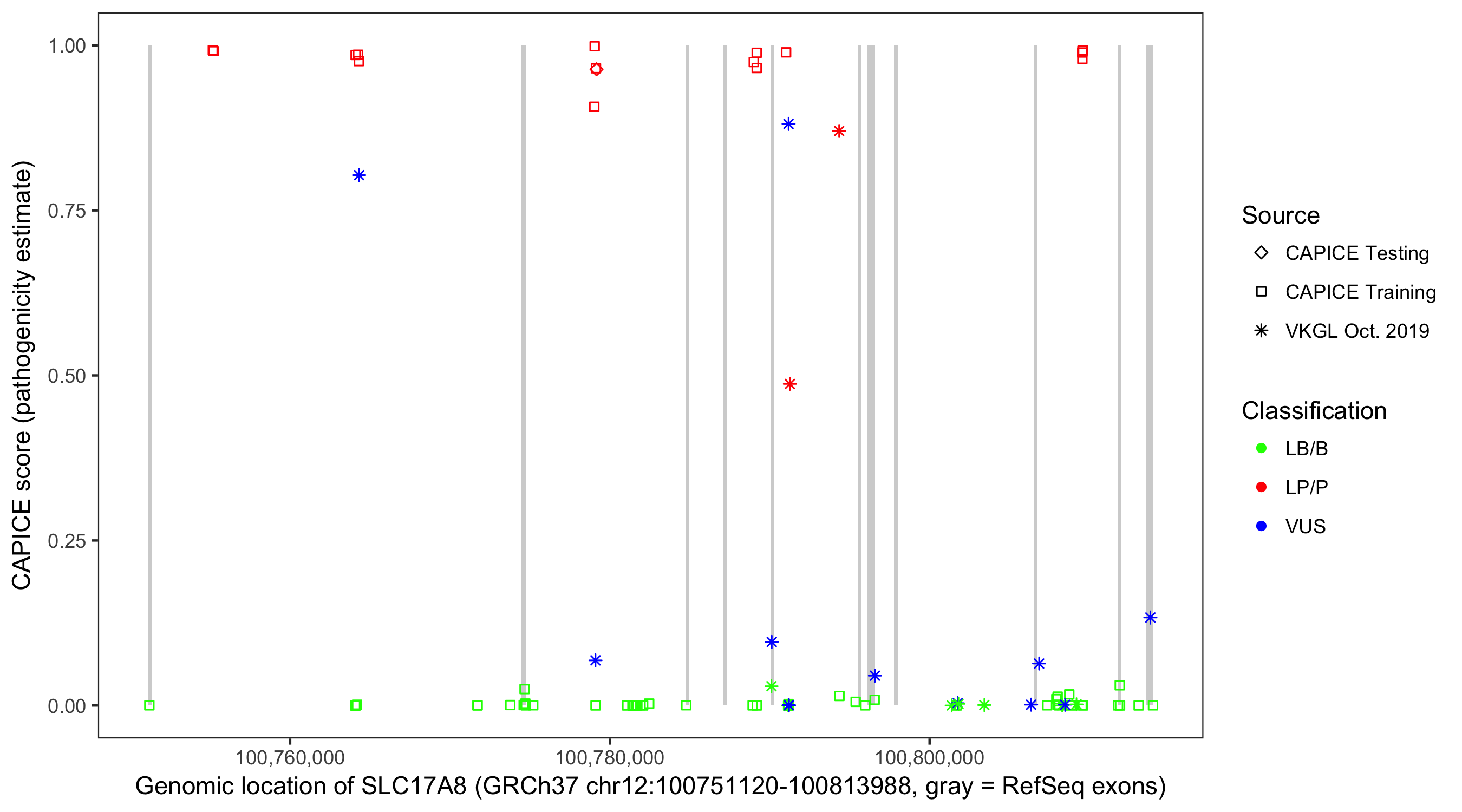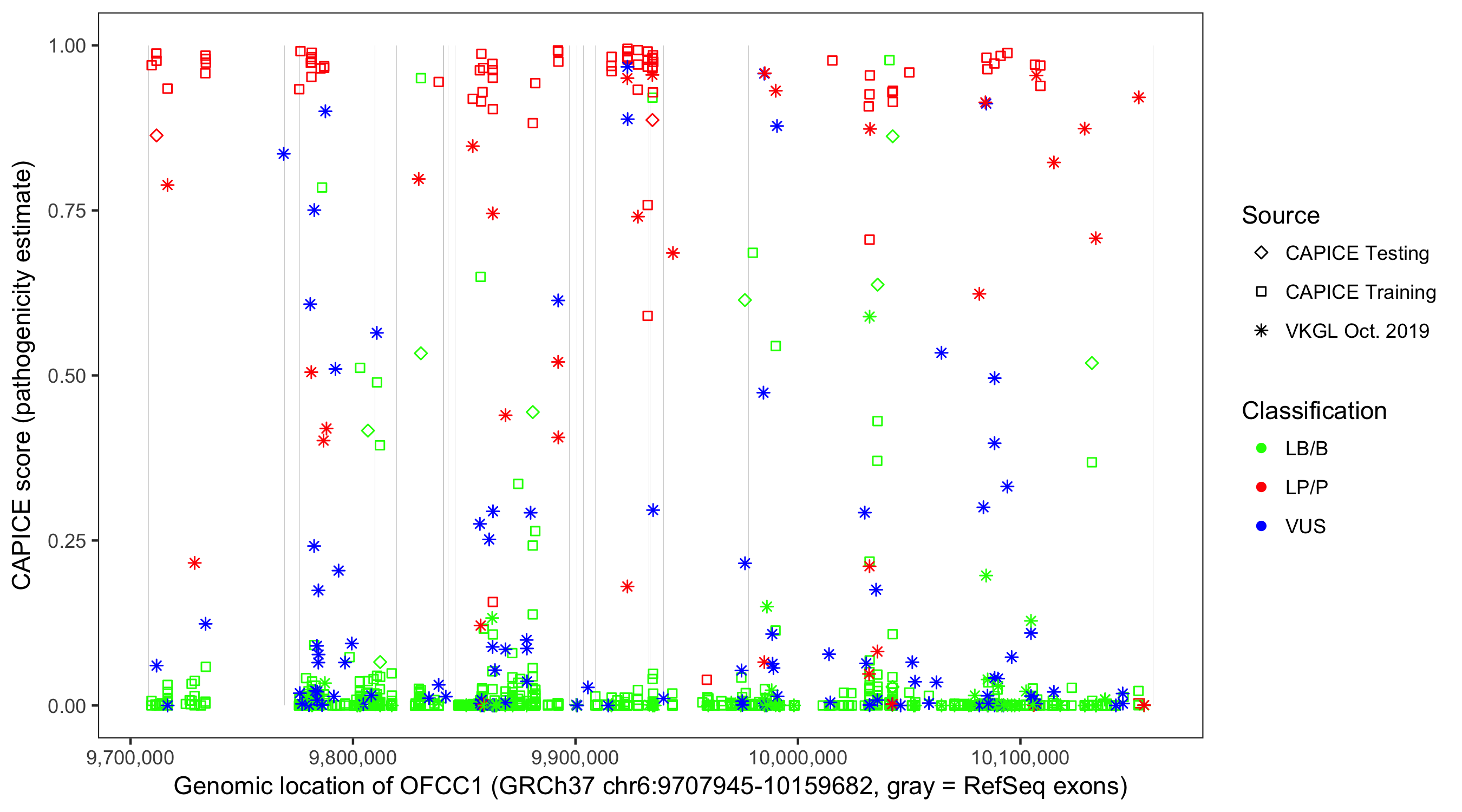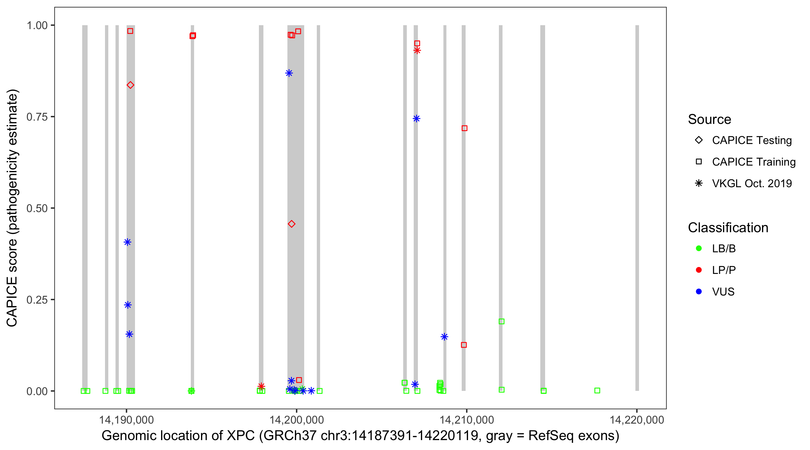 Shown are CAPICE train/test variants plus VKGL Oct 2019.
