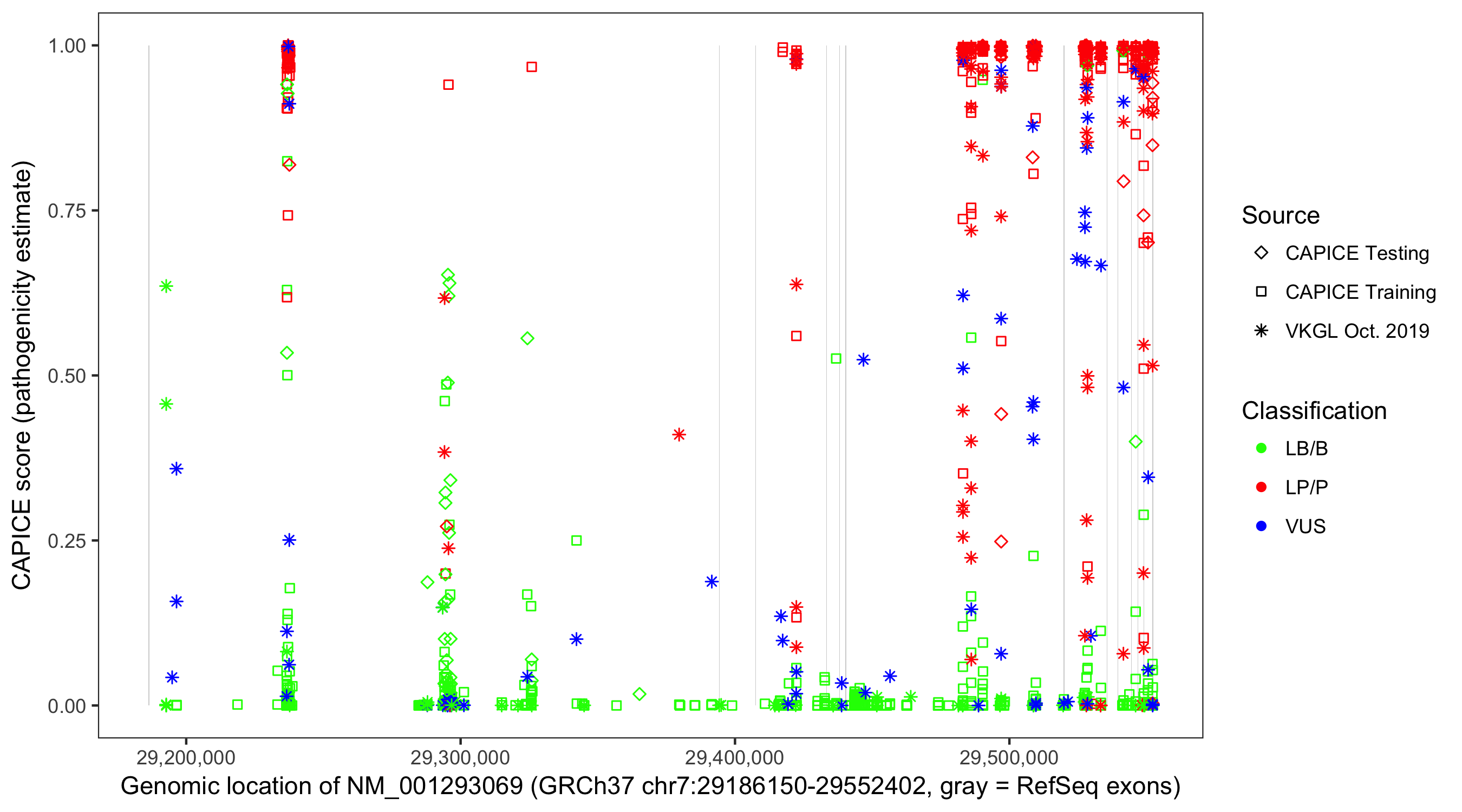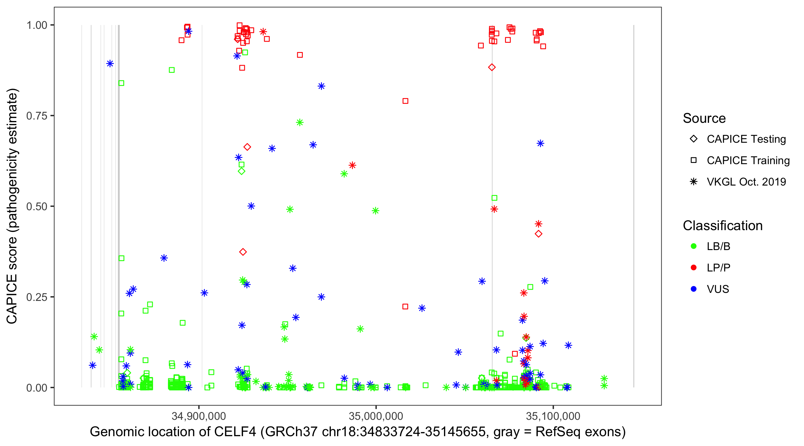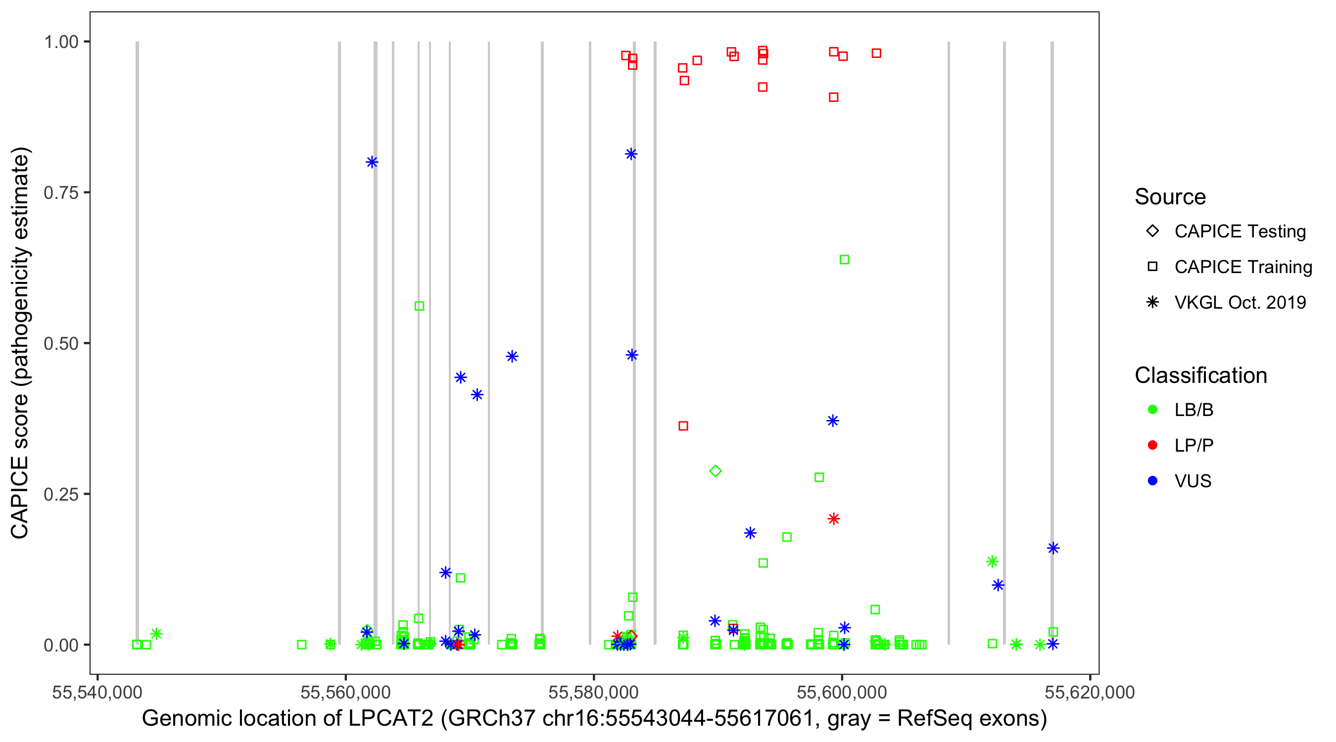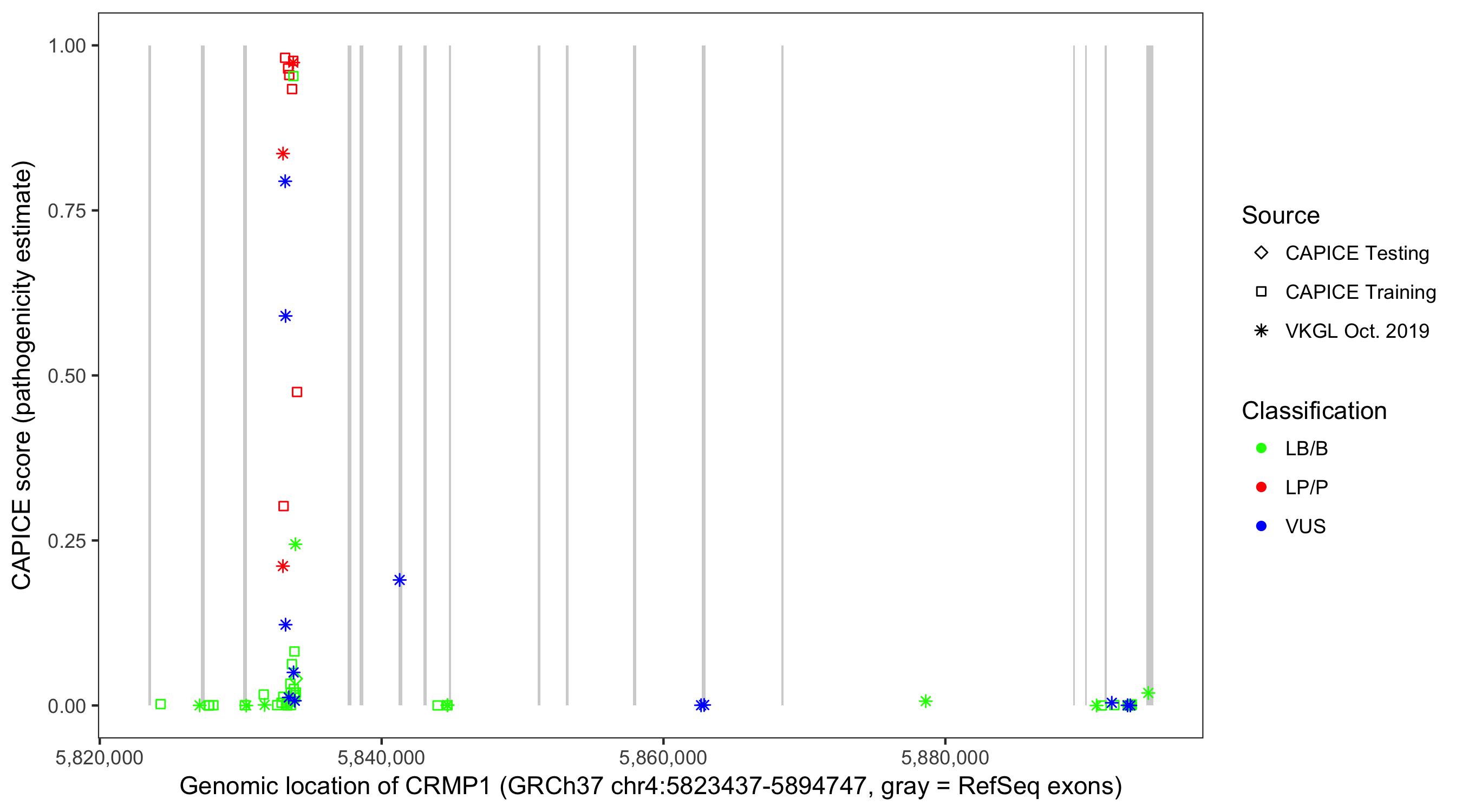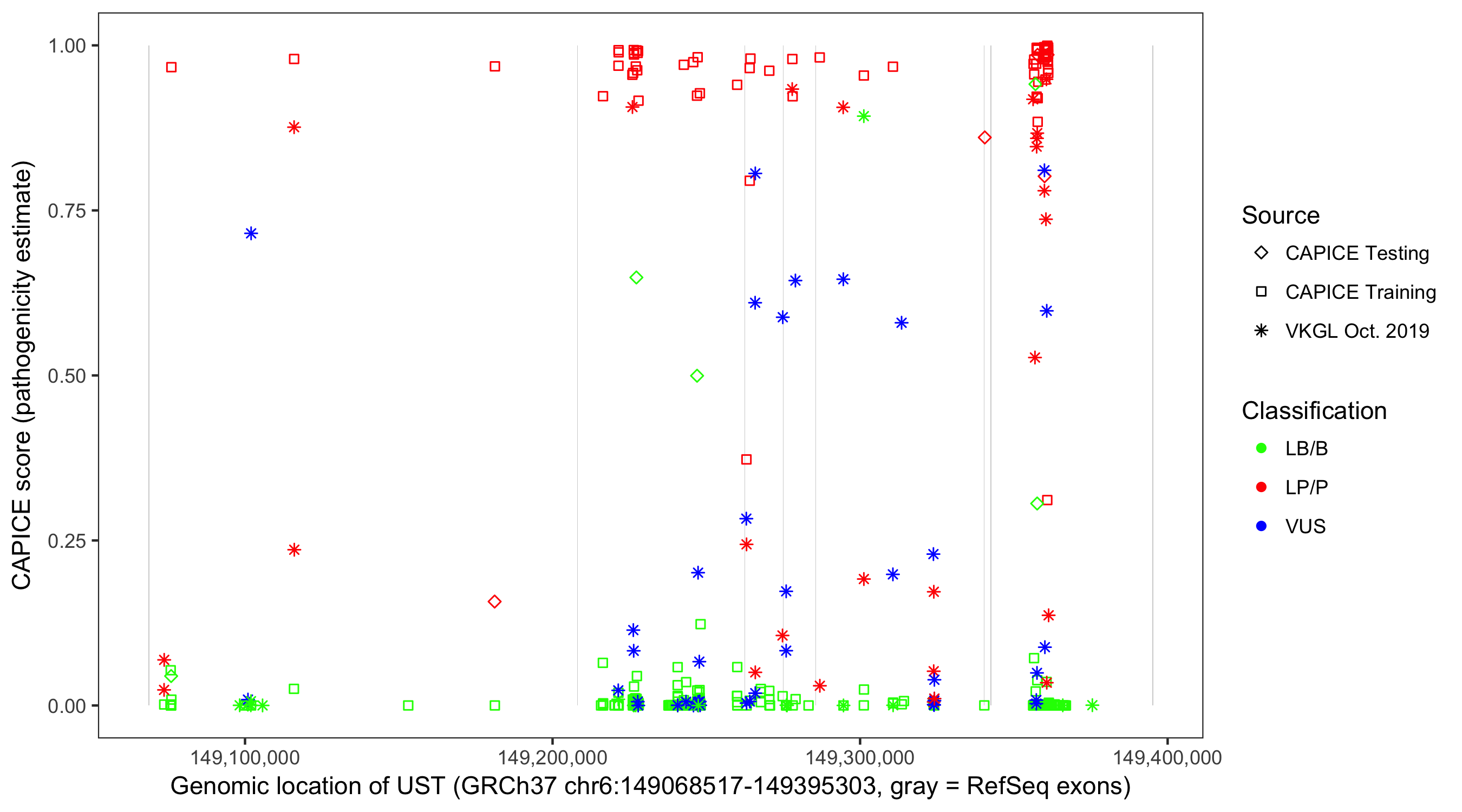 Shown are CAPICE train/test variants plus VKGL Oct 2019.