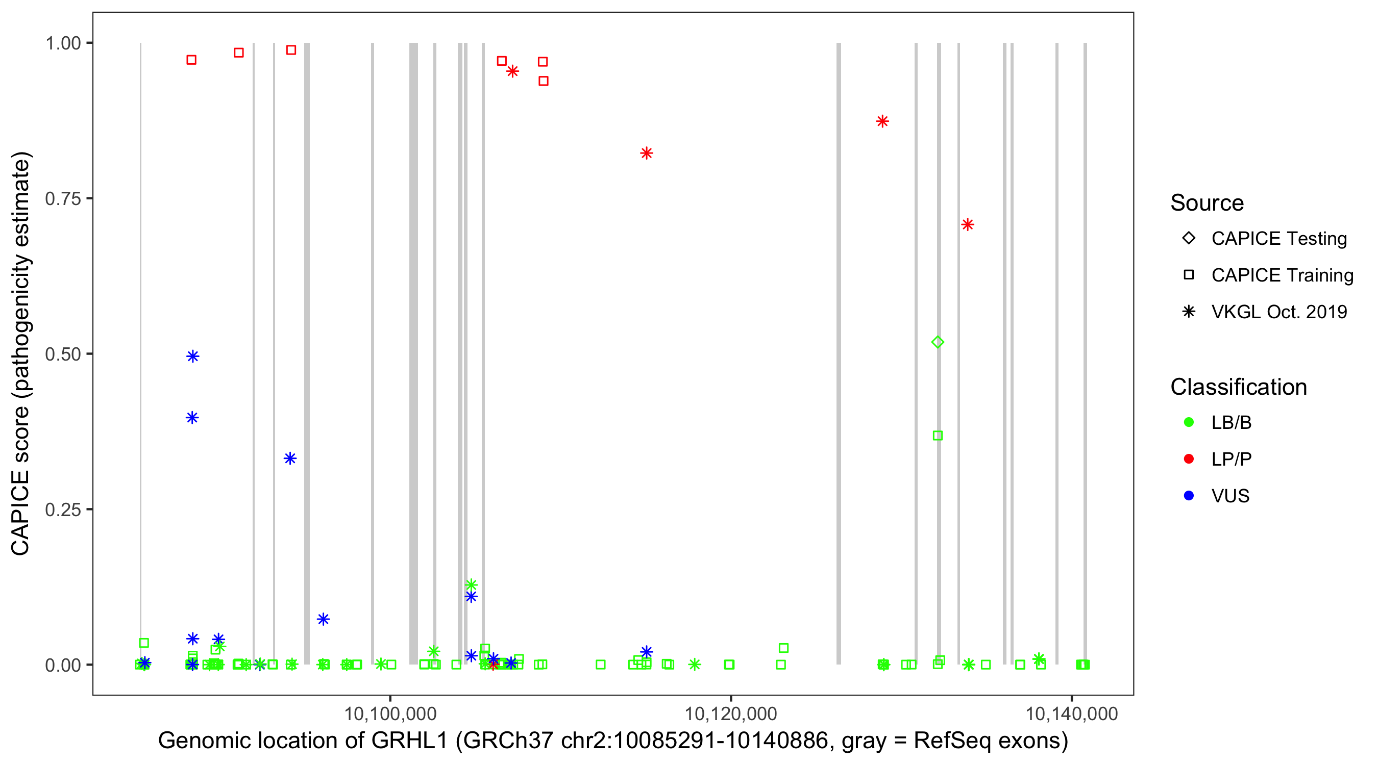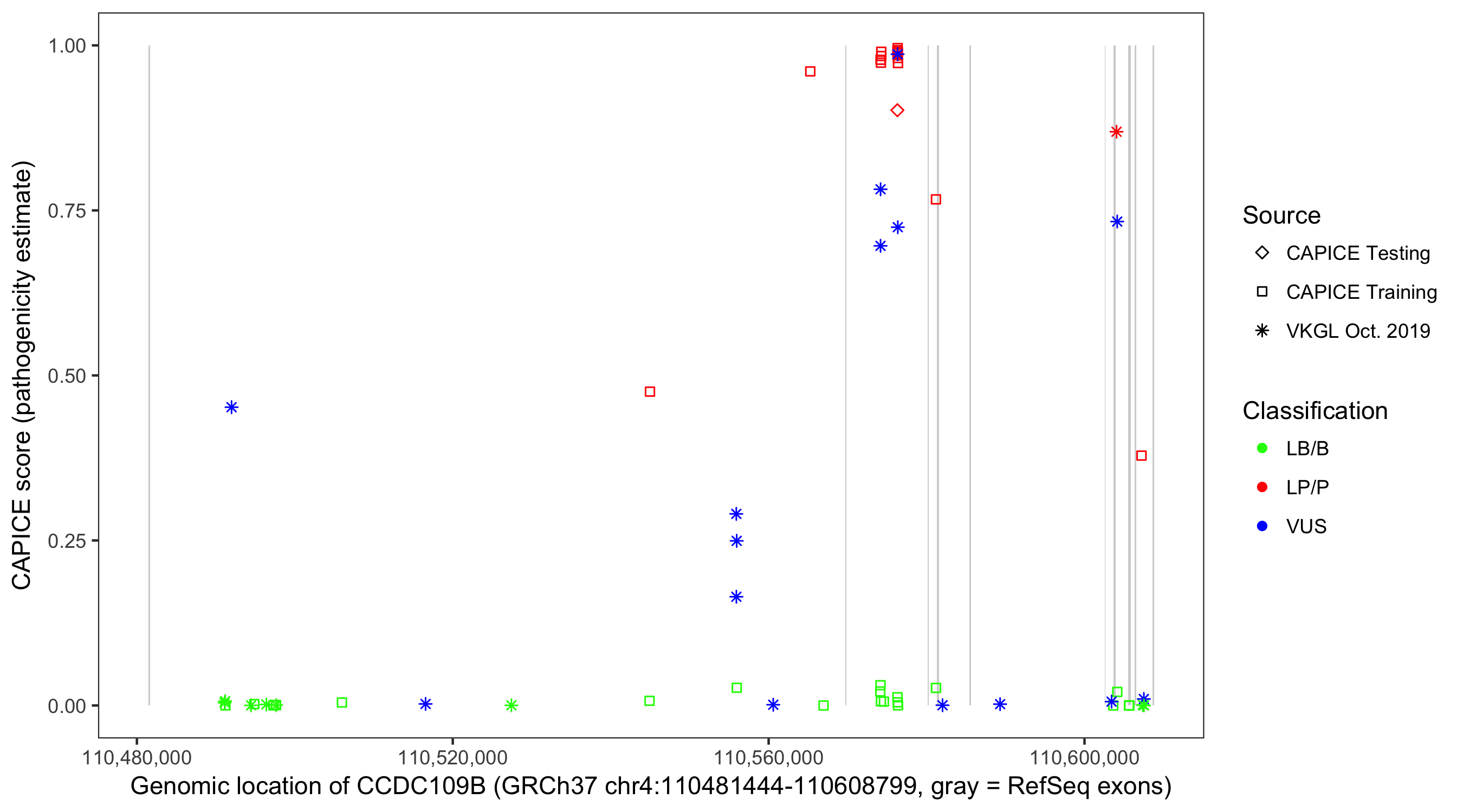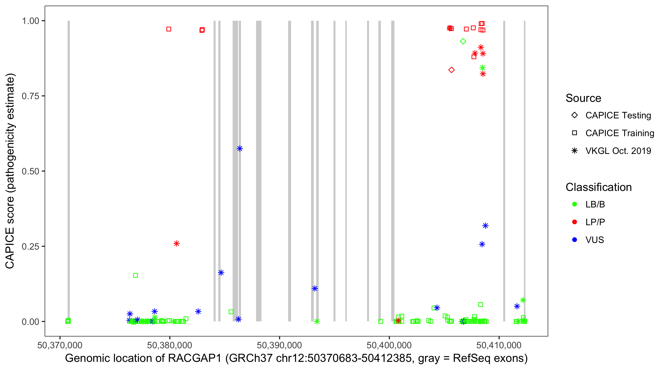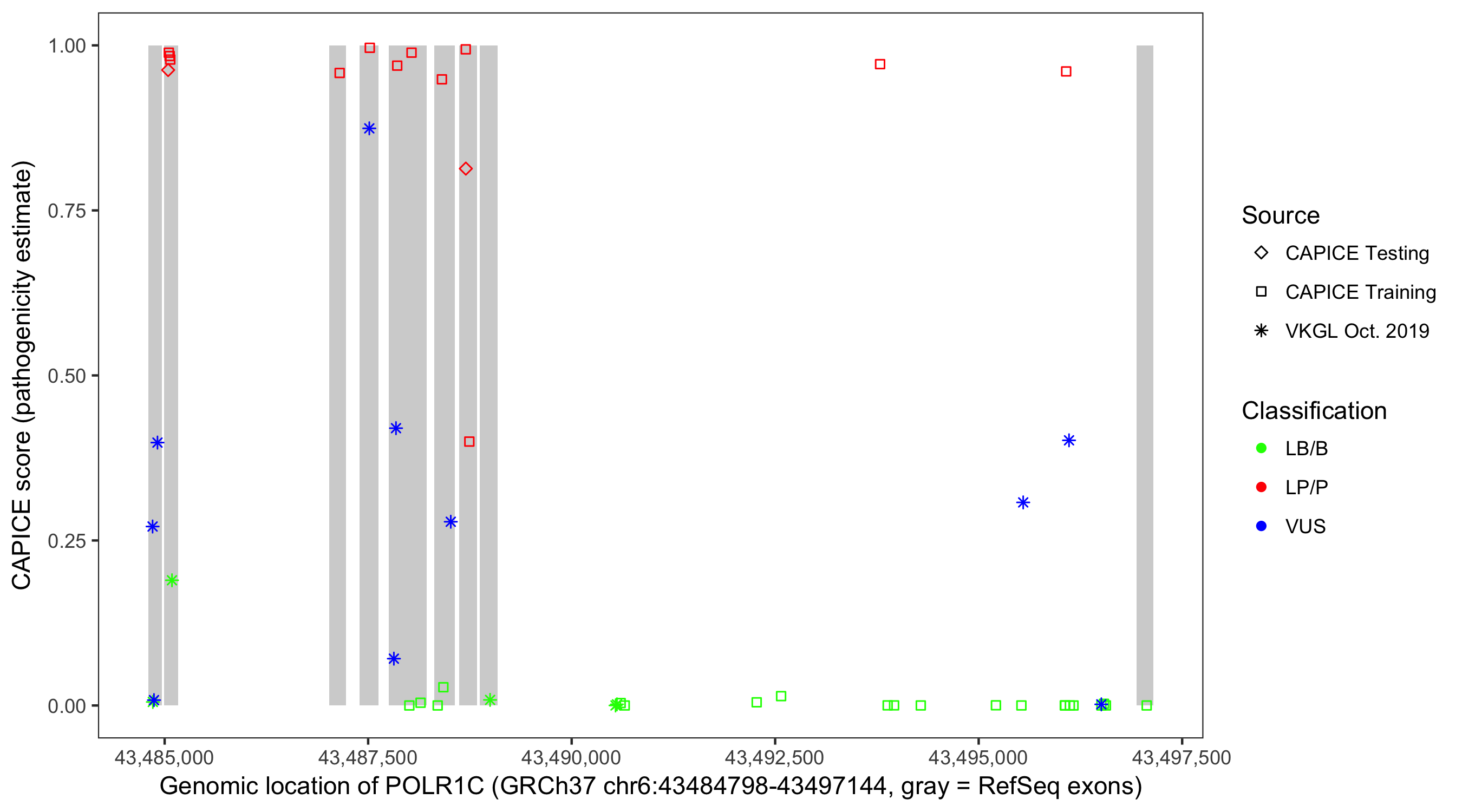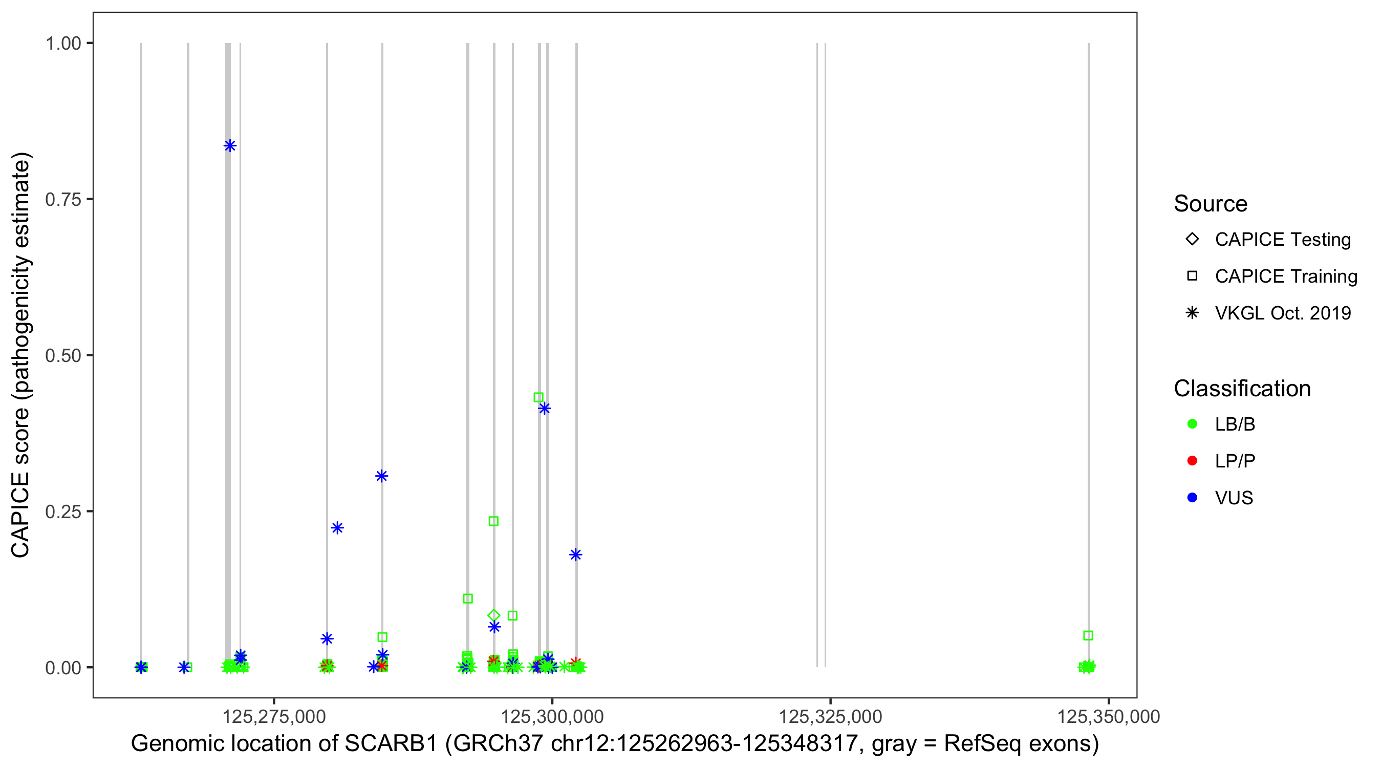 Shown are CAPICE train/test variants plus VKGL Oct 2019.