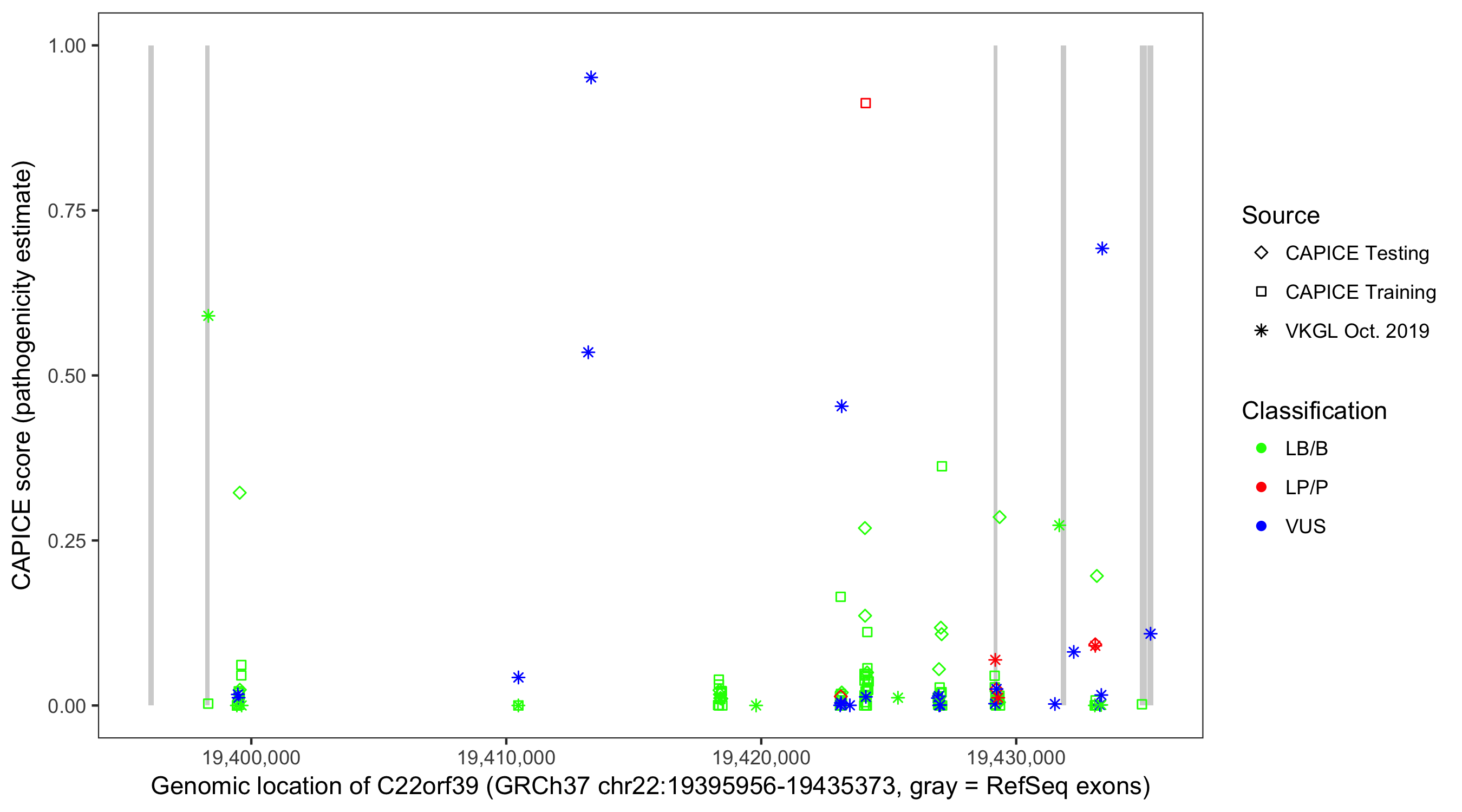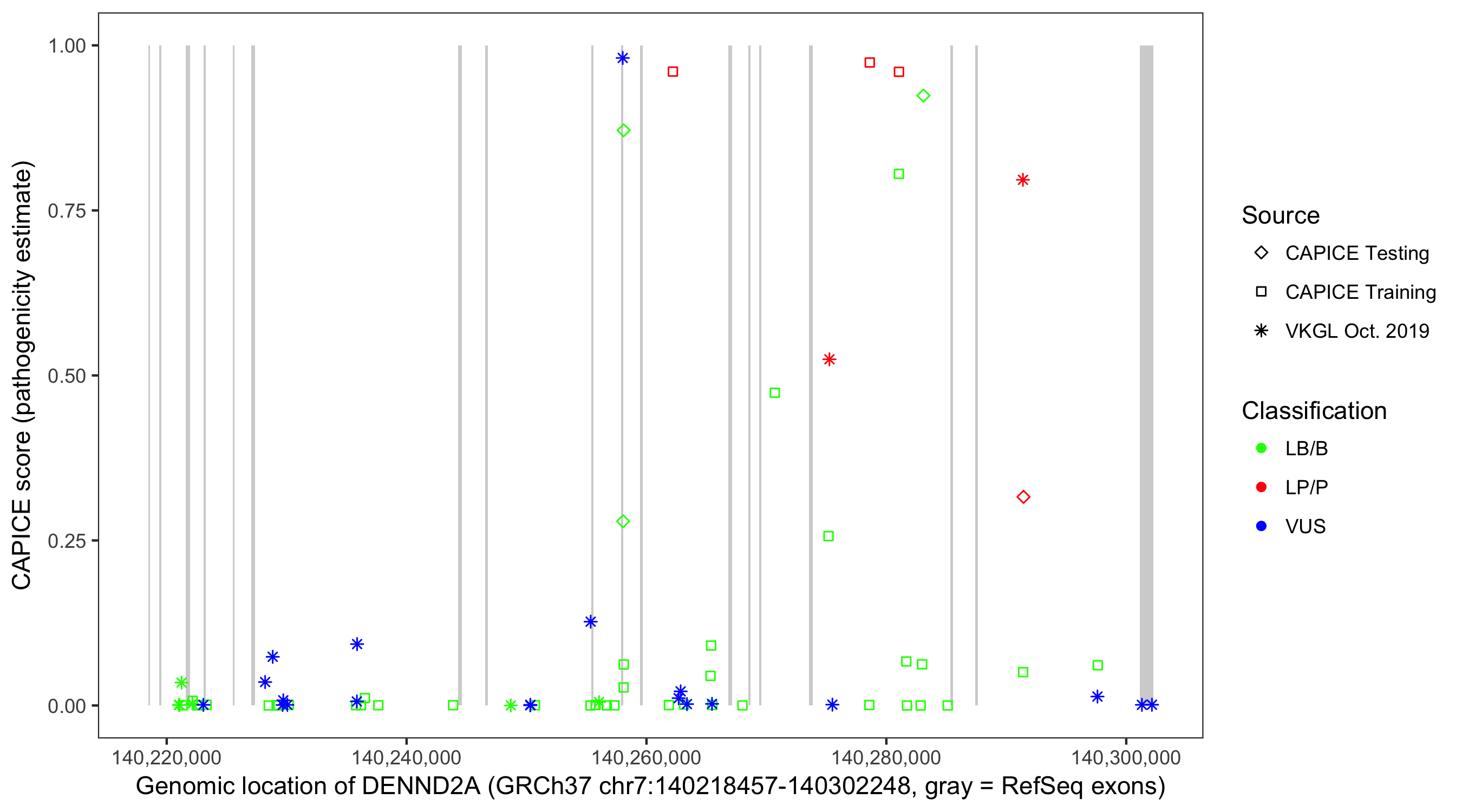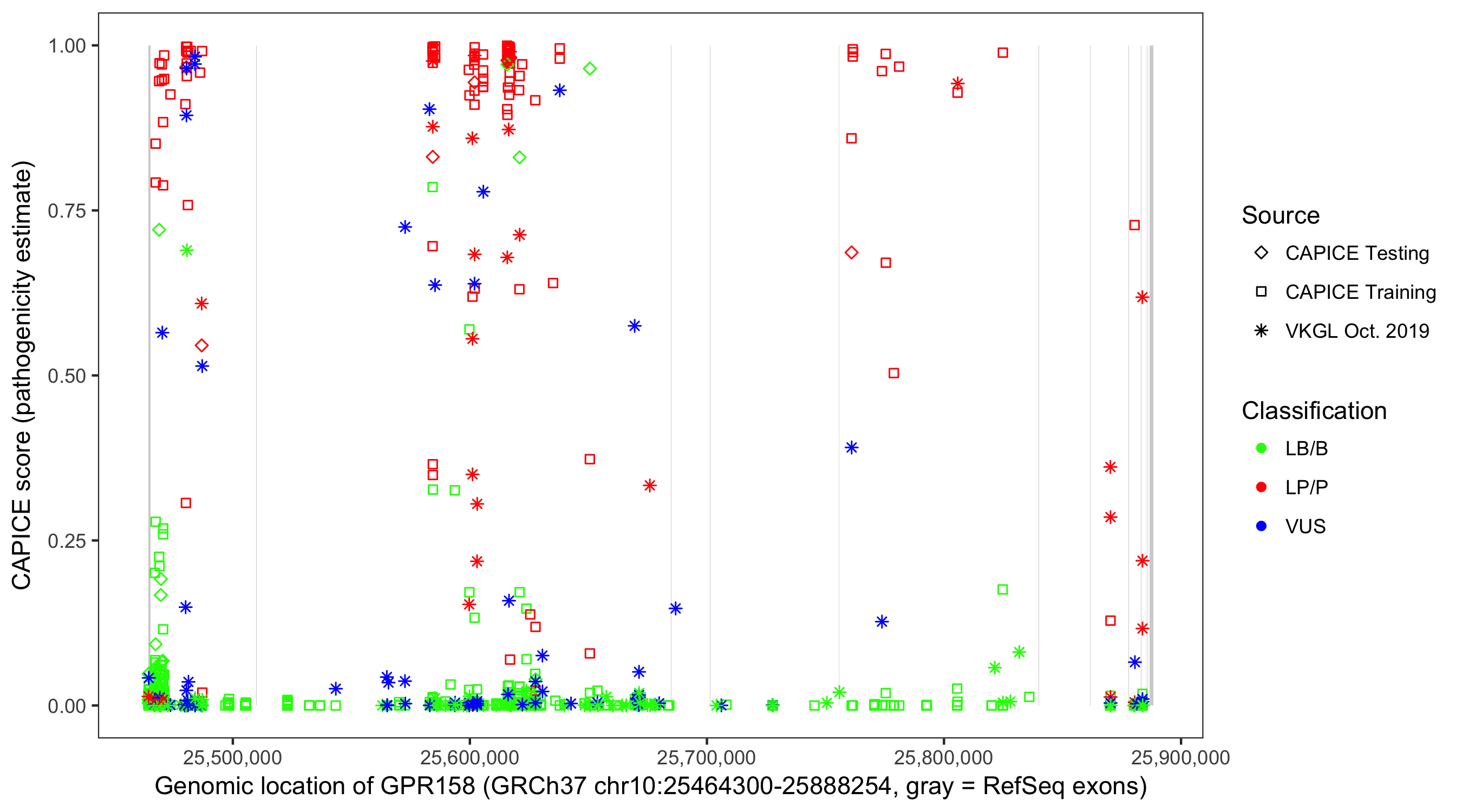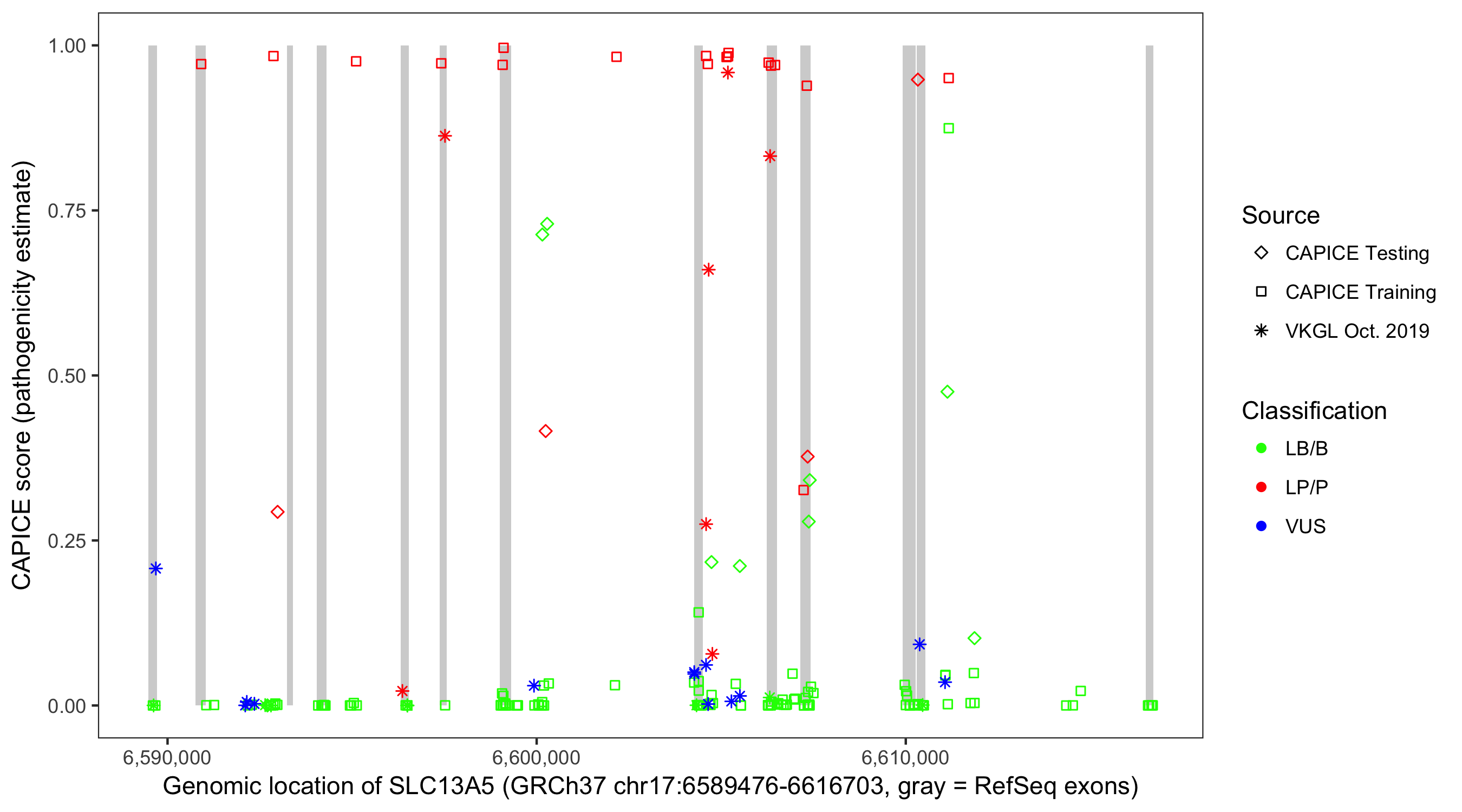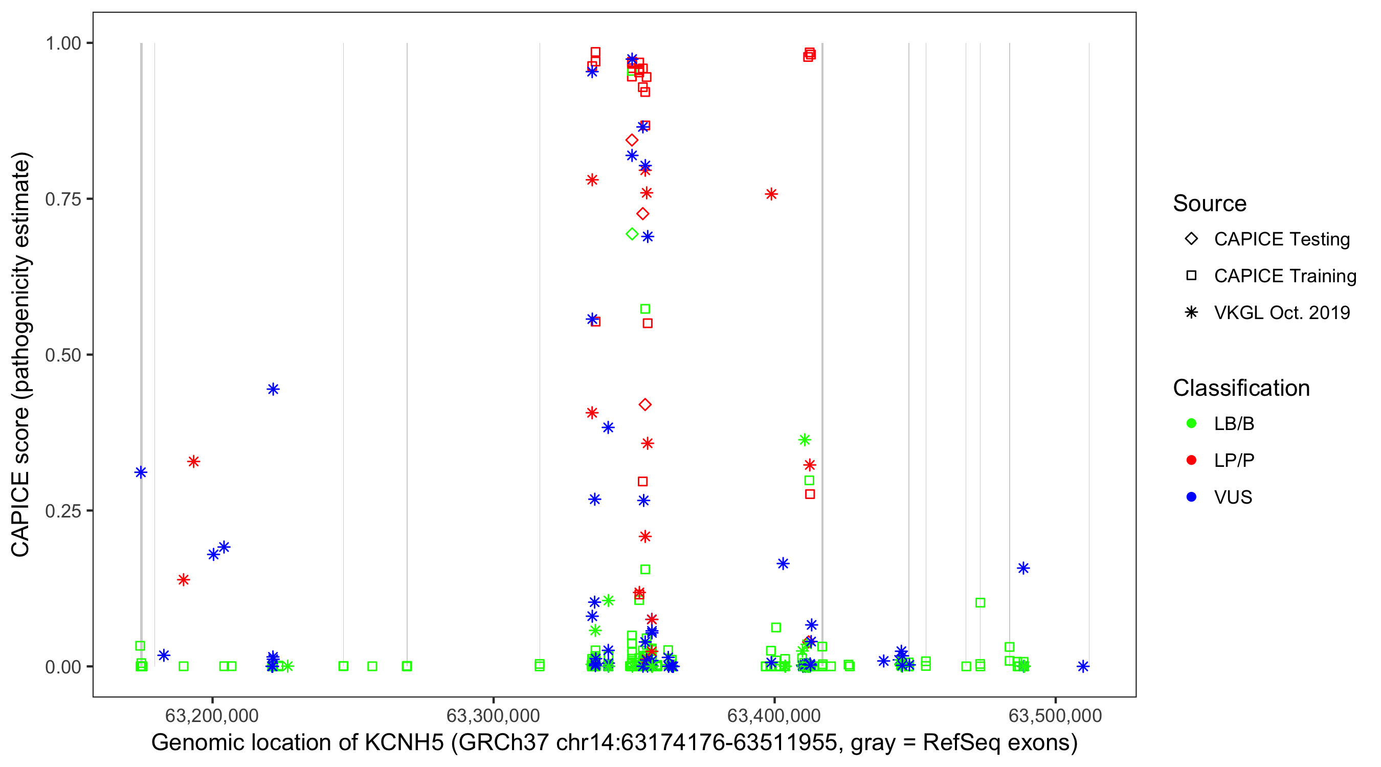 Shown are CAPICE train/test variants plus VKGL Oct 2019.
