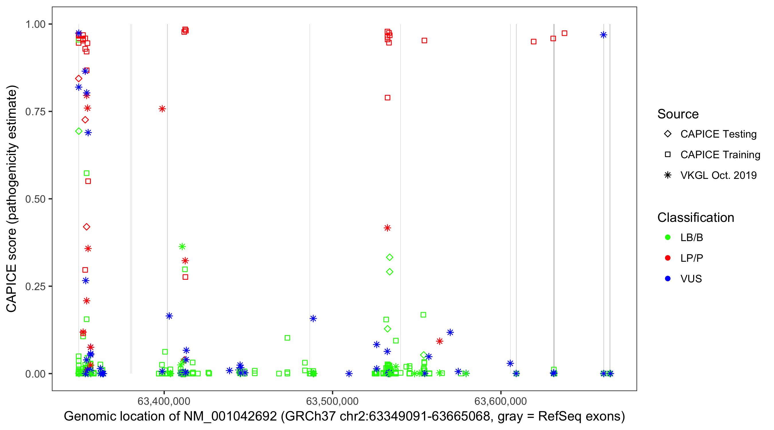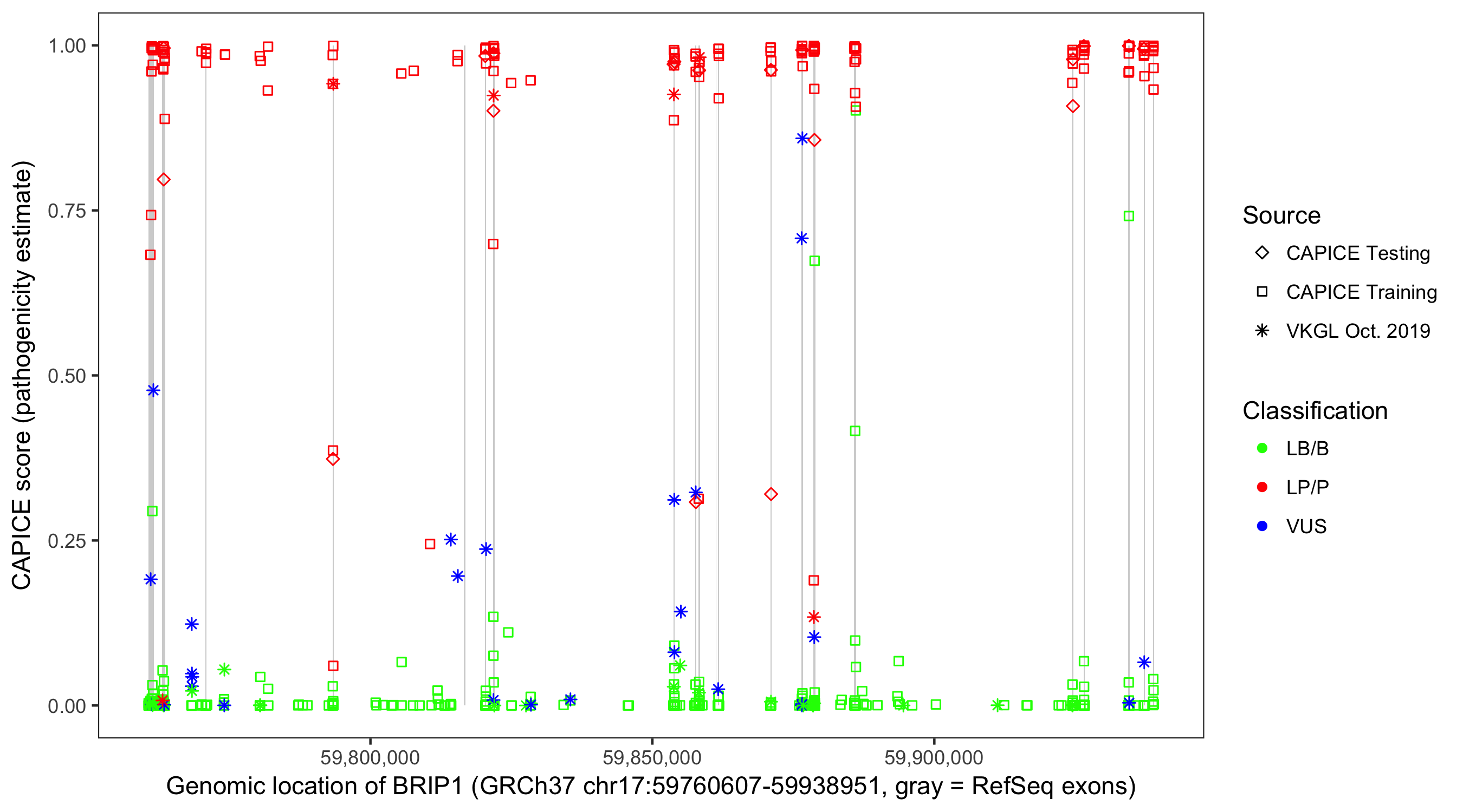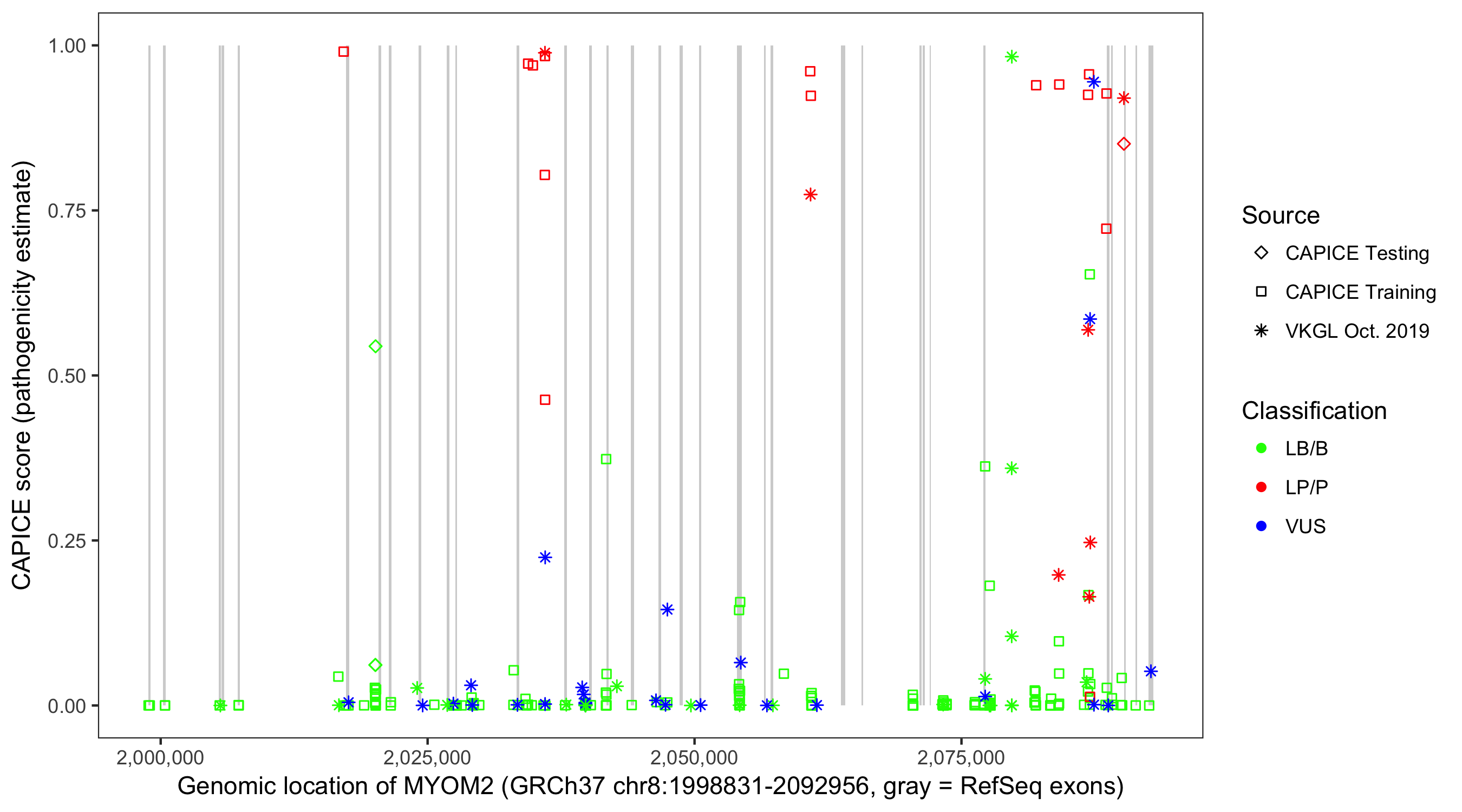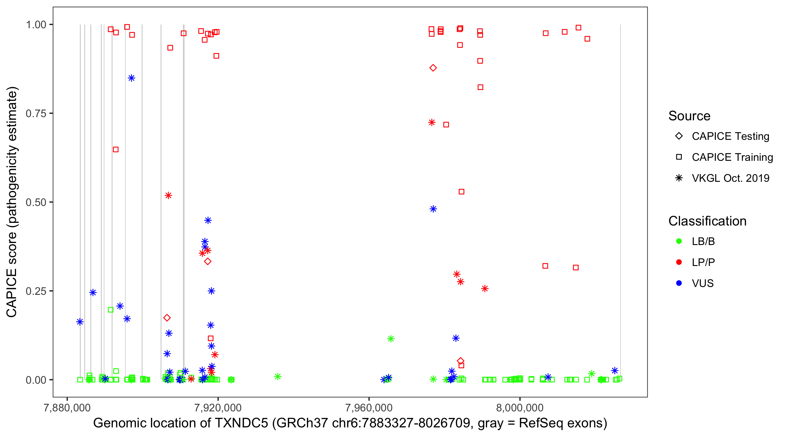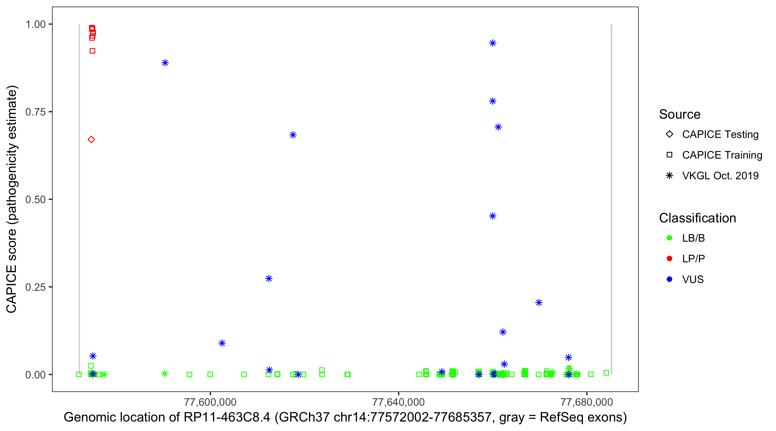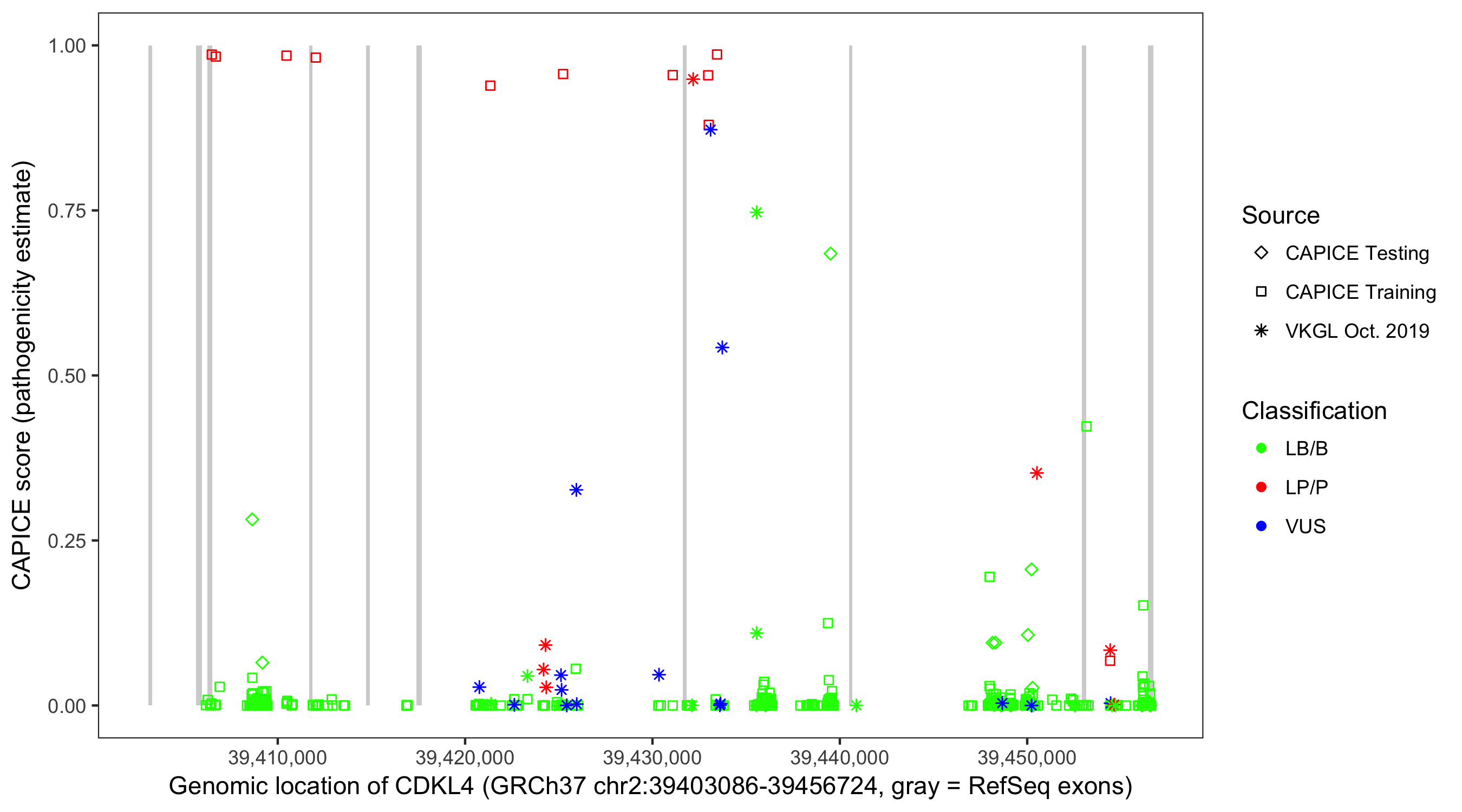 Shown are CAPICE train/test variants plus VKGL Oct 2019.