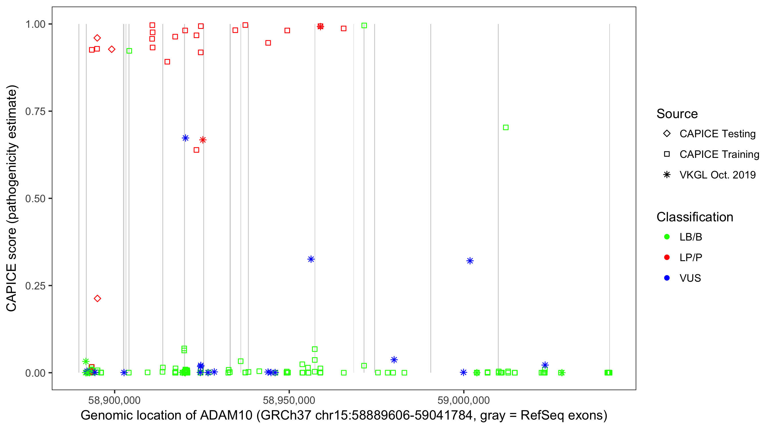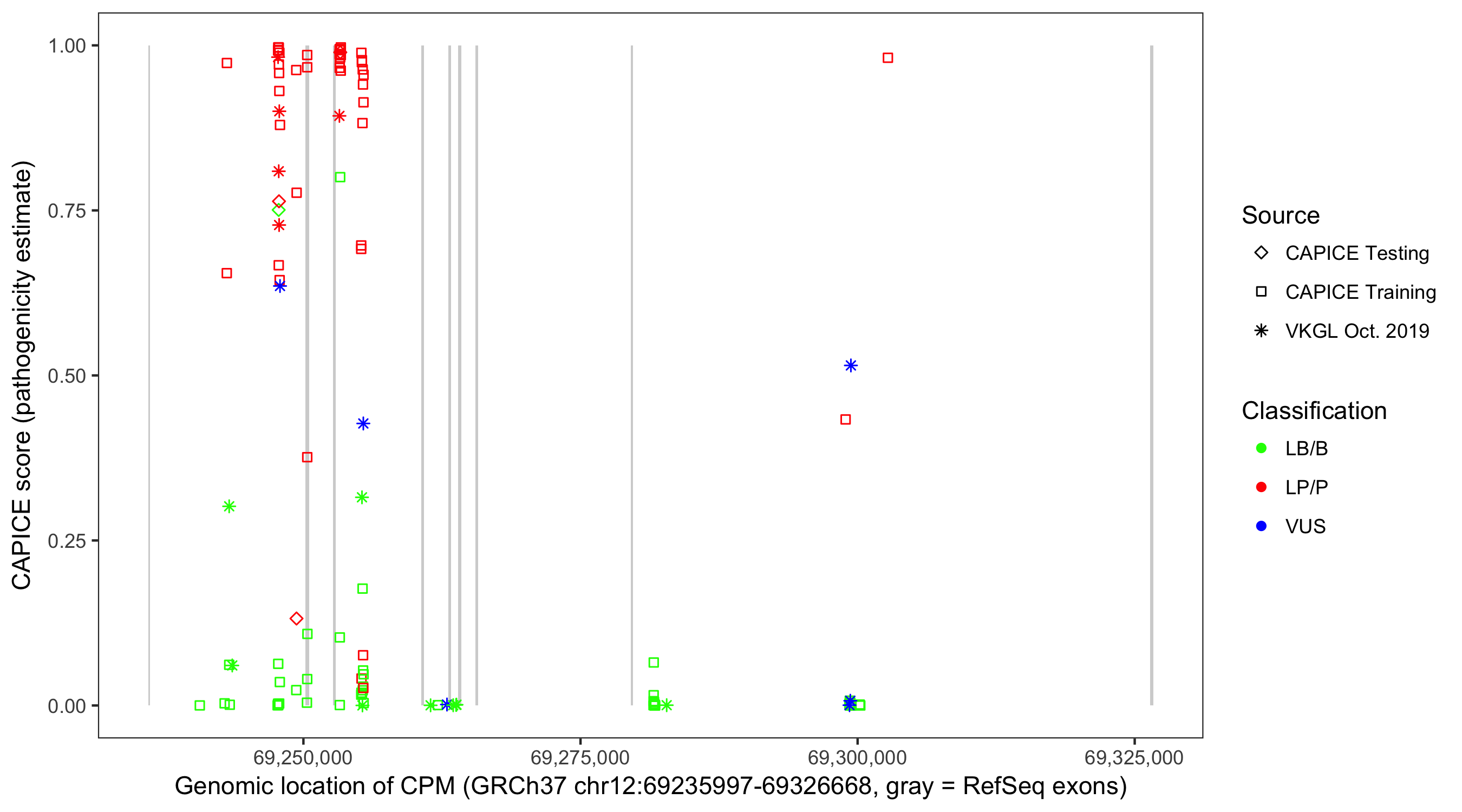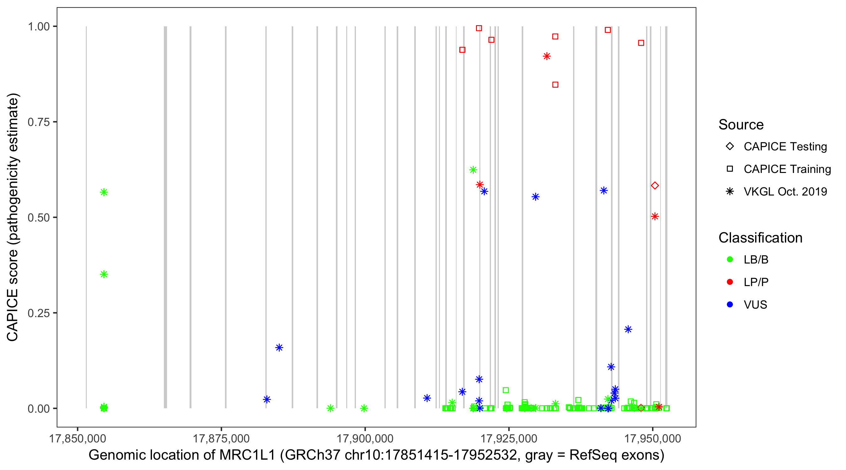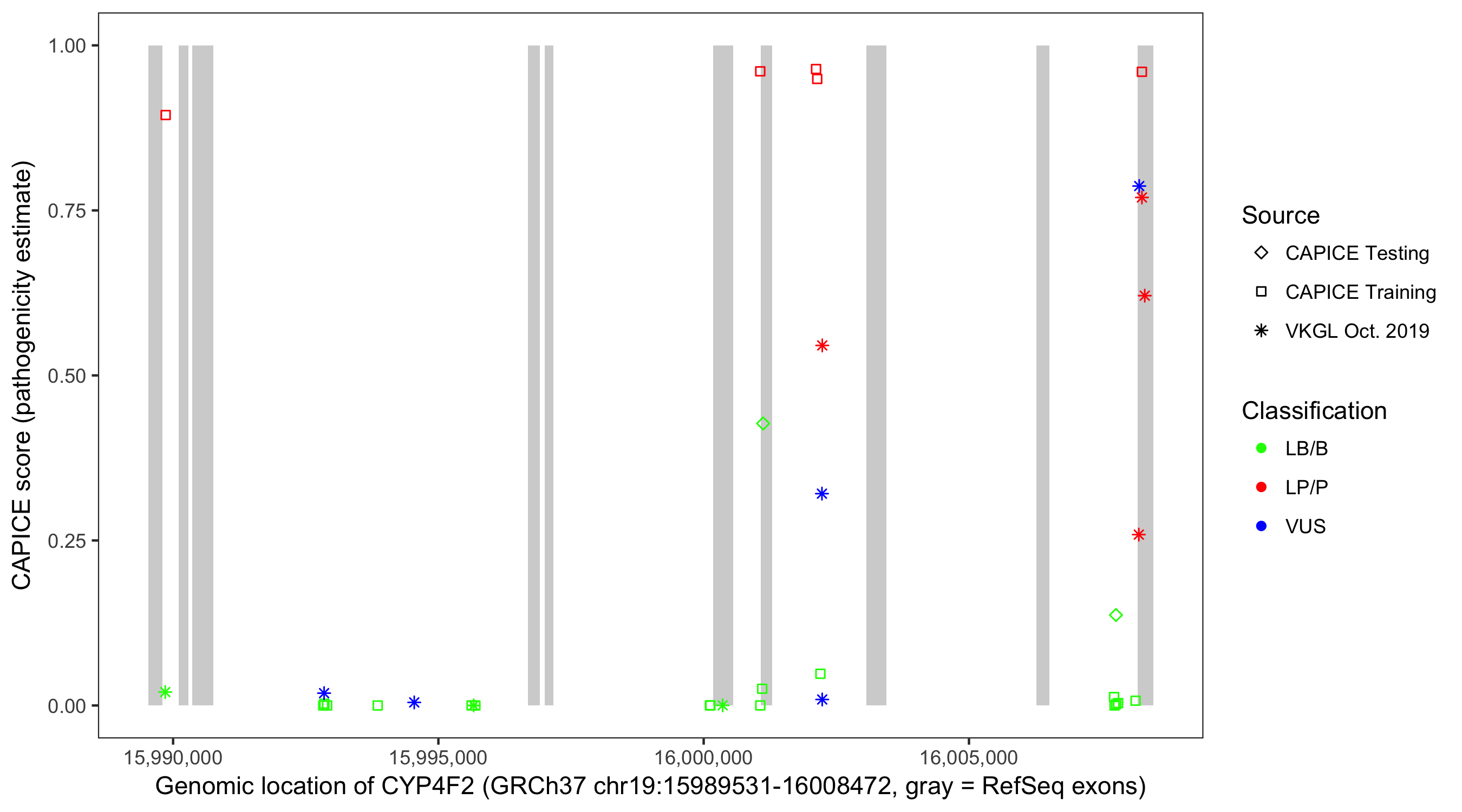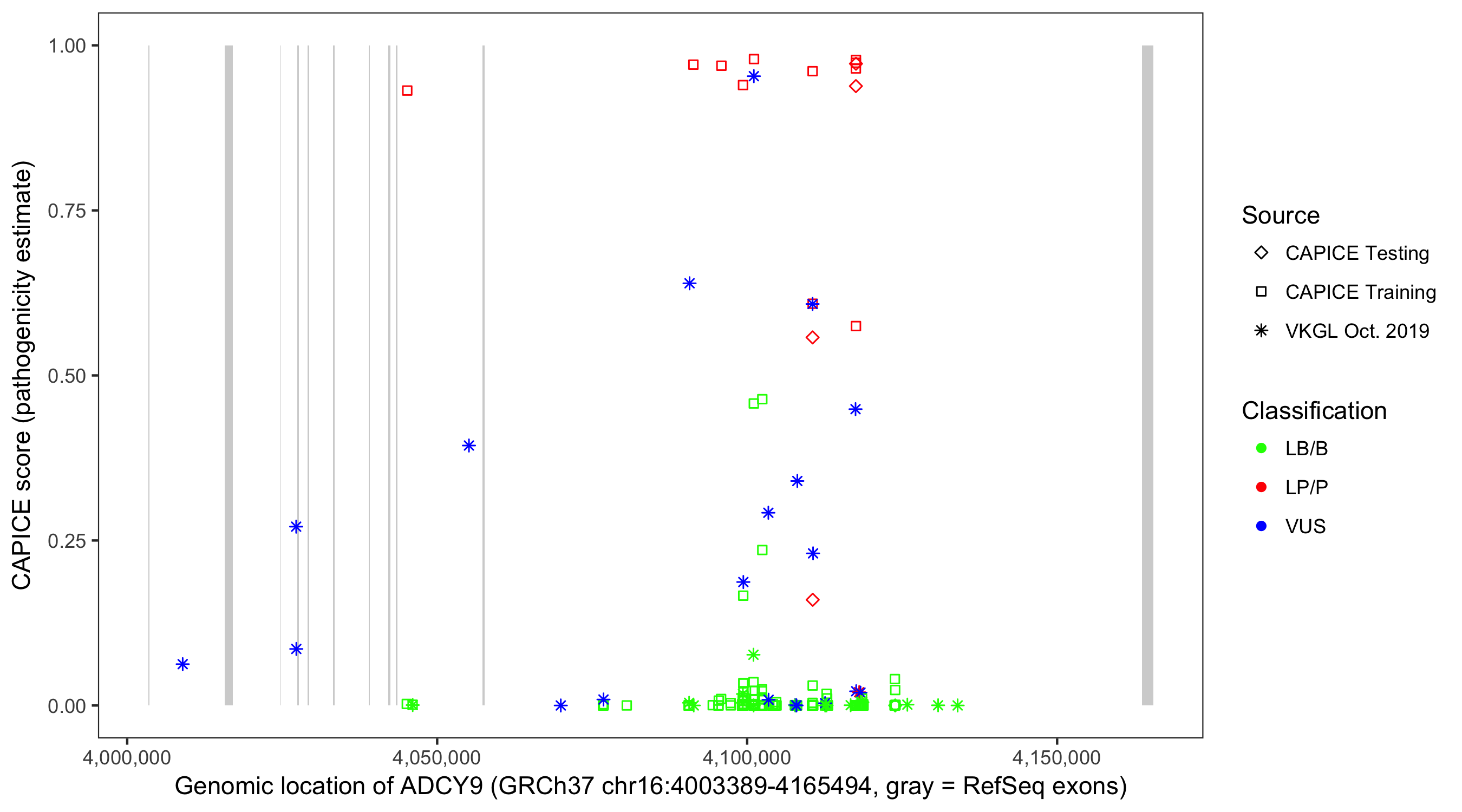 Shown are CAPICE train/test variants plus VKGL Oct 2019.