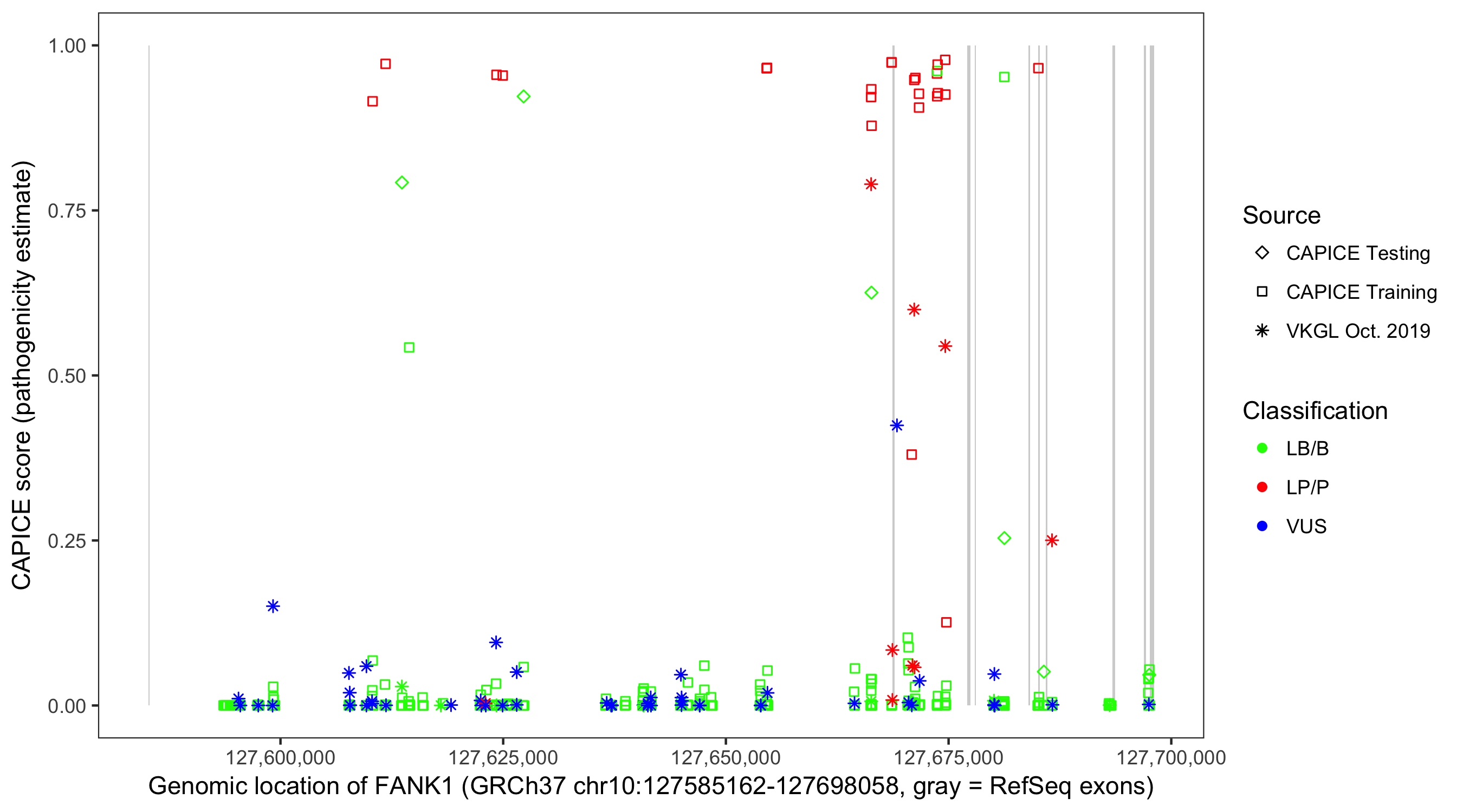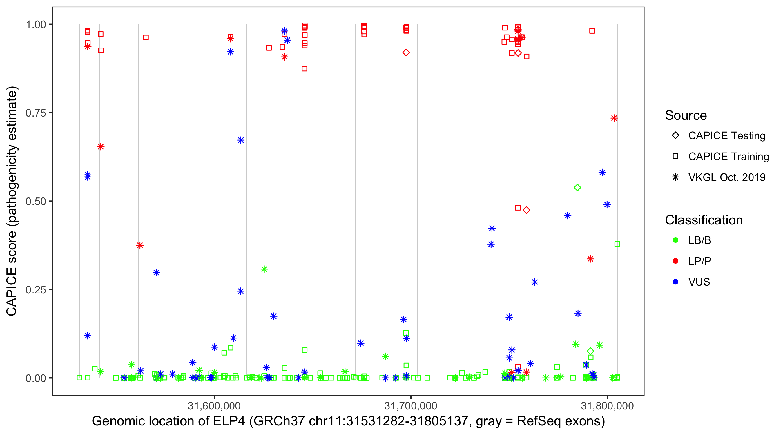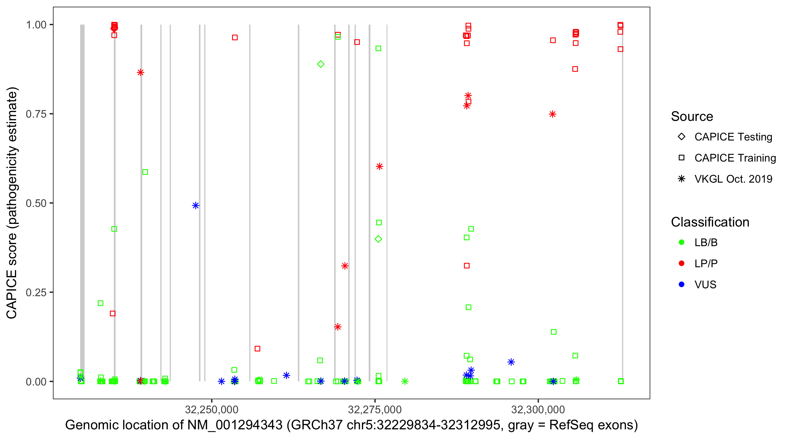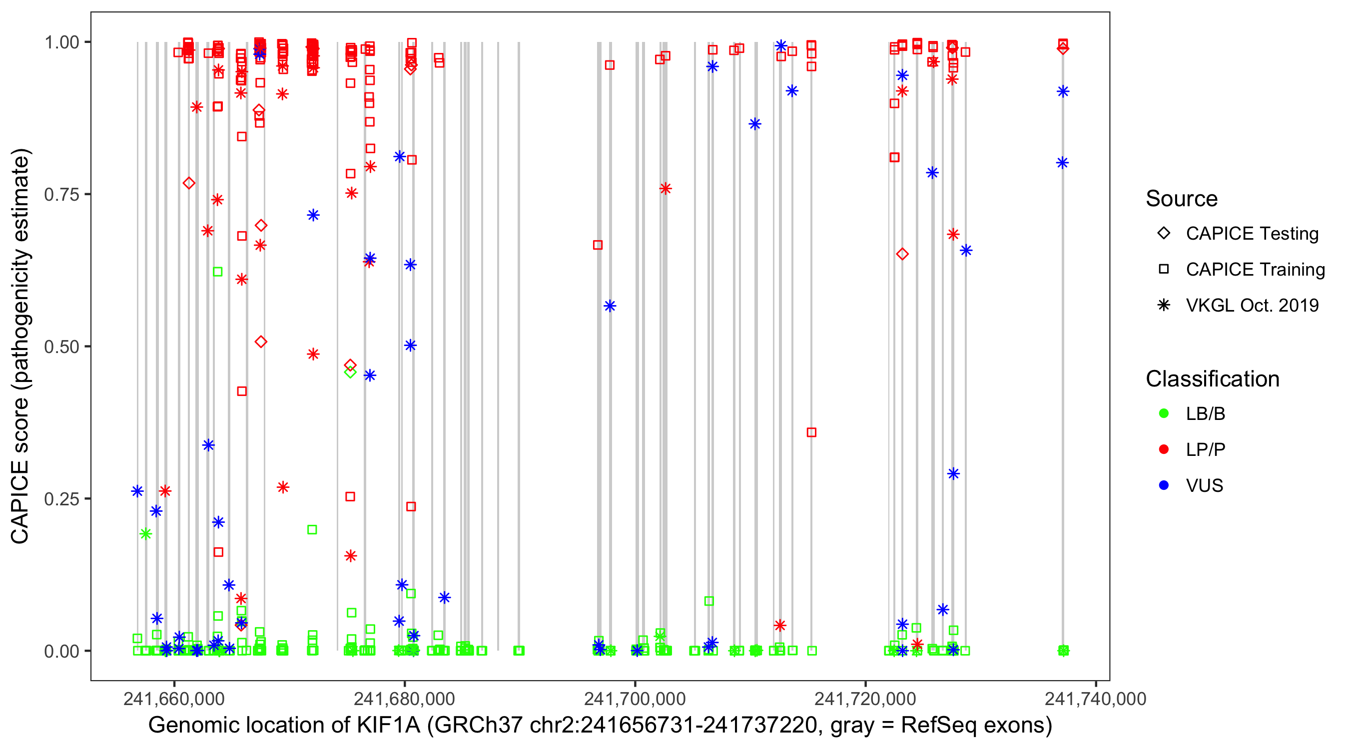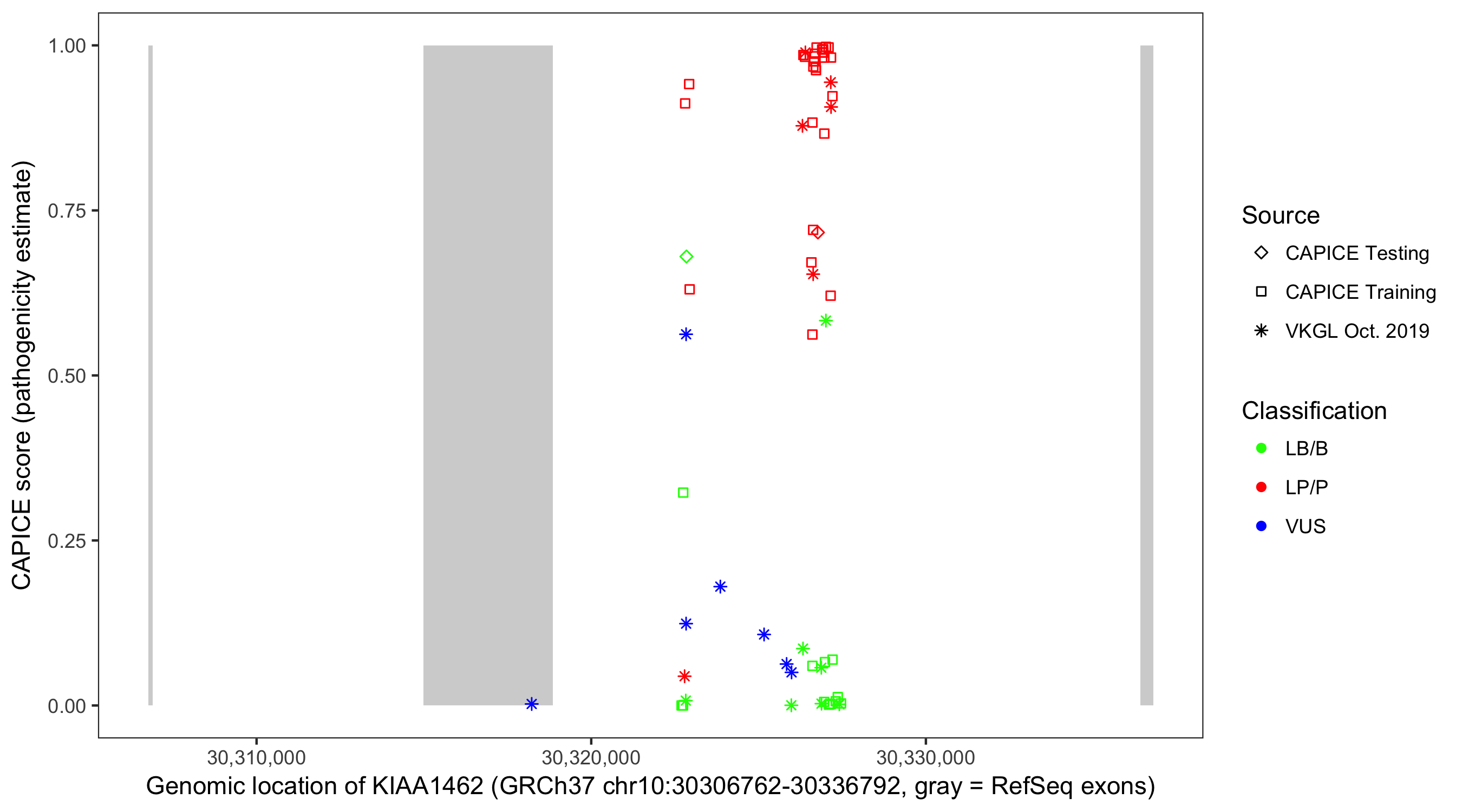 Shown are CAPICE train/test variants plus VKGL Oct 2019.