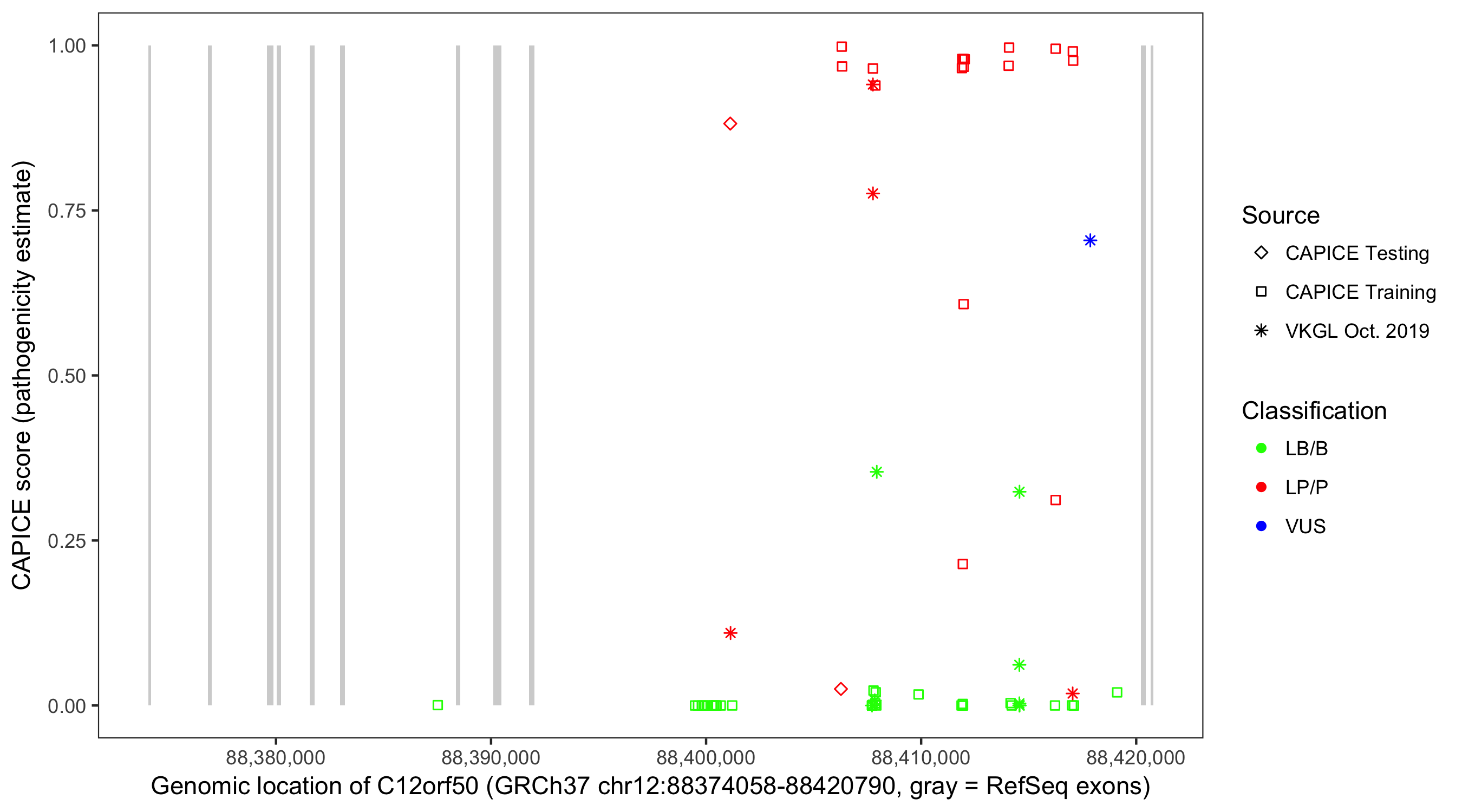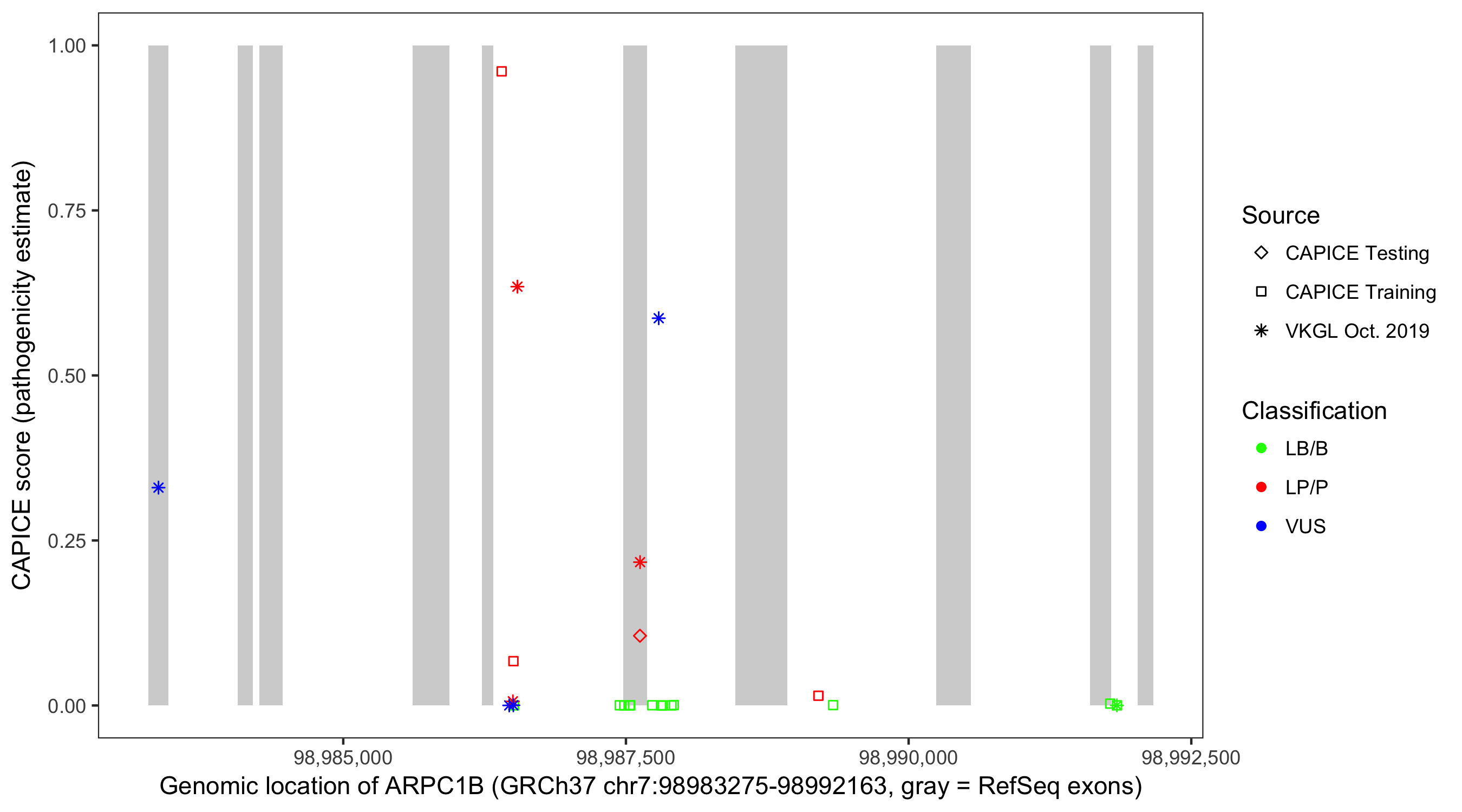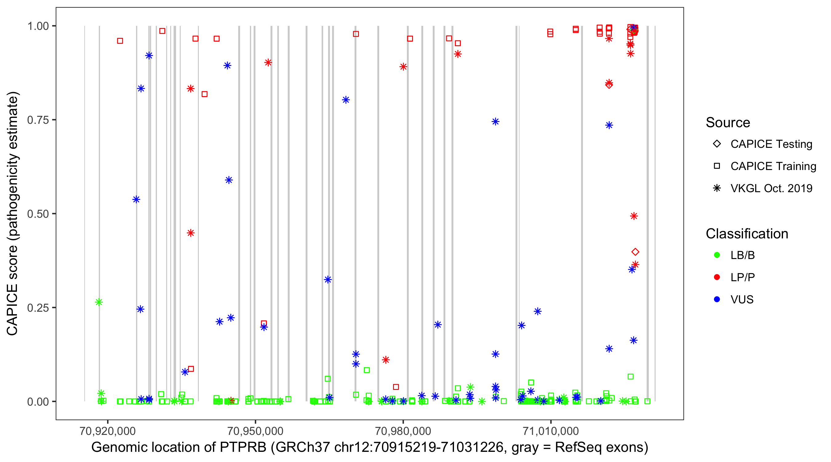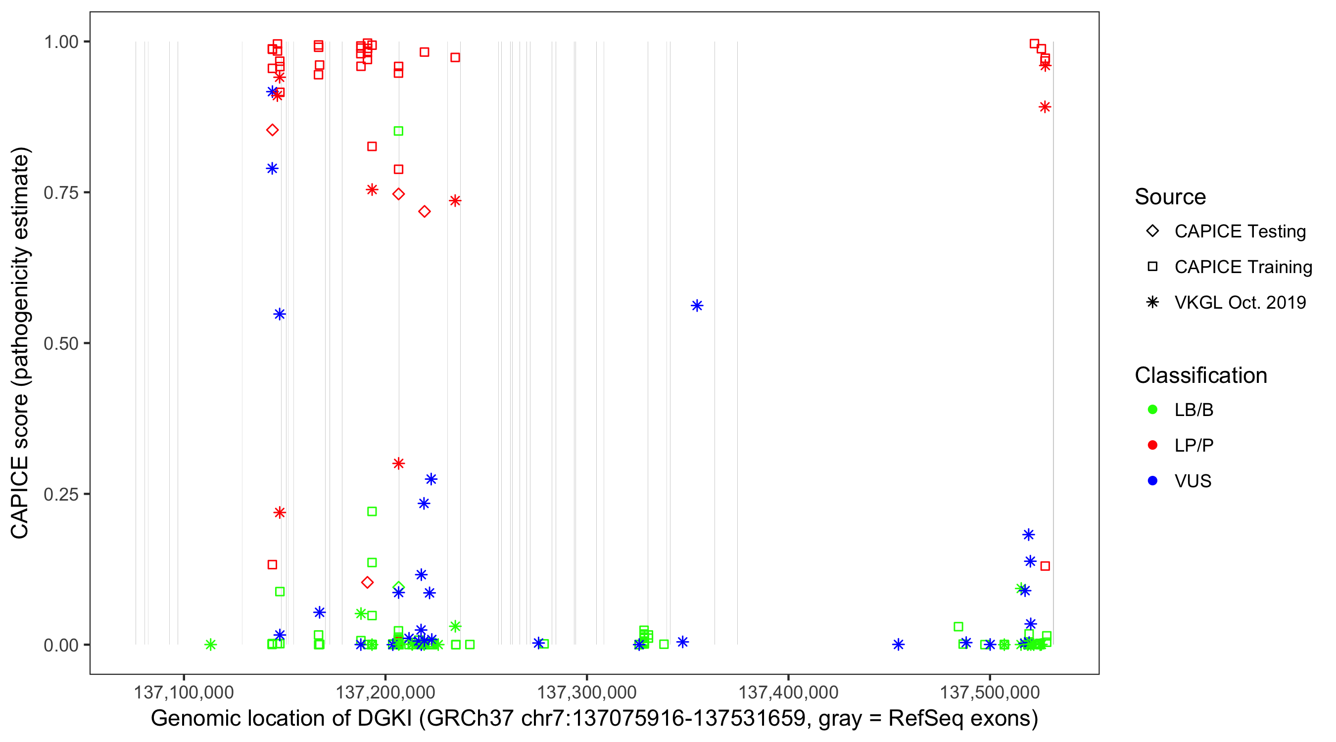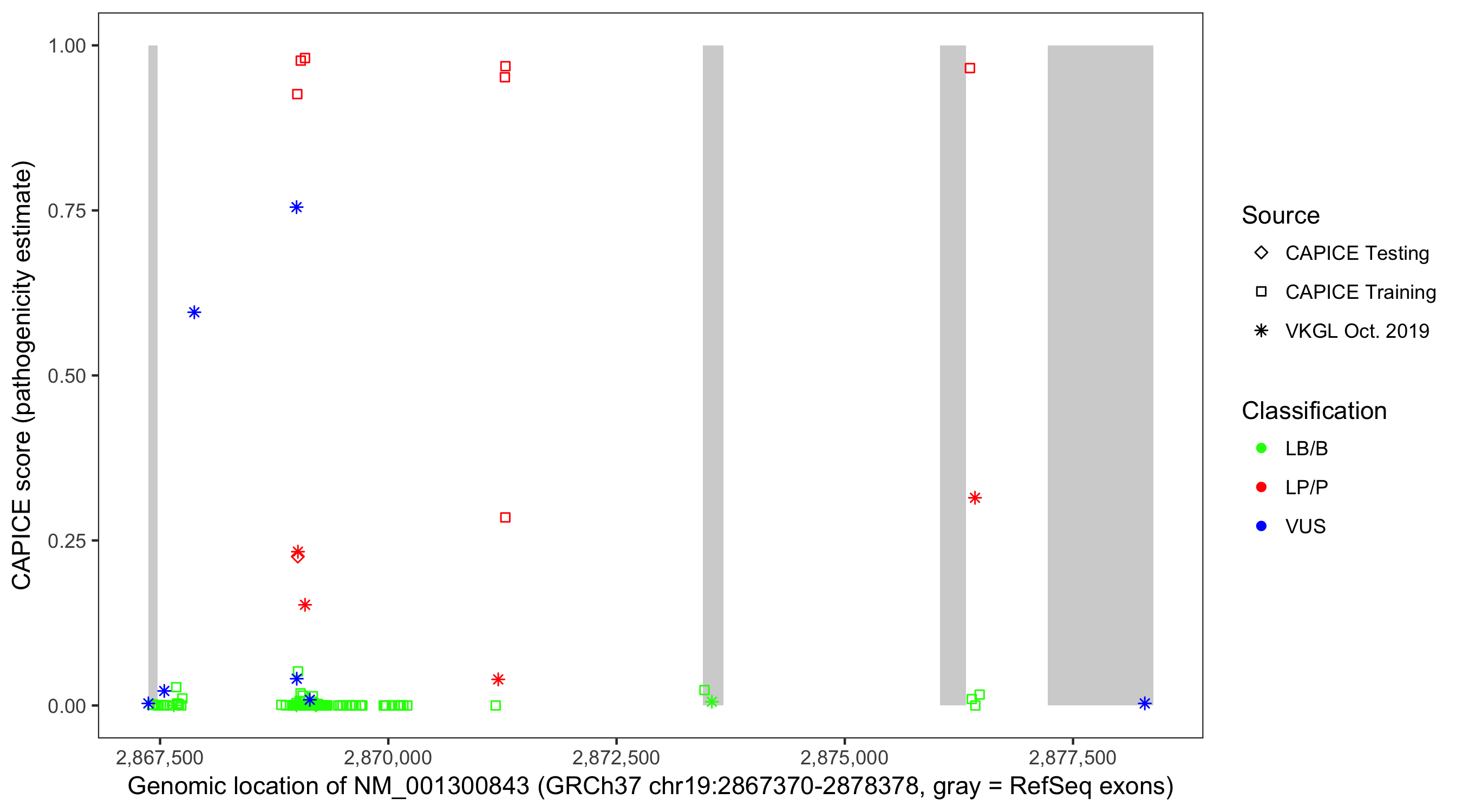 Shown are CAPICE train/test variants plus VKGL Oct 2019.