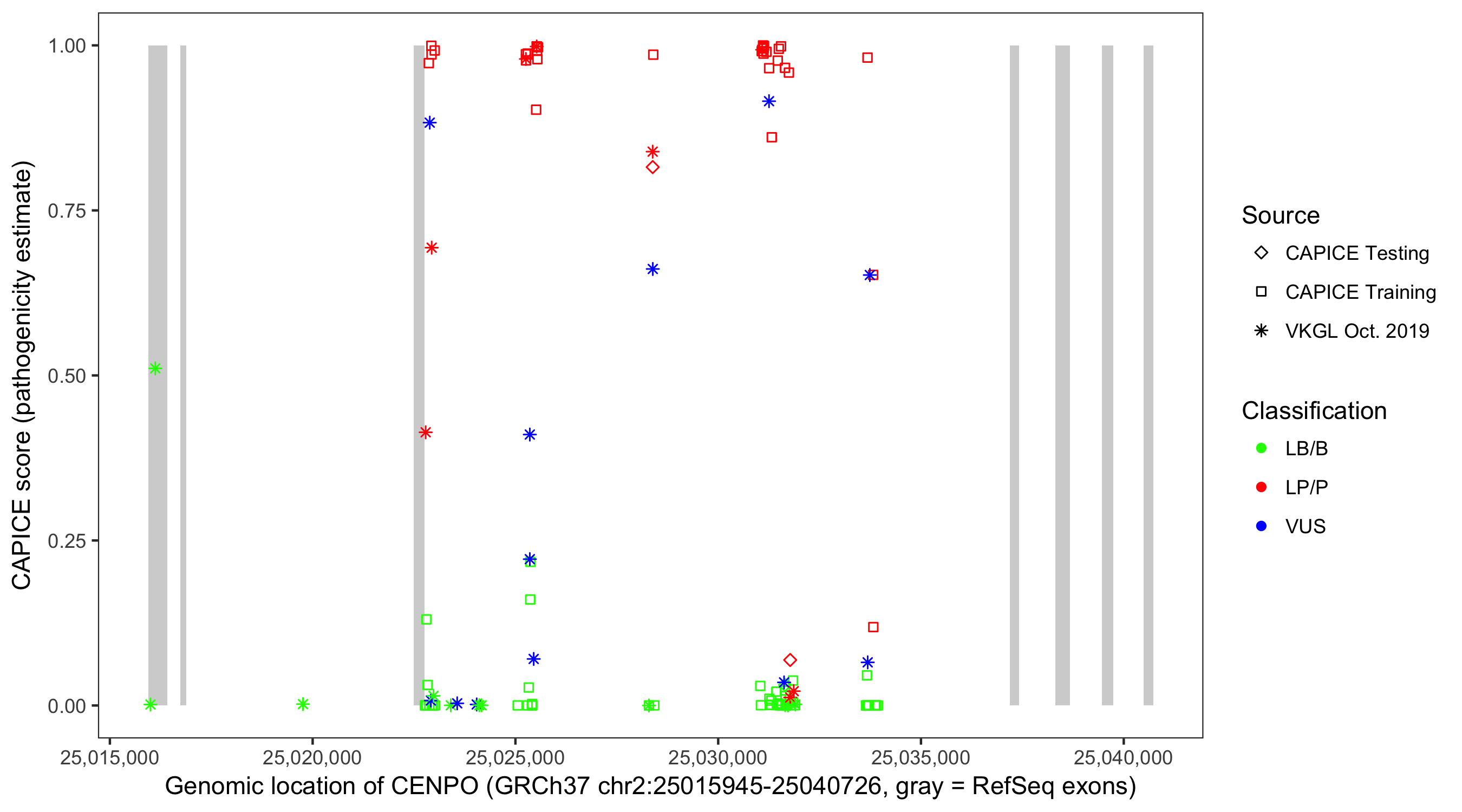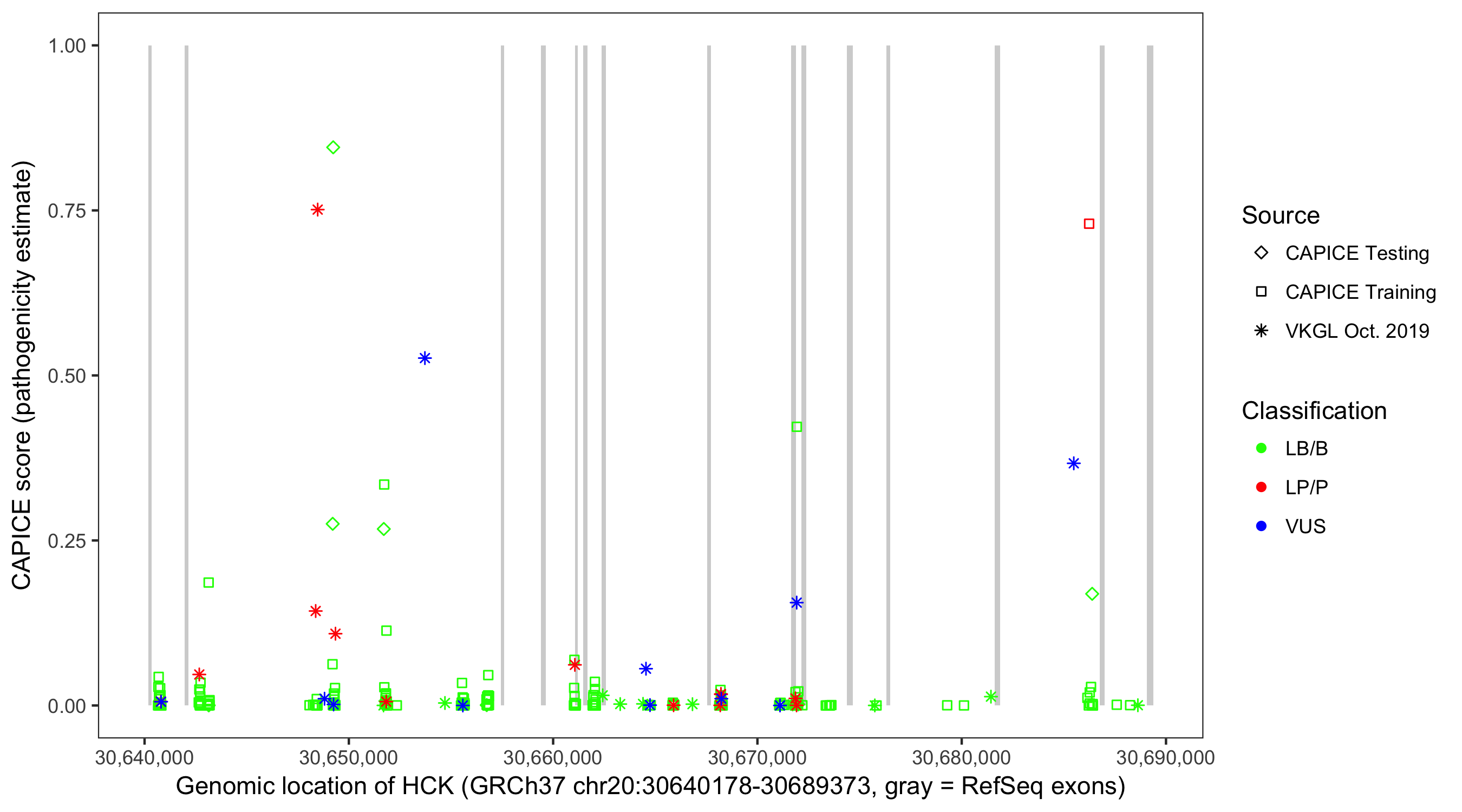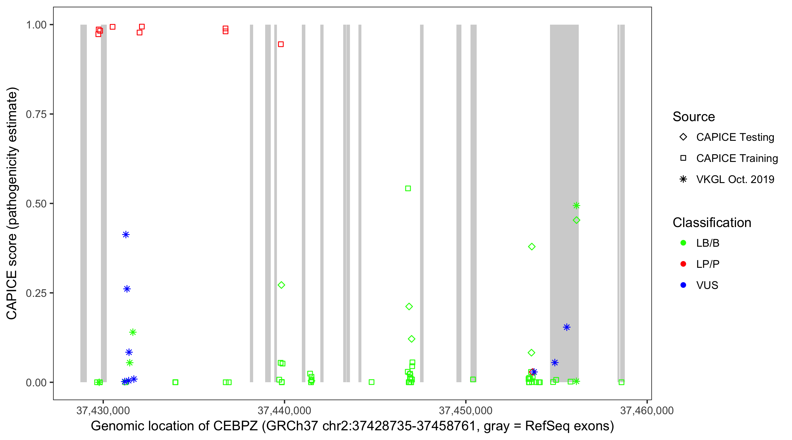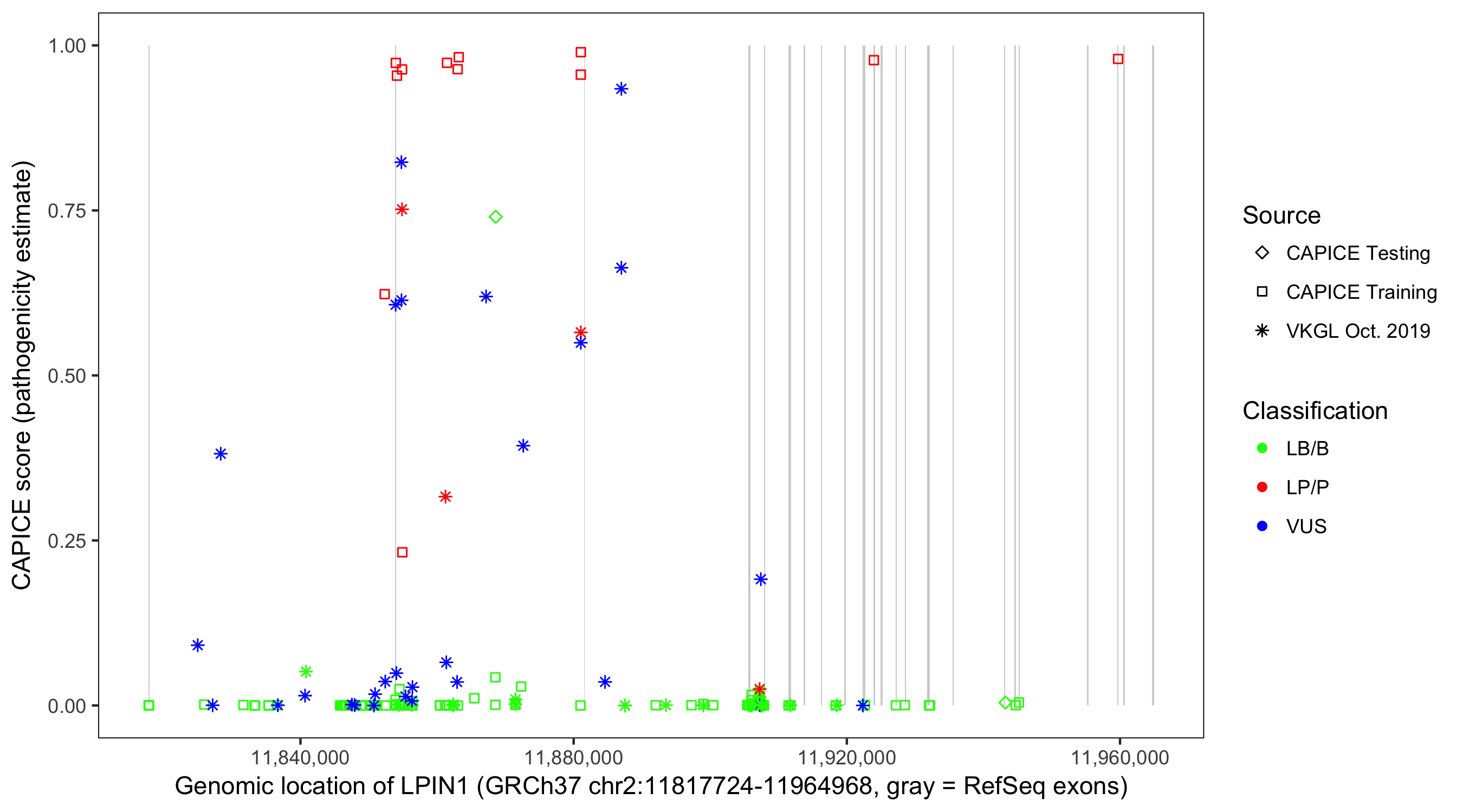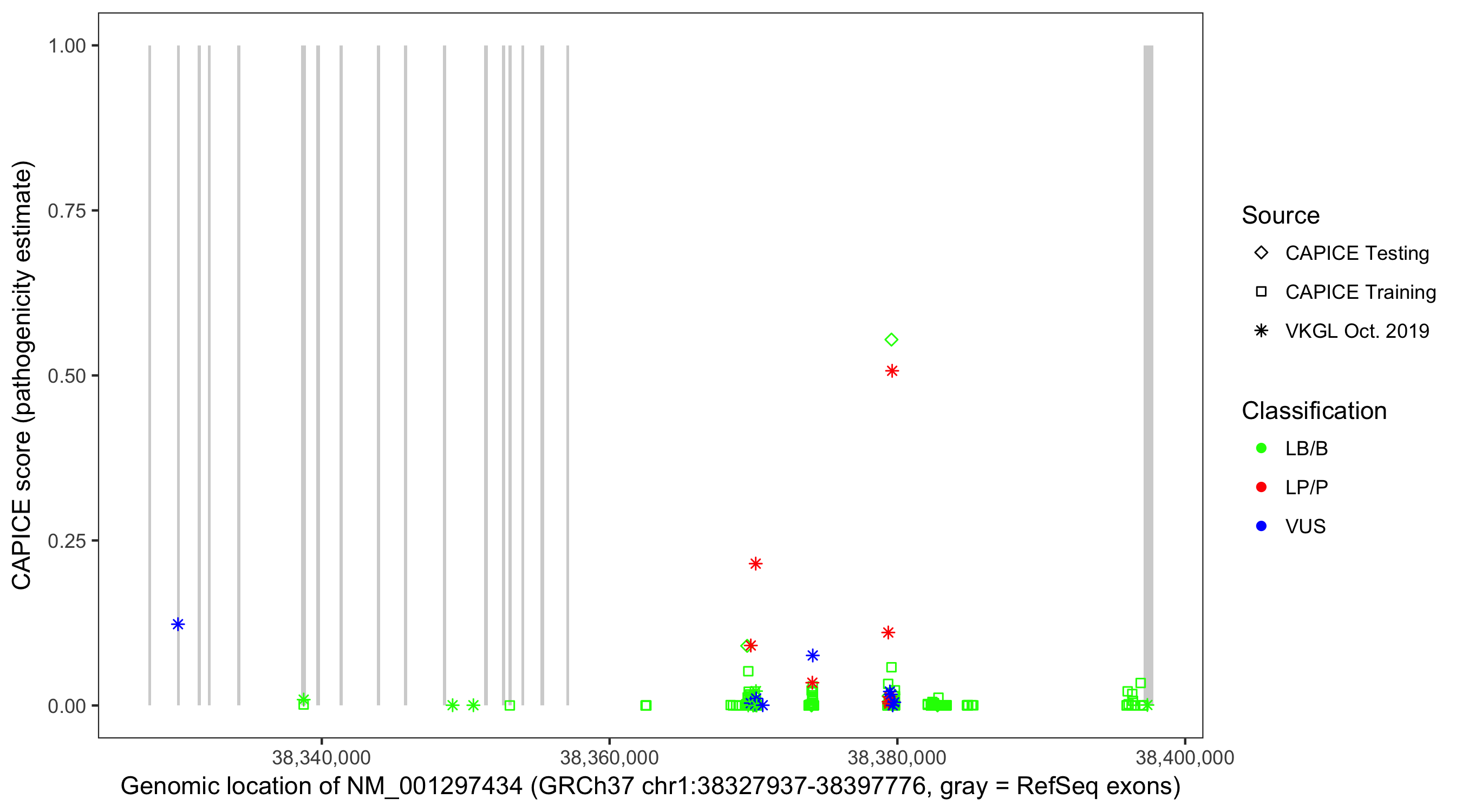 Shown are CAPICE train/test variants plus VKGL Oct 2019.