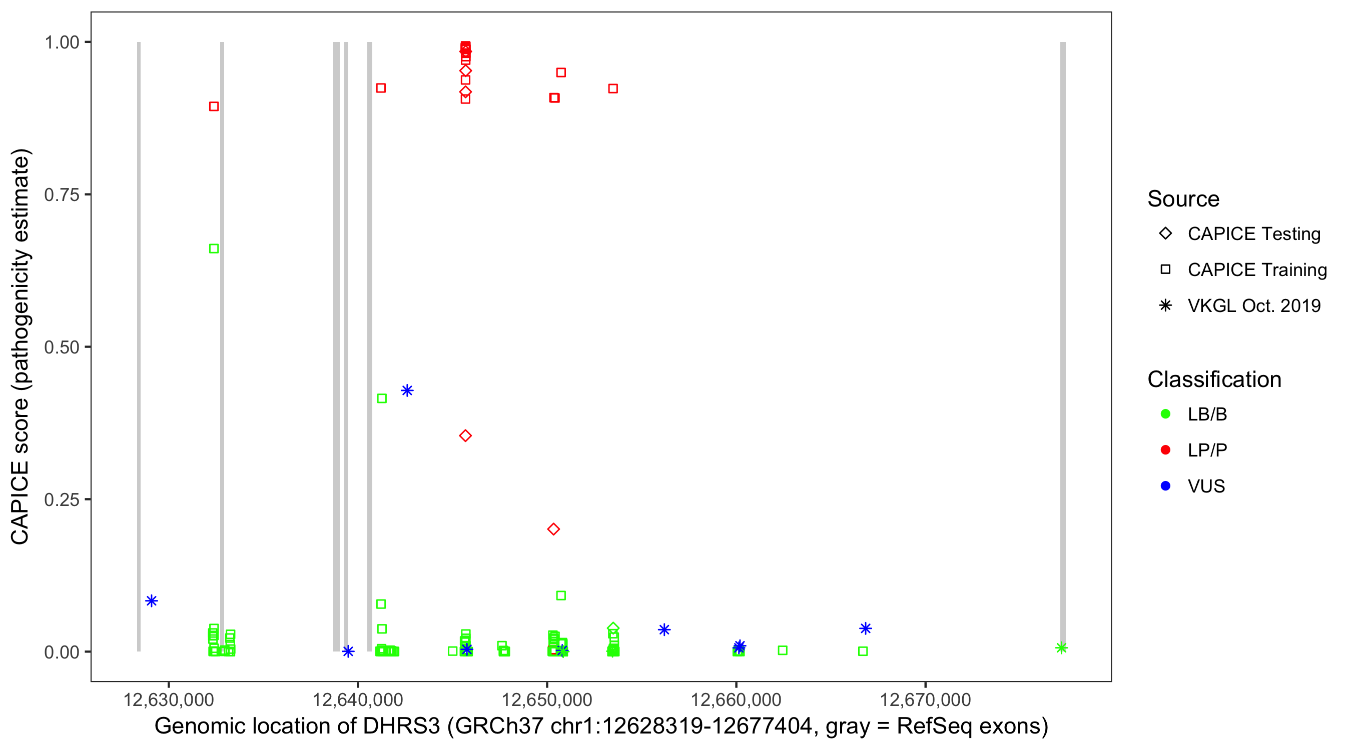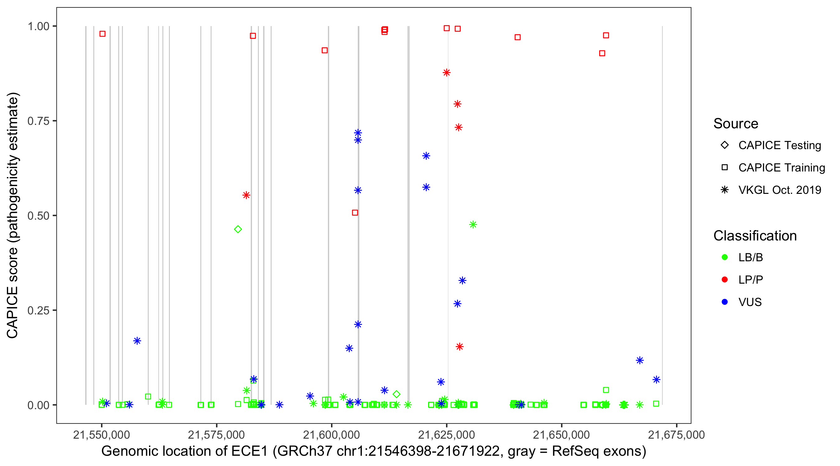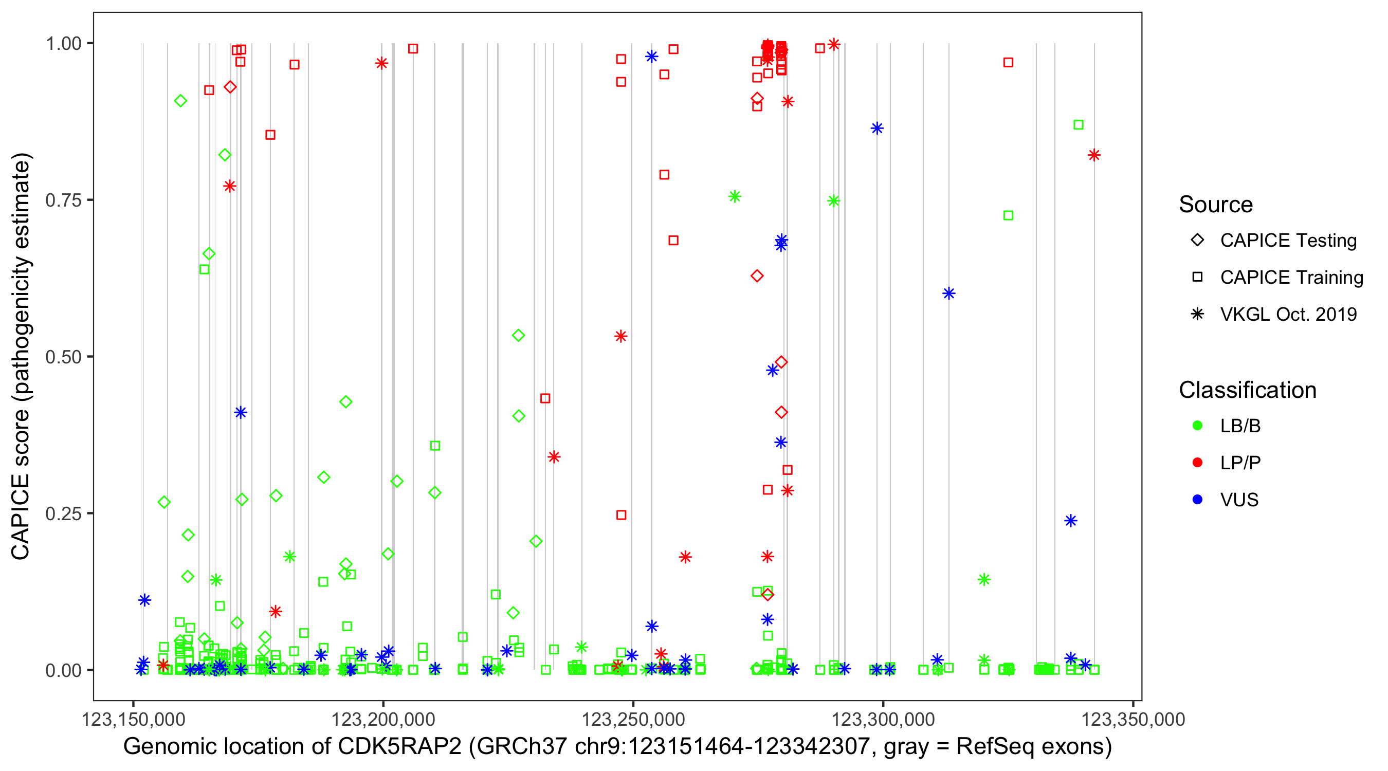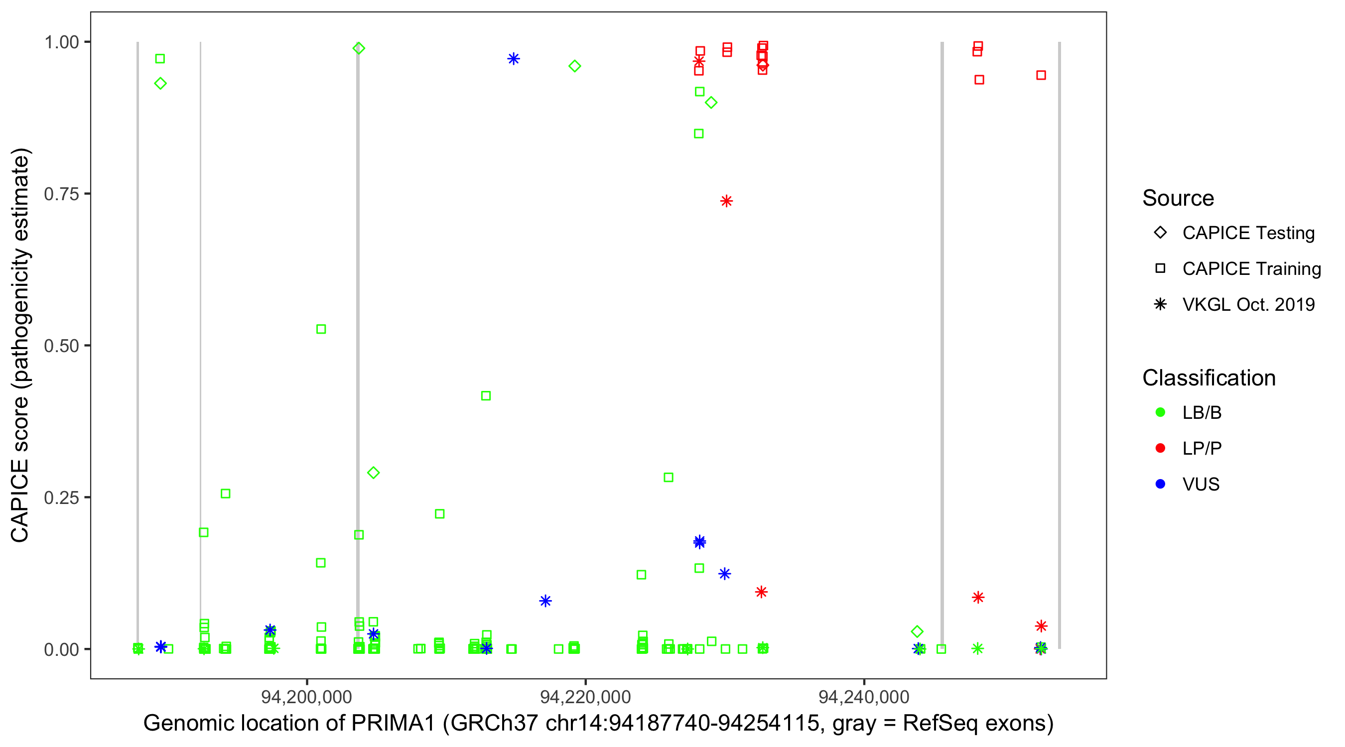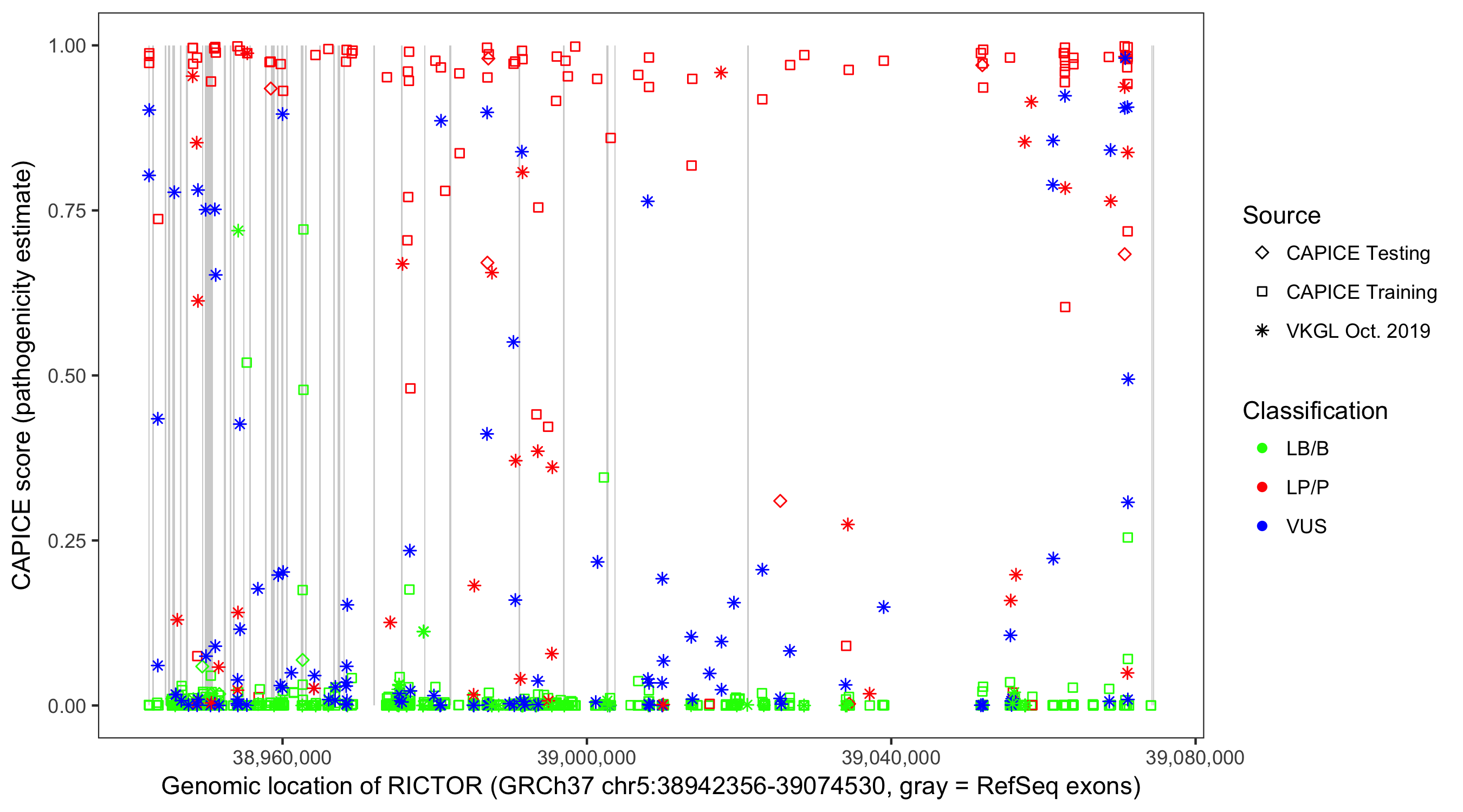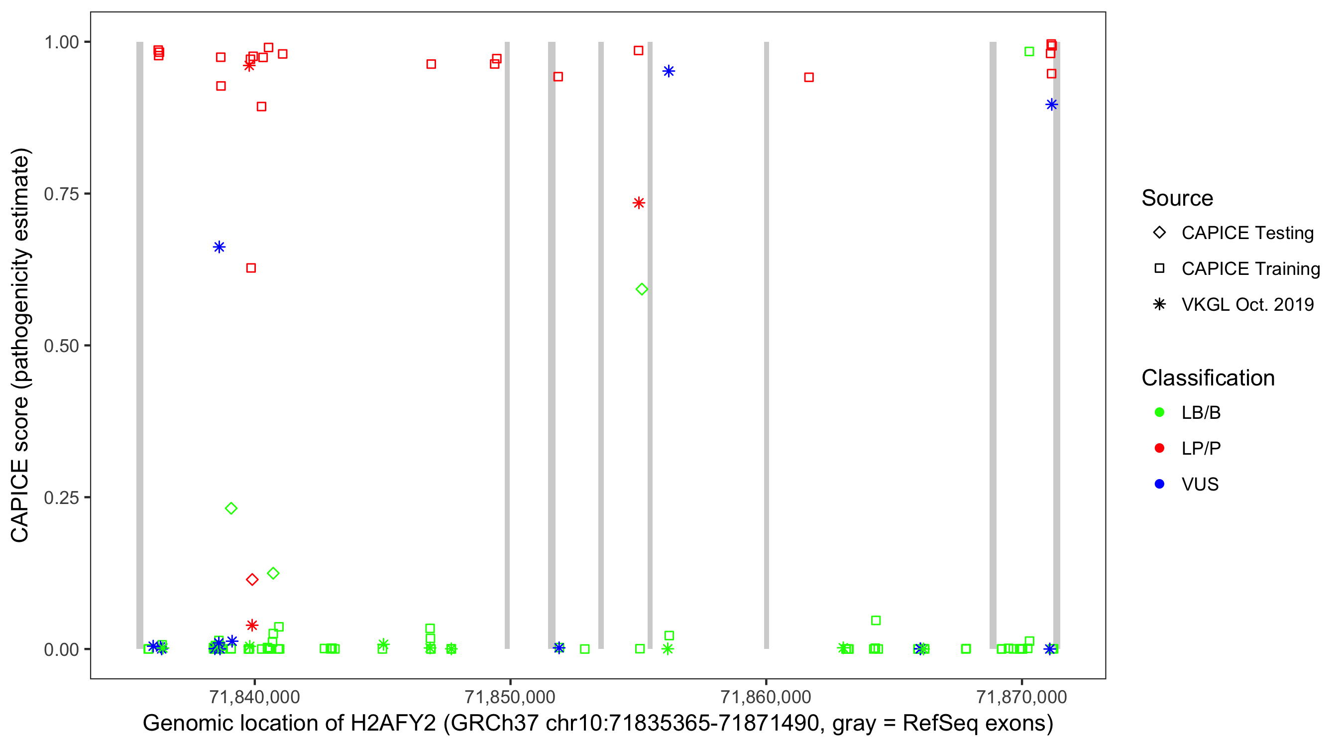 Shown are CAPICE train/test variants plus VKGL Oct 2019.