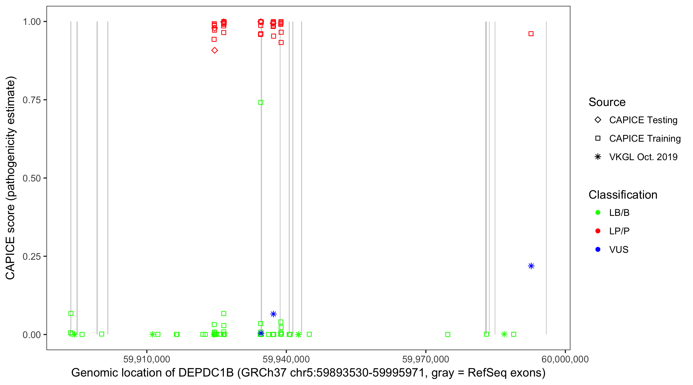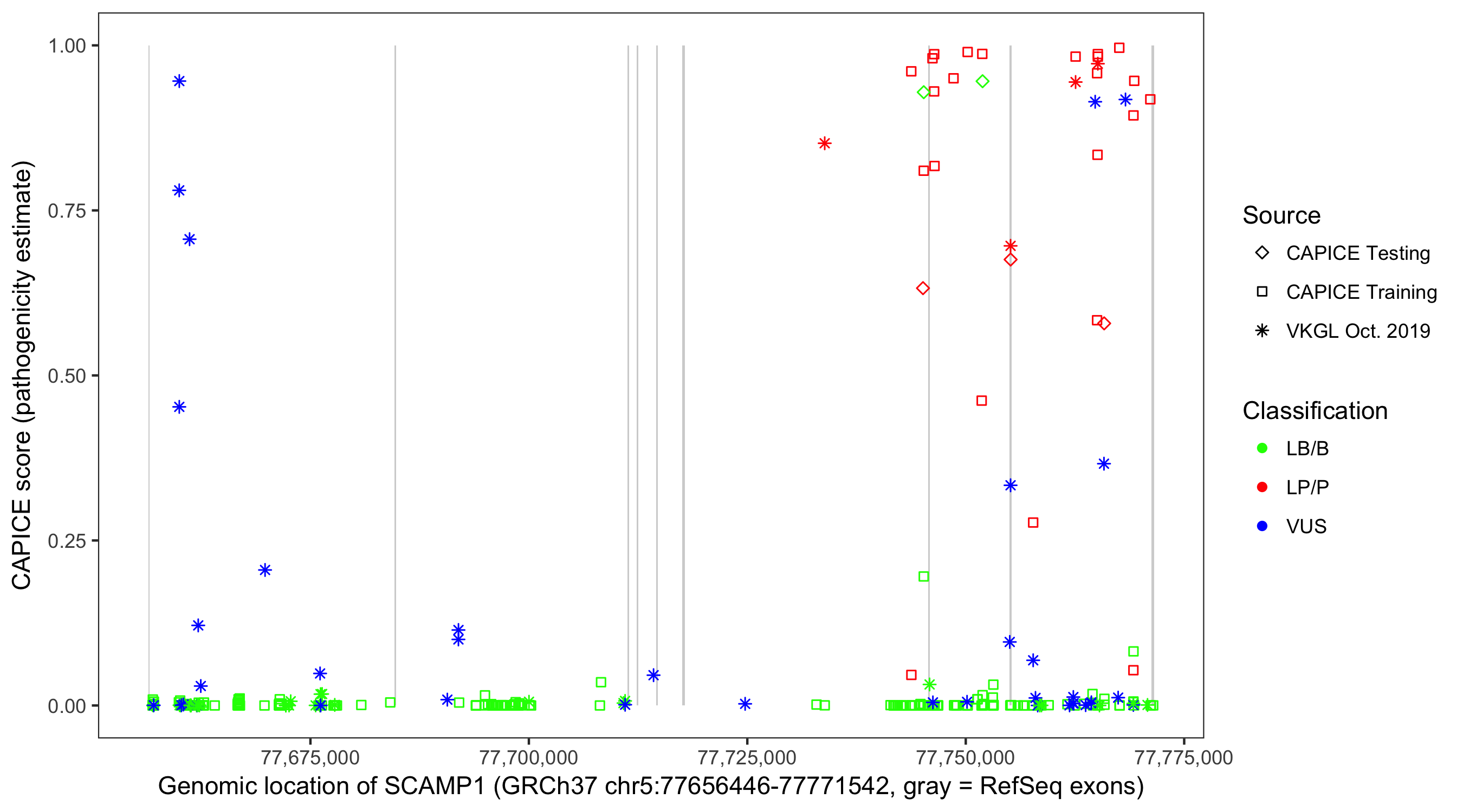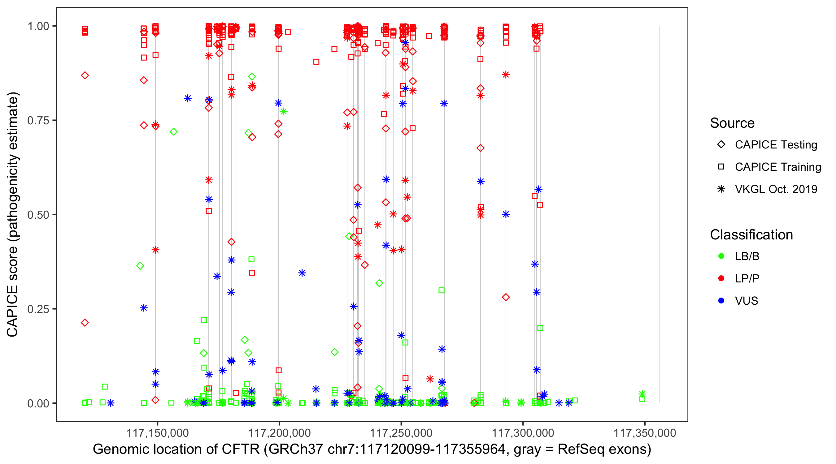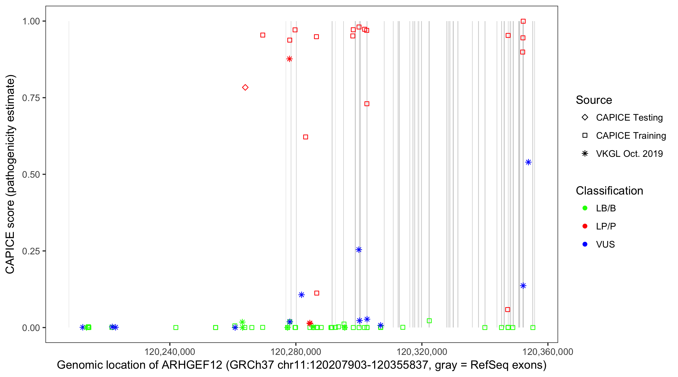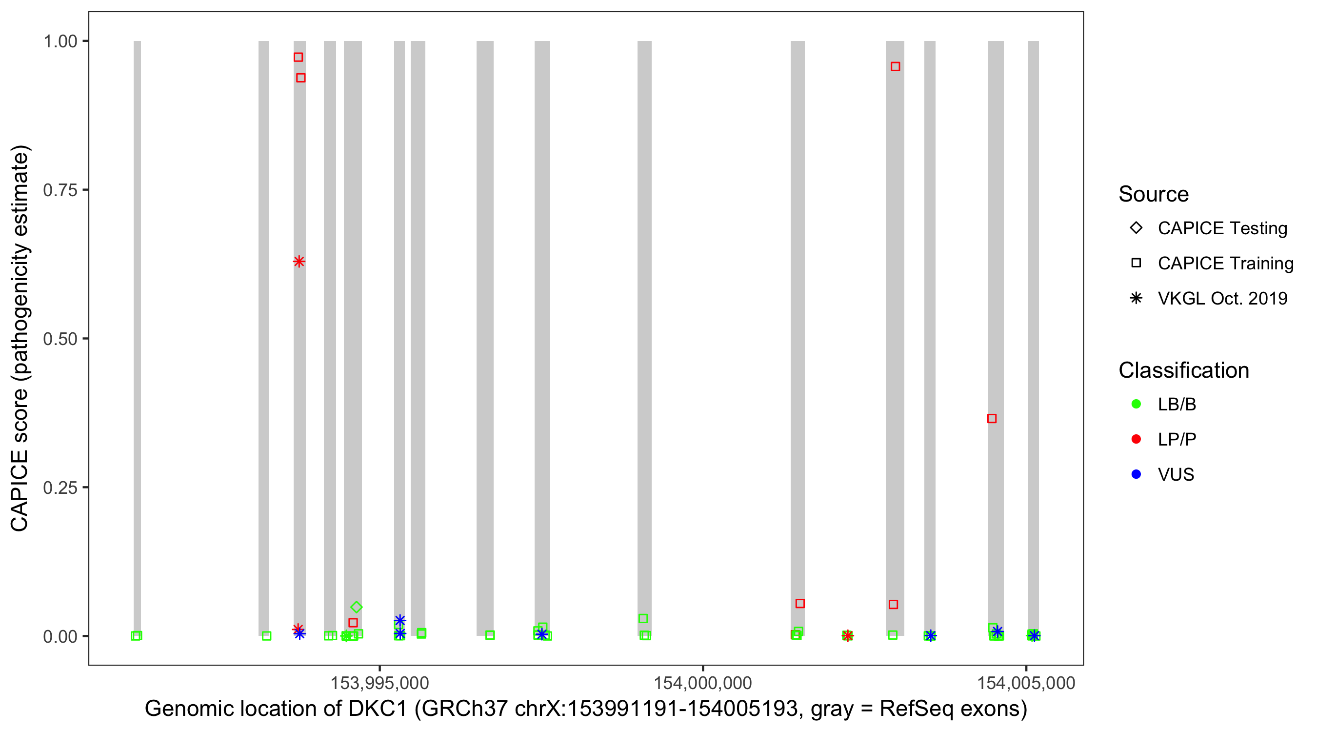 Shown are CAPICE train/test variants plus VKGL Oct 2019.