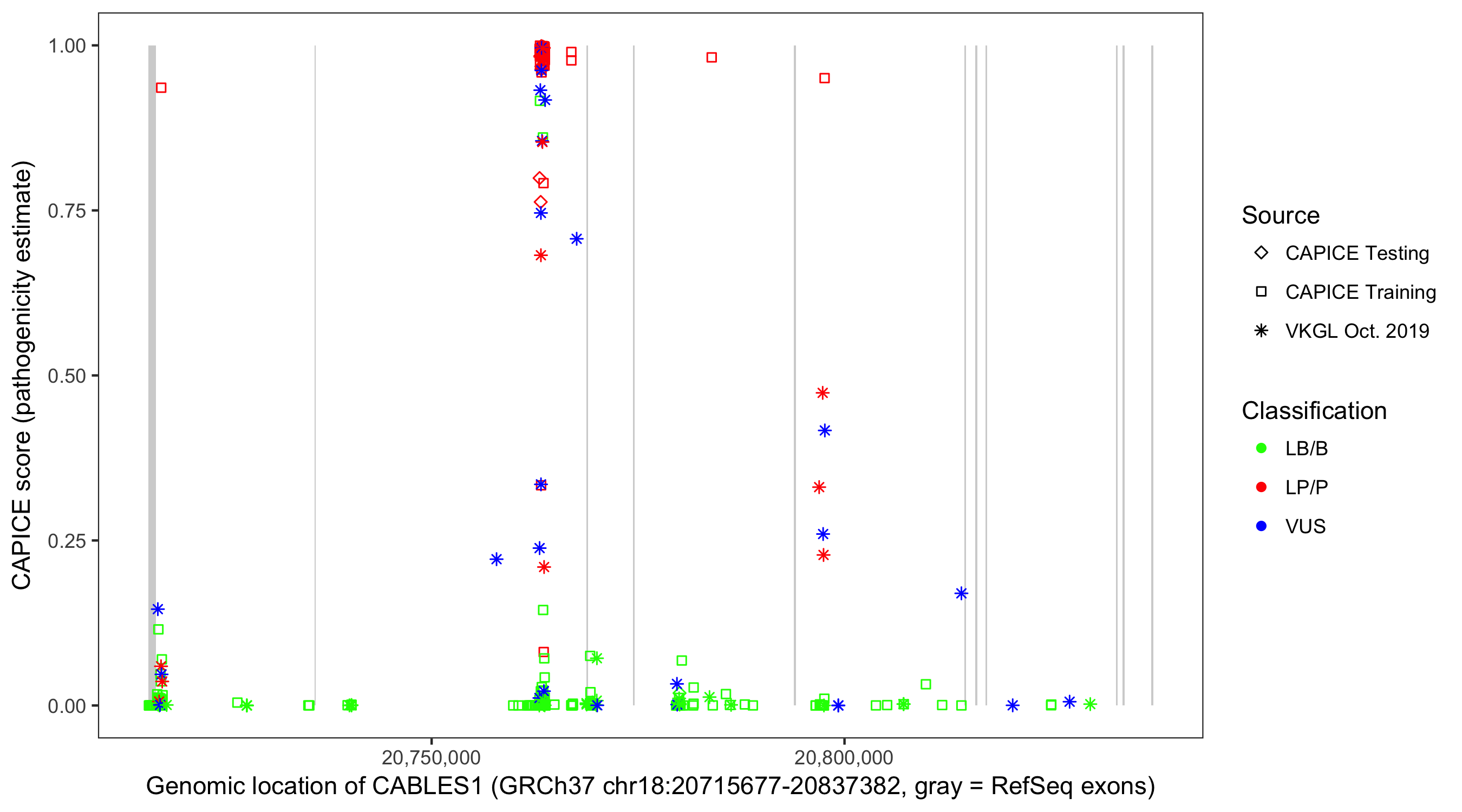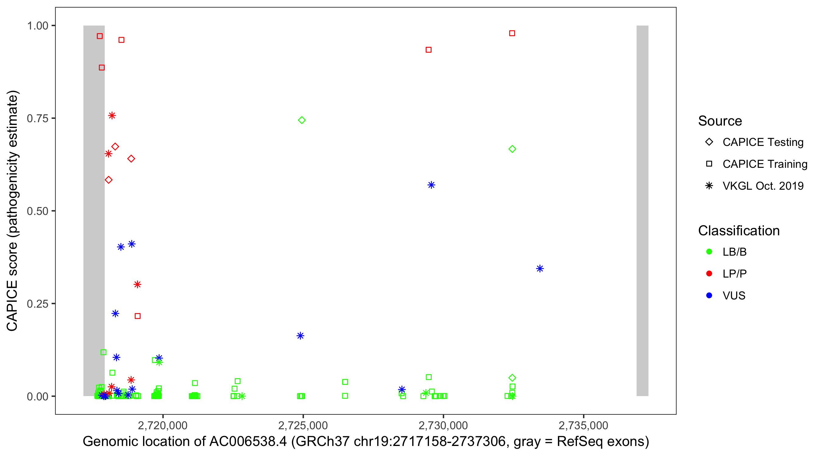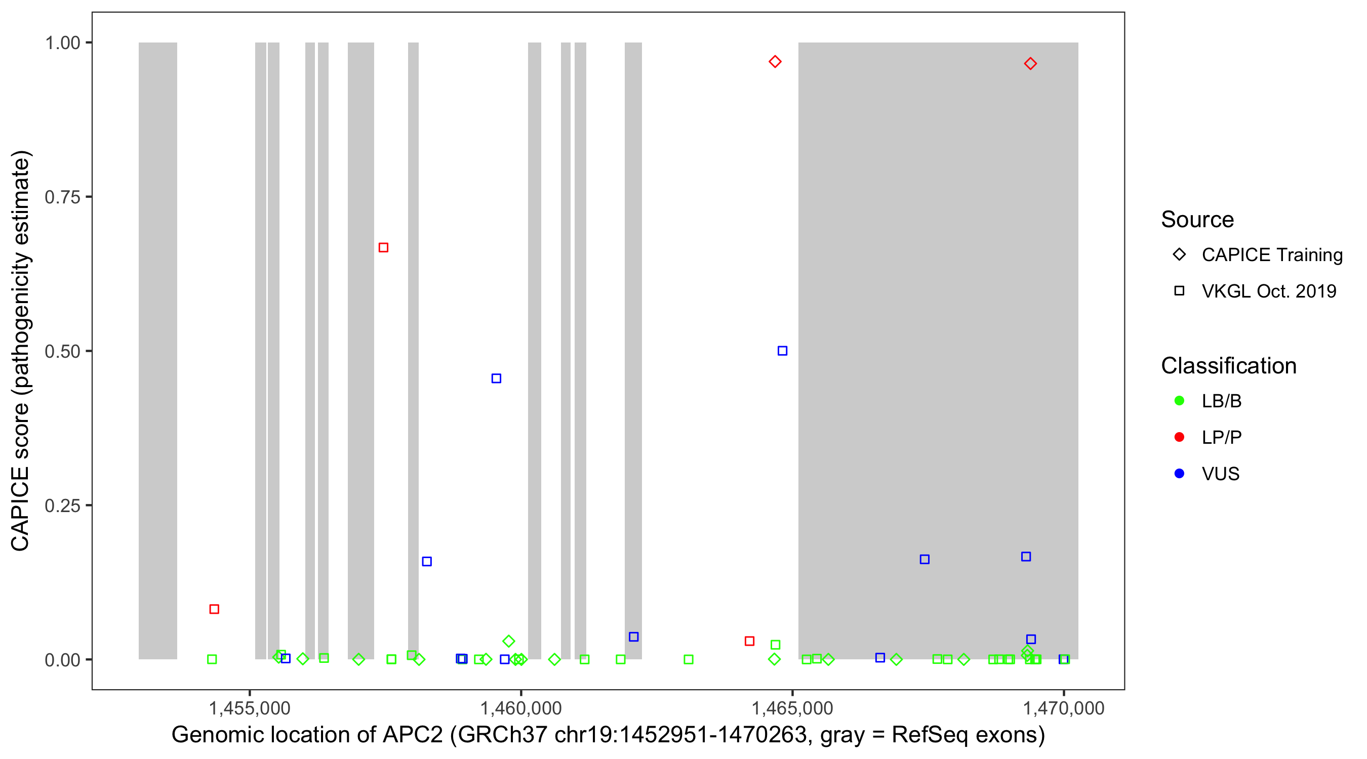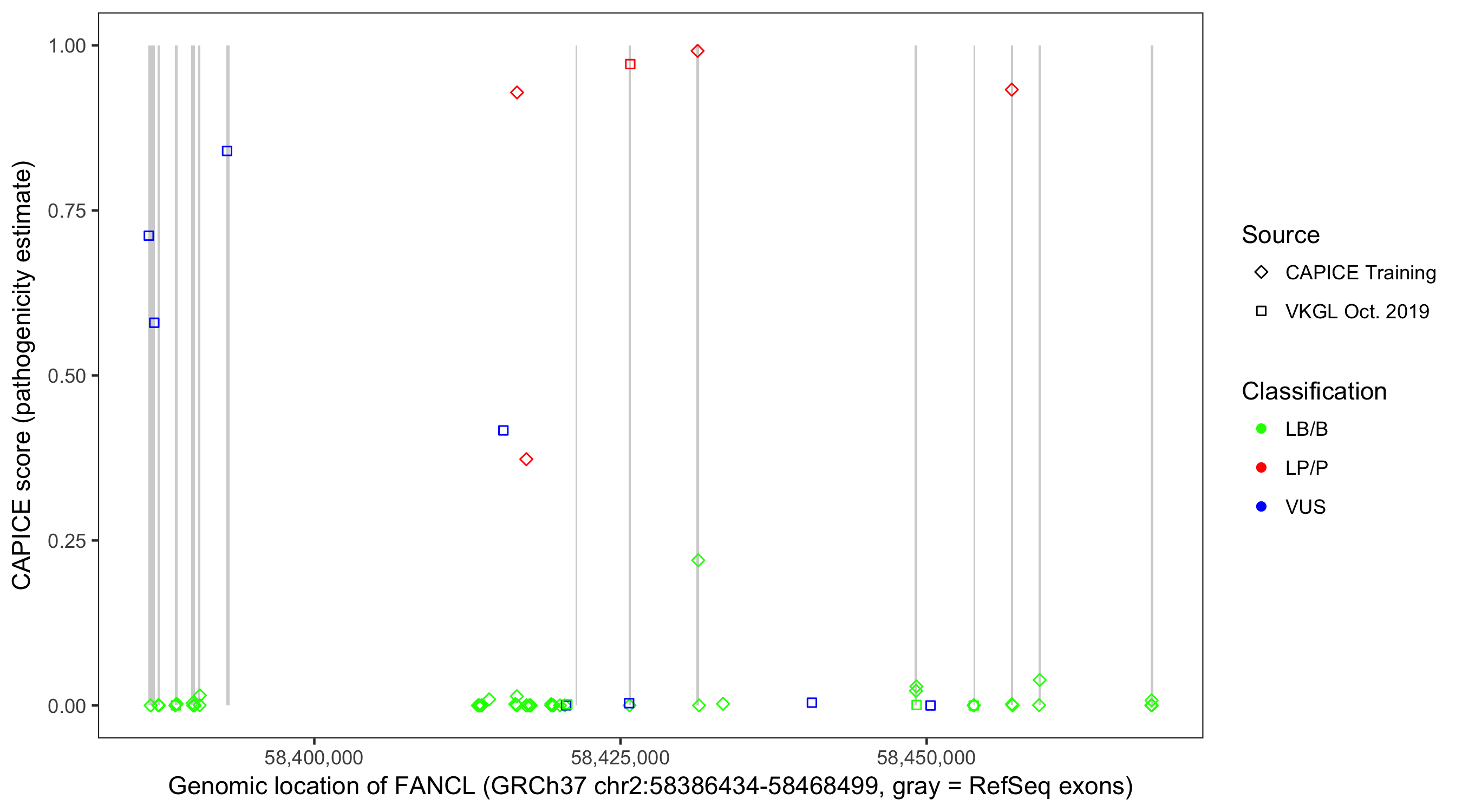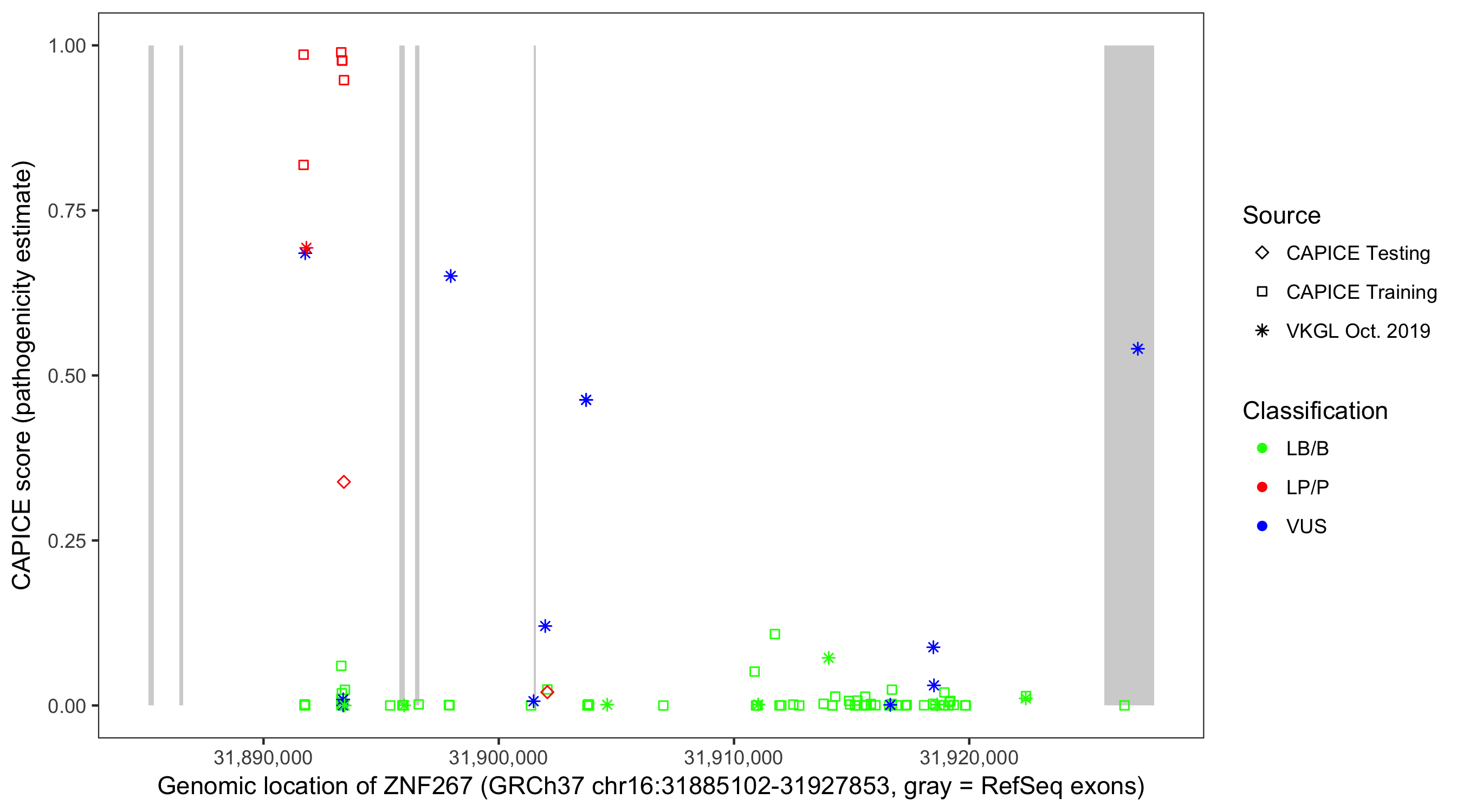 Shown are CAPICE train/test variants plus VKGL Oct 2019.
