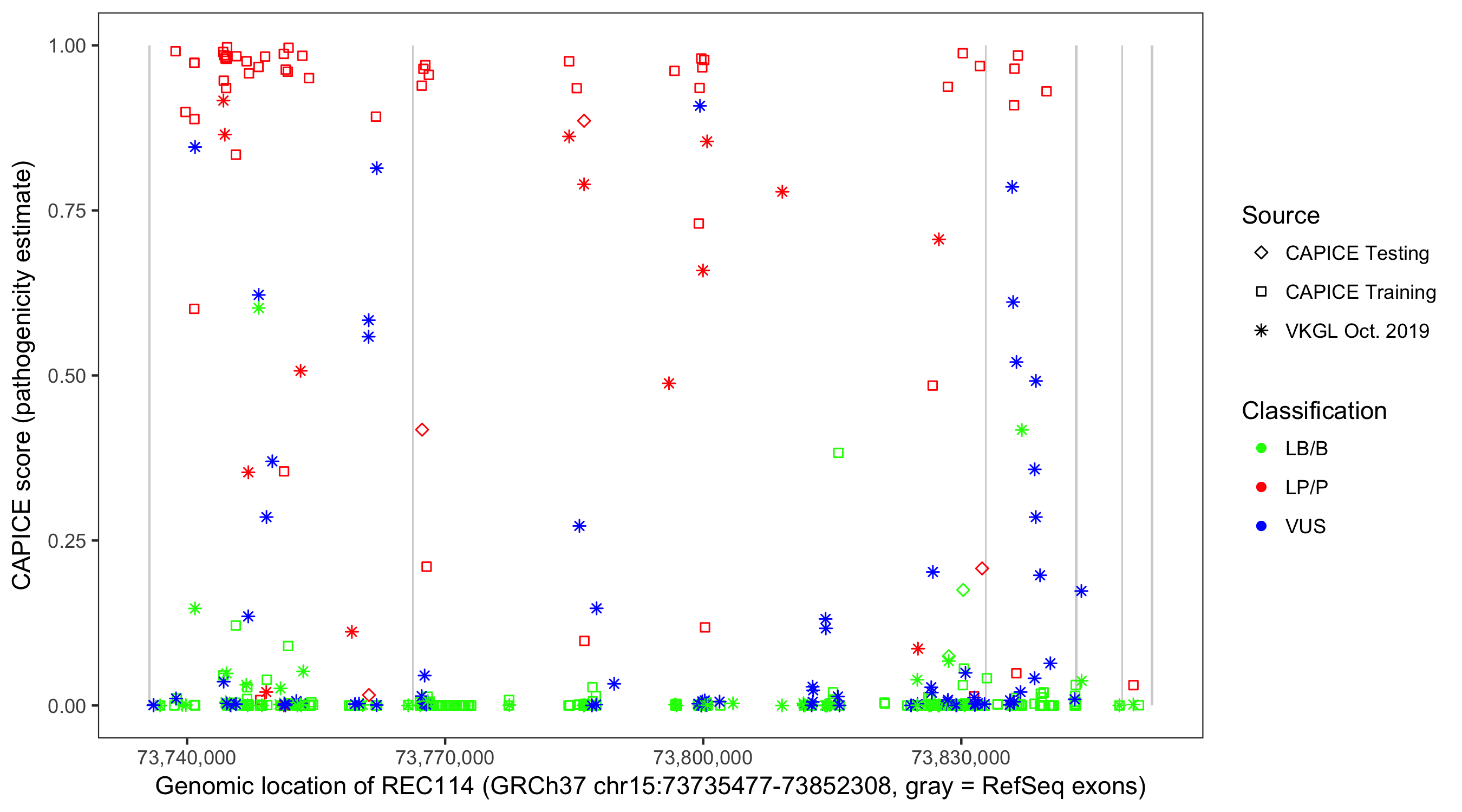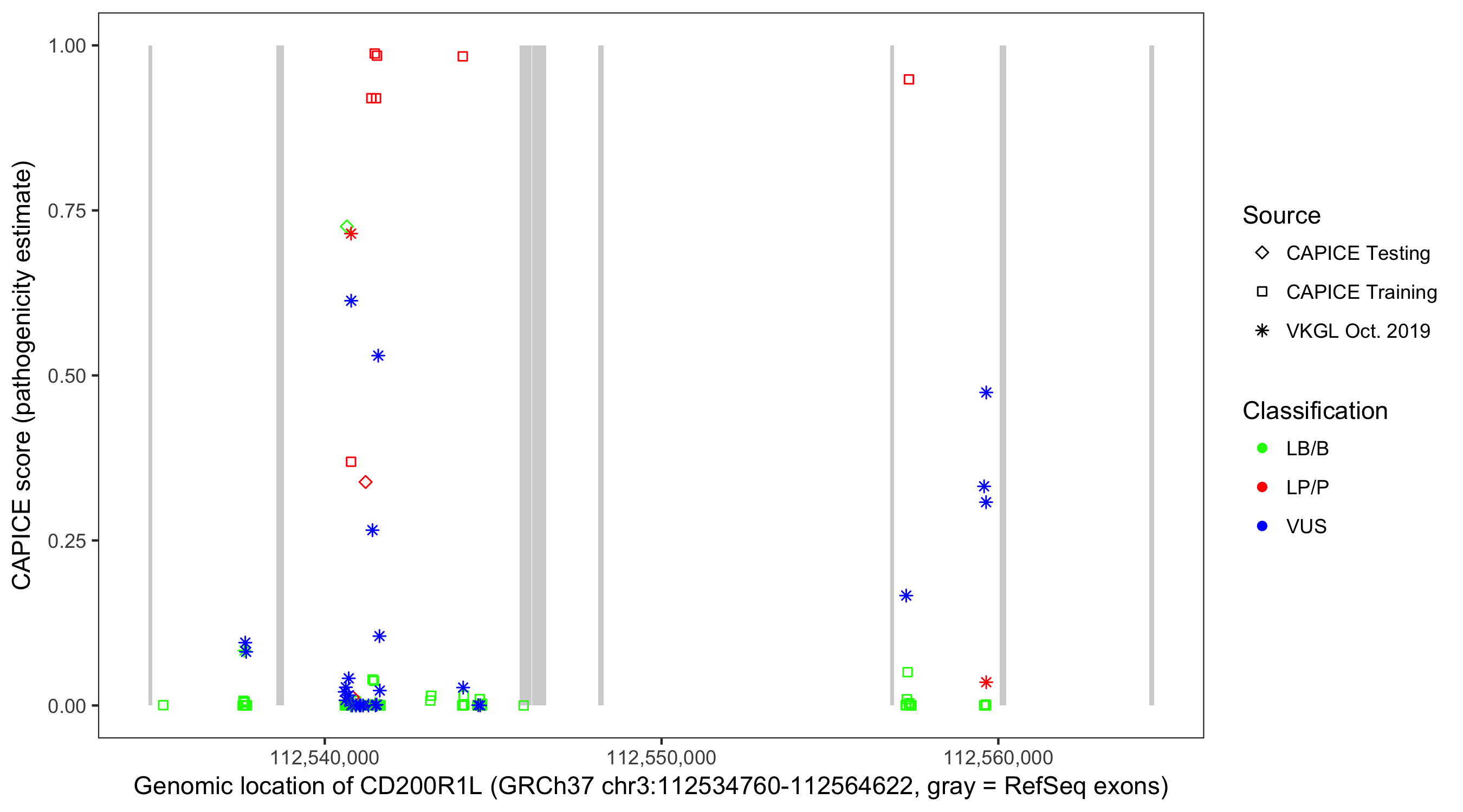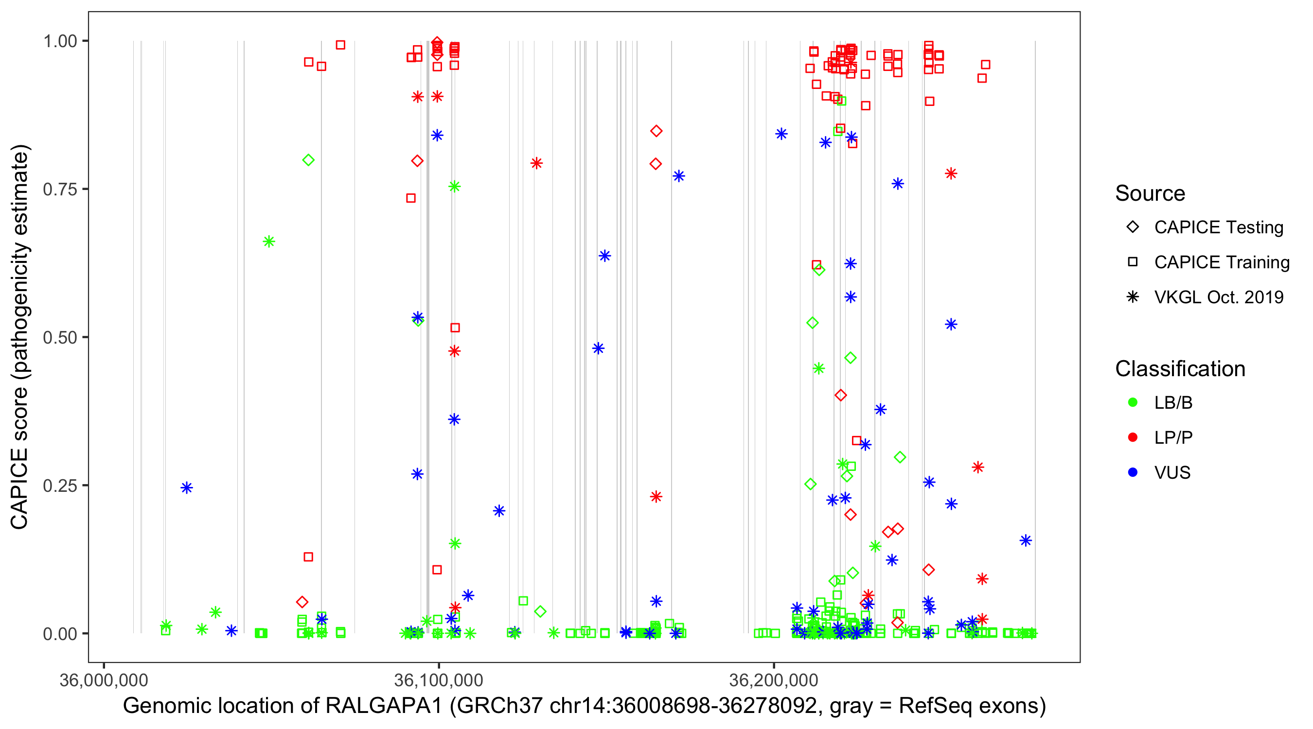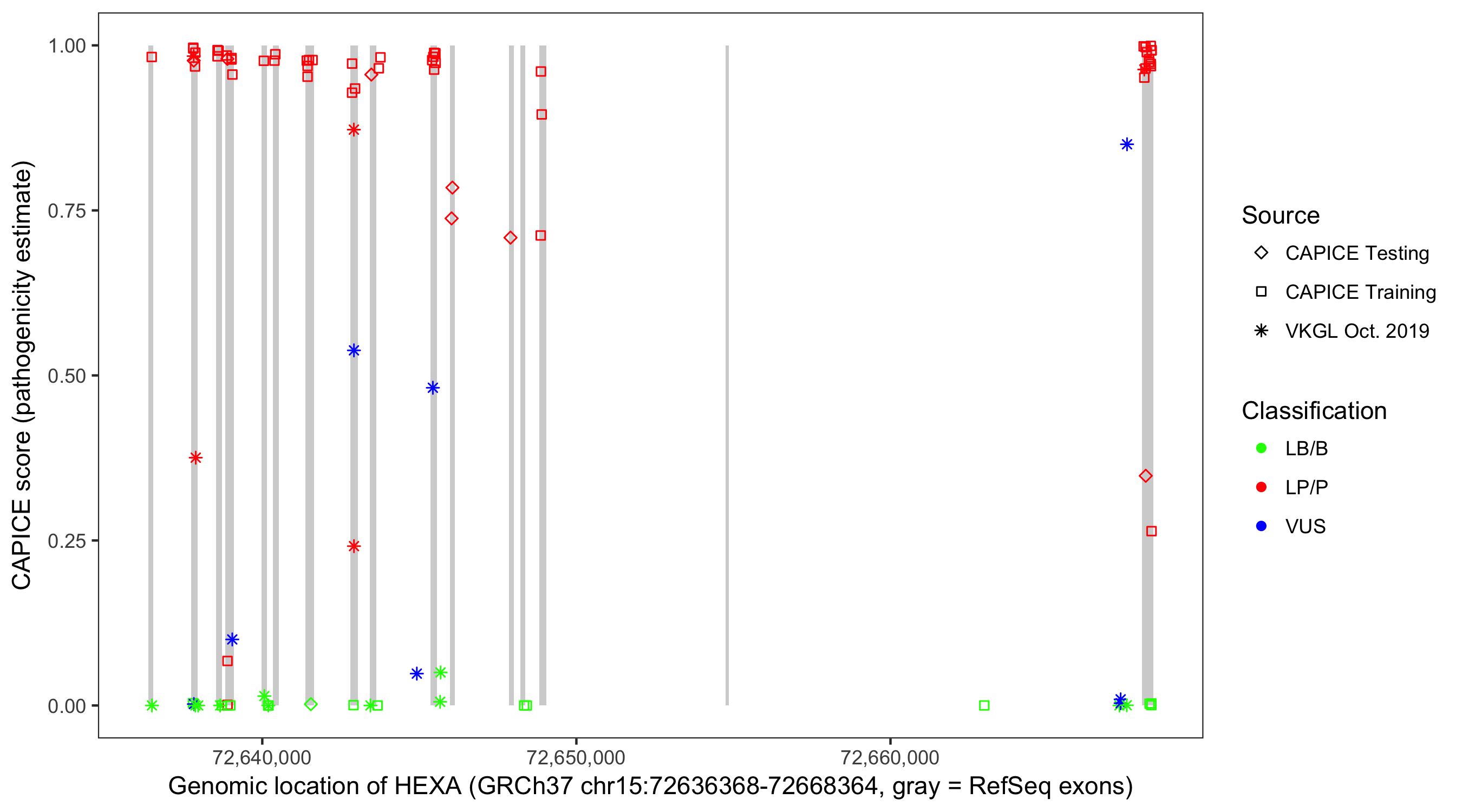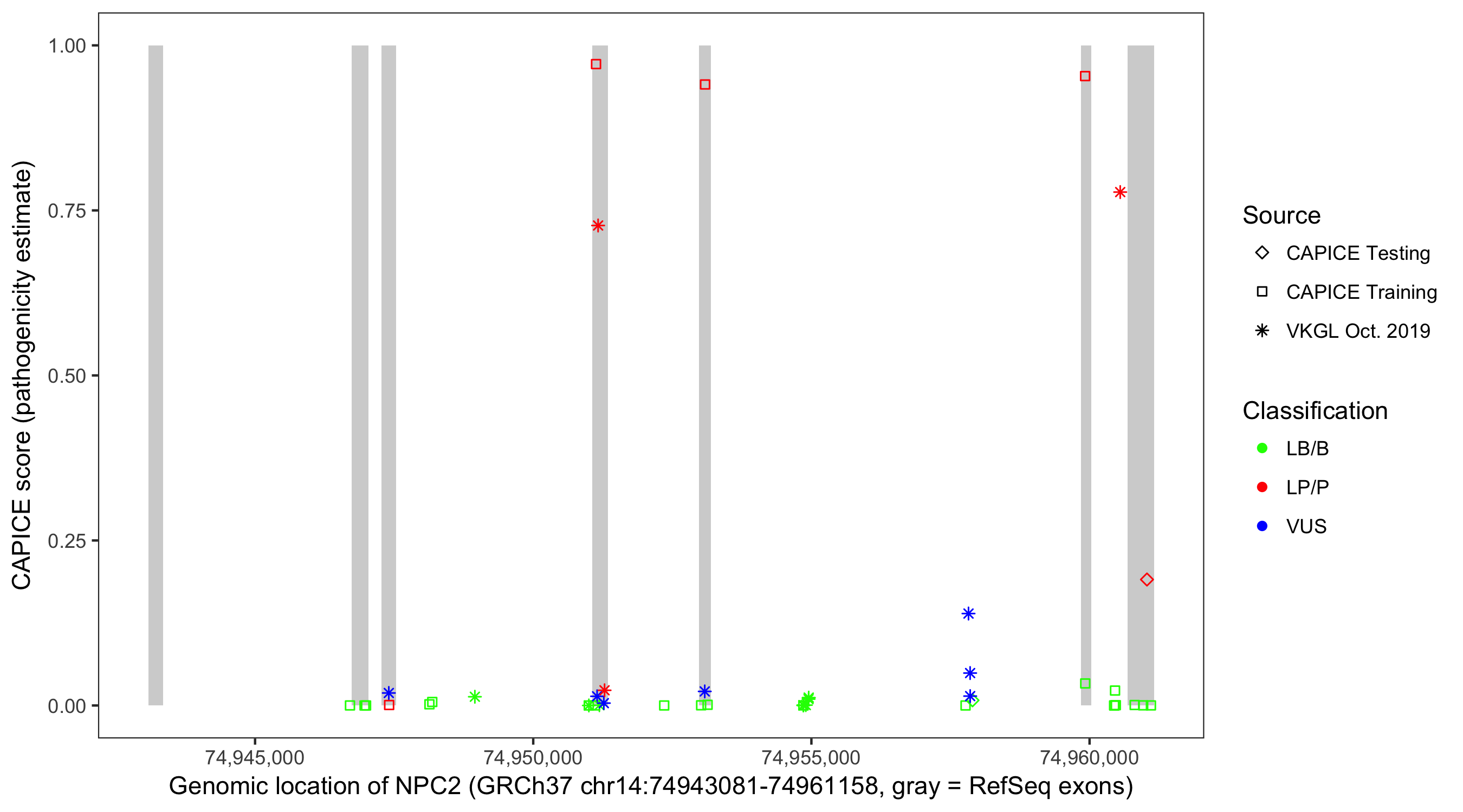 Shown are CAPICE train/test variants plus VKGL Oct 2019.