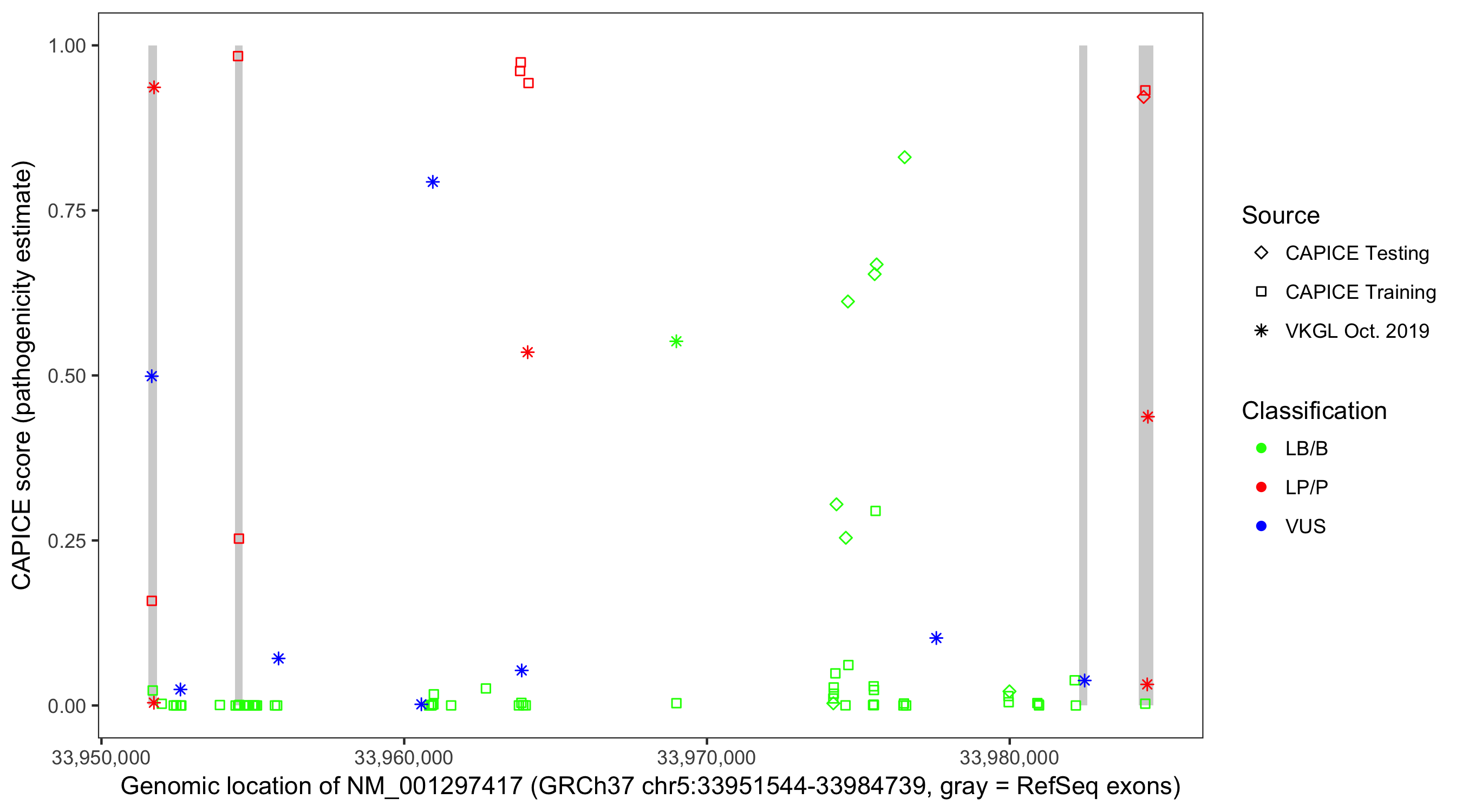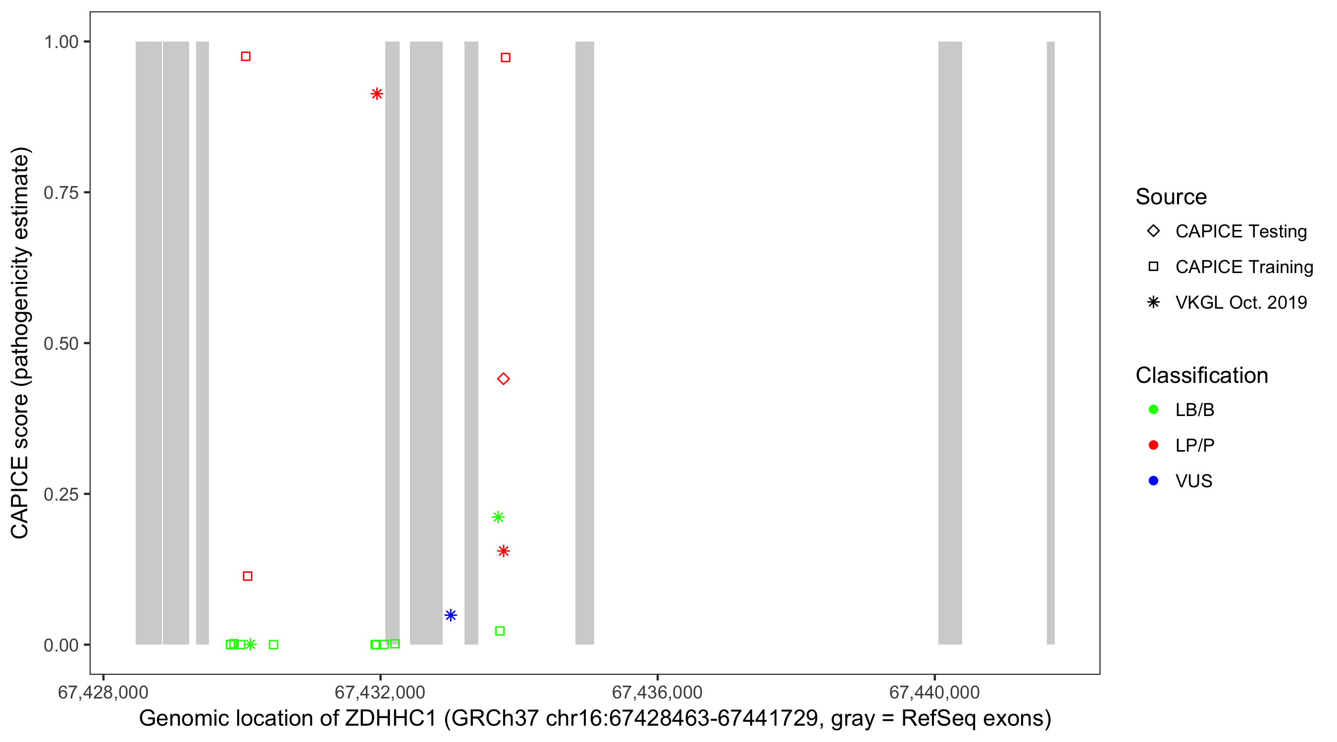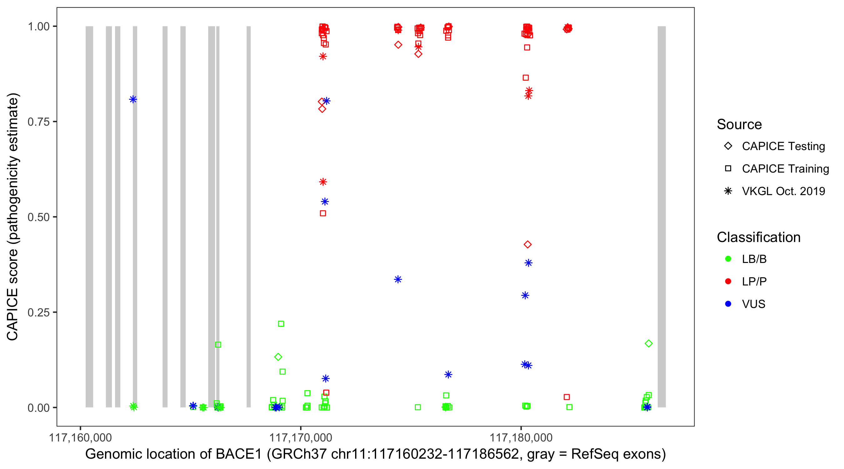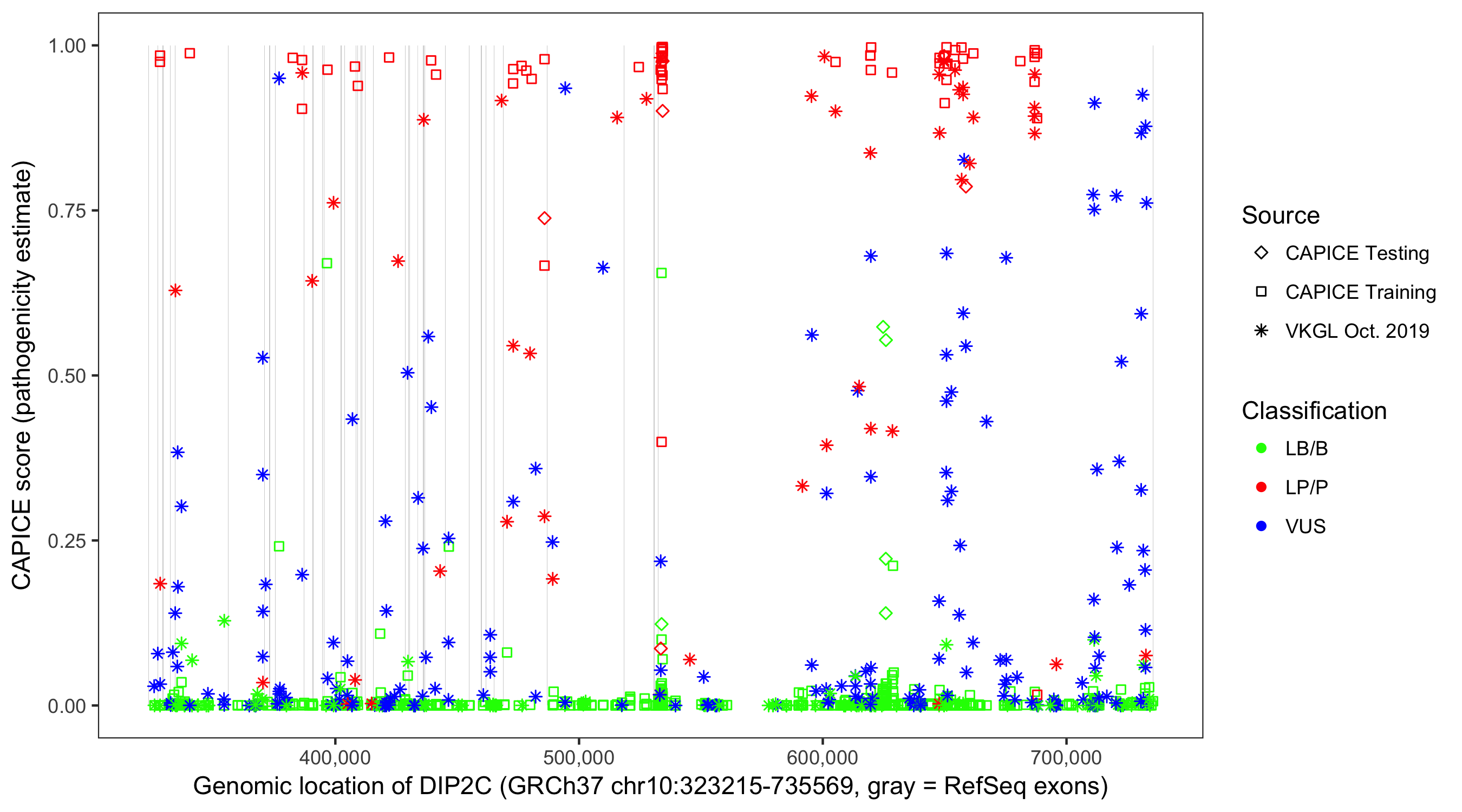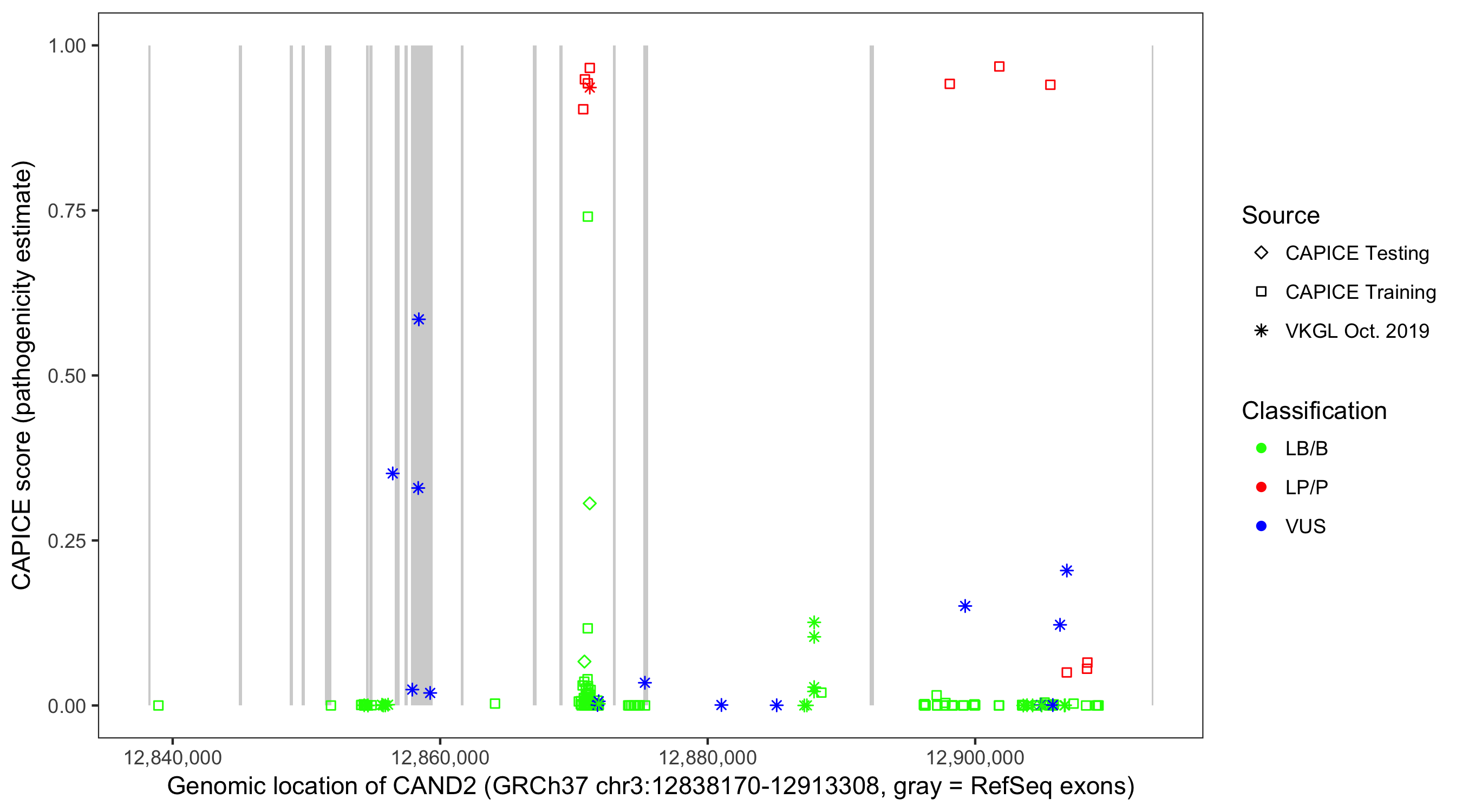 Shown are CAPICE train/test variants plus VKGL Oct 2019.