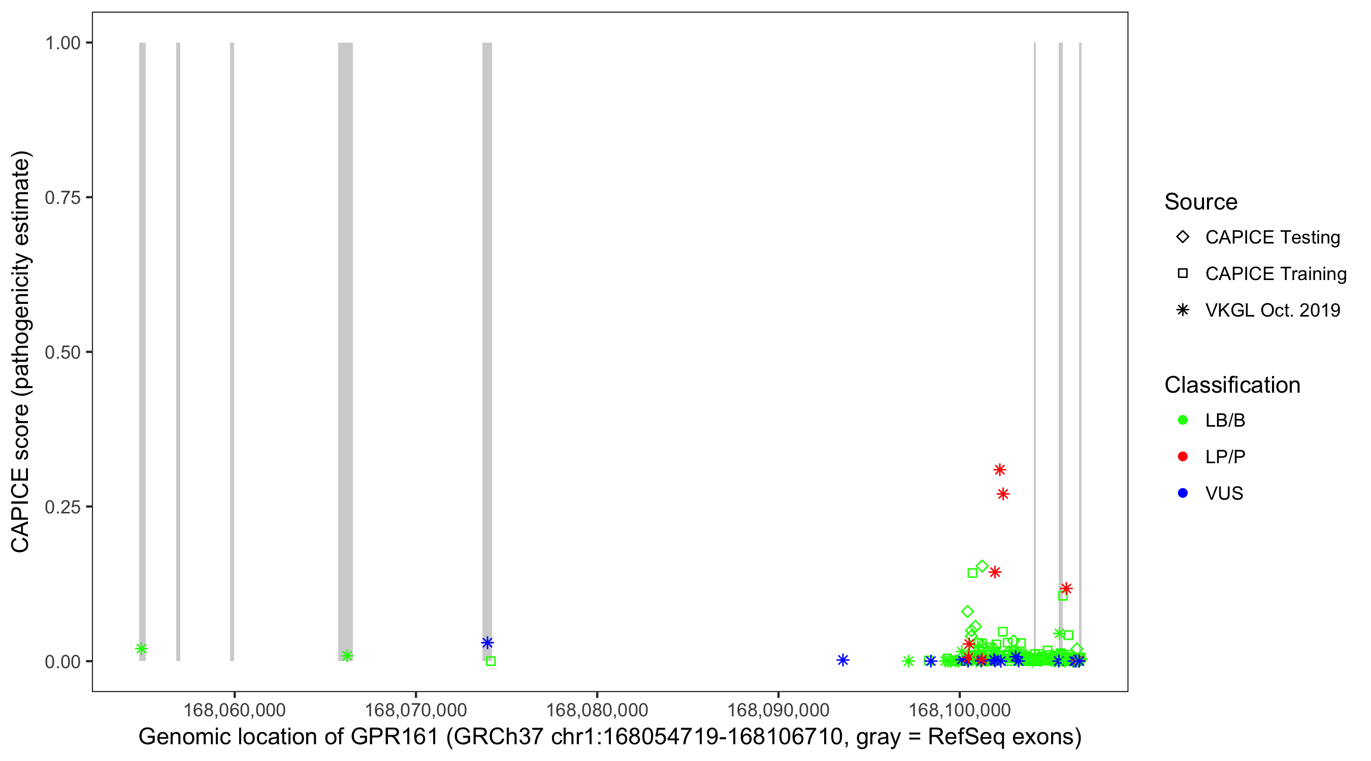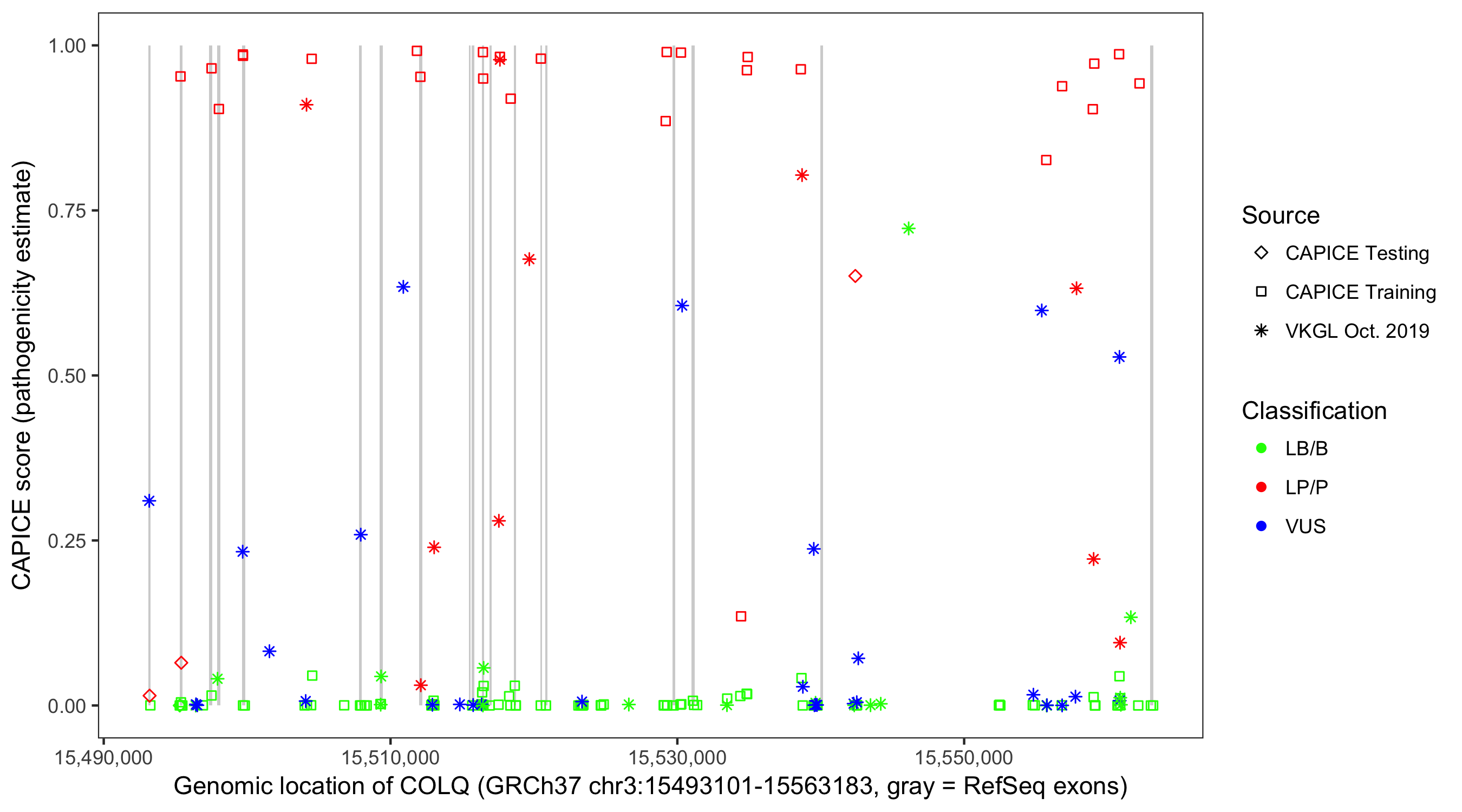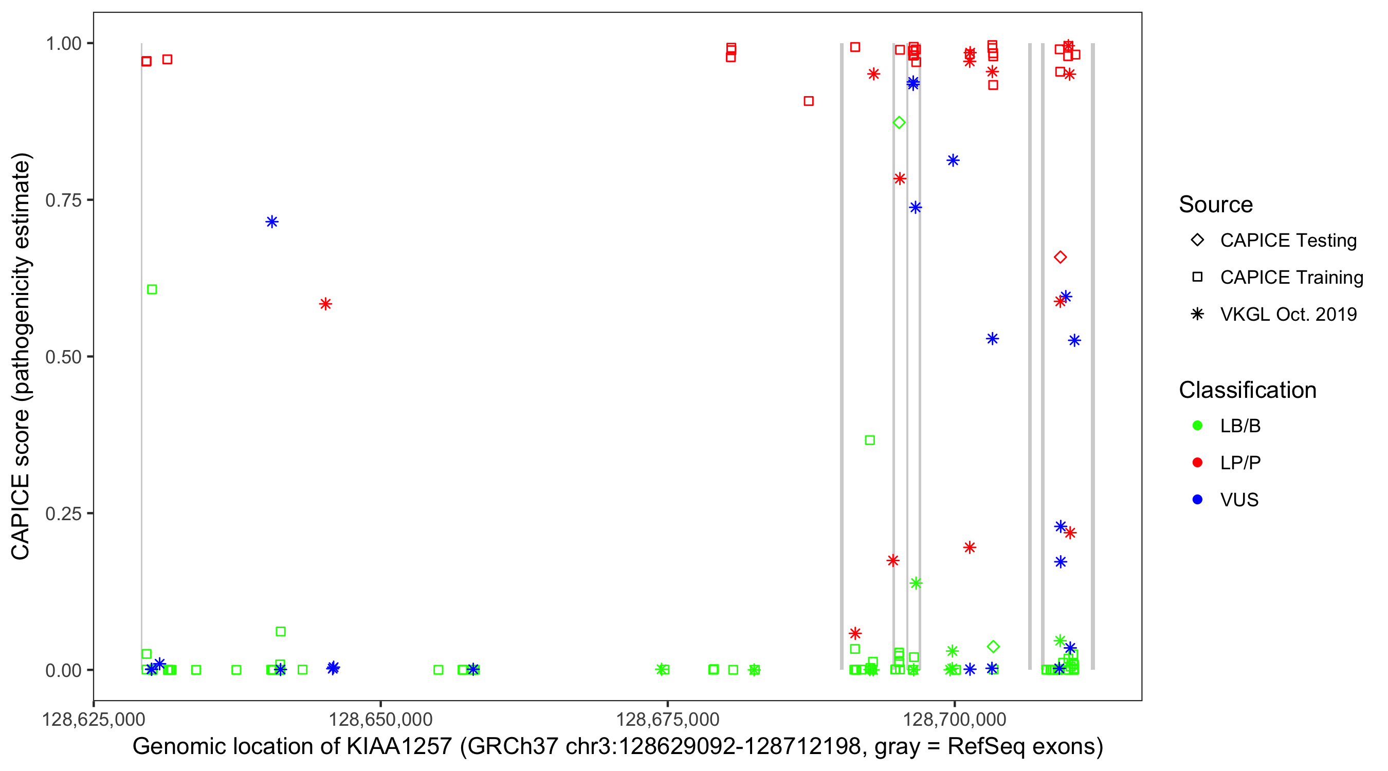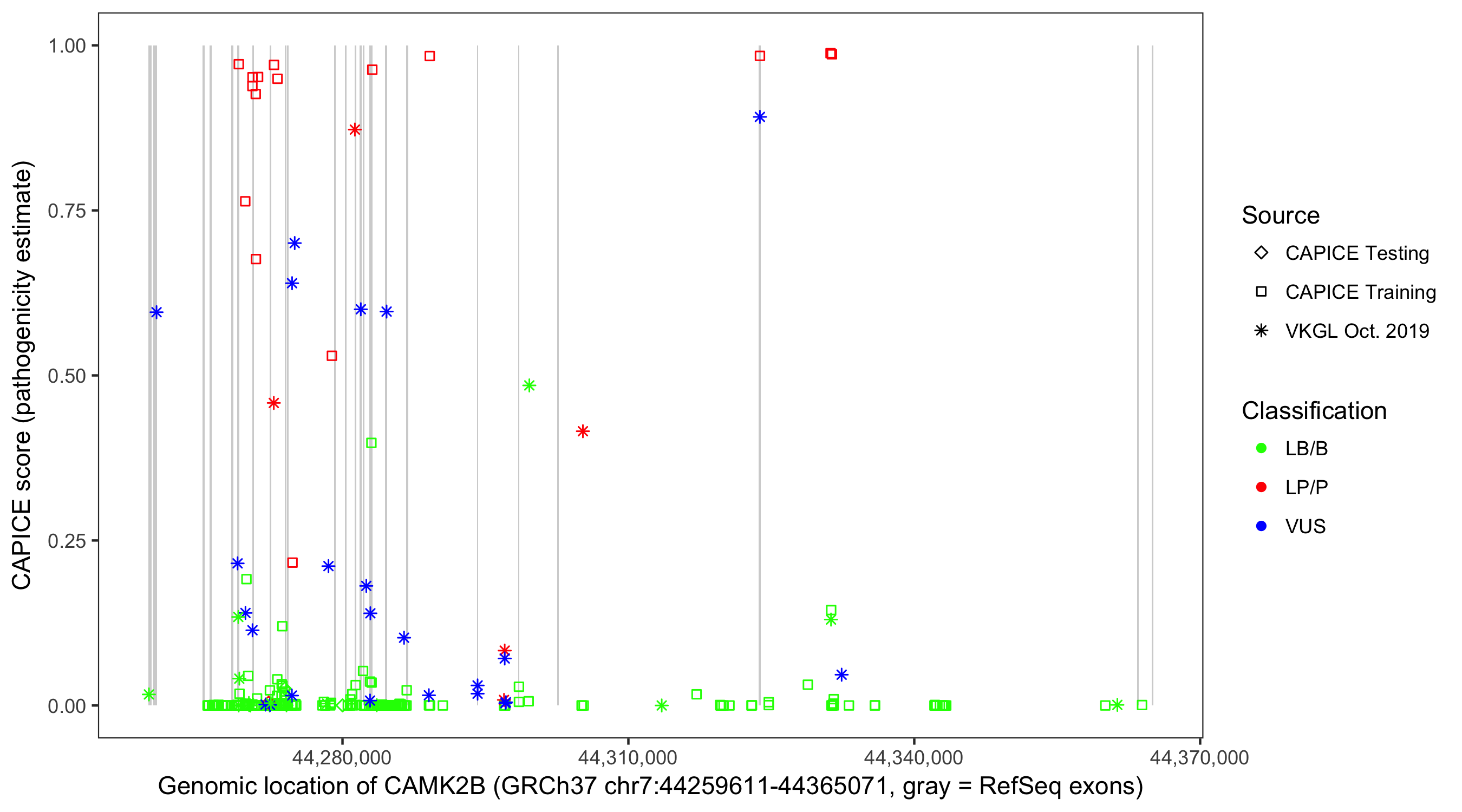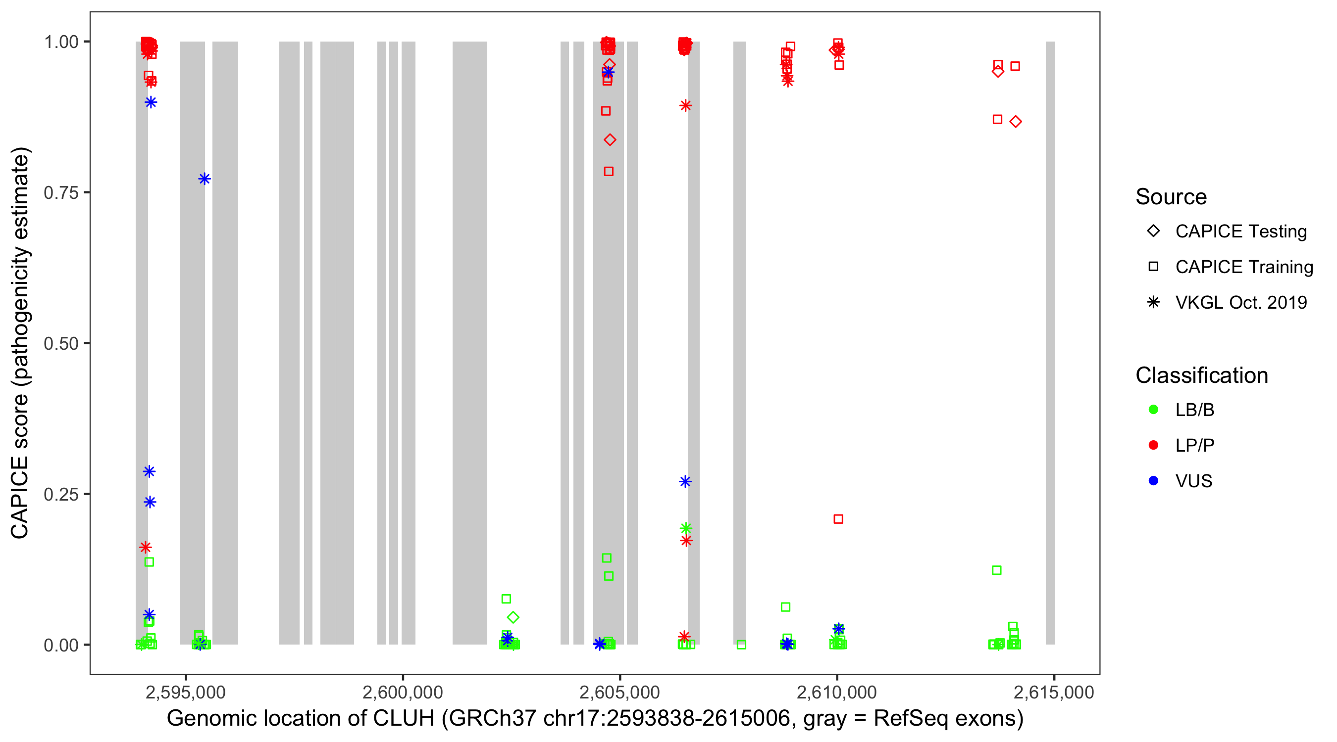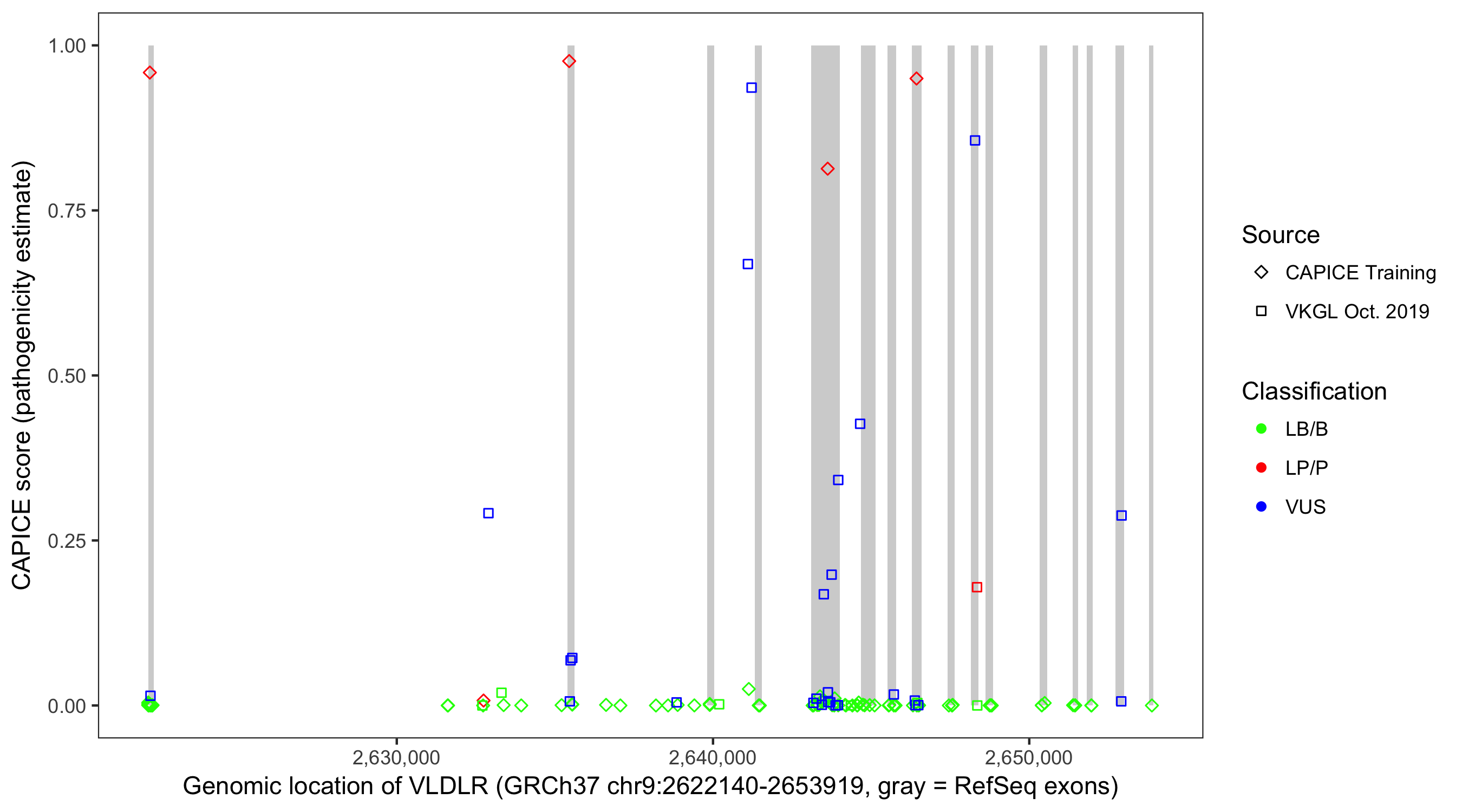 Shown are CAPICE train/test variants plus VKGL Oct 2019.