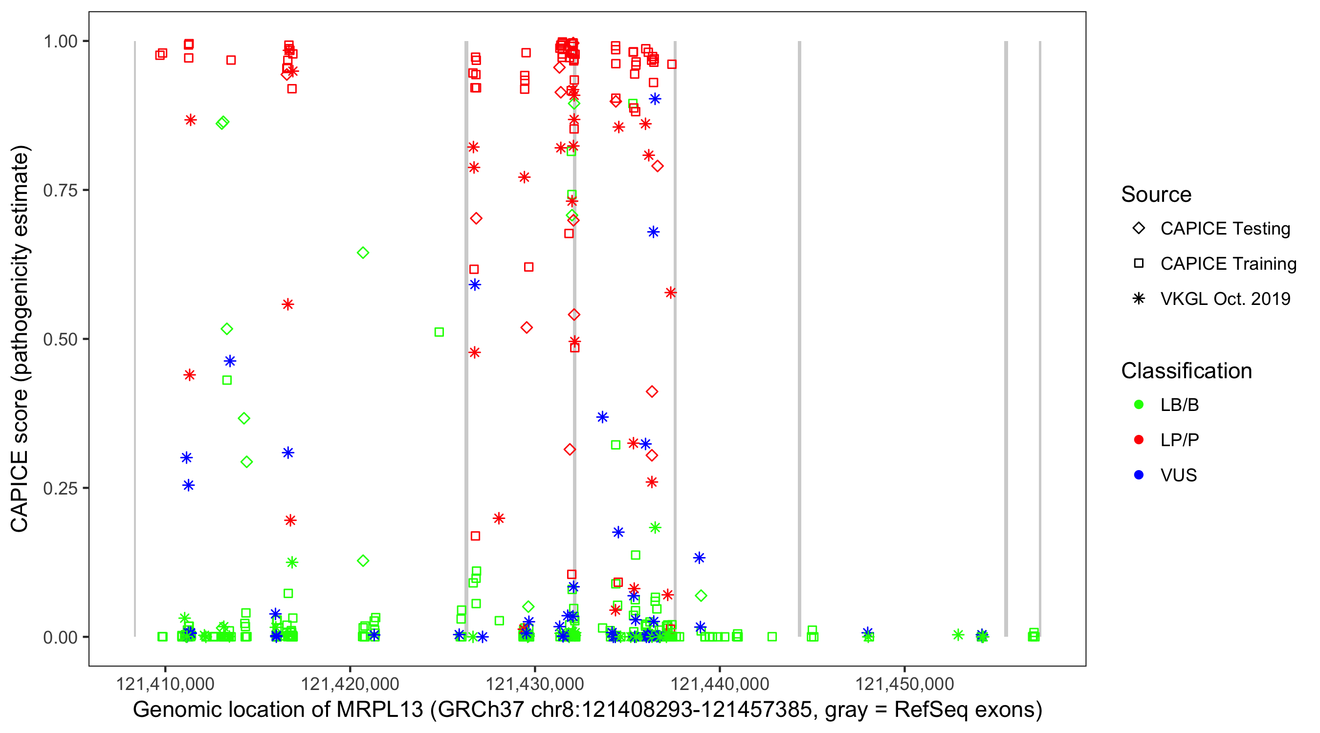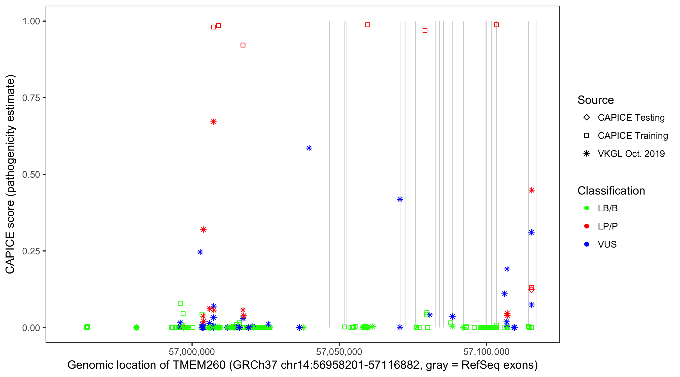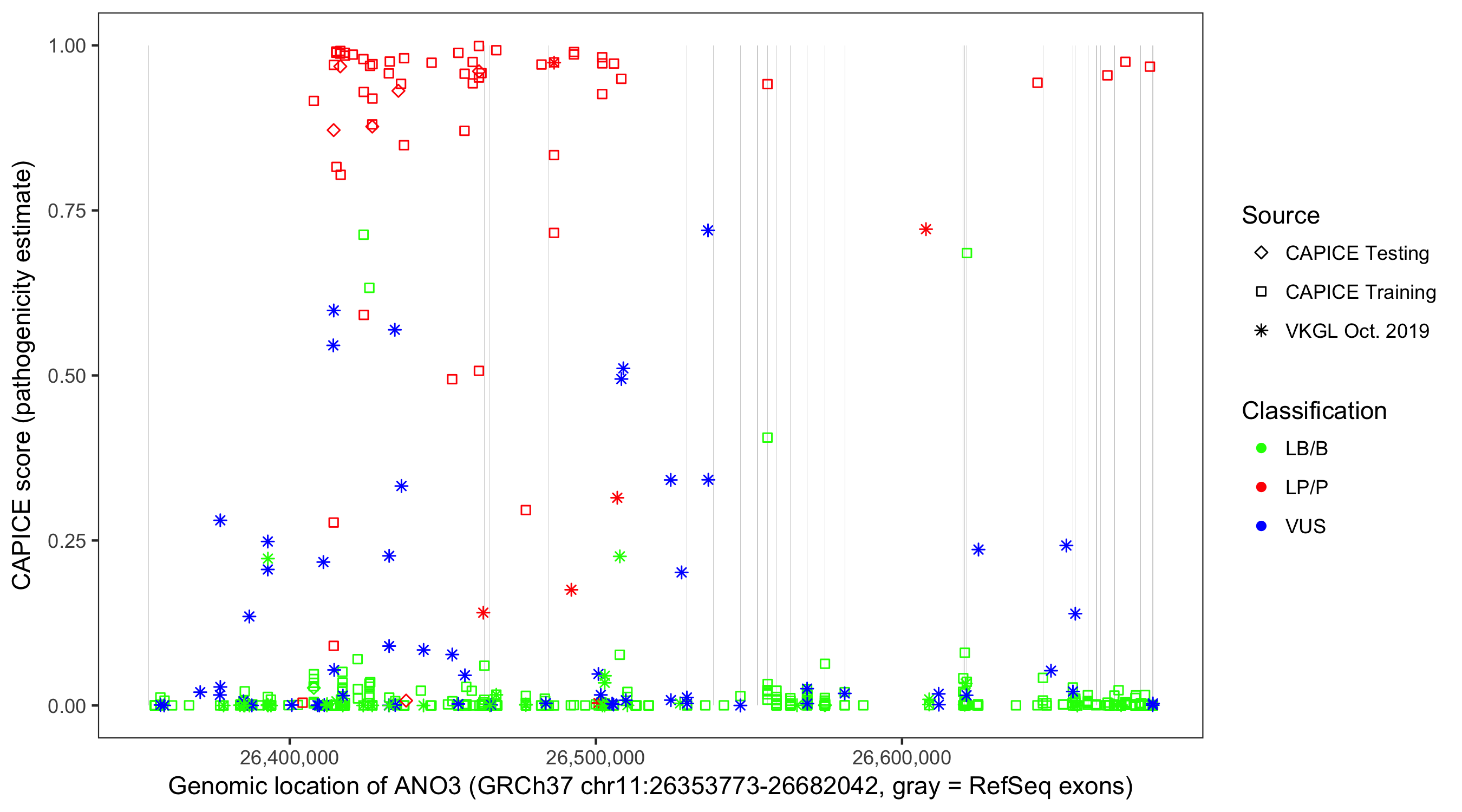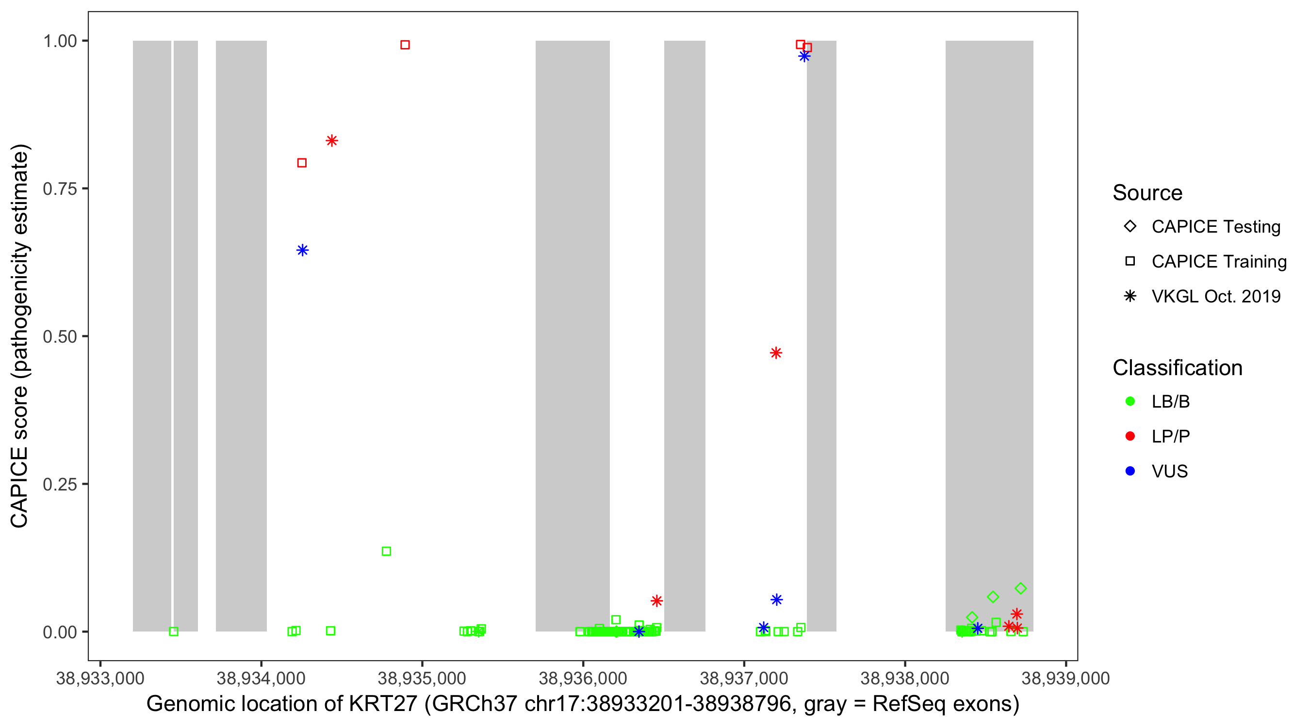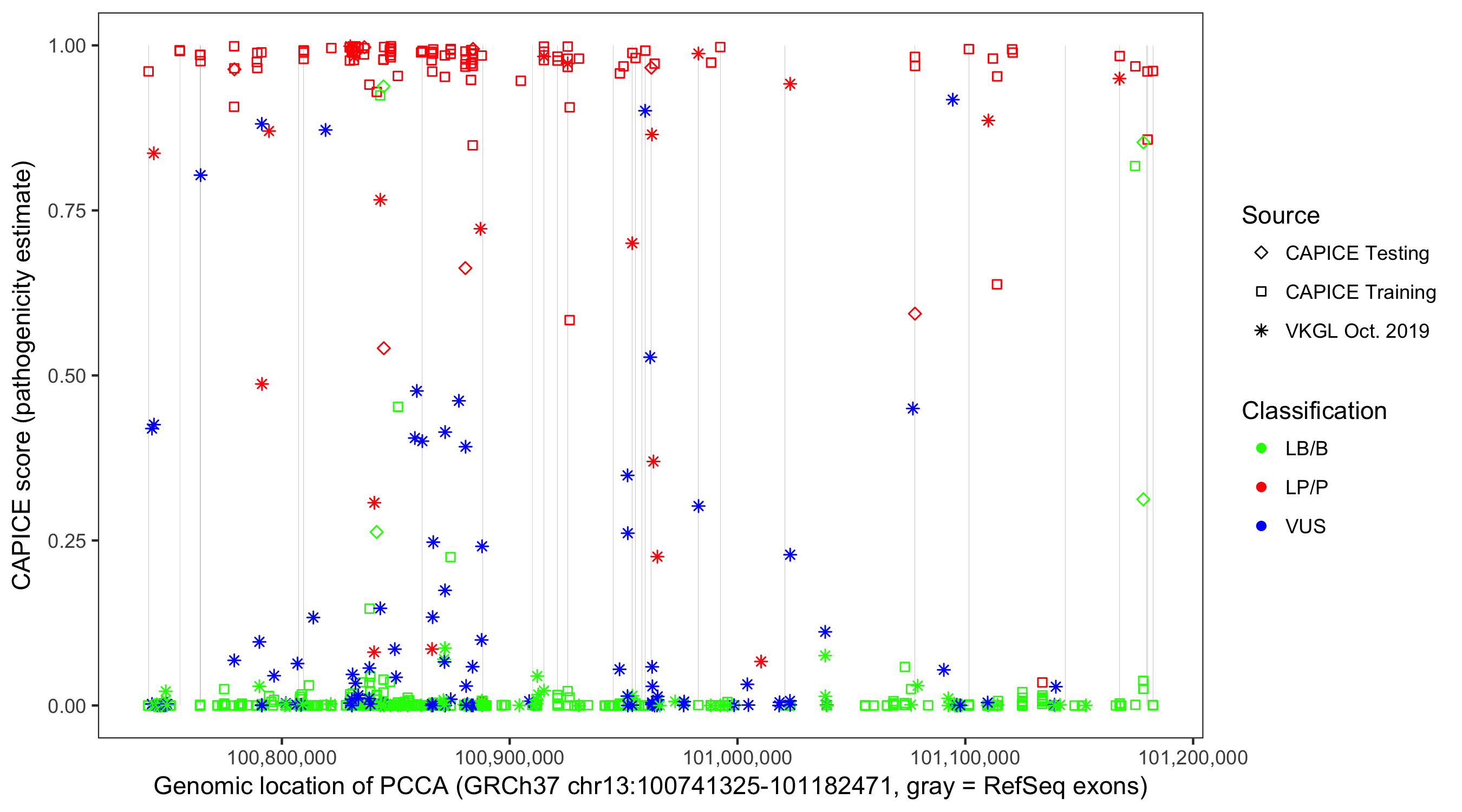 Shown are CAPICE train/test variants plus VKGL Oct 2019.