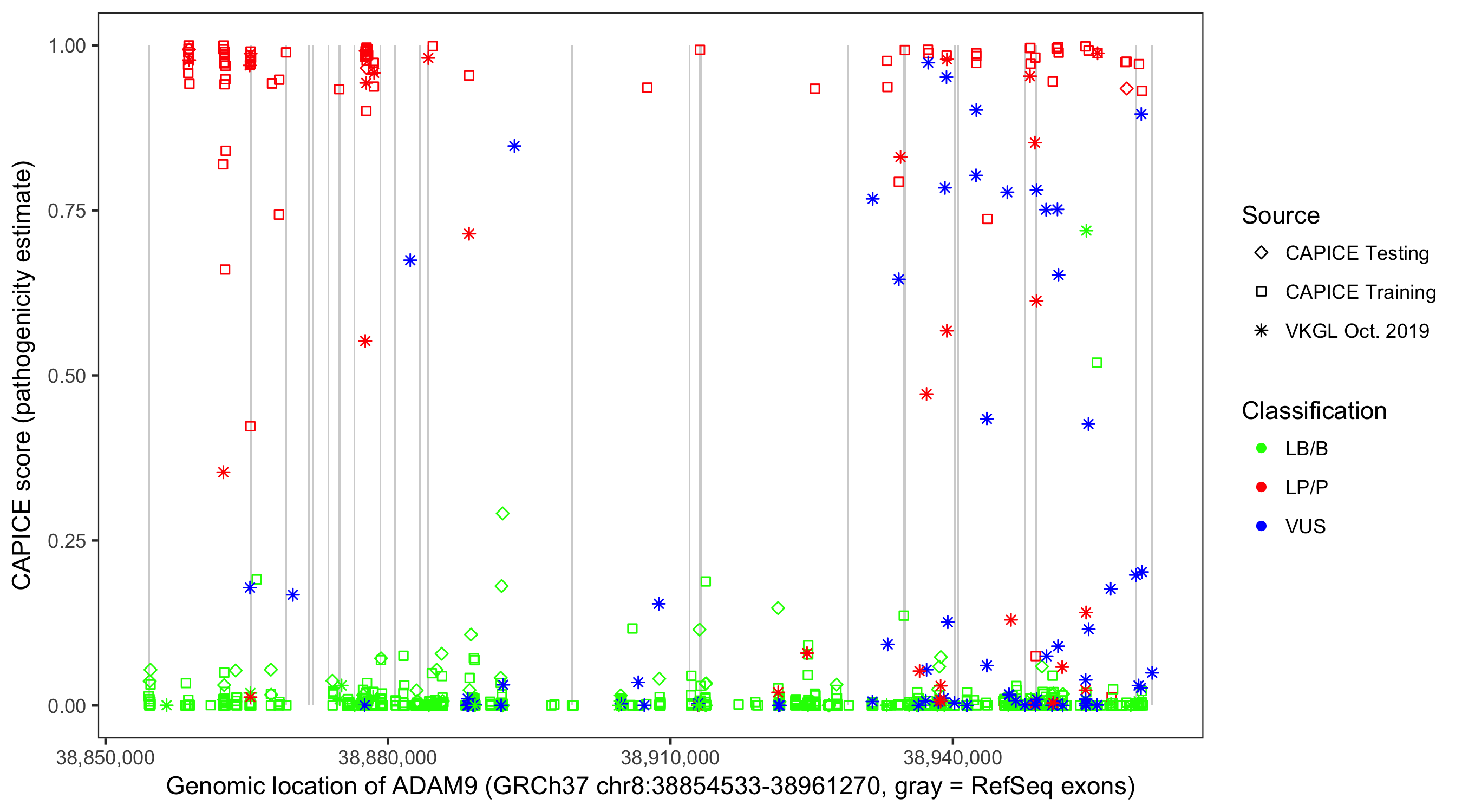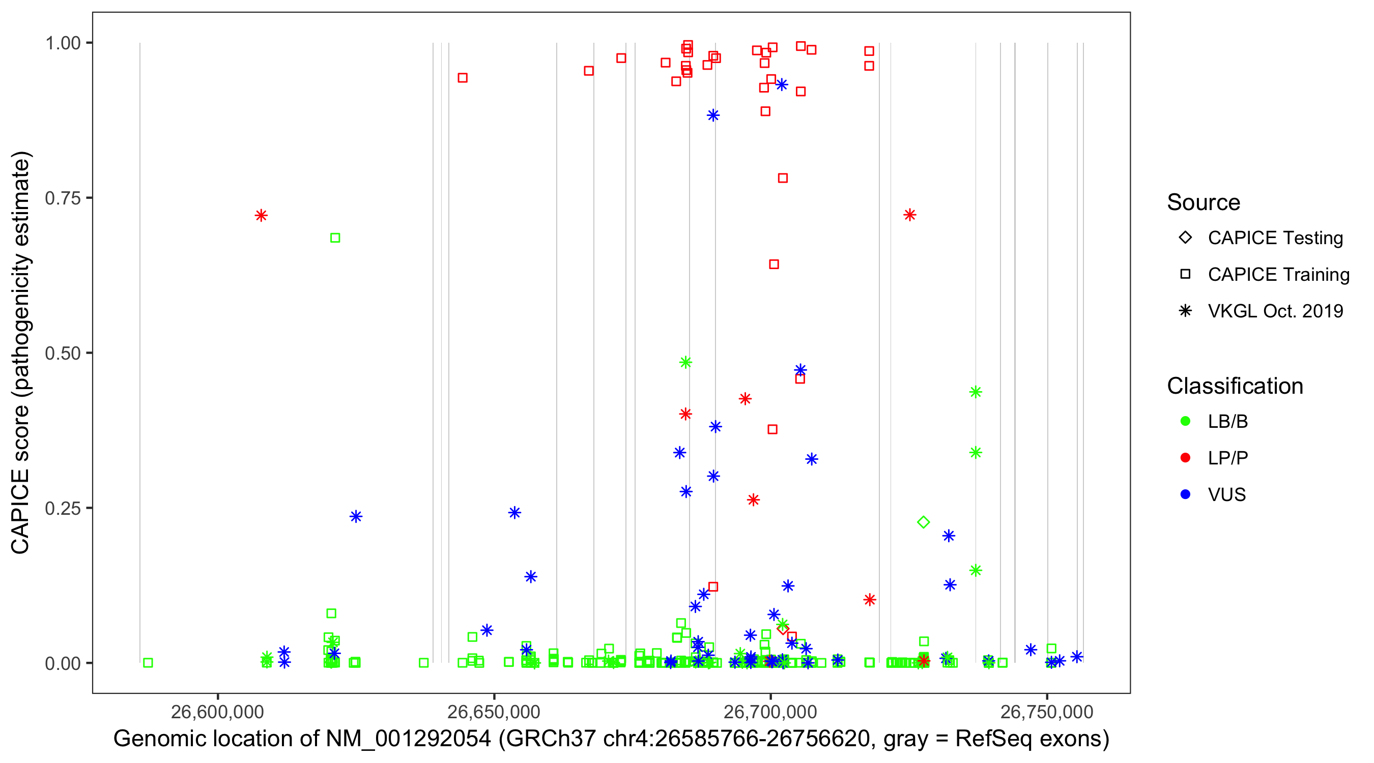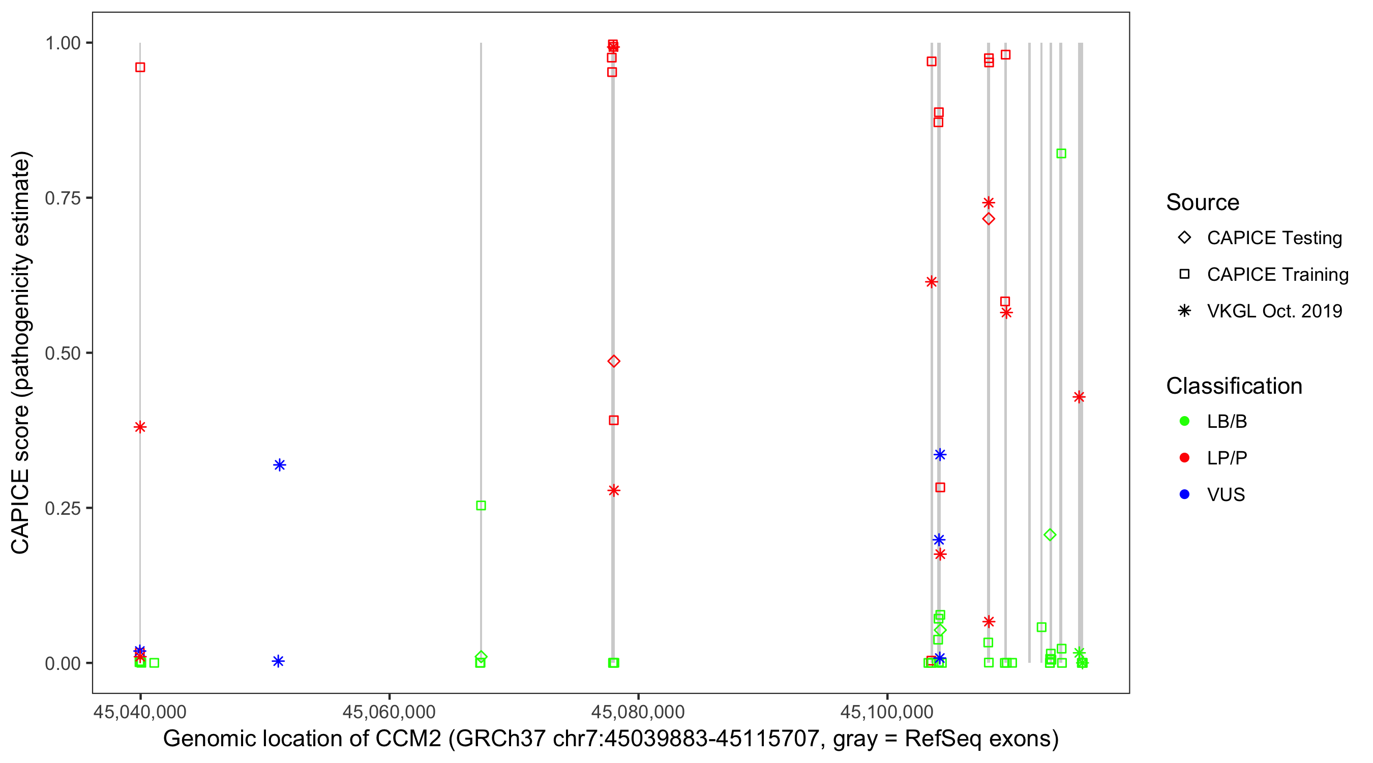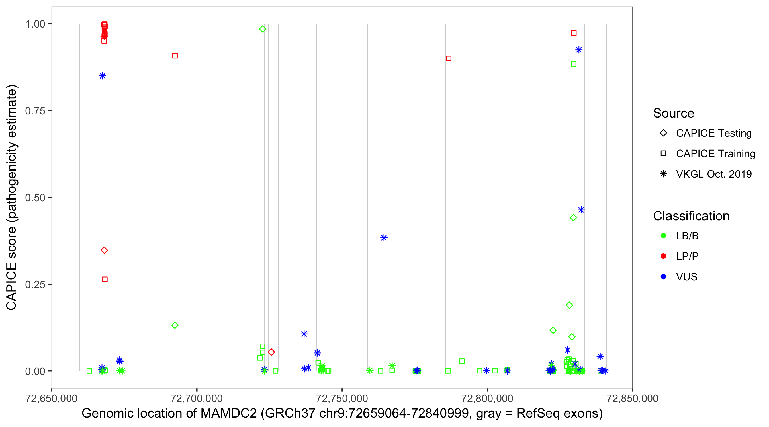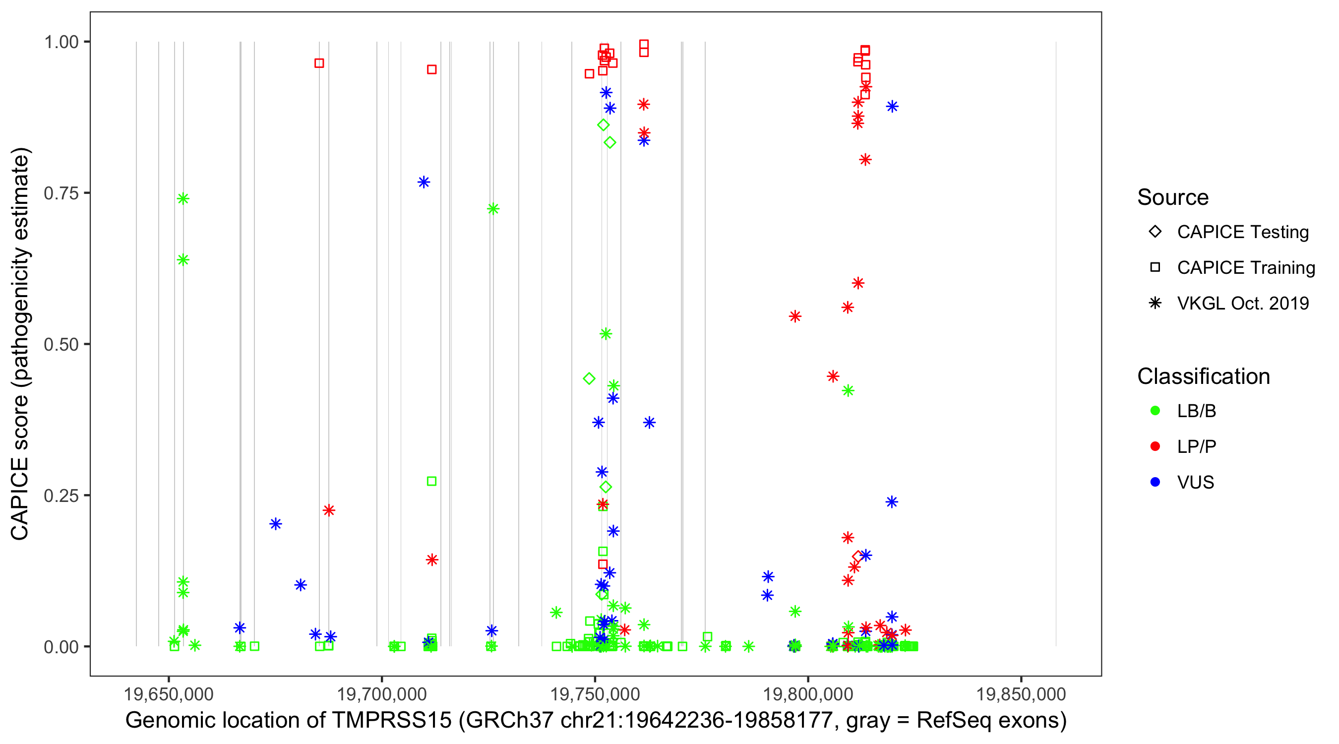 Shown are CAPICE train/test variants plus VKGL Oct 2019.