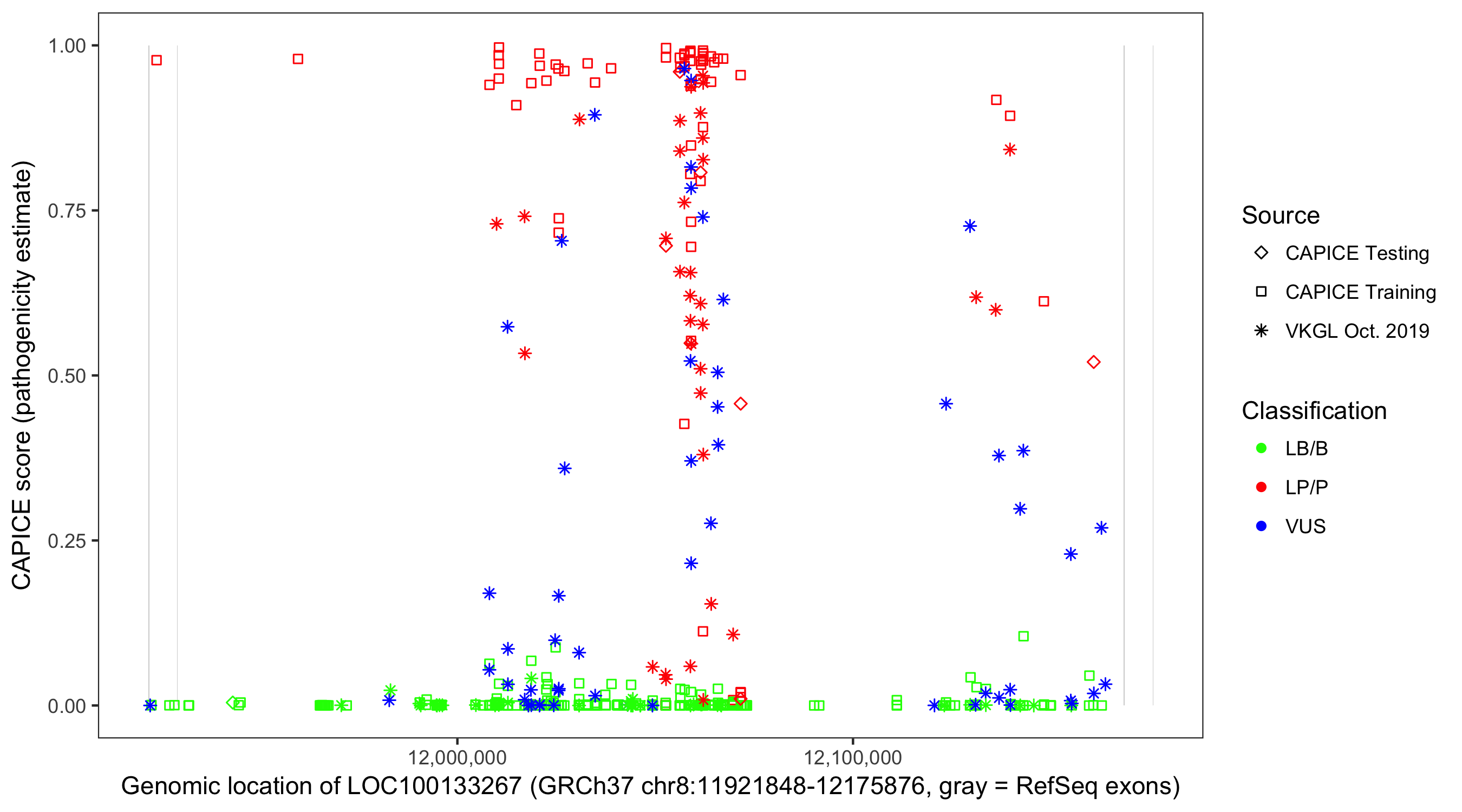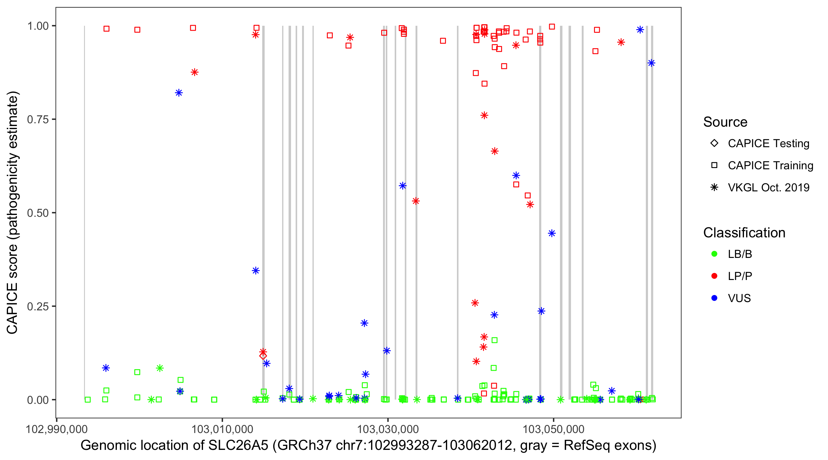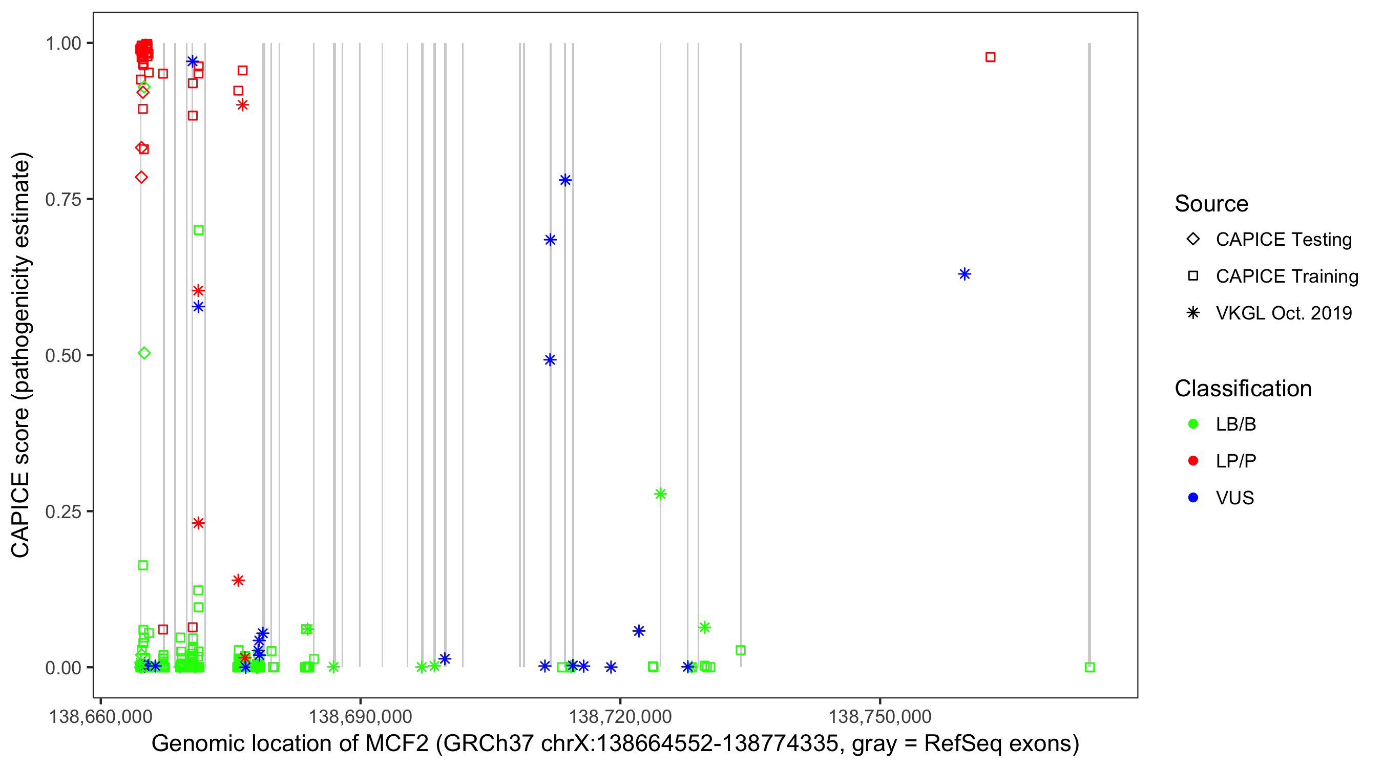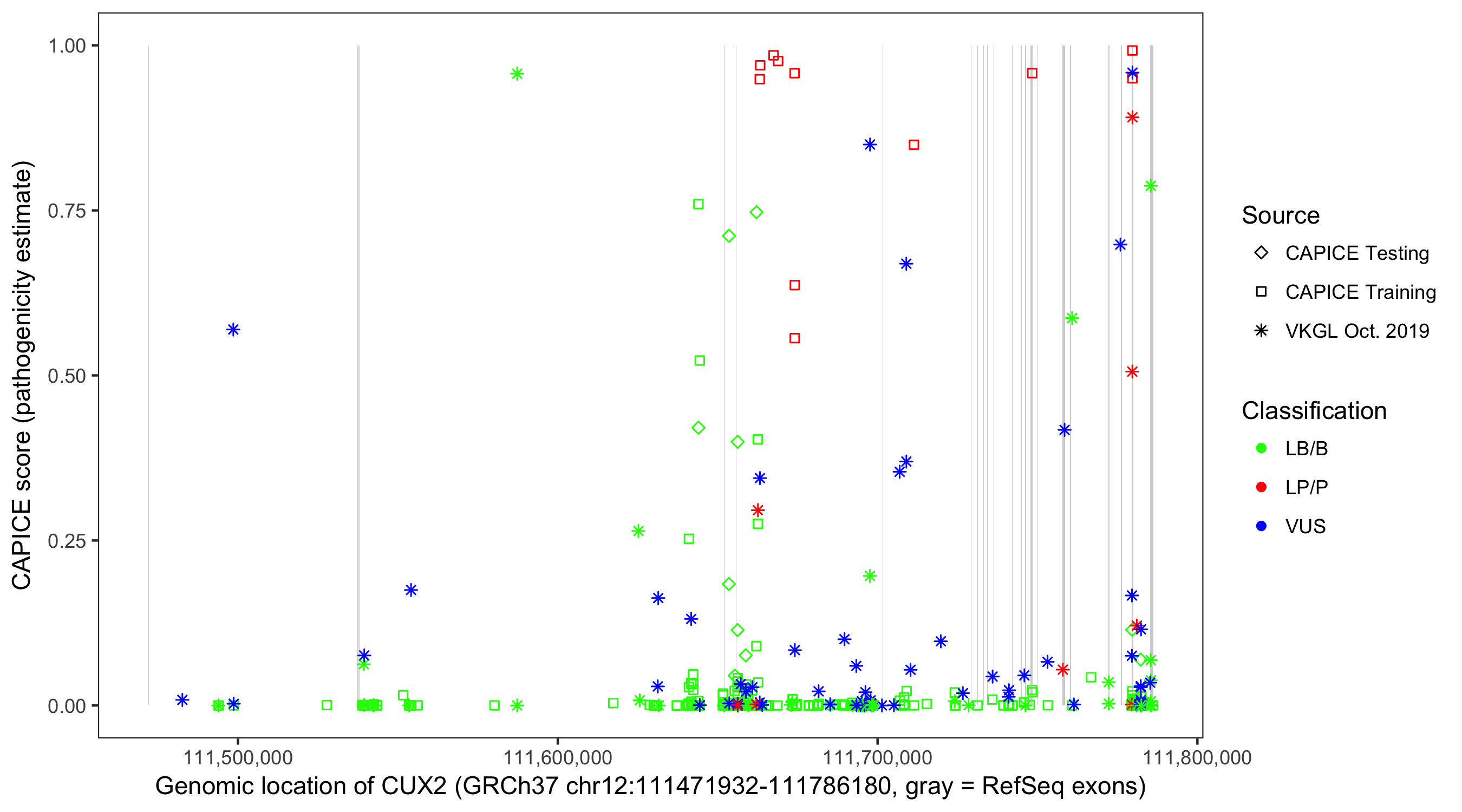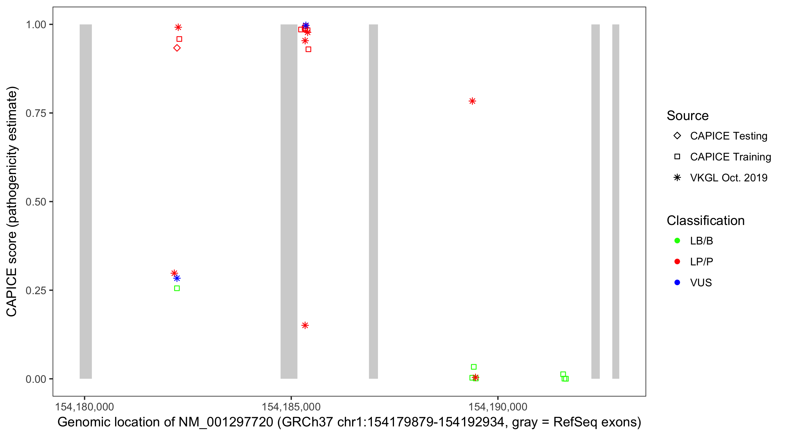 Shown are CAPICE train/test variants plus VKGL Oct 2019.