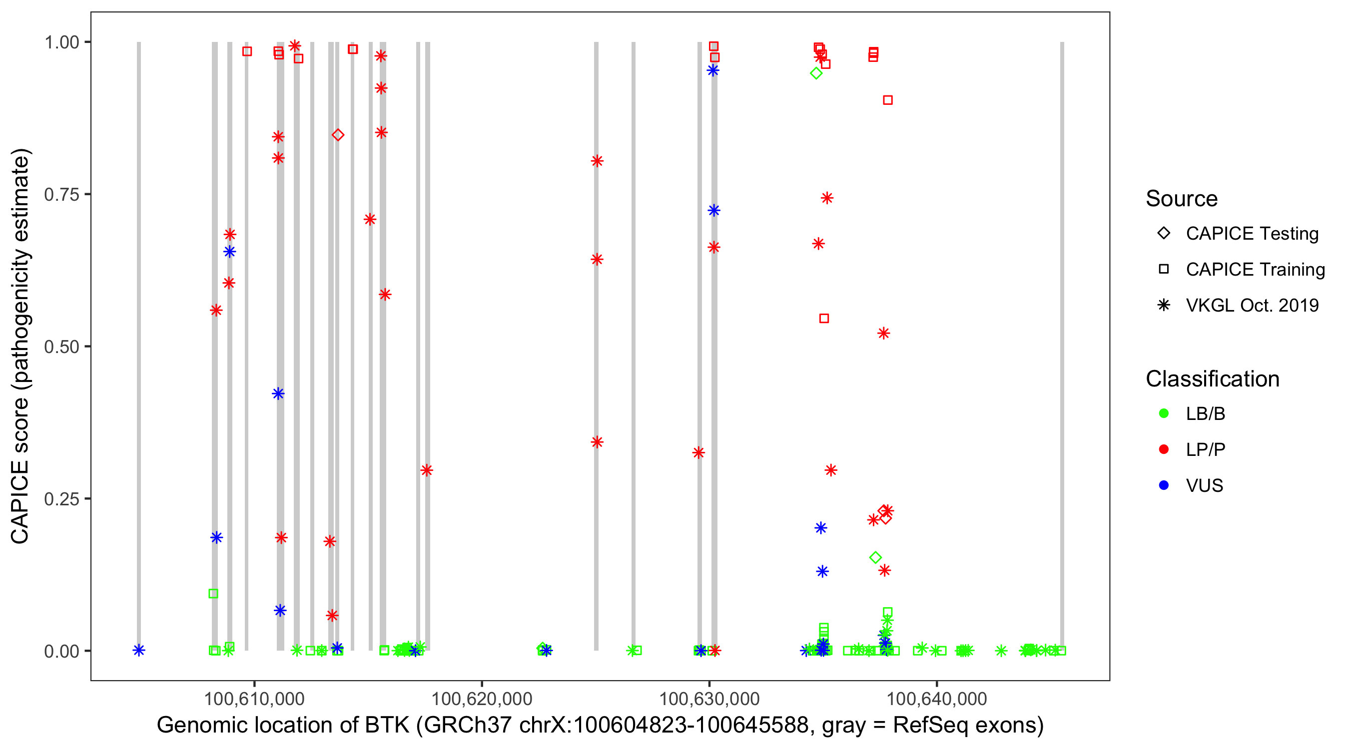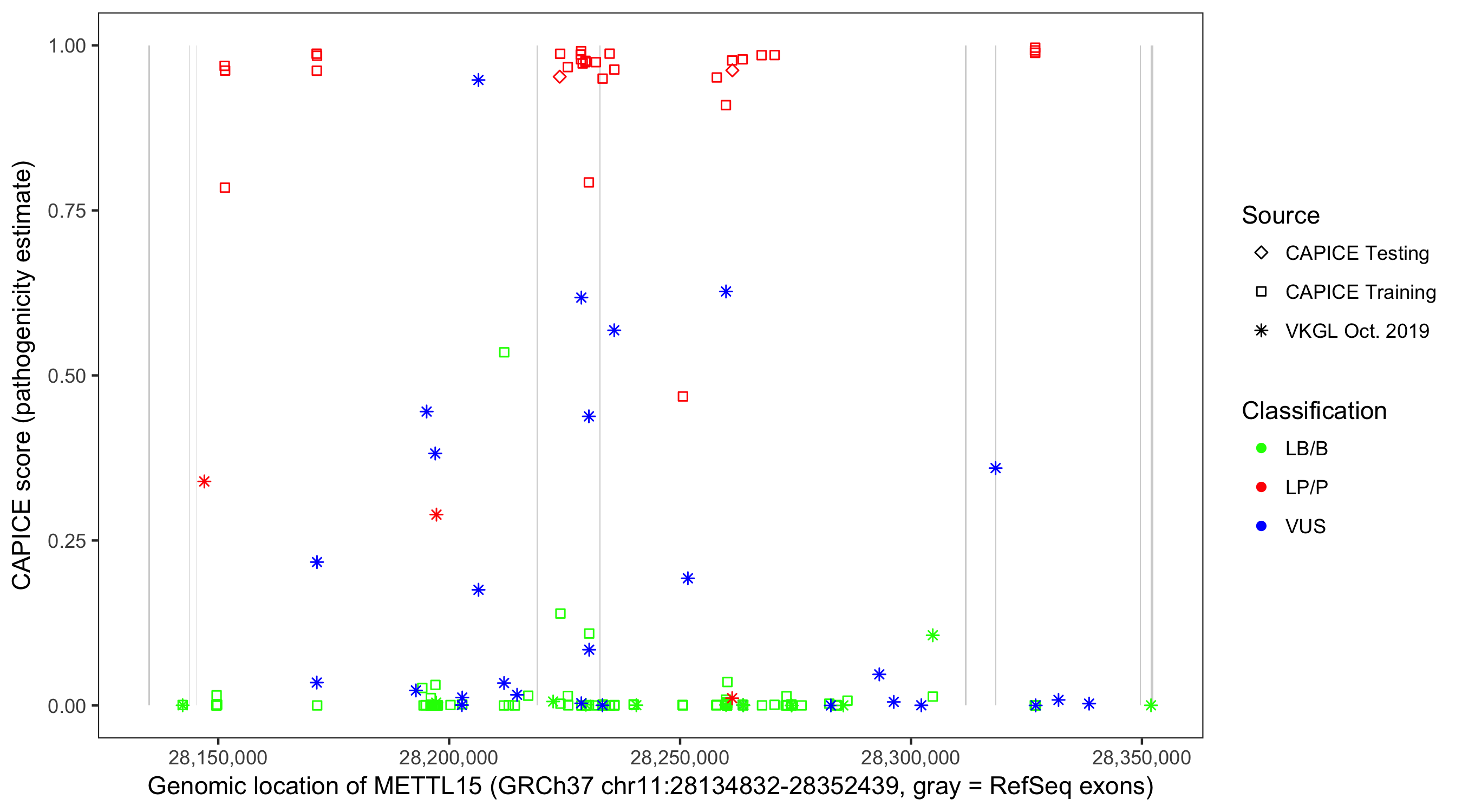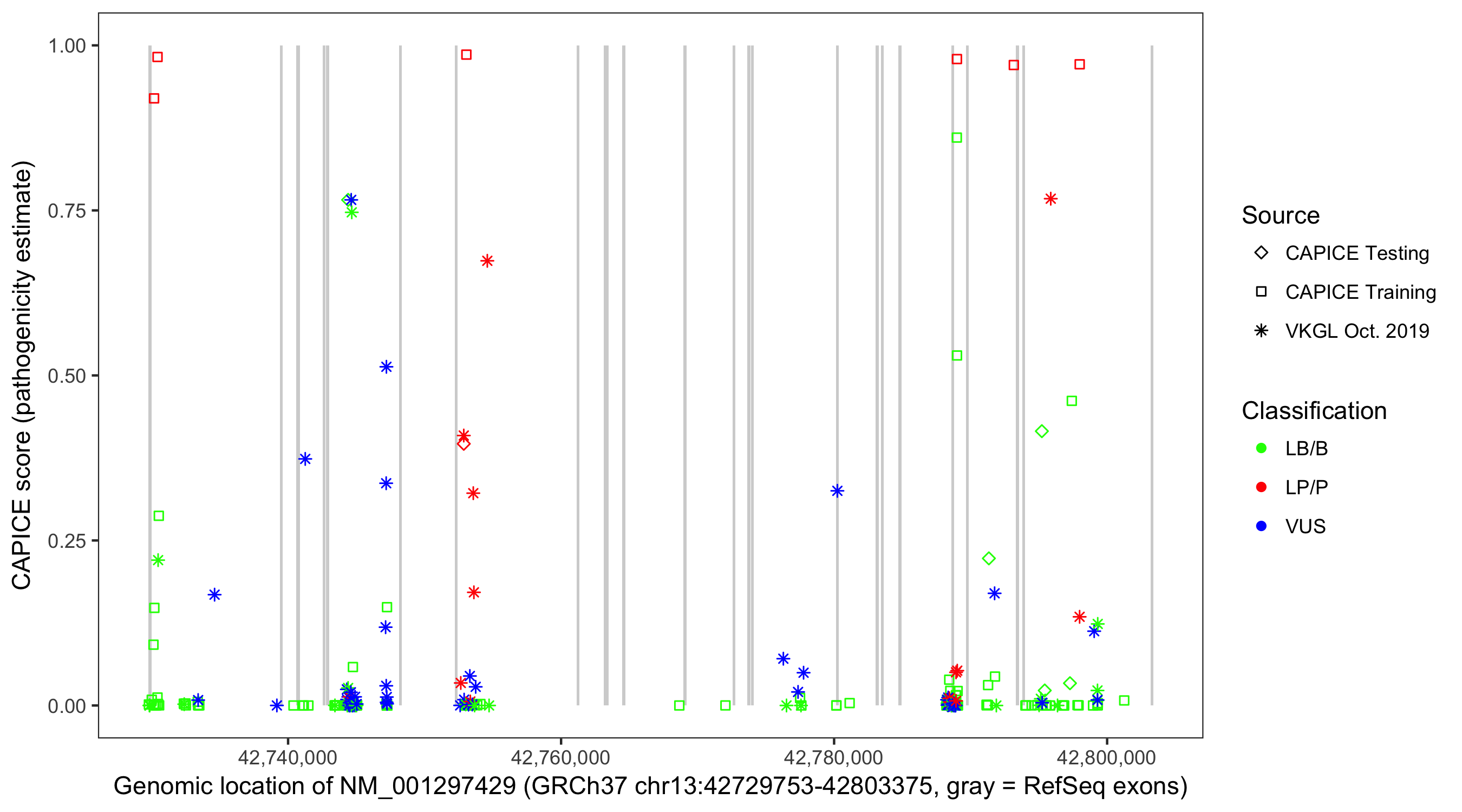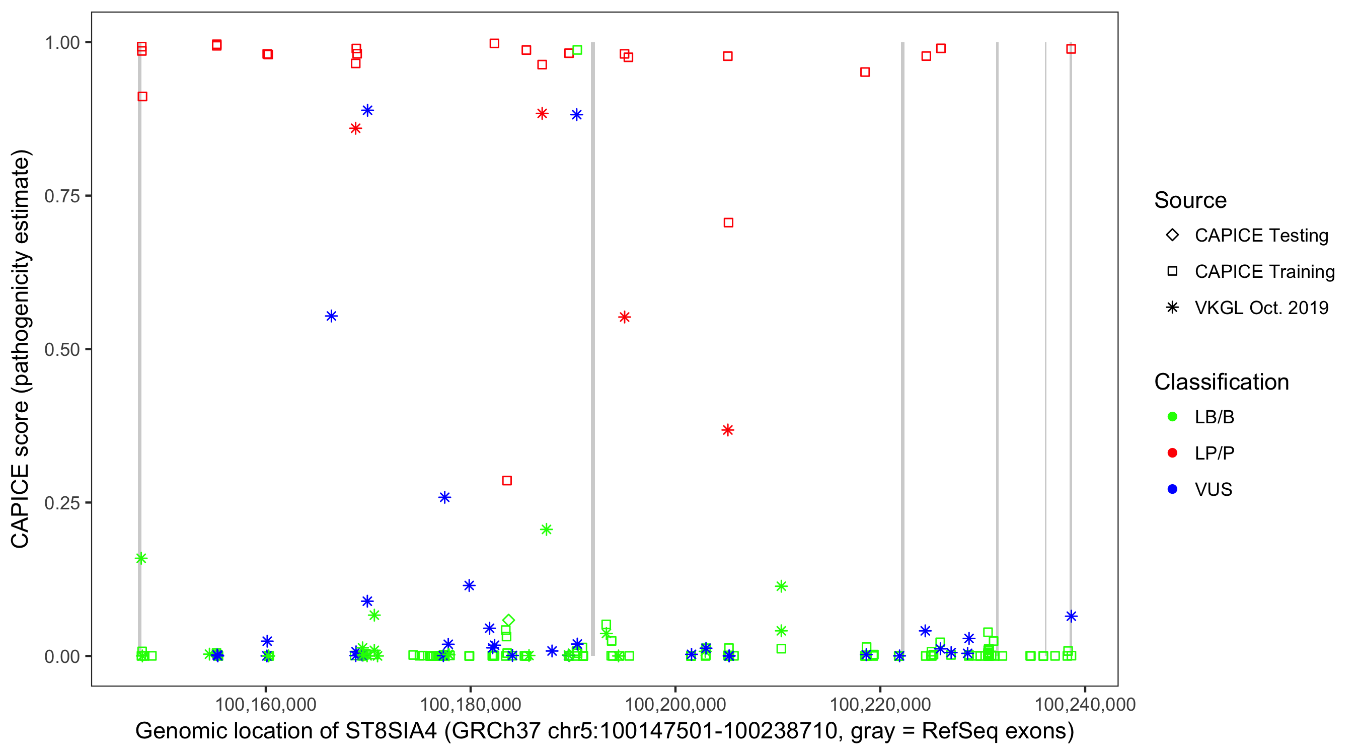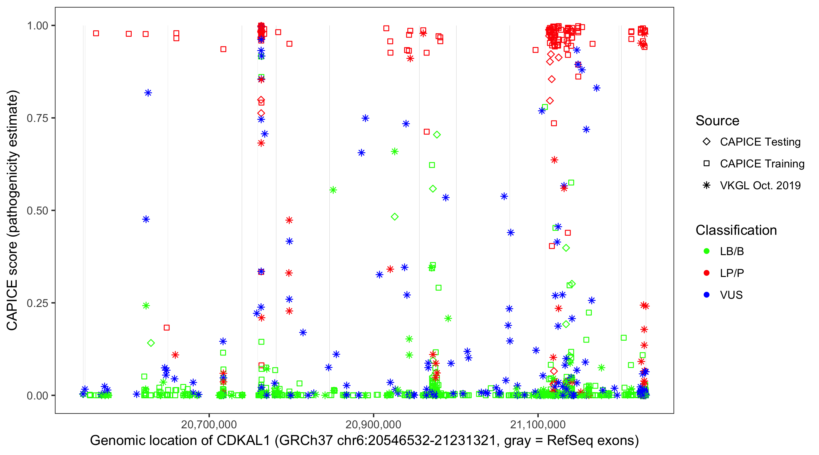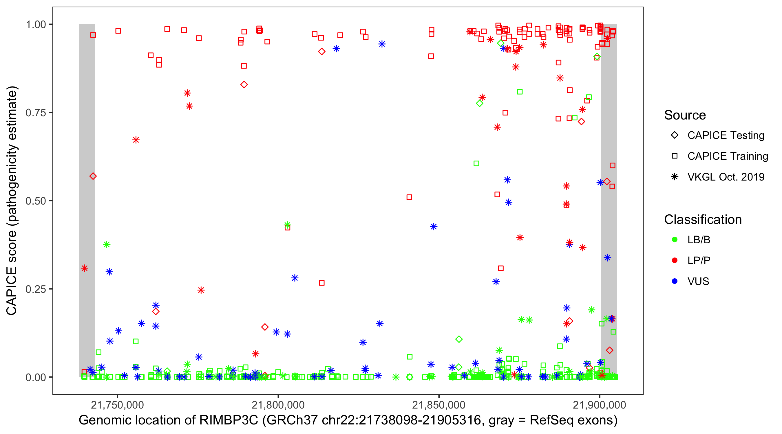 Shown are CAPICE train/test variants plus VKGL Oct 2019.