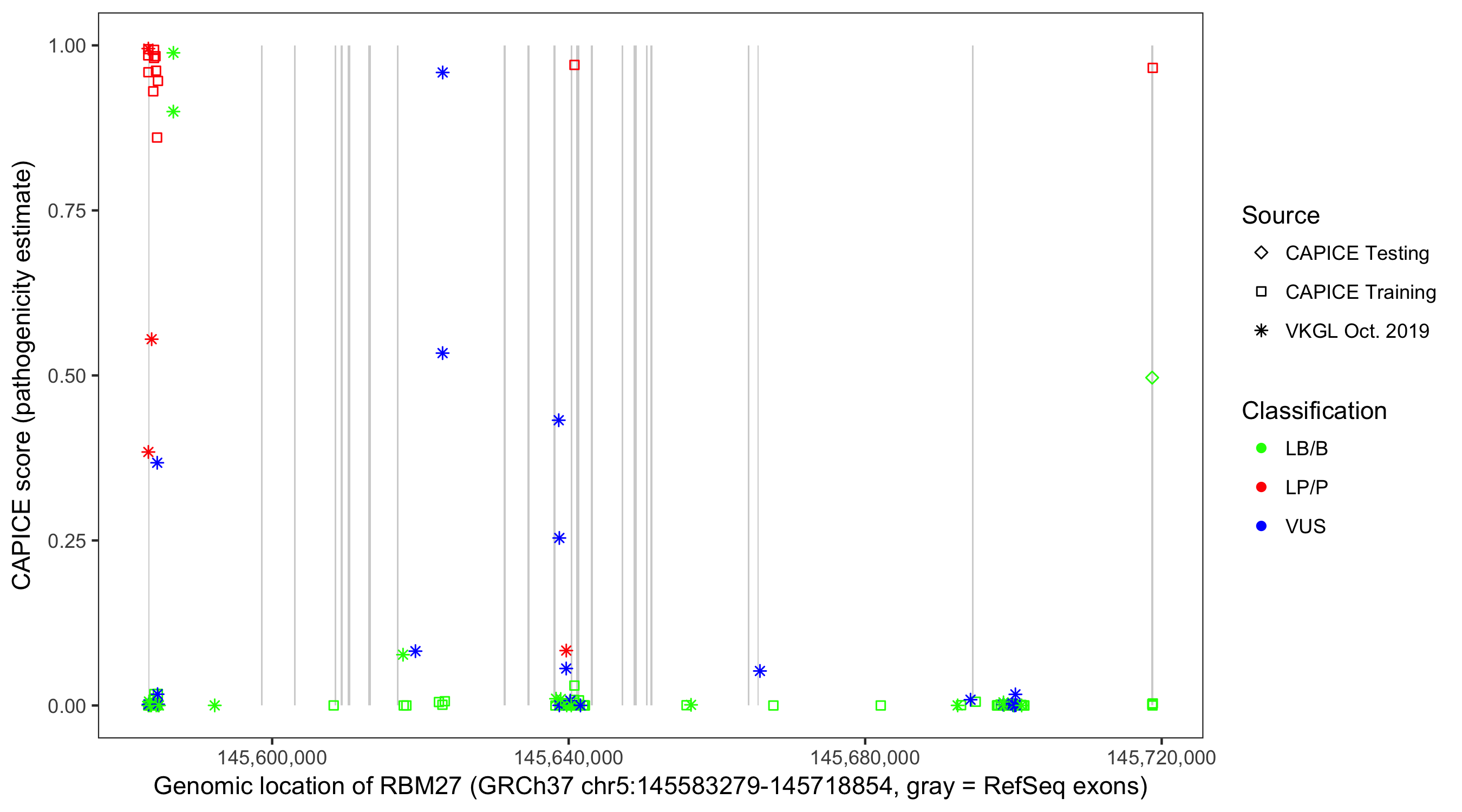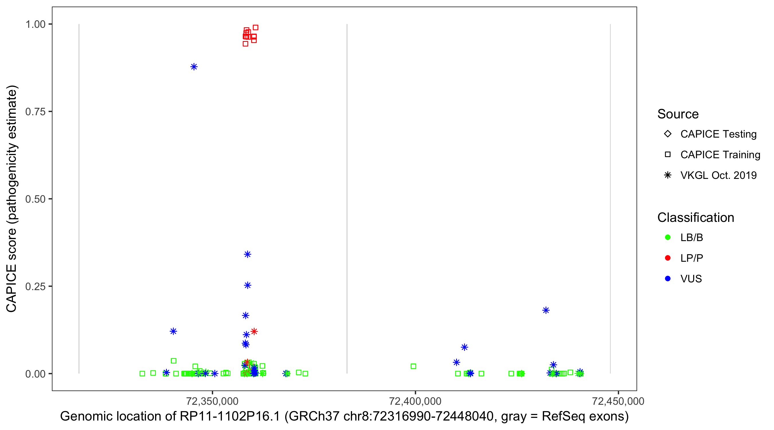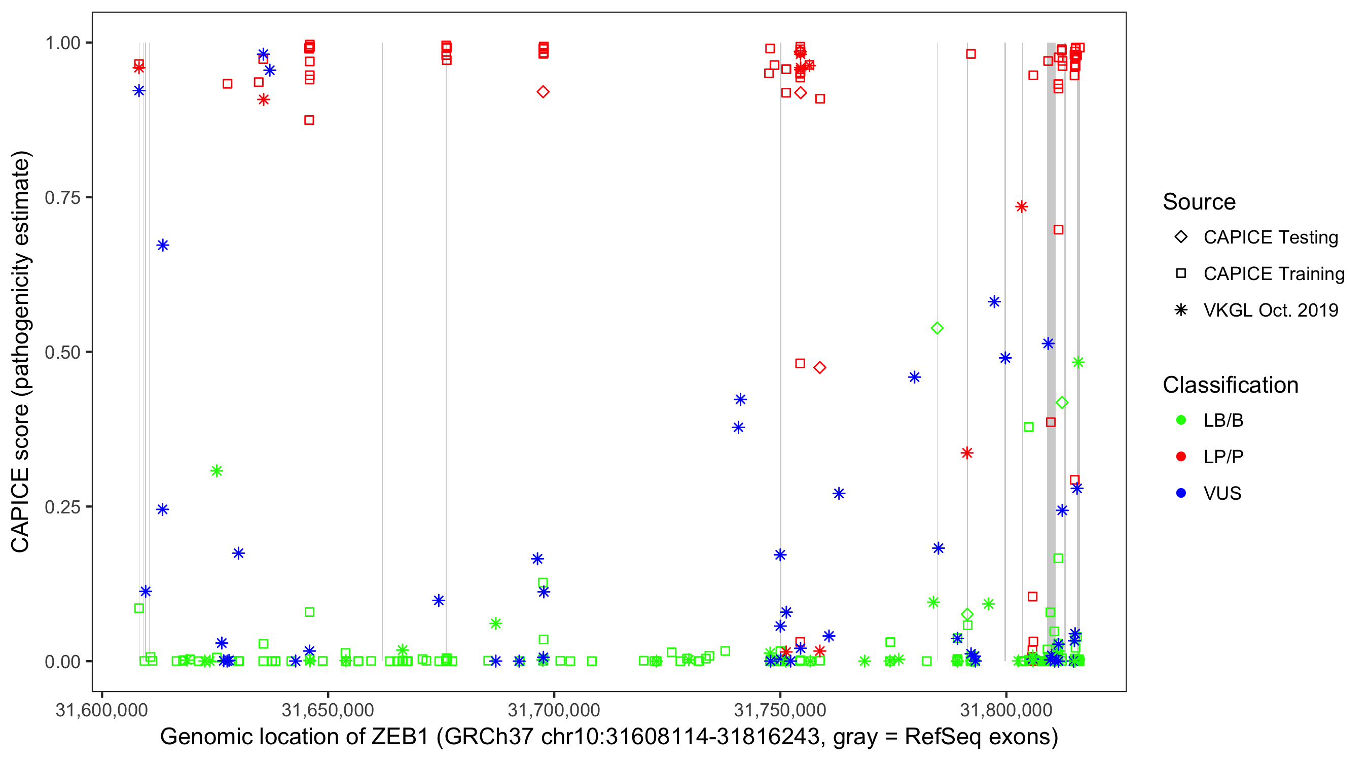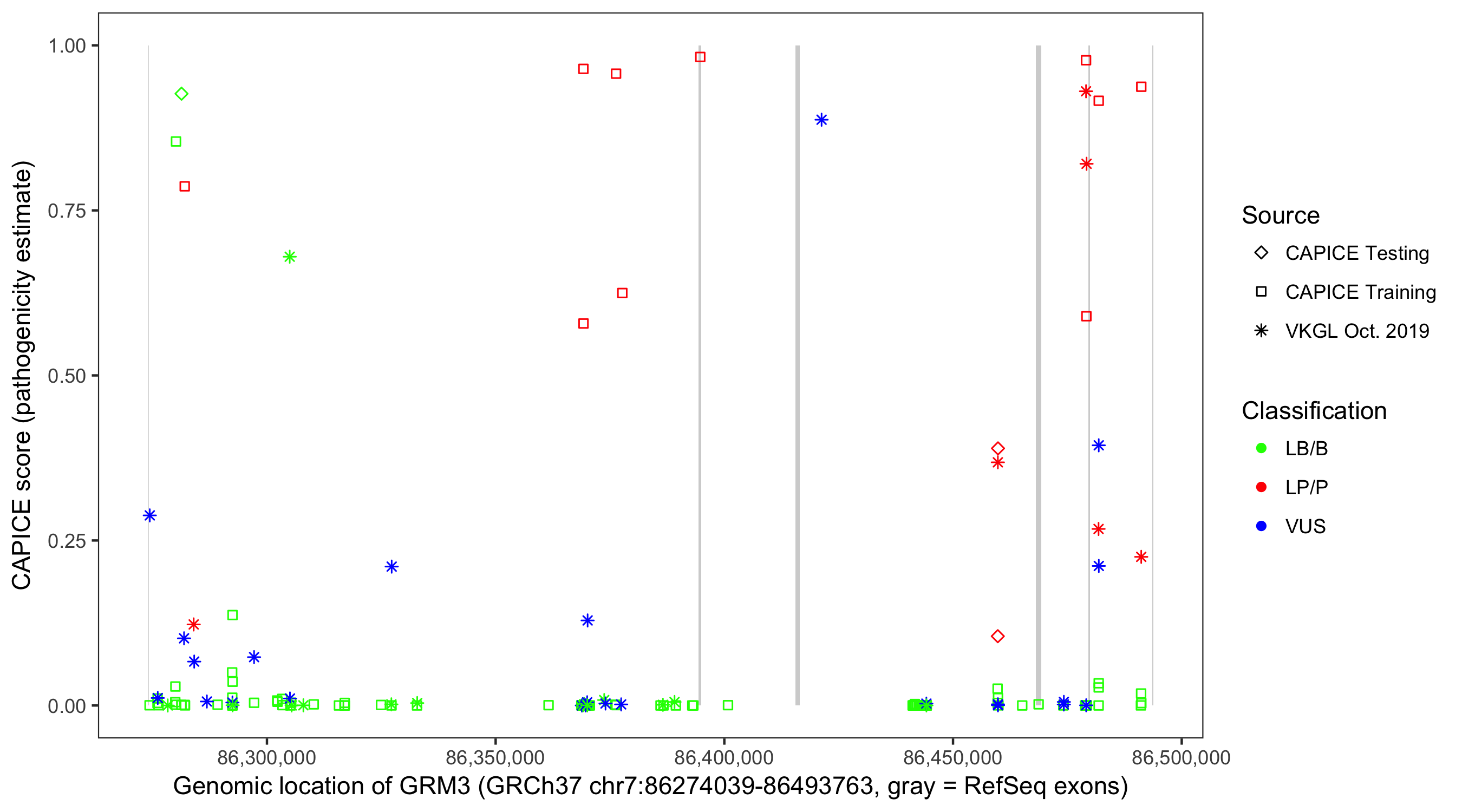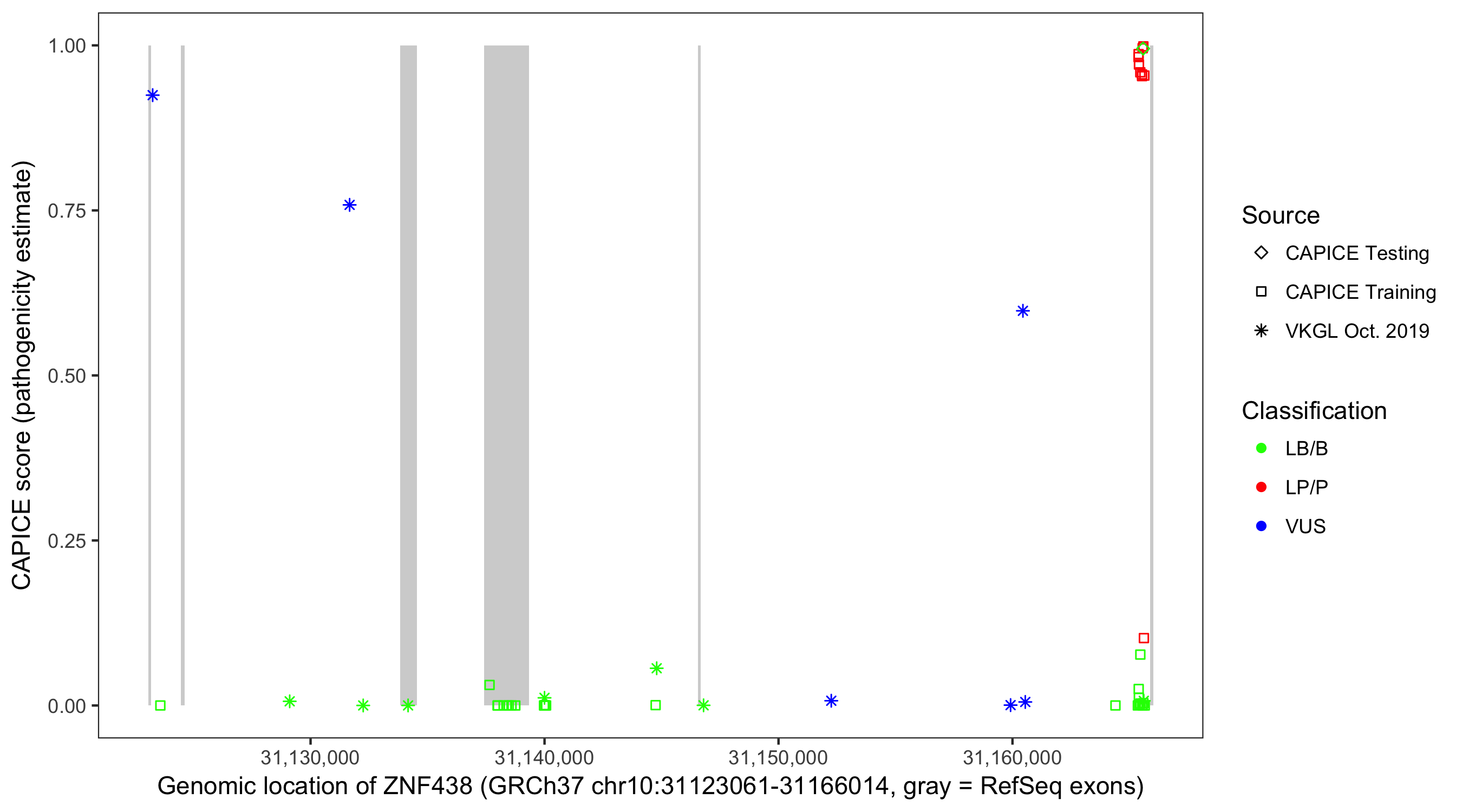 Shown are CAPICE train/test variants plus VKGL Oct 2019.