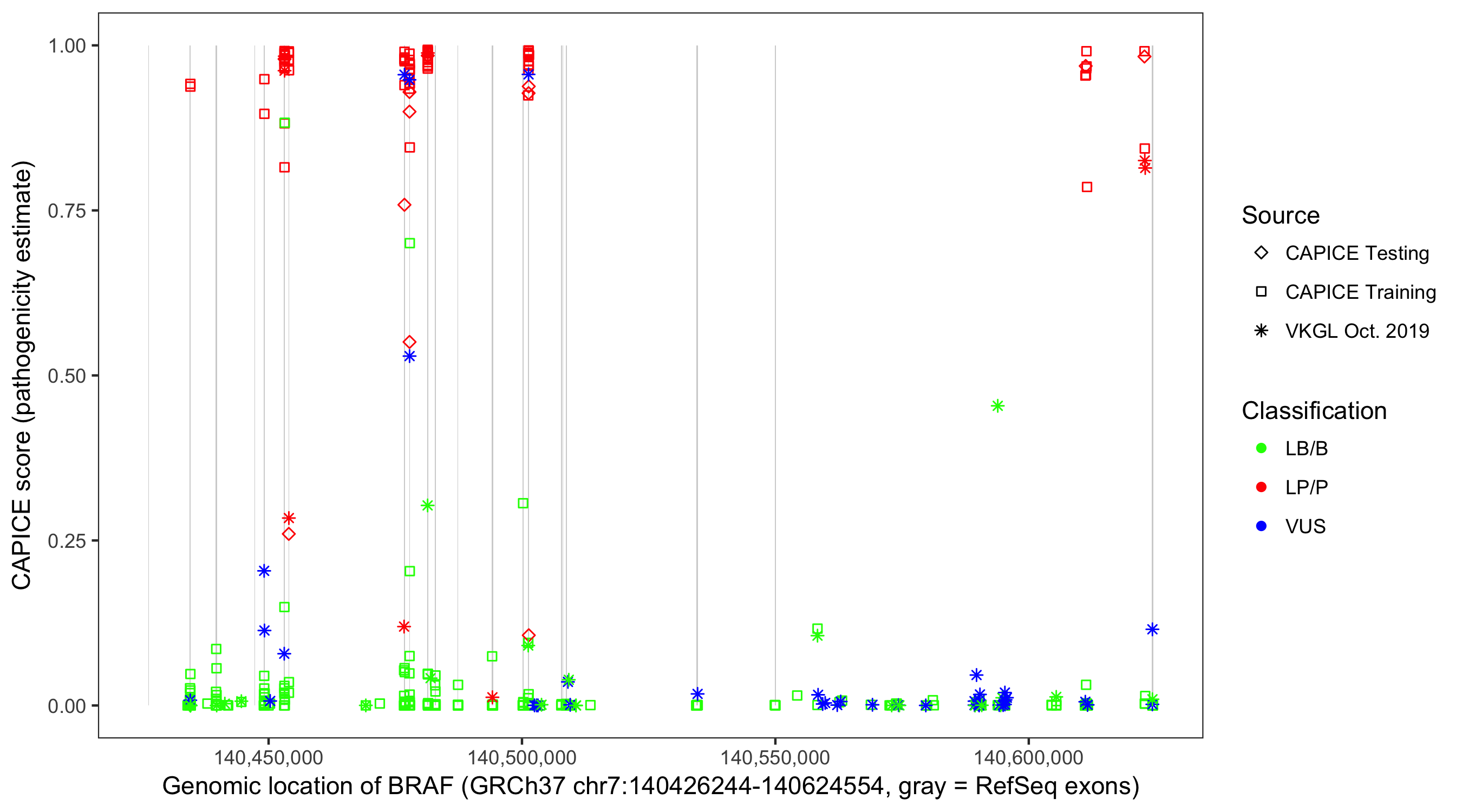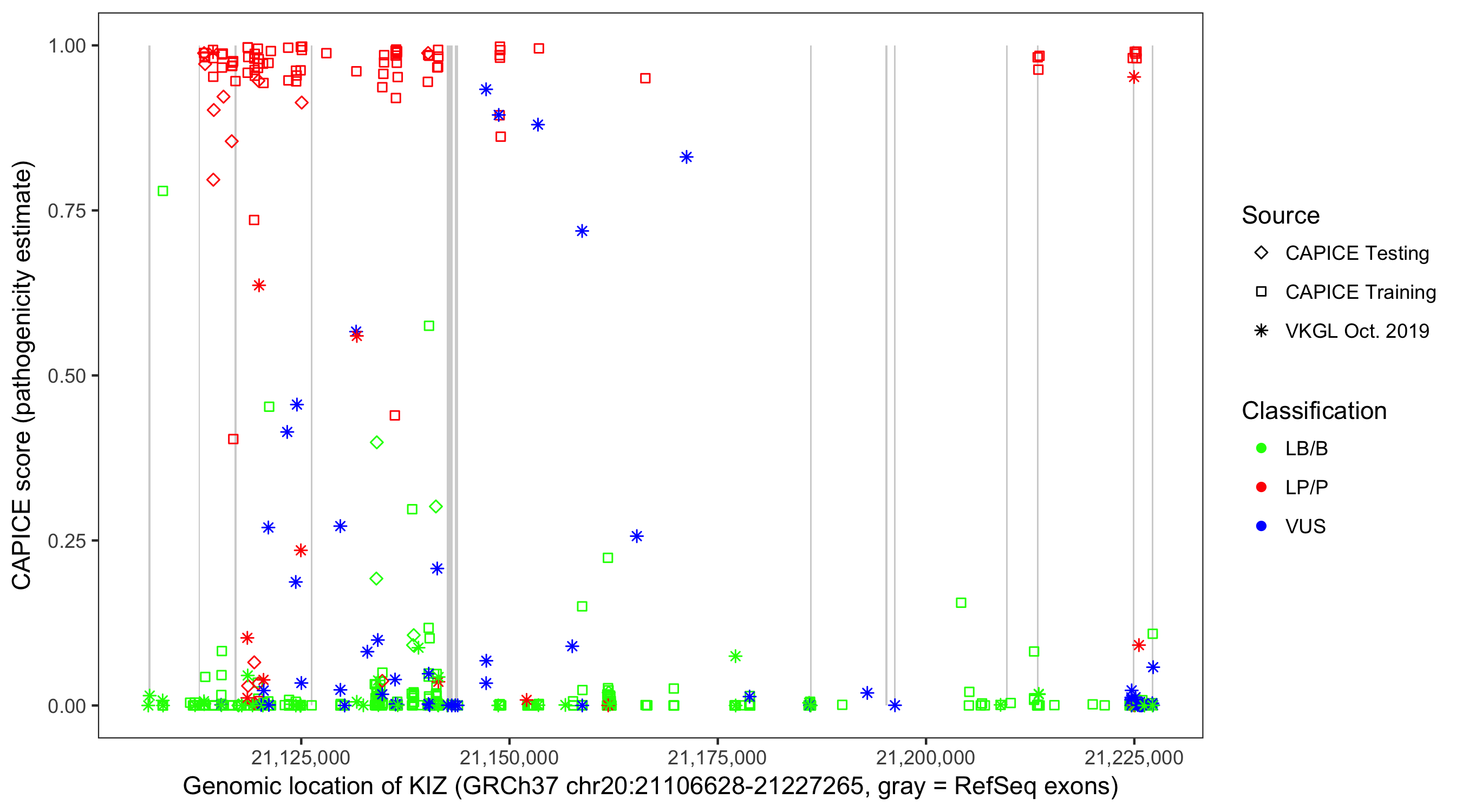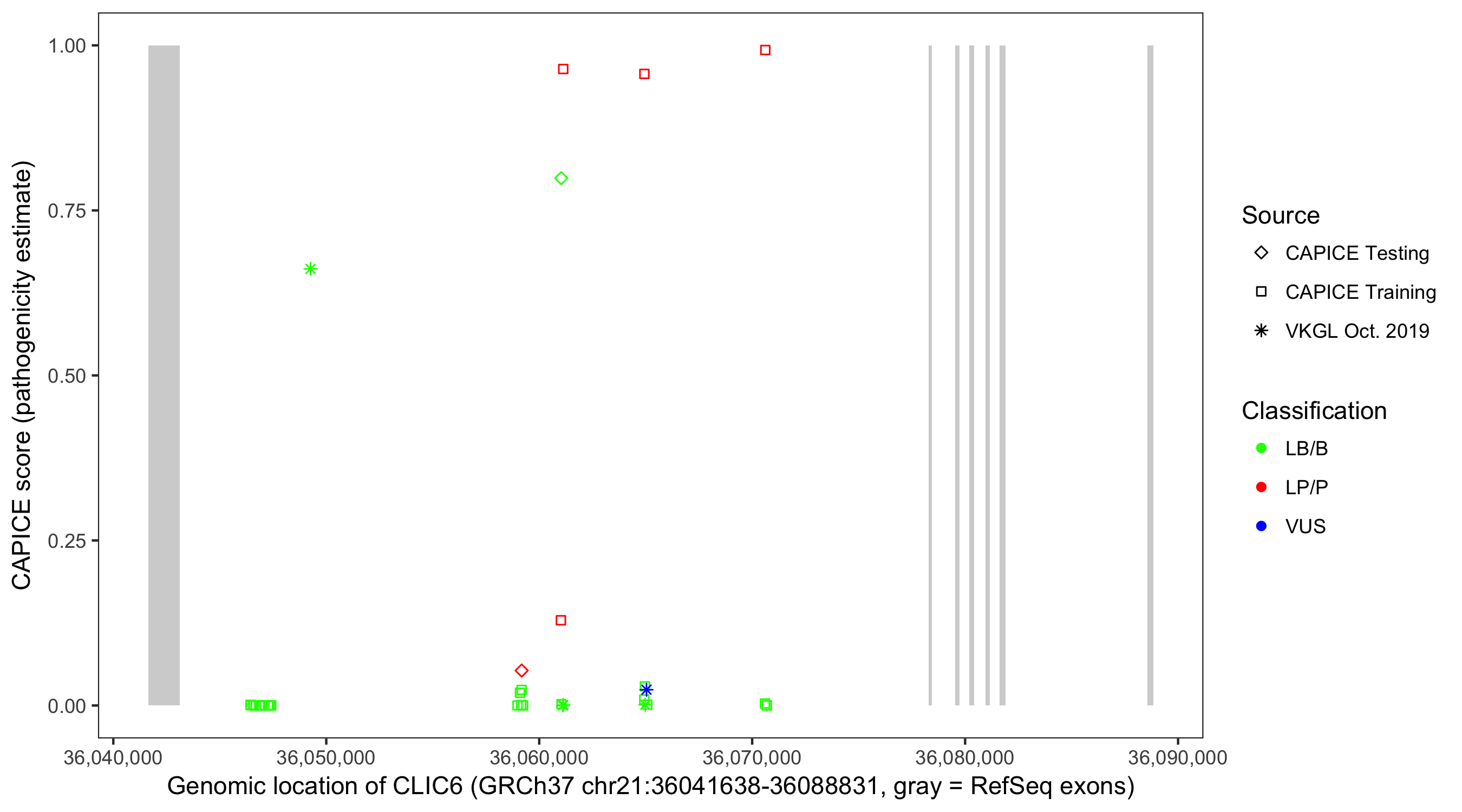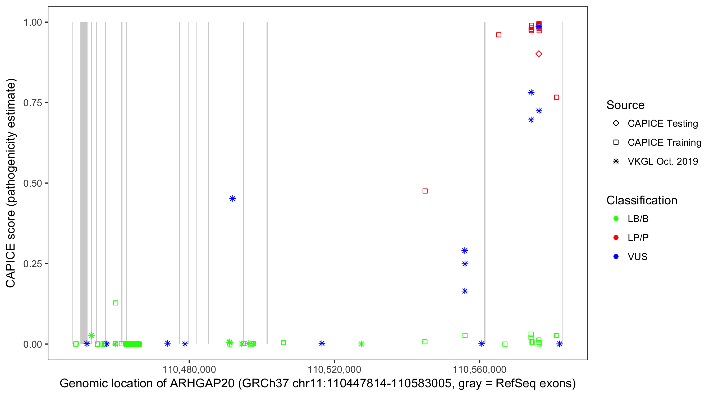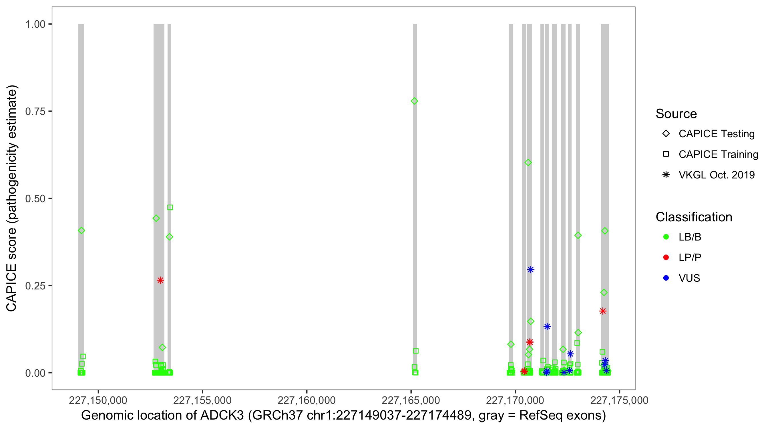 Shown are CAPICE train/test variants plus VKGL Oct 2019.