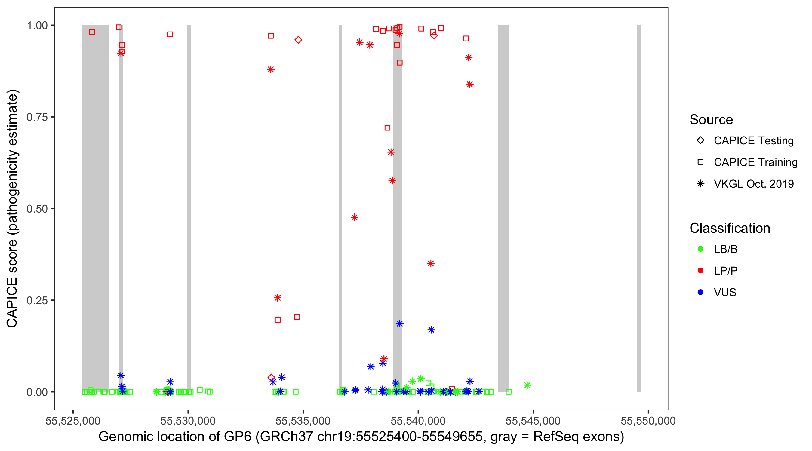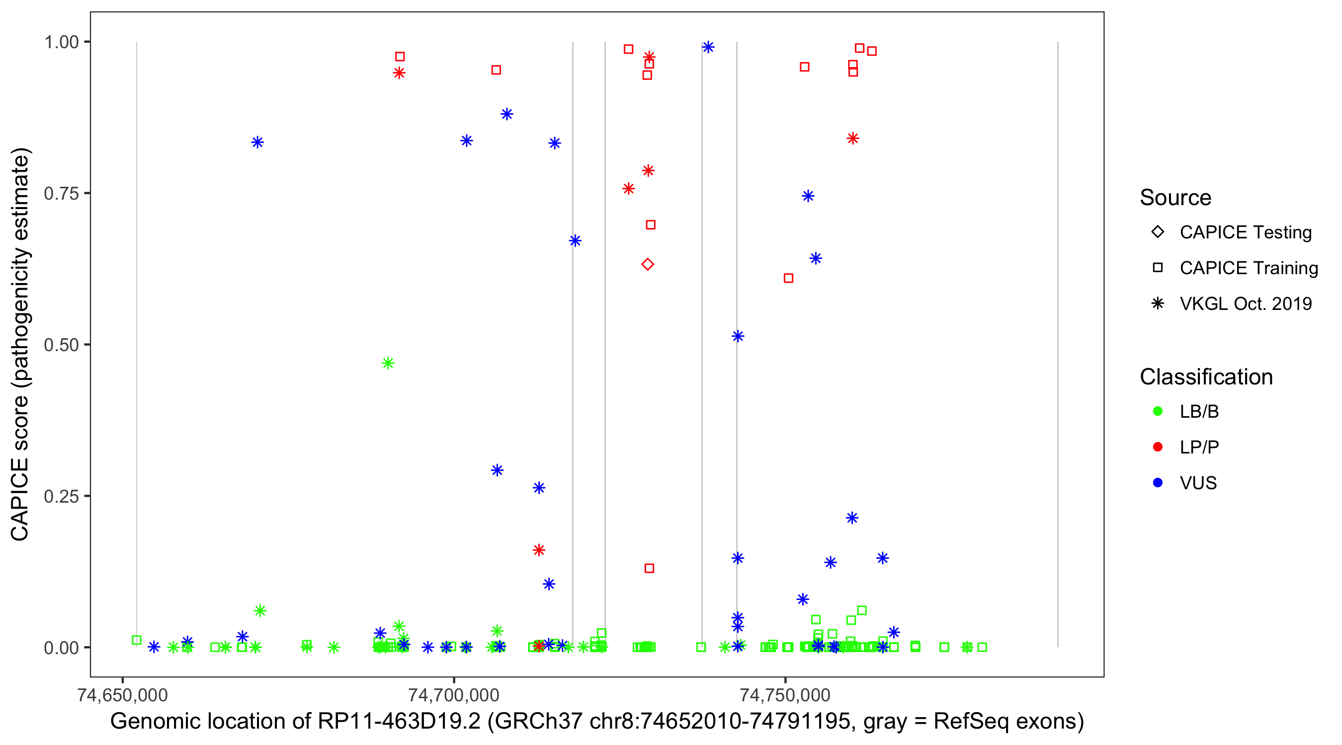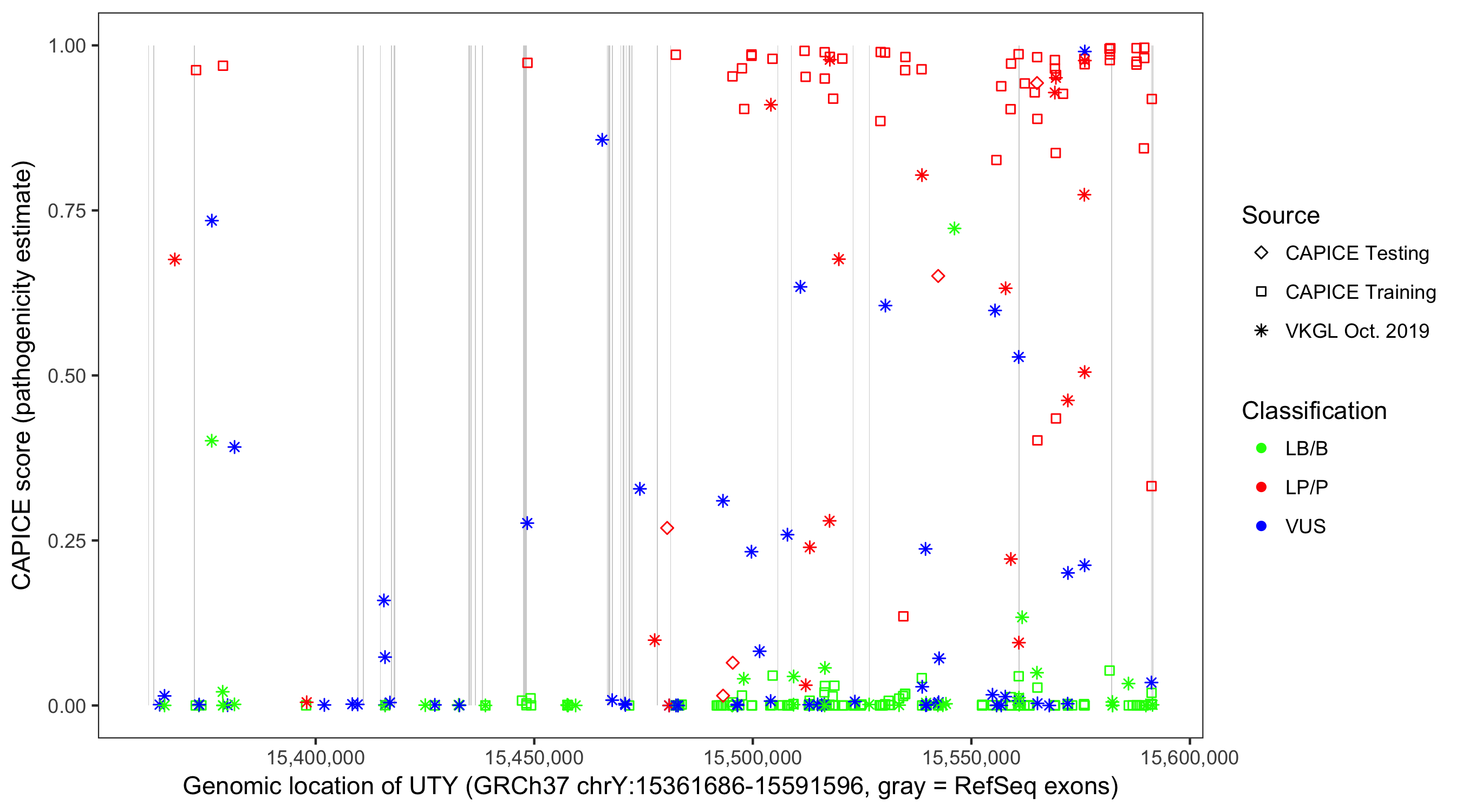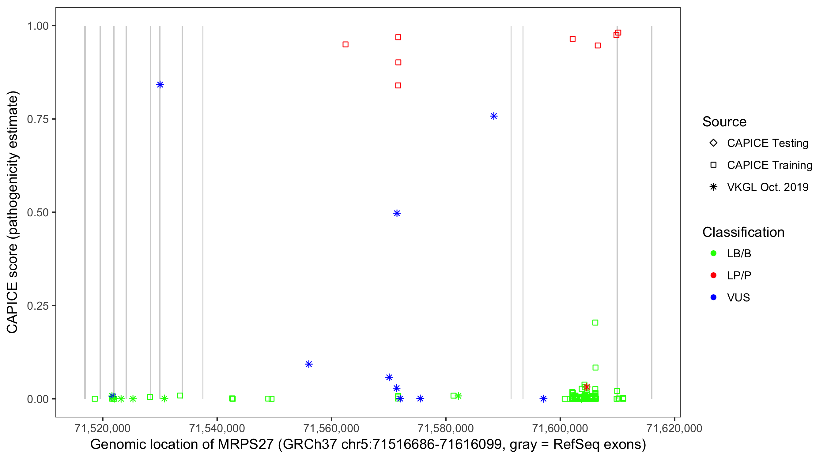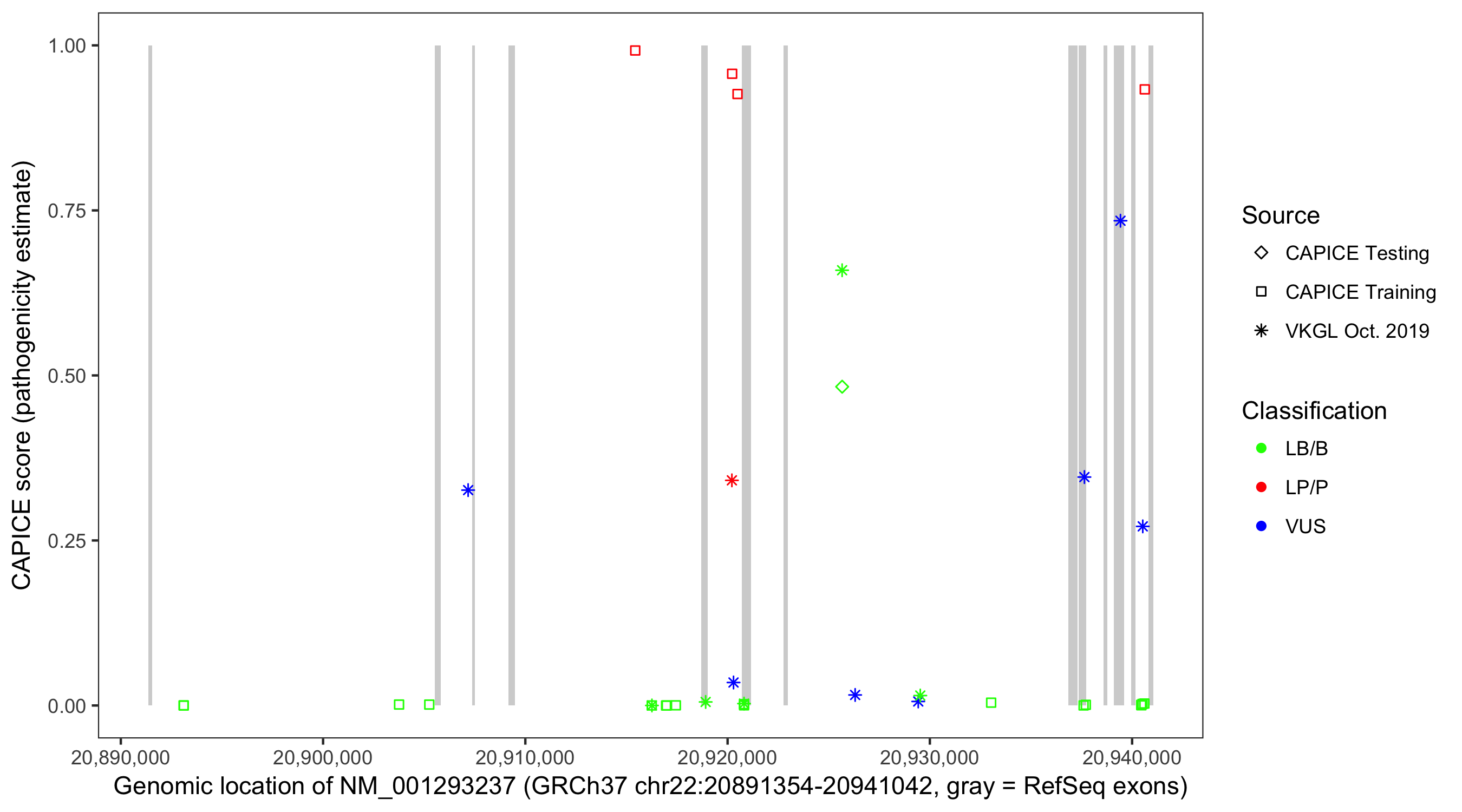 Shown are CAPICE train/test variants plus VKGL Oct 2019.